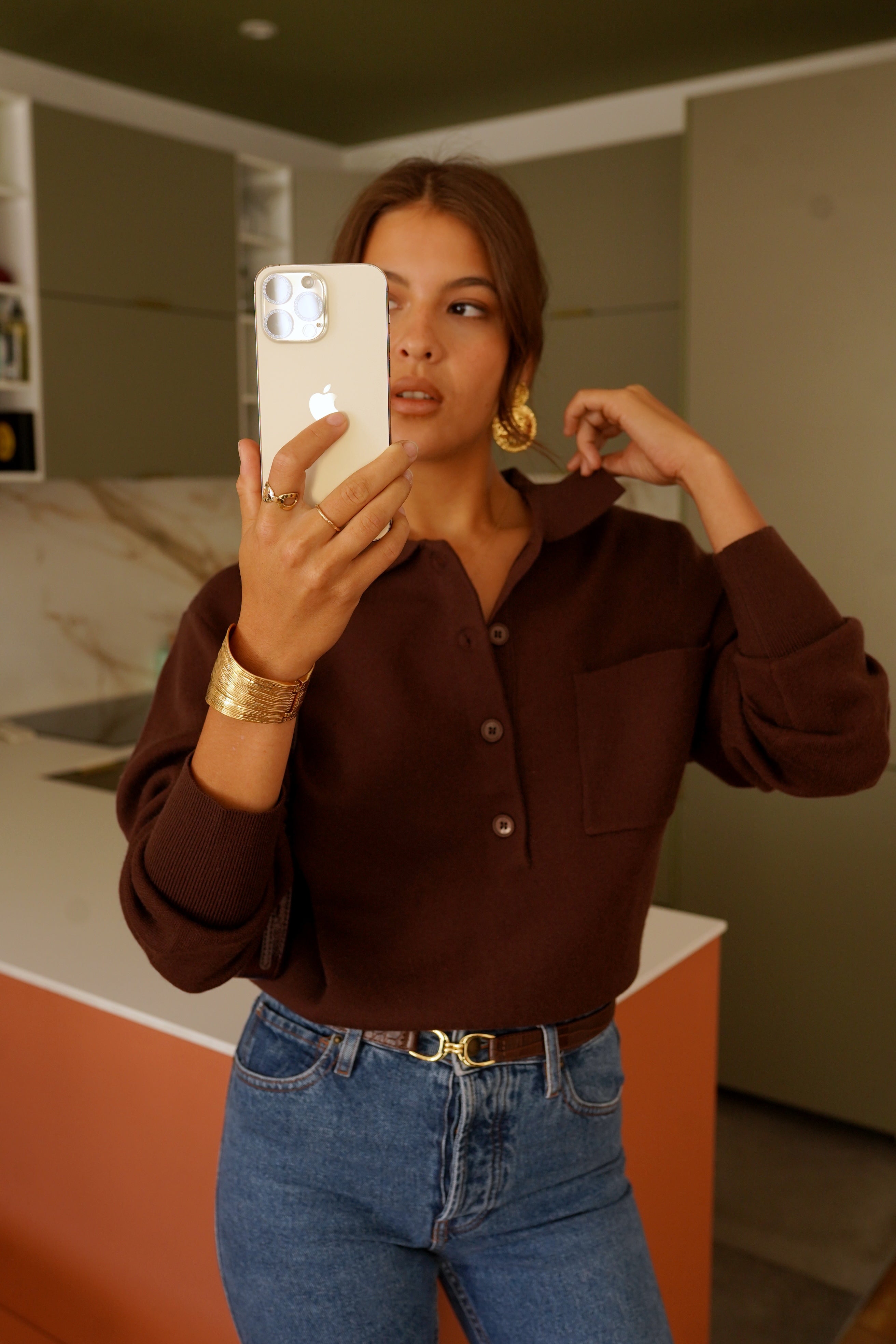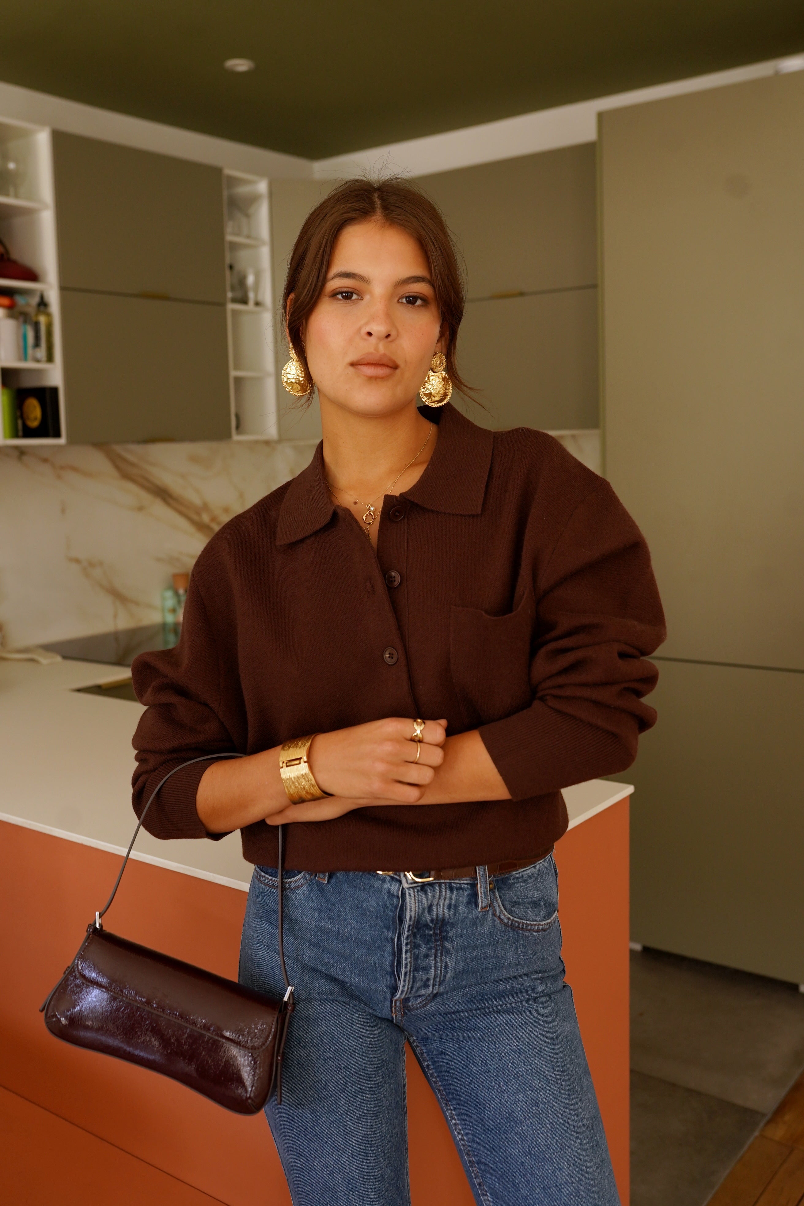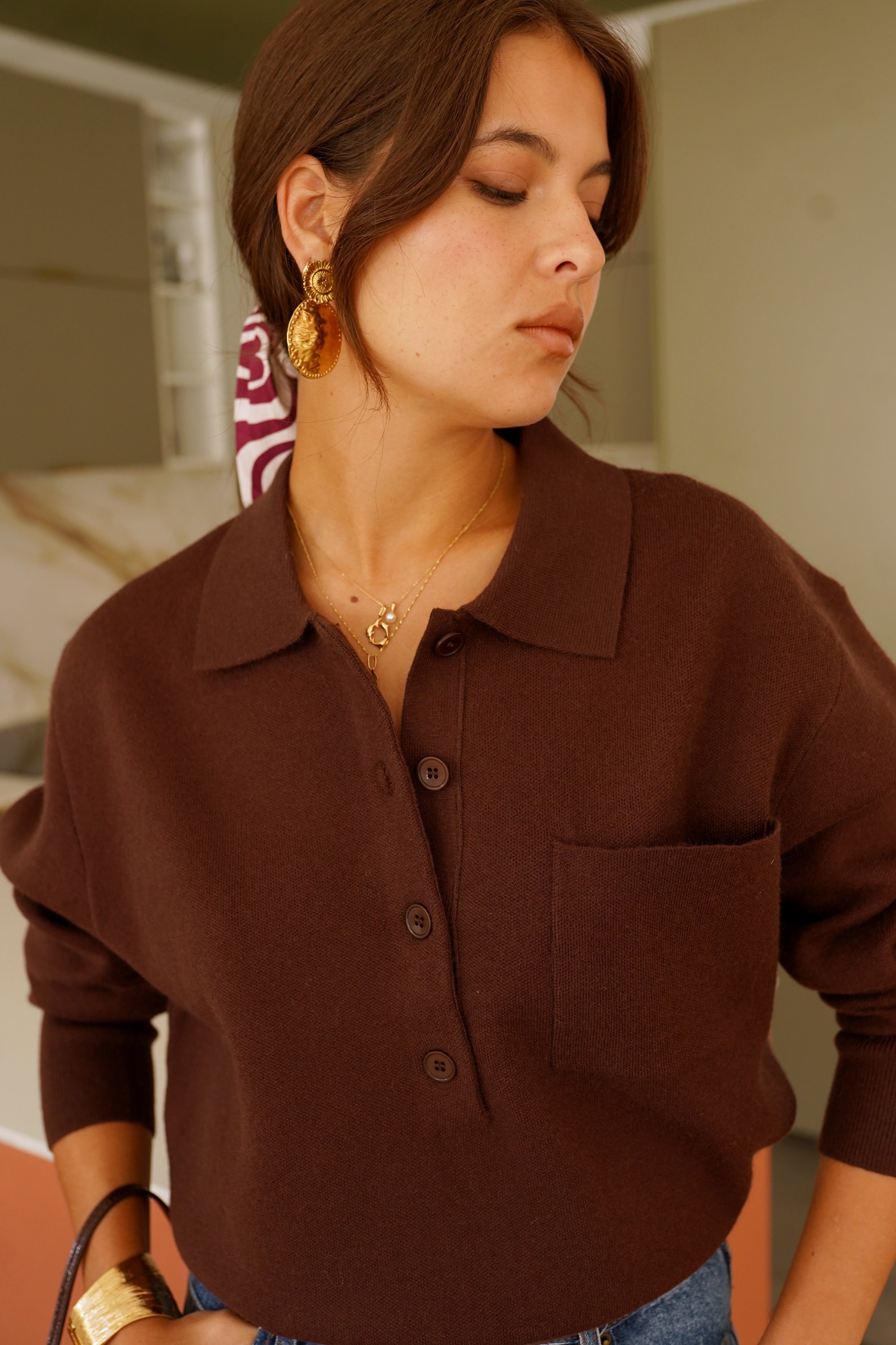 Sa teinte chocolat intense et son col polo revisité, la maille Neria combine allure moderne et confort absolu. Sa coupe droite, soulignée par un boutonnage sobre et une poche plaquée, lui confère une silhouette à la fois épurée et sophistiquée.