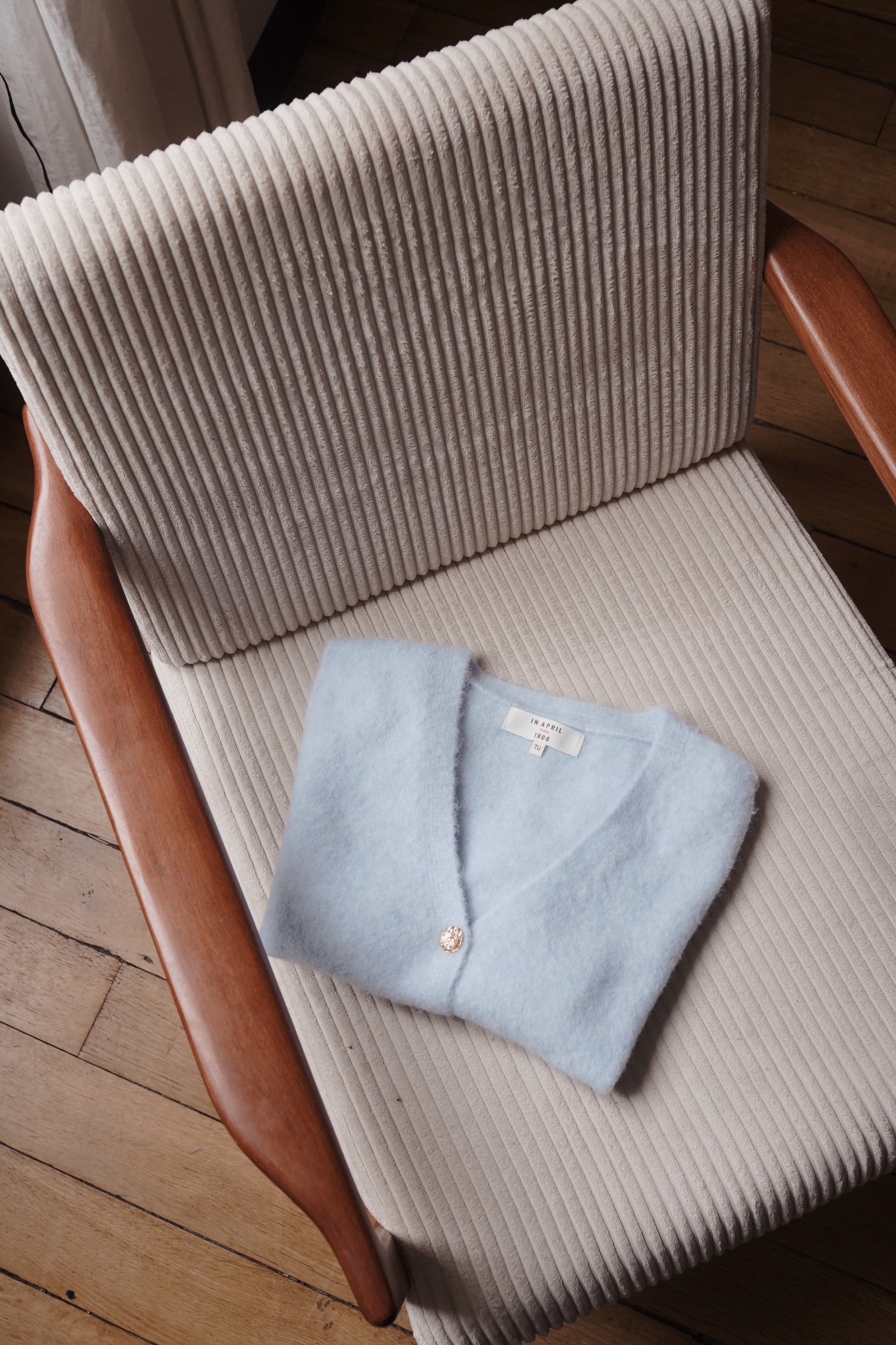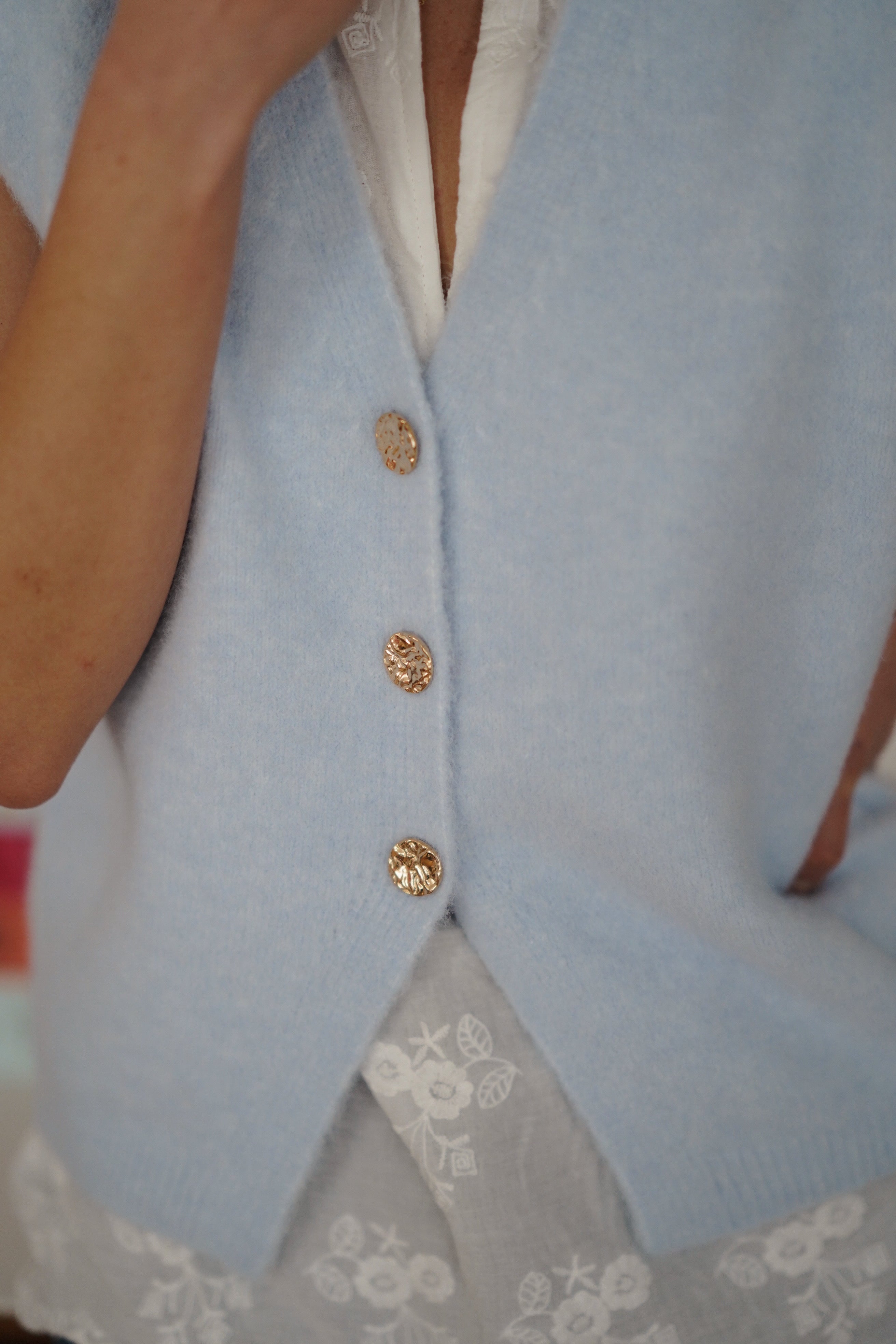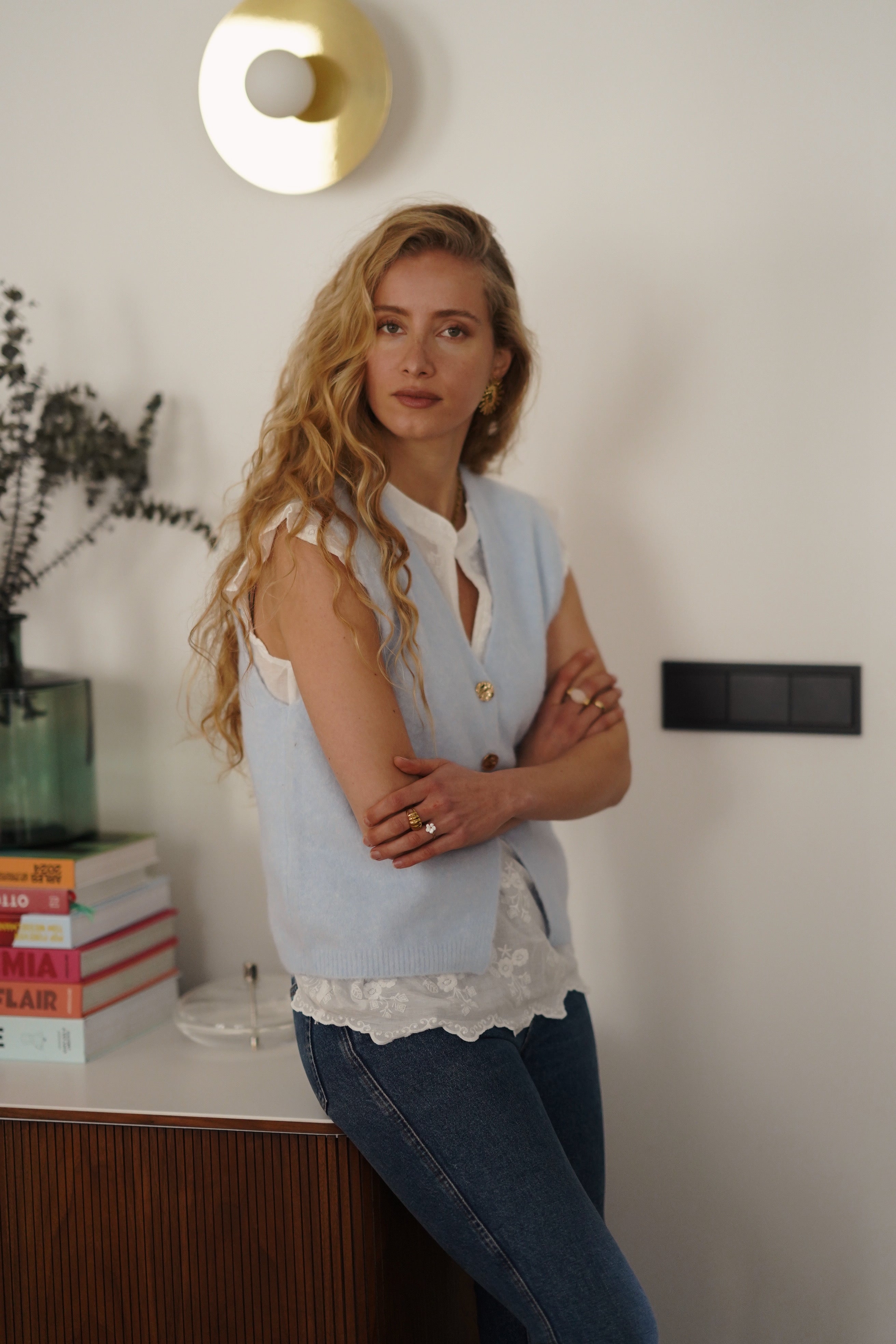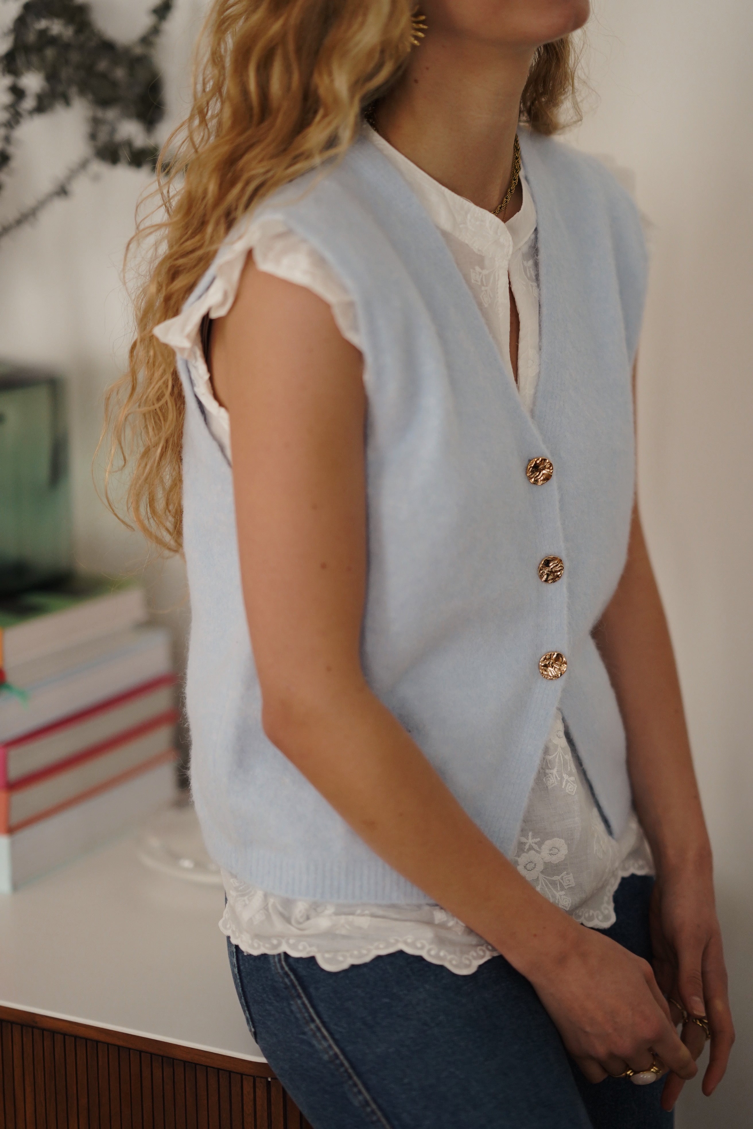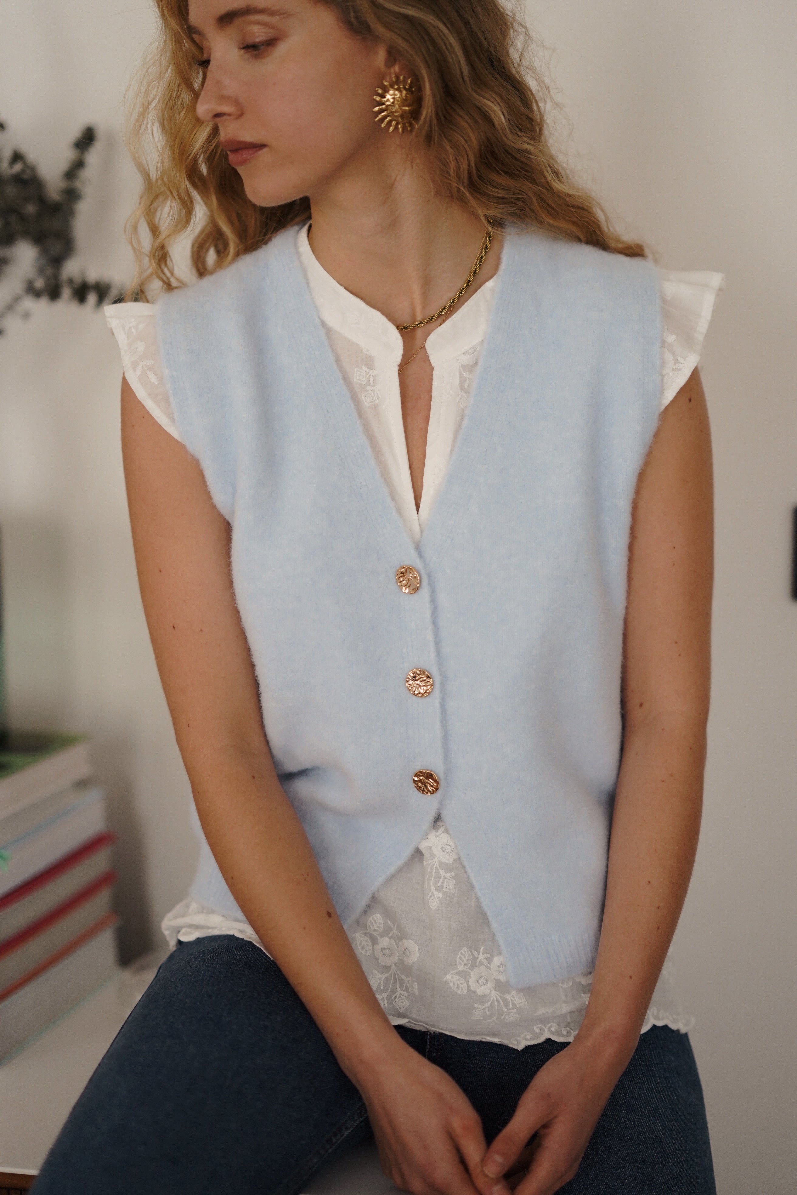 Ce gilet en maille sans manches au bleu pastel délicat est la parfaite alliance entre douceur et élégance minimaliste. Sa coupe épurée et son toucher duveteux en font une pièce idéale pour les superpositions.