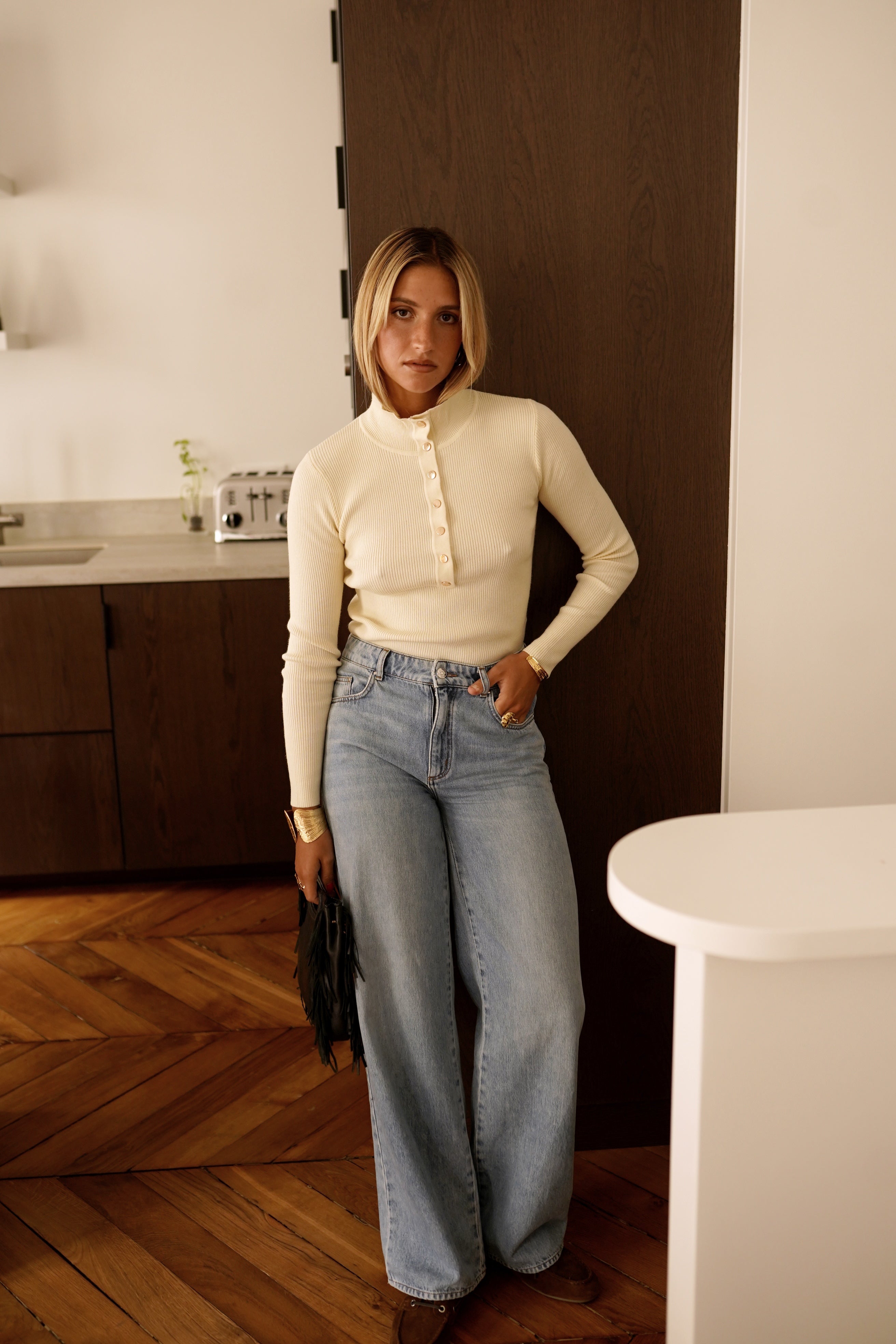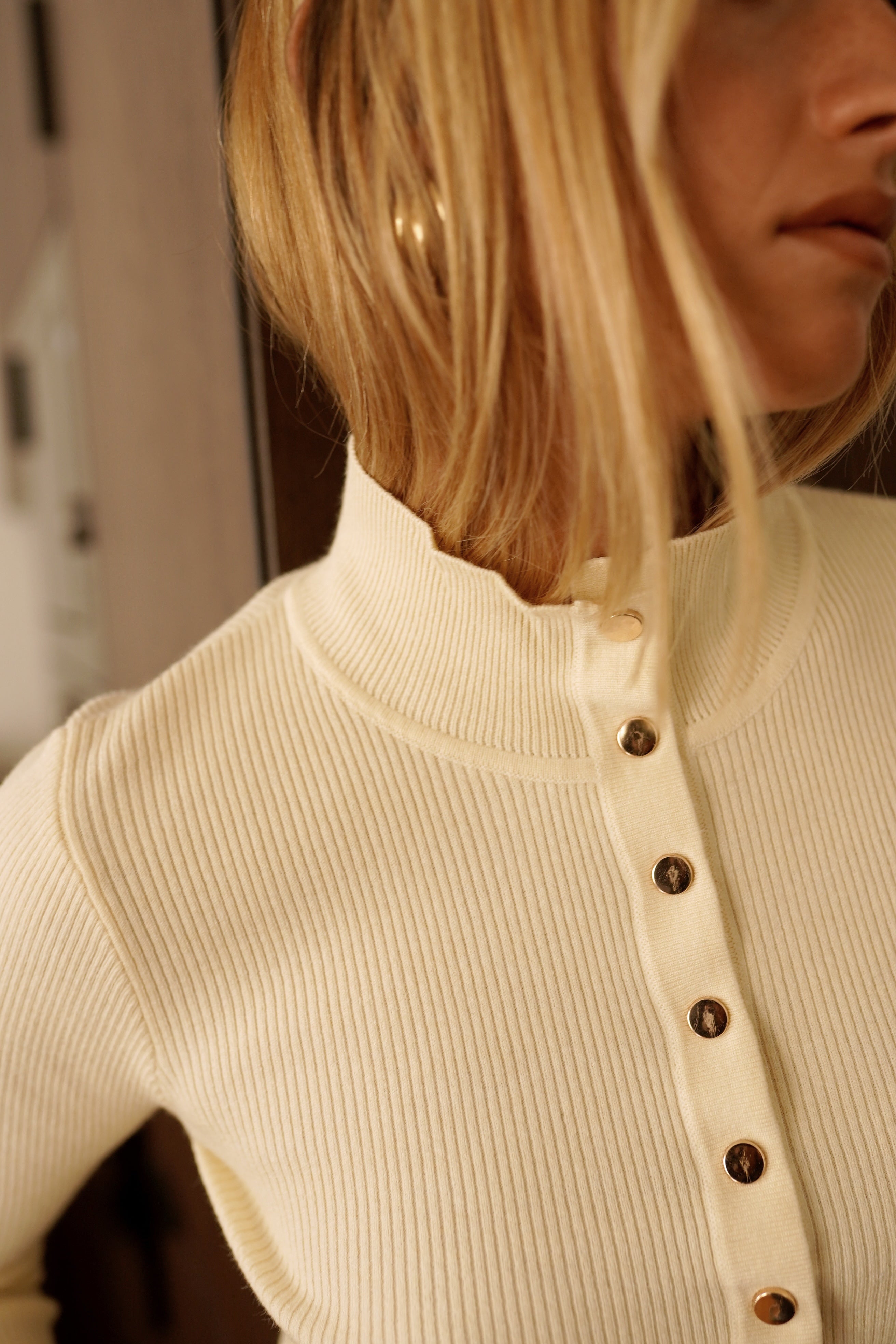 La maille Oswin, minimalisme et élégance au quotidien. Un design épuré souligné par une patte de boutonnage verticale qui structure la silhouette. Sa maille fine et douce épouse le corps avec subtilité, tandis que son col montant lui confère une allure à la fois moderne et intemporelle.