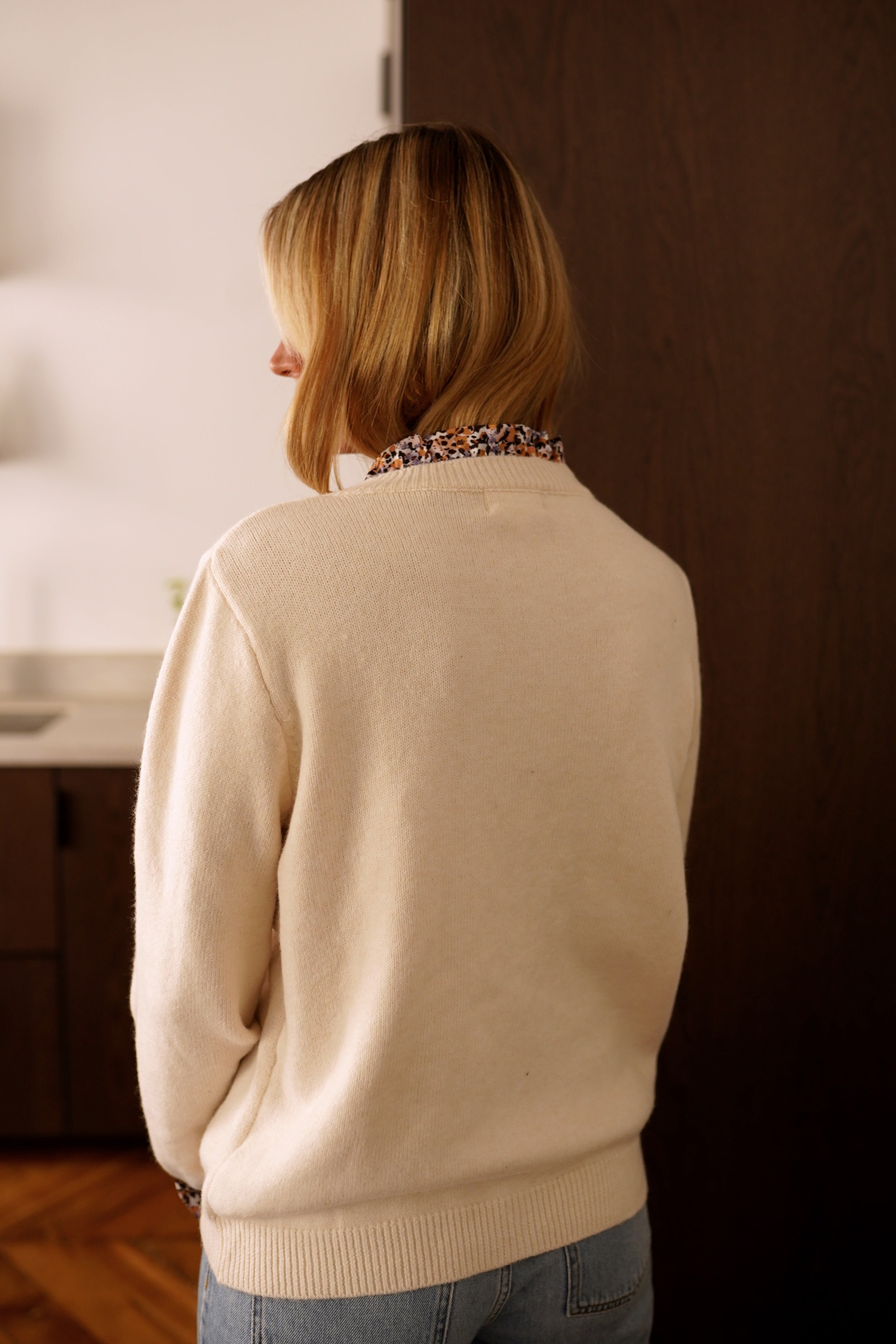 Pearl est un cardigan doux et lumineux, twisté par ses boutons recouverts et ses finitions volantées en imprimé floral. Un subtil contraste entre l’élégance intemporelle de la maille écrue et la fraîcheur des touches colorées.