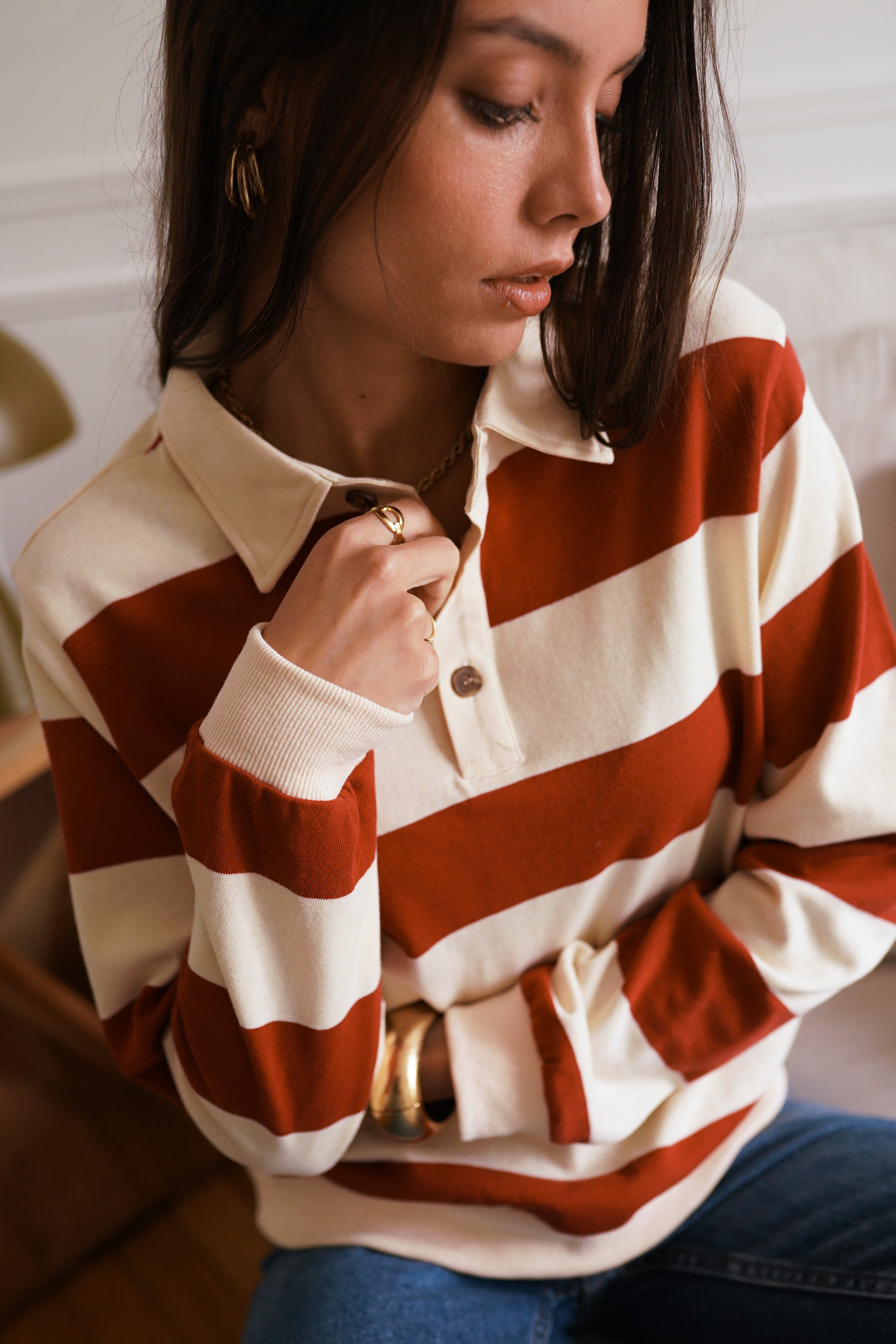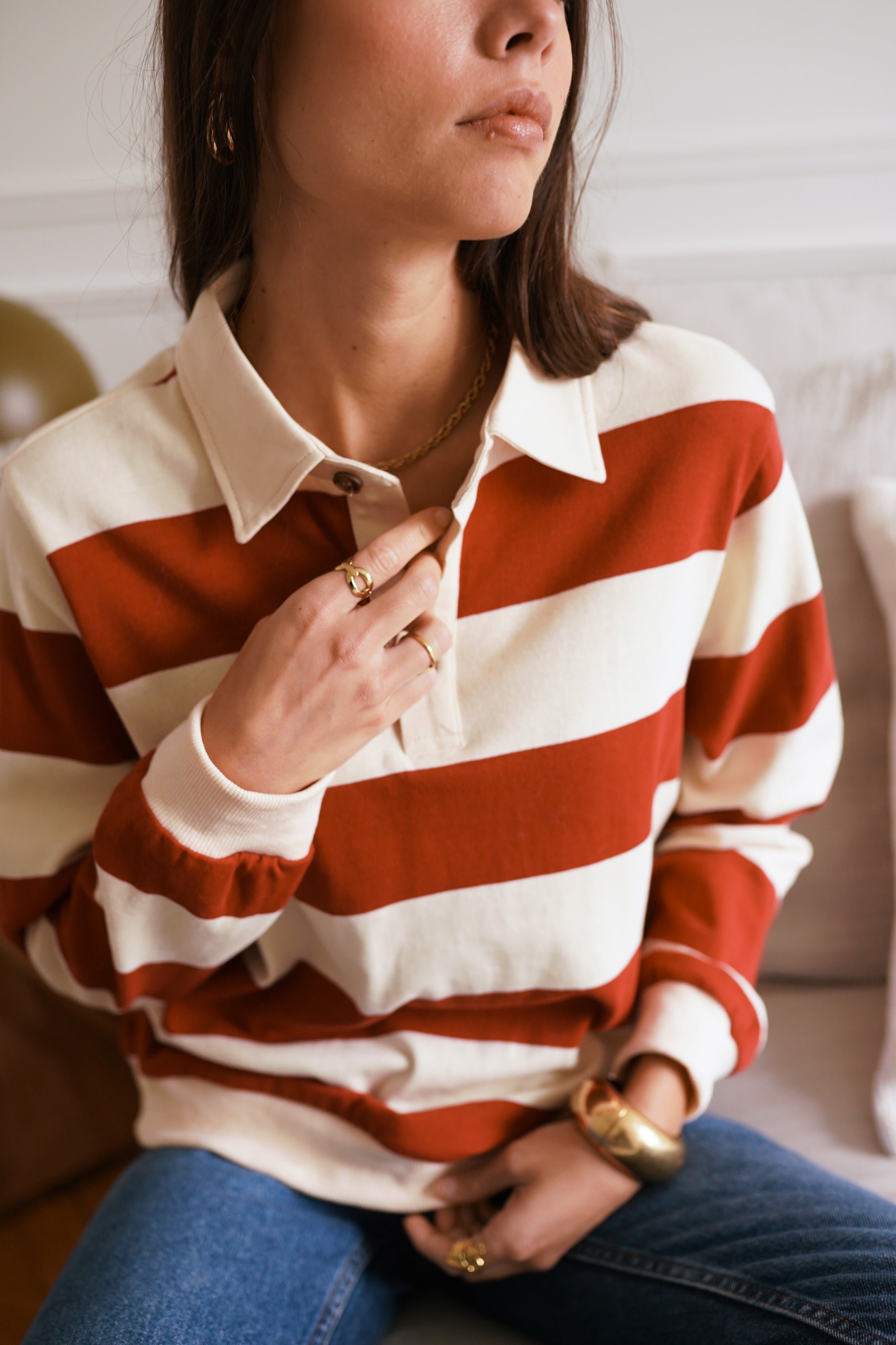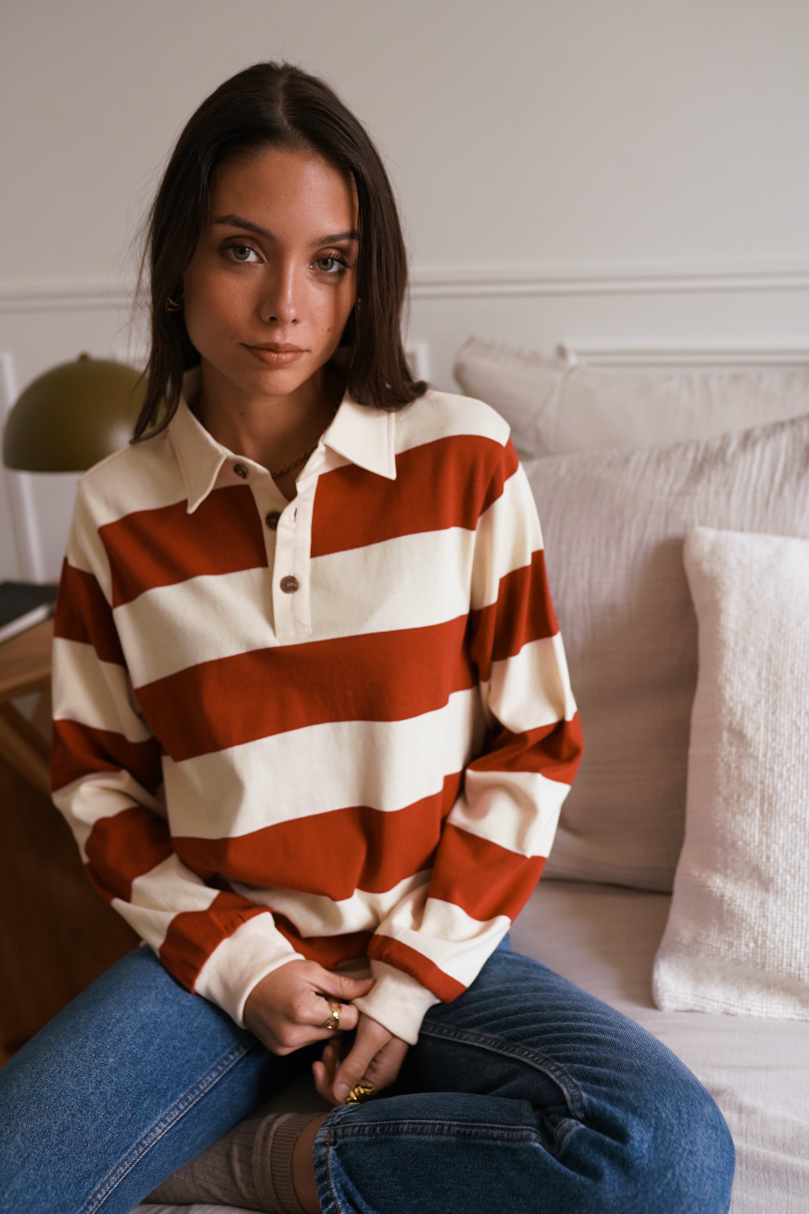La maille Reya revisite le rugby-shirt dans une version douce et féminine. Sa coupe droite et son col boutonné lui donnent un côté effortless, tandis que sa matière douce assure un confort parfait au quotidien. Une pièce forte, facile à mixer et à porter toute la saison.