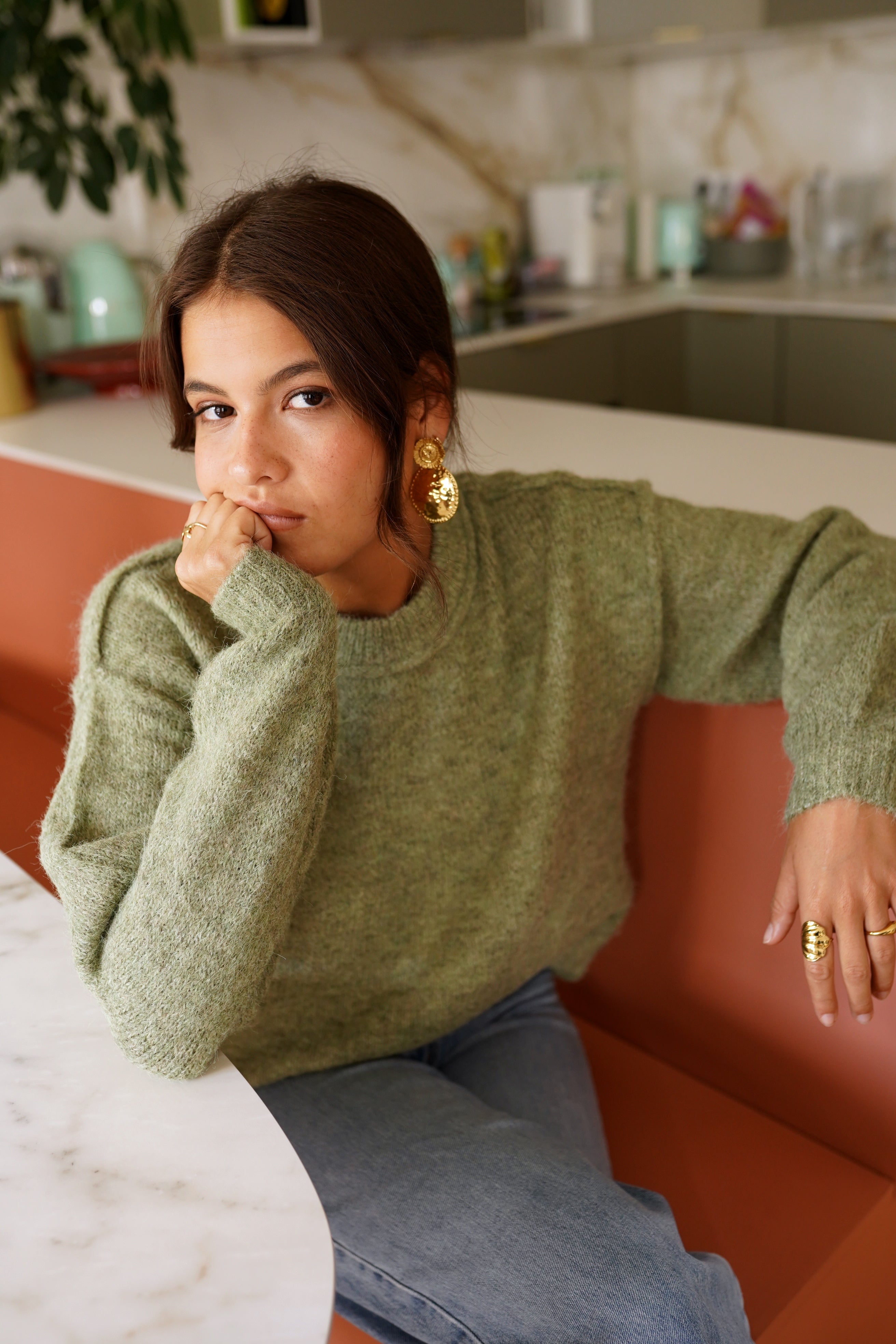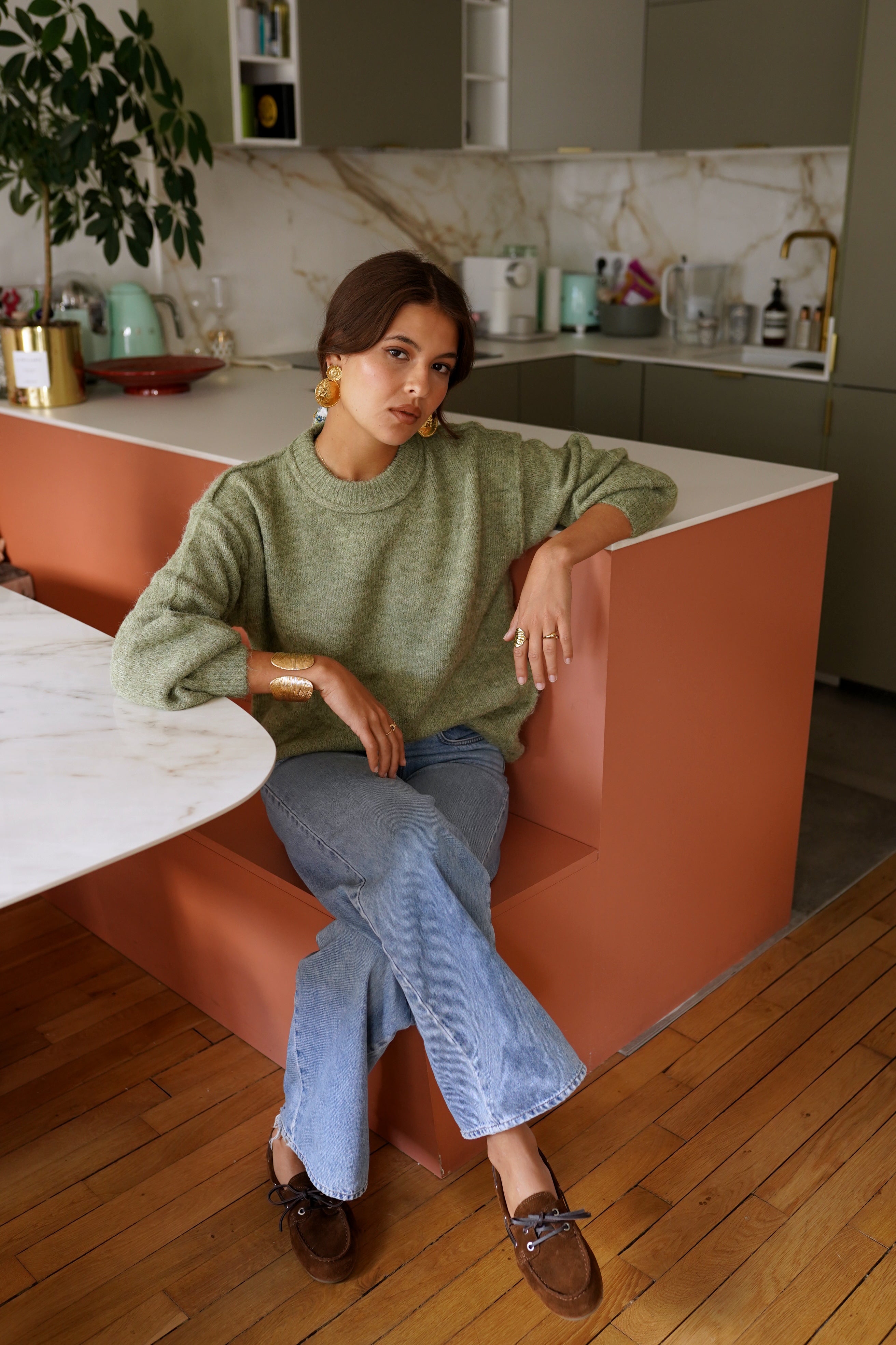 Un essentiel automnal qui joue sur la douceur et l’authenticité. Sa maille mousseuse, dans un vert tendre et raffiné, apporte une touche naturelle qui réchauffe la silhouette. Avec sa coupe droite et son col rond intemporel, elle se porte aussi bien sur un denim casual que sur une jupe fluide. Une pièce cosy et élégante, pensée pour accompagner vos looks avec simplicité et caractère.