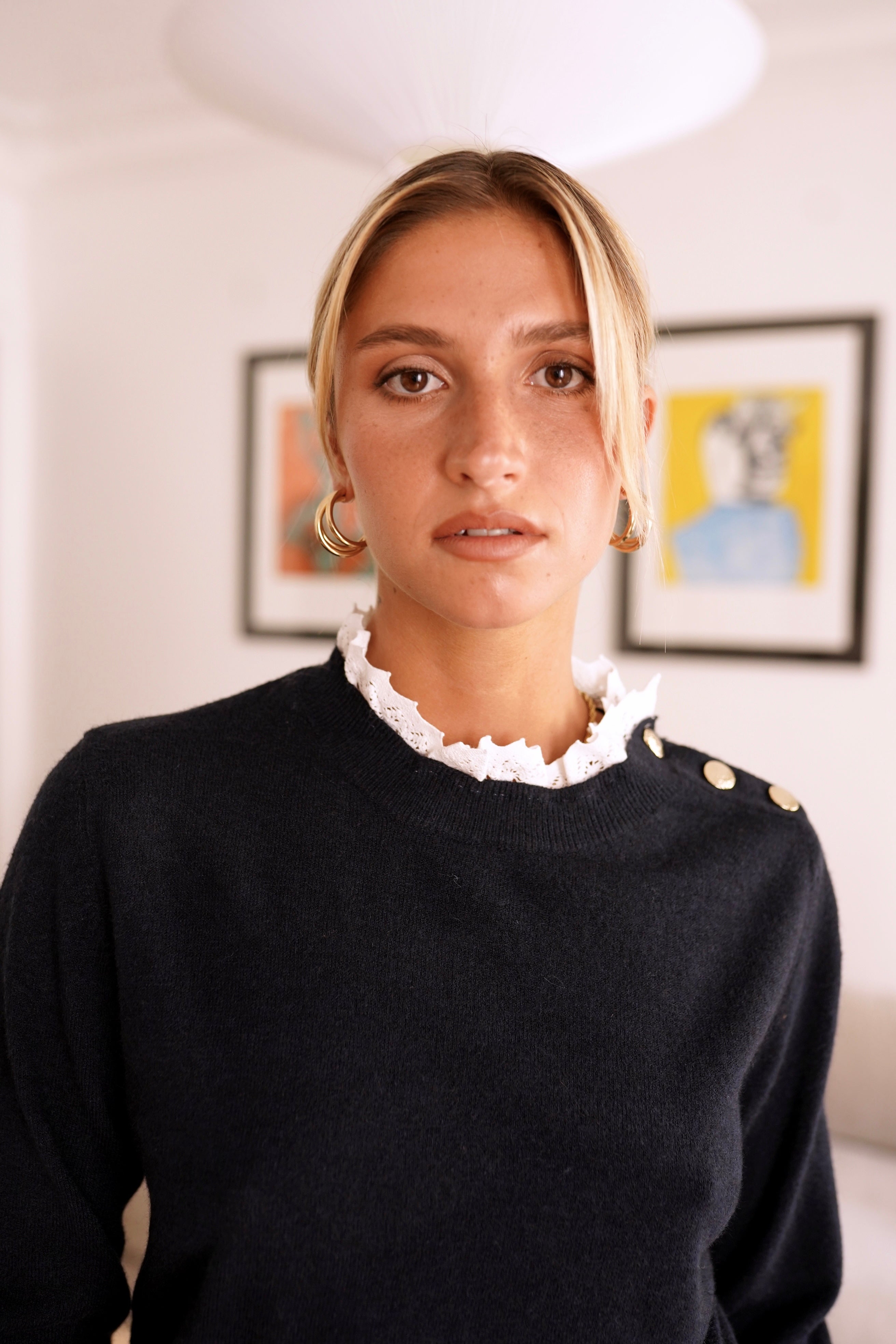 La maille Ulian, élégance discrète et détails raffinés. Son encolure classique est twistée par une patte de boutonnage dorée sur l’épaule, qui illumine la silhouette avec subtilité. Sa maille douce et fluide en fait un essentiel confortable, tandis que ses finitions soignées en font une pièce à la fois simple et sophistiquée.