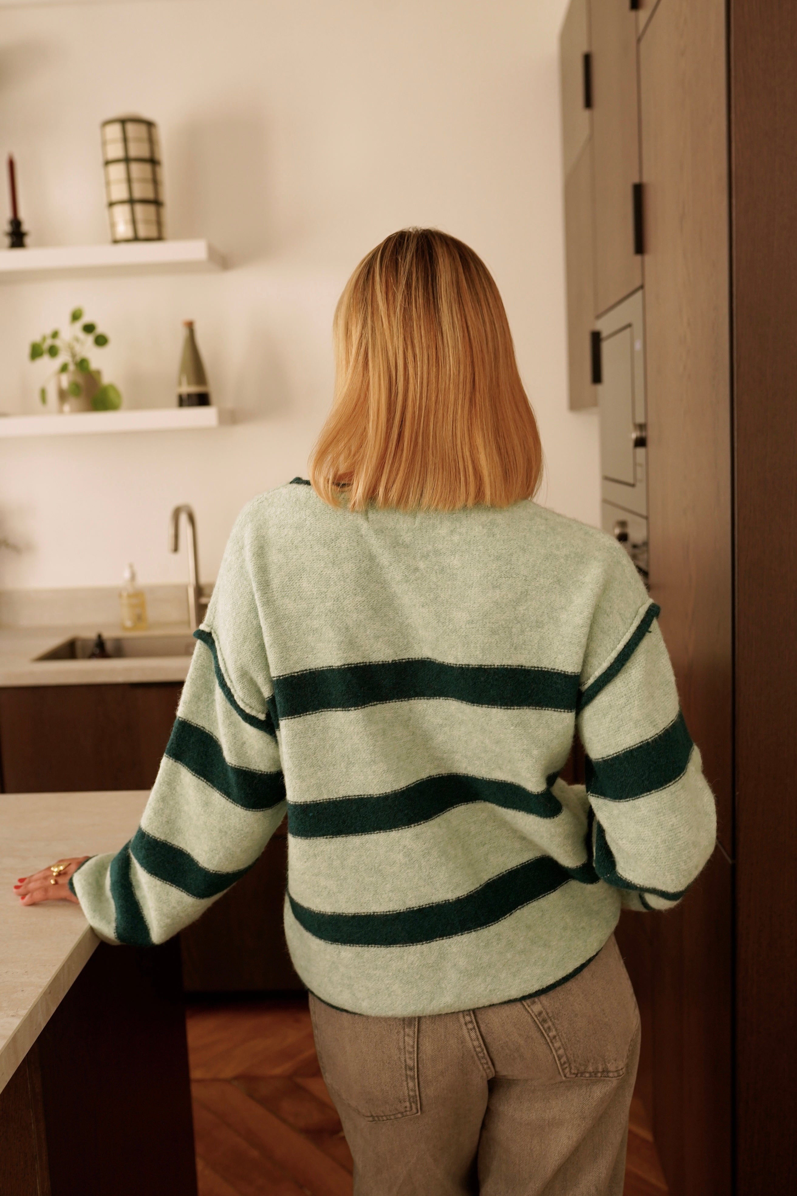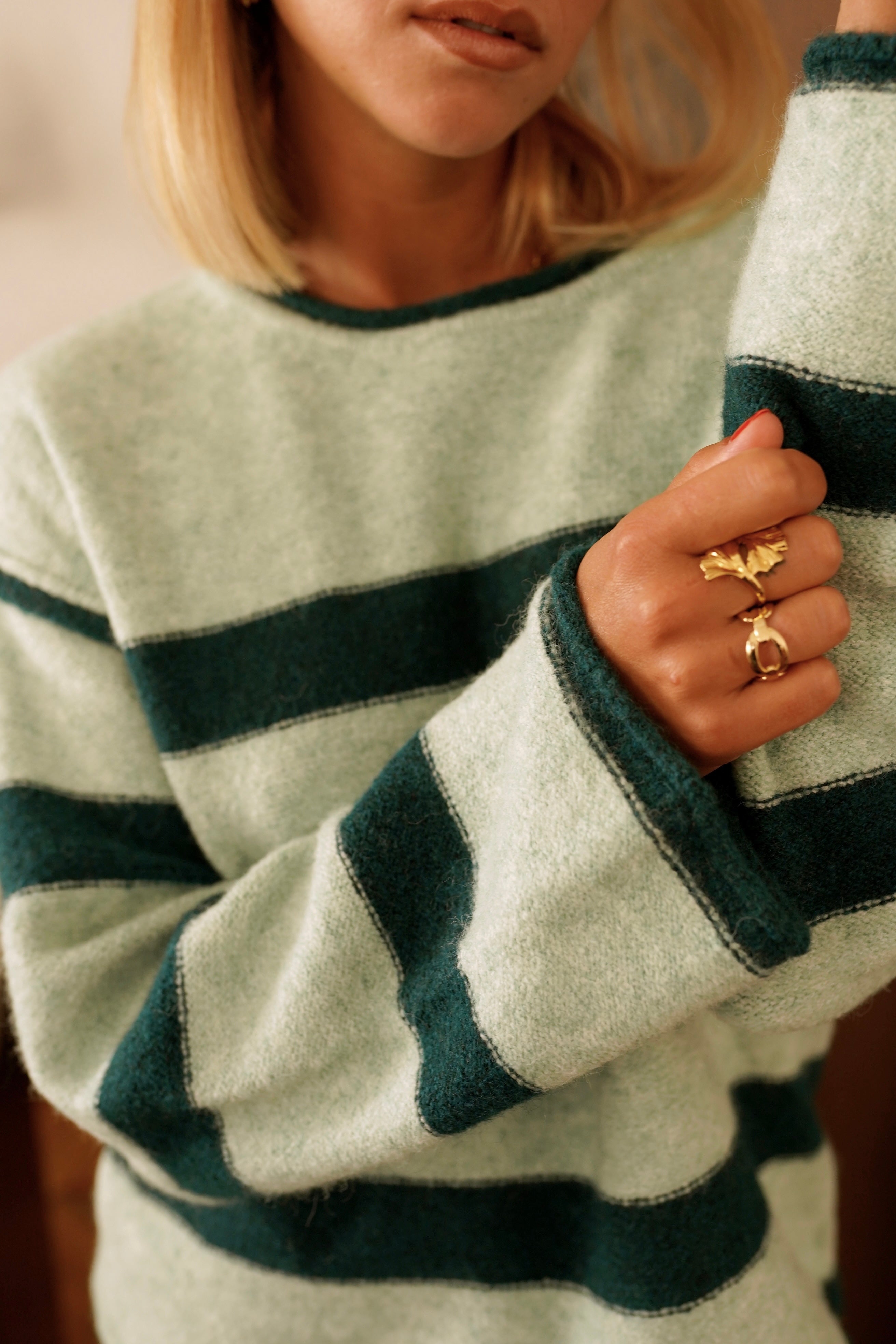 Avec ses larges rayures contrastées vert et écru, Le pull Zoren revisite l’incontournable marinière dans une version contemporaine et cosy. Sa coupe fluide et ses manches légèrement évasées en font une pièce tendance, à mi-chemin entre confort et style affirmé.