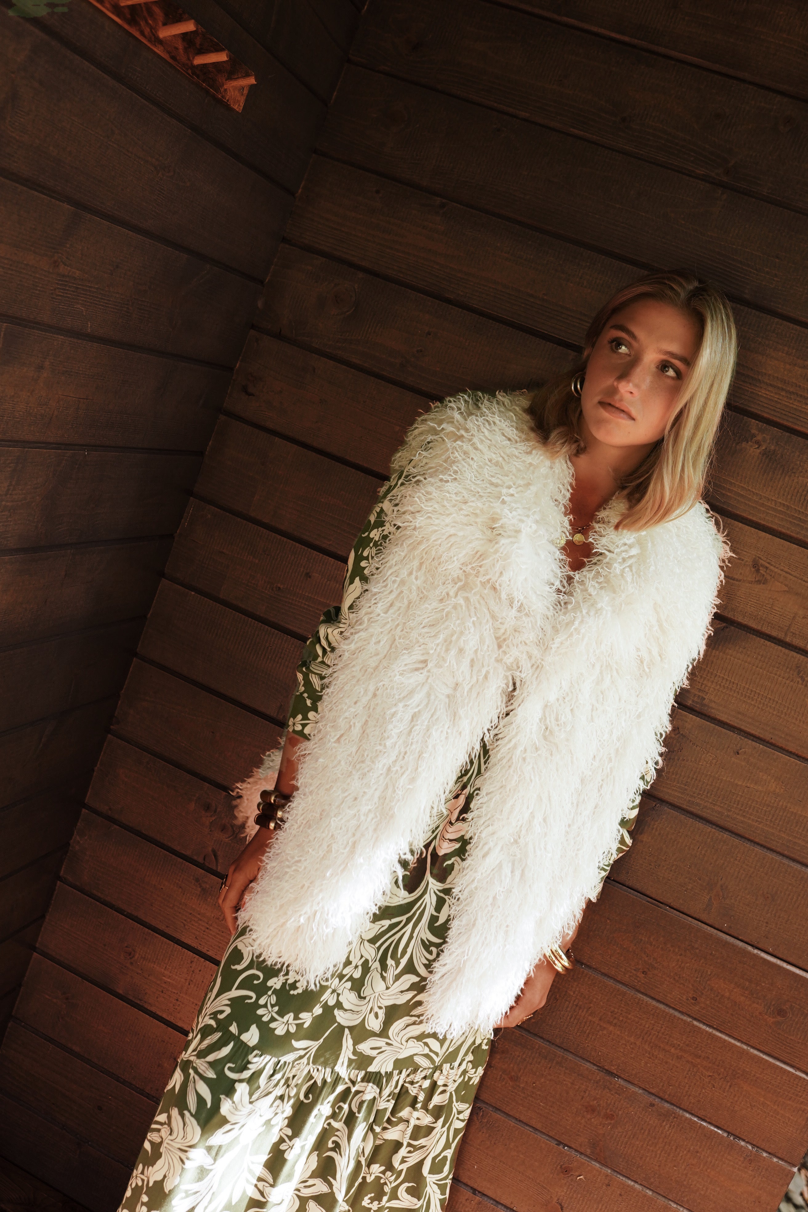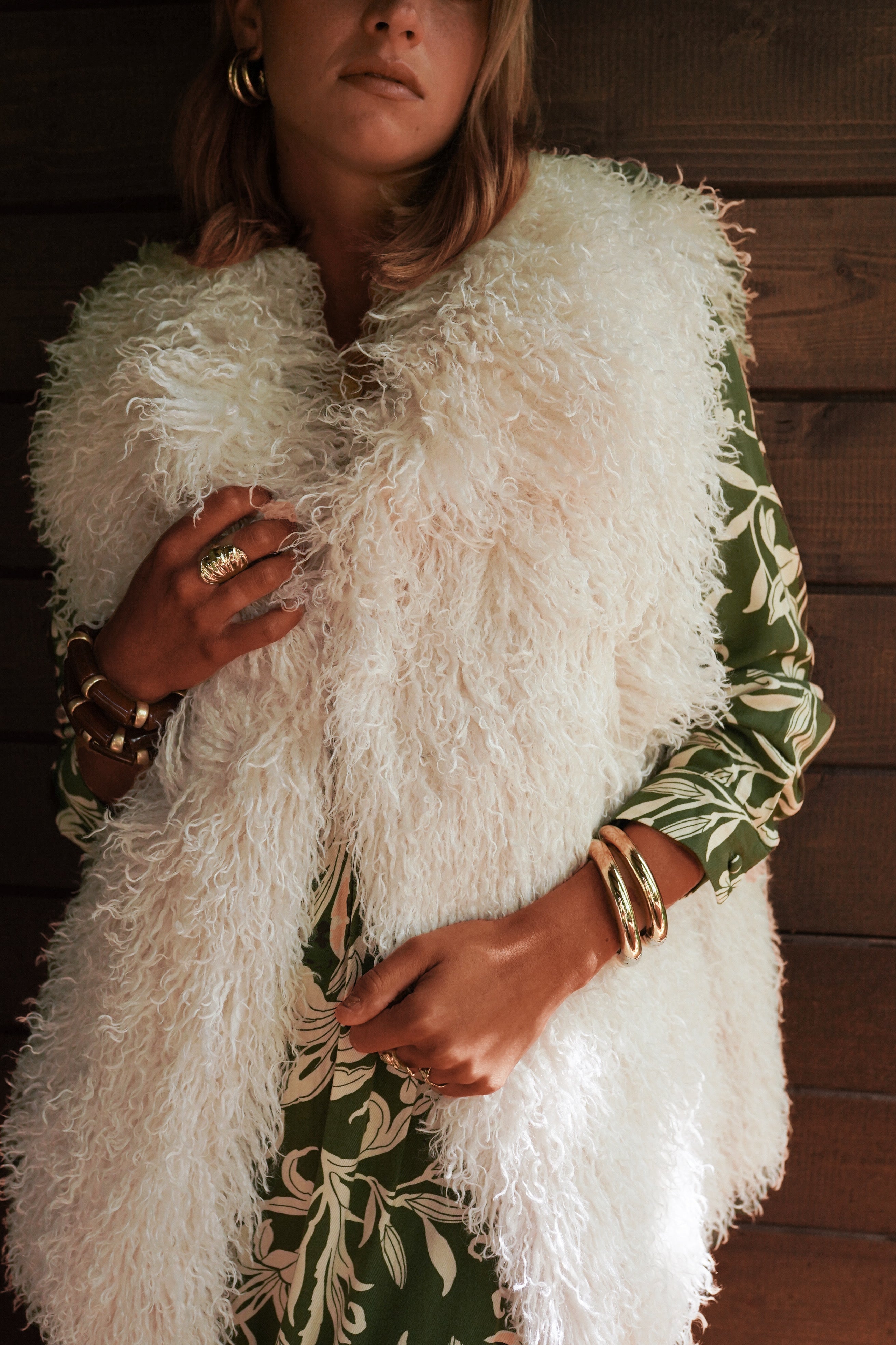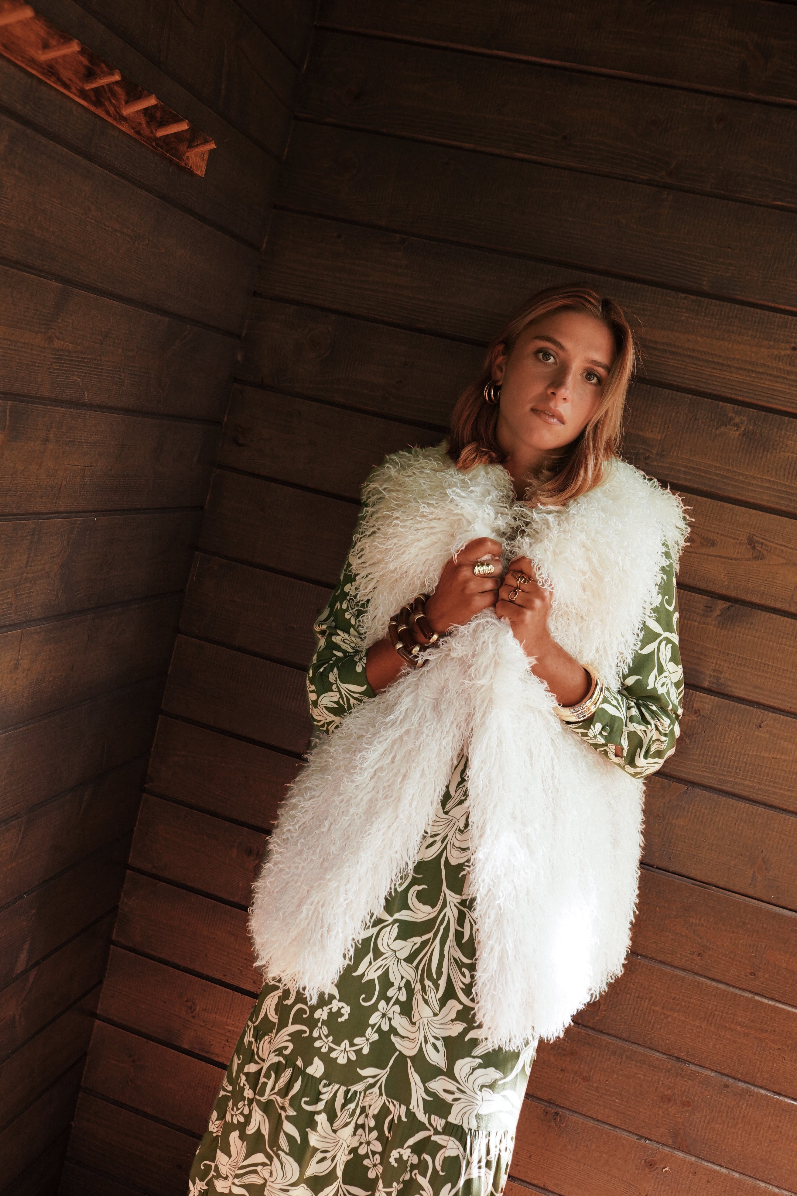 Le manteau Frann s’impose comme une pièce forte de la saison. Confectionné en fausse fourrure bouclée, il joue sur le volume et la texture pour une allure à la fois bohème et affirmée. Son blanc crème lumineux contraste avec les nuances naturelles de la saison et apporte une touche de douceur instantanée à la silhouette.