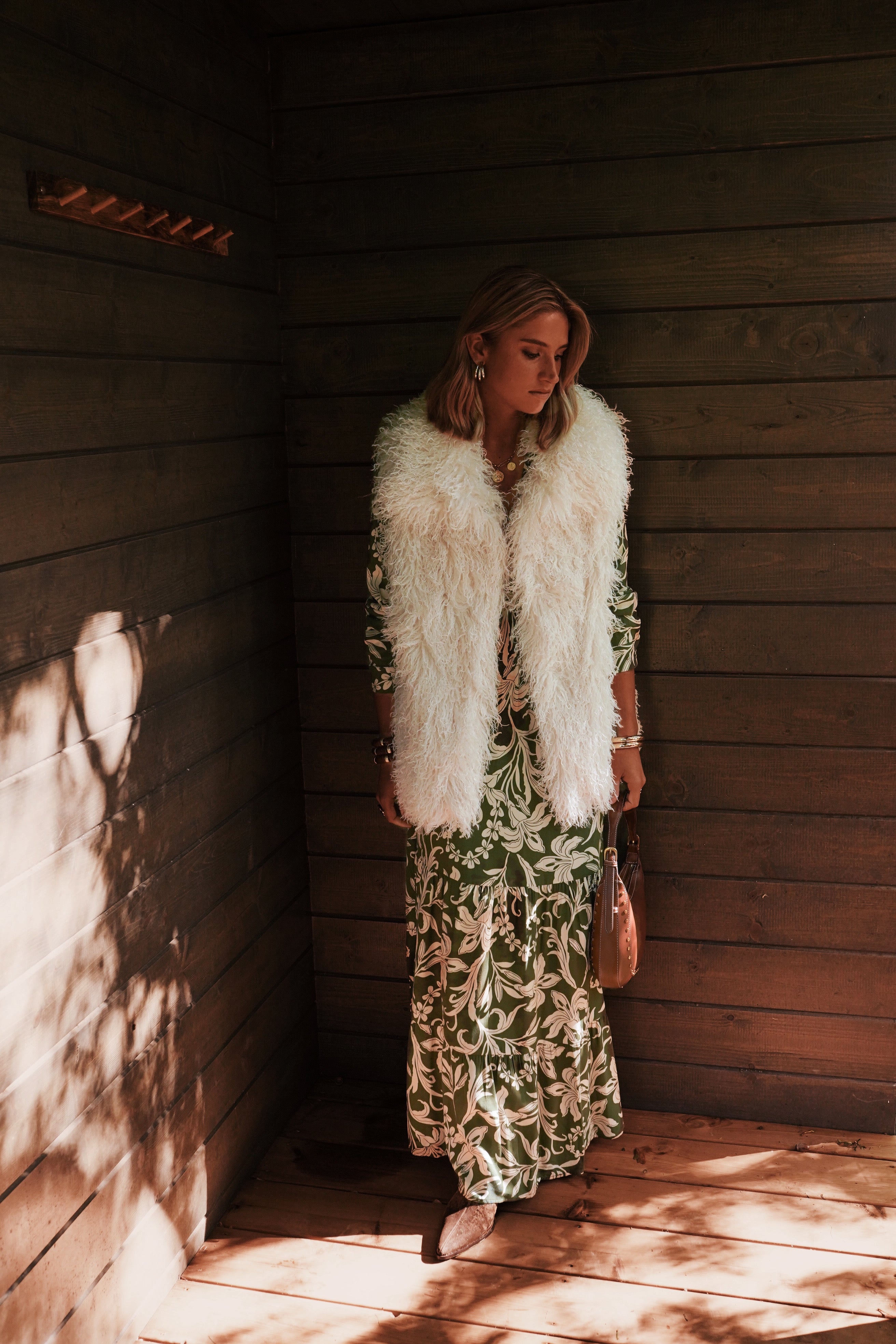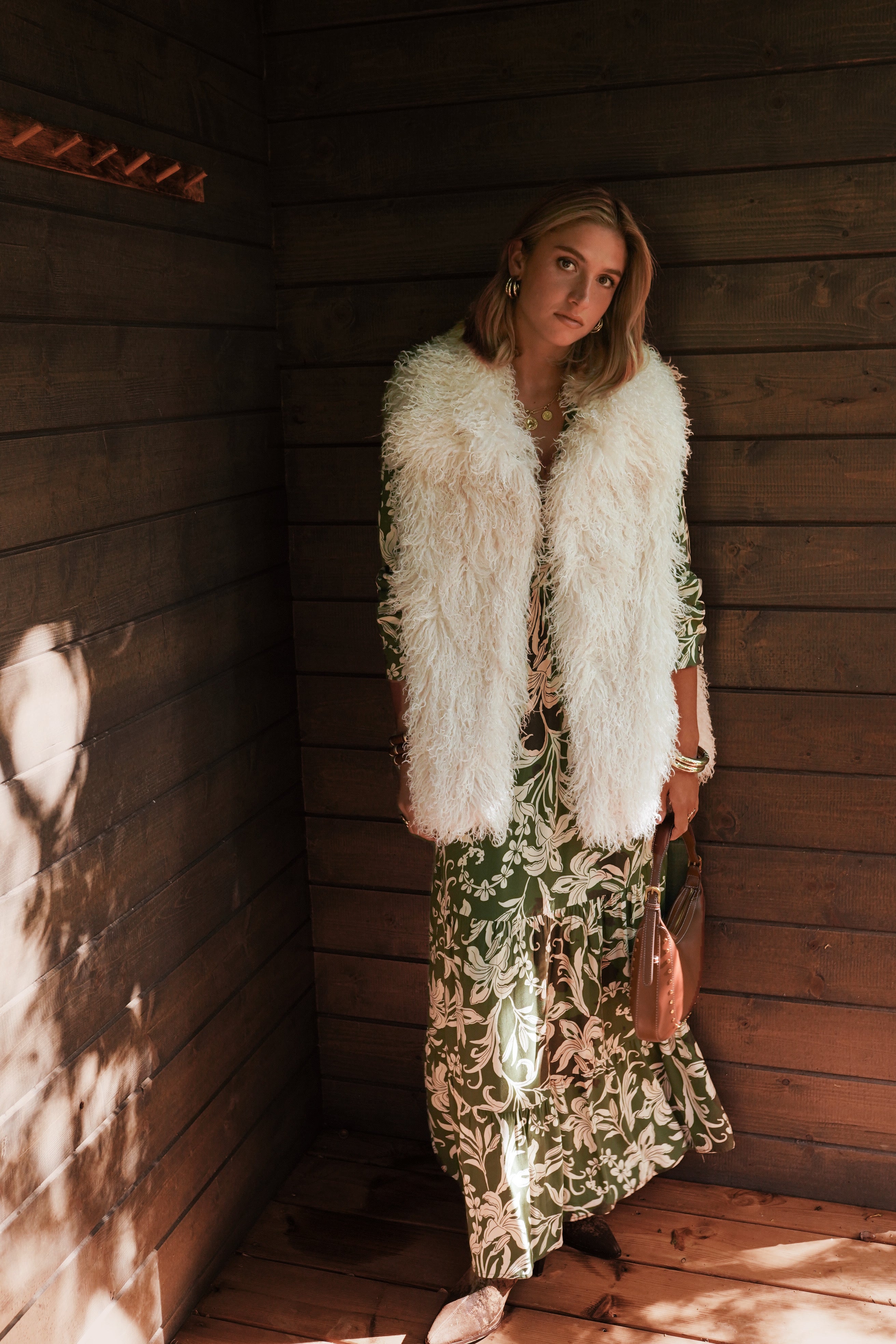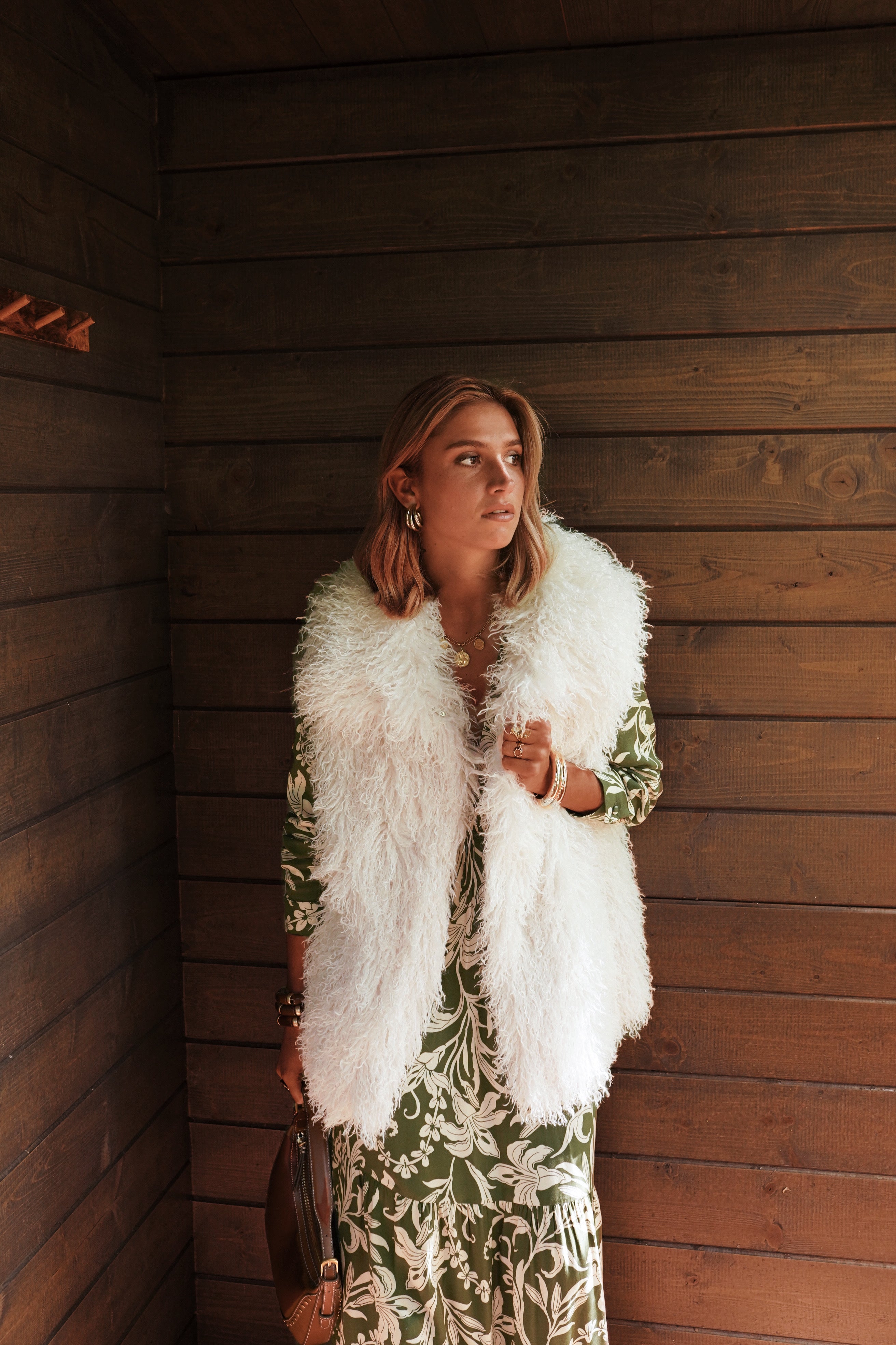 Le manteau Frann s’impose comme une pièce forte de la saison. Confectionné en fausse fourrure bouclée, il joue sur le volume et la texture pour une allure à la fois bohème et affirmée. Son blanc crème lumineux contraste avec les nuances naturelles de la saison et apporte une touche de douceur instantanée à la silhouette.