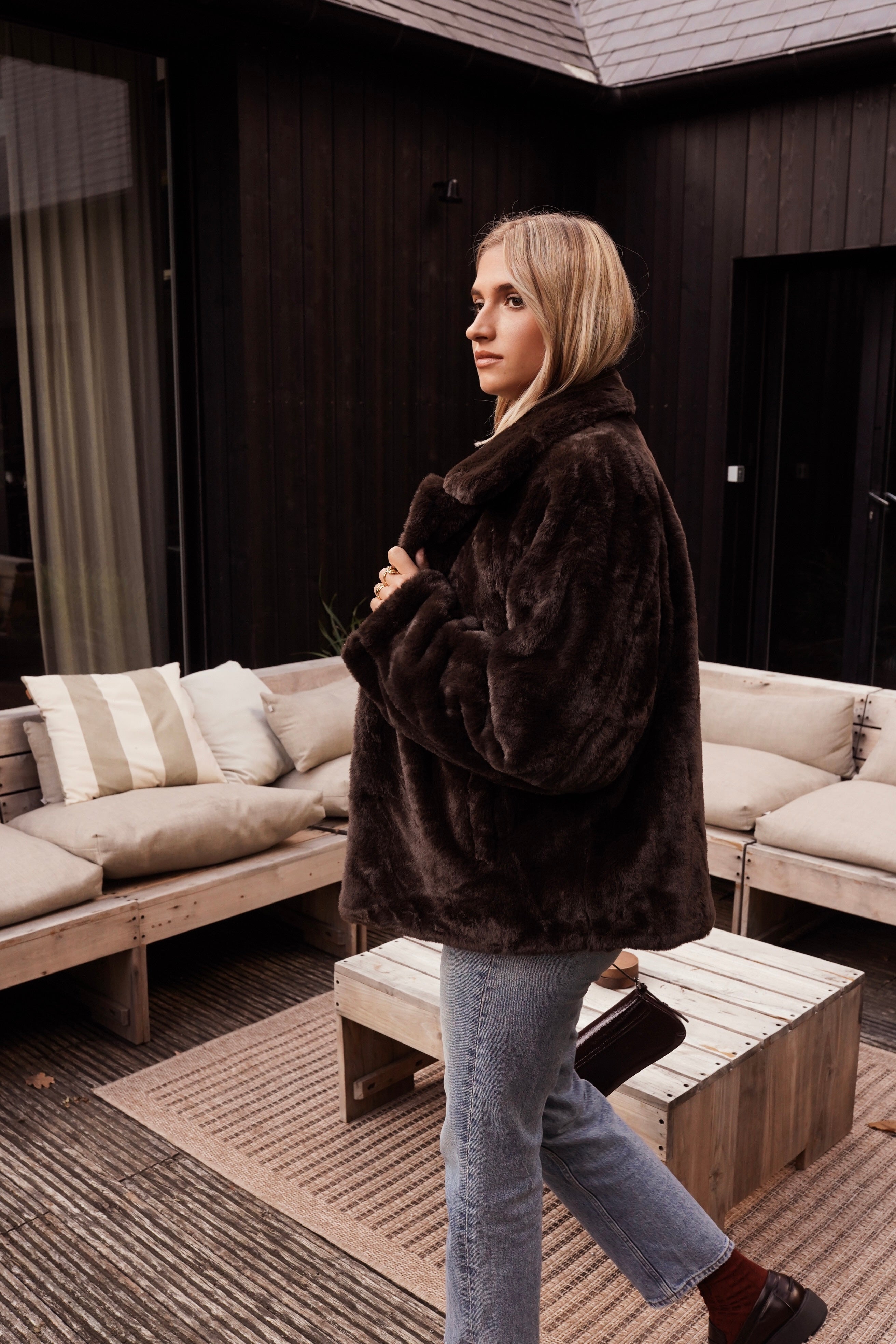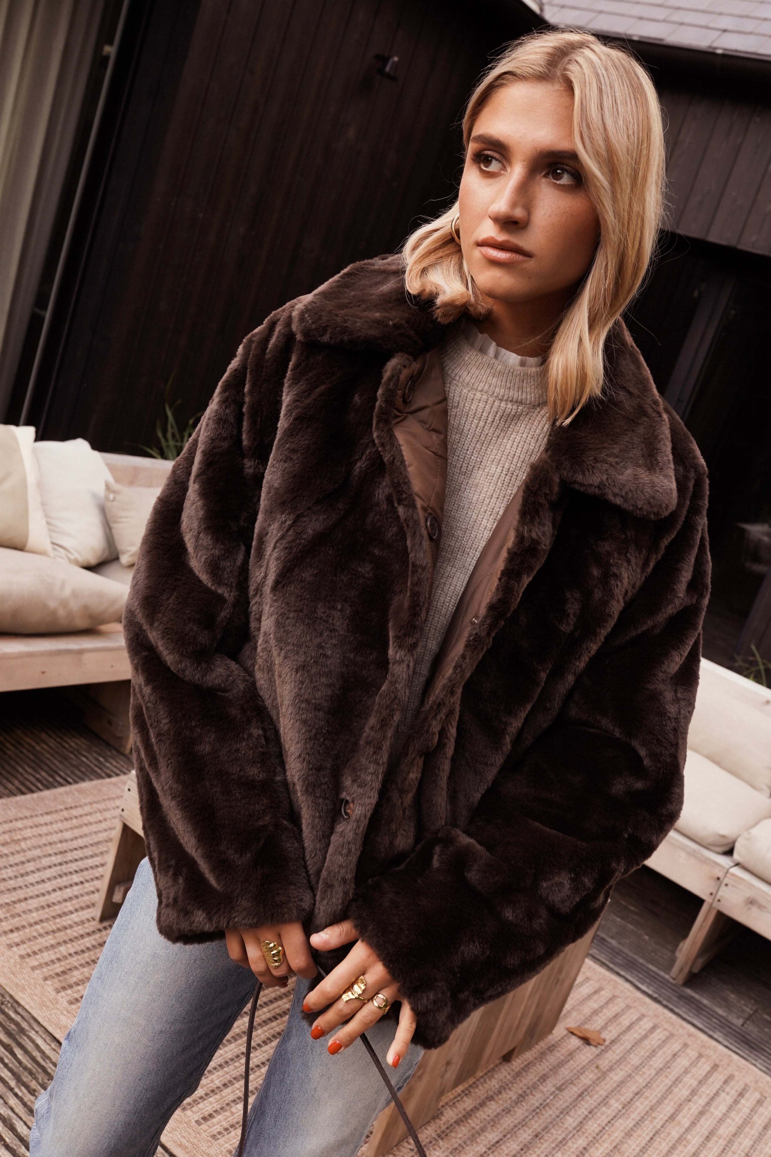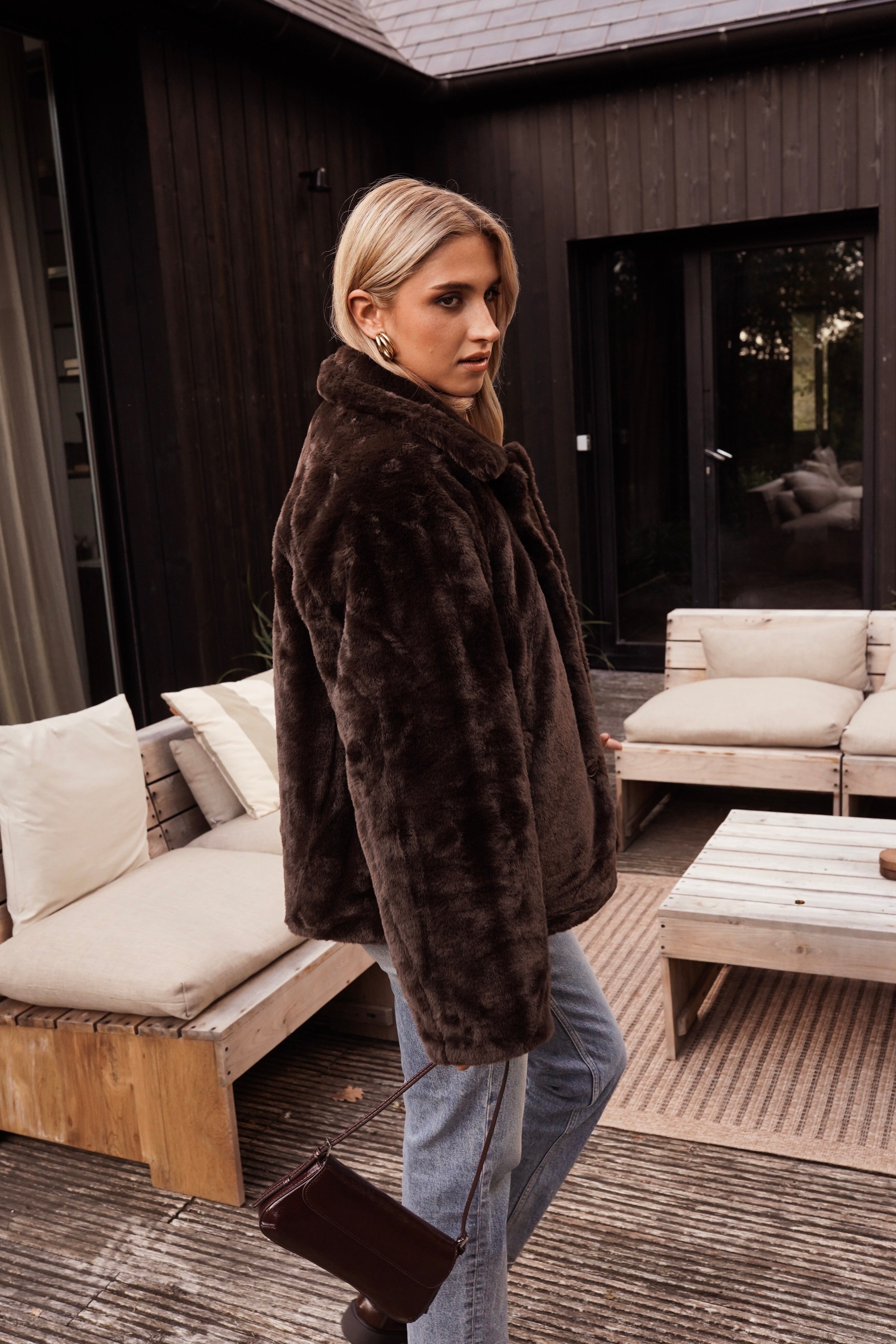Le manteau Inga est l’incarnation du confort sophistiqué. En fausse fourrure chocolat profond, il enveloppe la silhouette d’une chaleur réconfortante tout en affirmant un style résolument contemporain. Sa coupe droite et légèrement oversize lui confère cette allure effortless qu’on adore adopter dès les premiers froids.