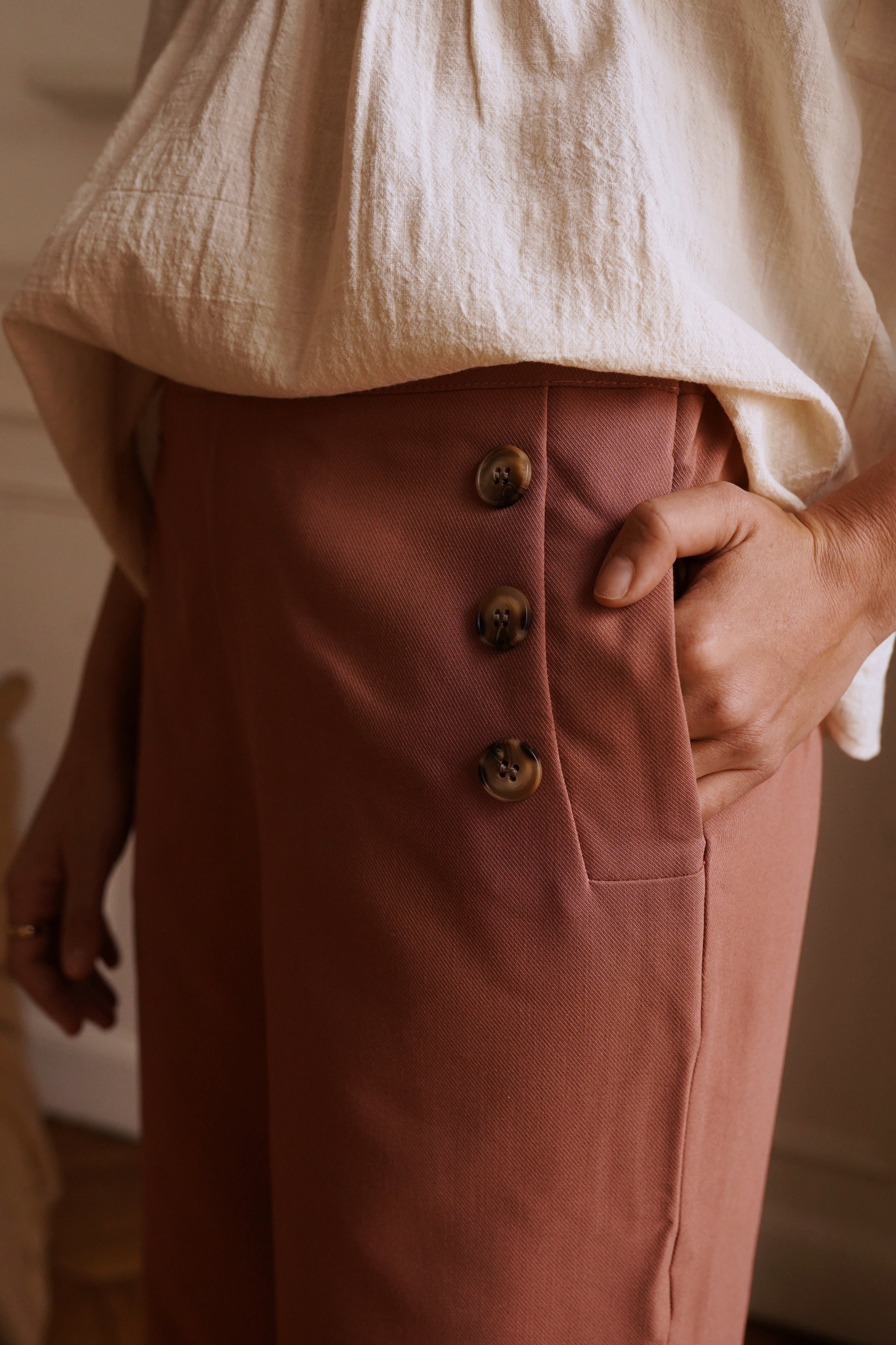 Ce pantalon de costume terracotta au style moderne allie élégance et confort . Sa coupe parfaitement ajustée met en valeur la silhouette, tandis que les boutons sur les côtés apportent une touche sophistiquée et originale. Les poches ajoutent une note pratique et raffinée, faisant de ce pantalon un choix parfait pour une allure à la fois chic et contemporaine.
