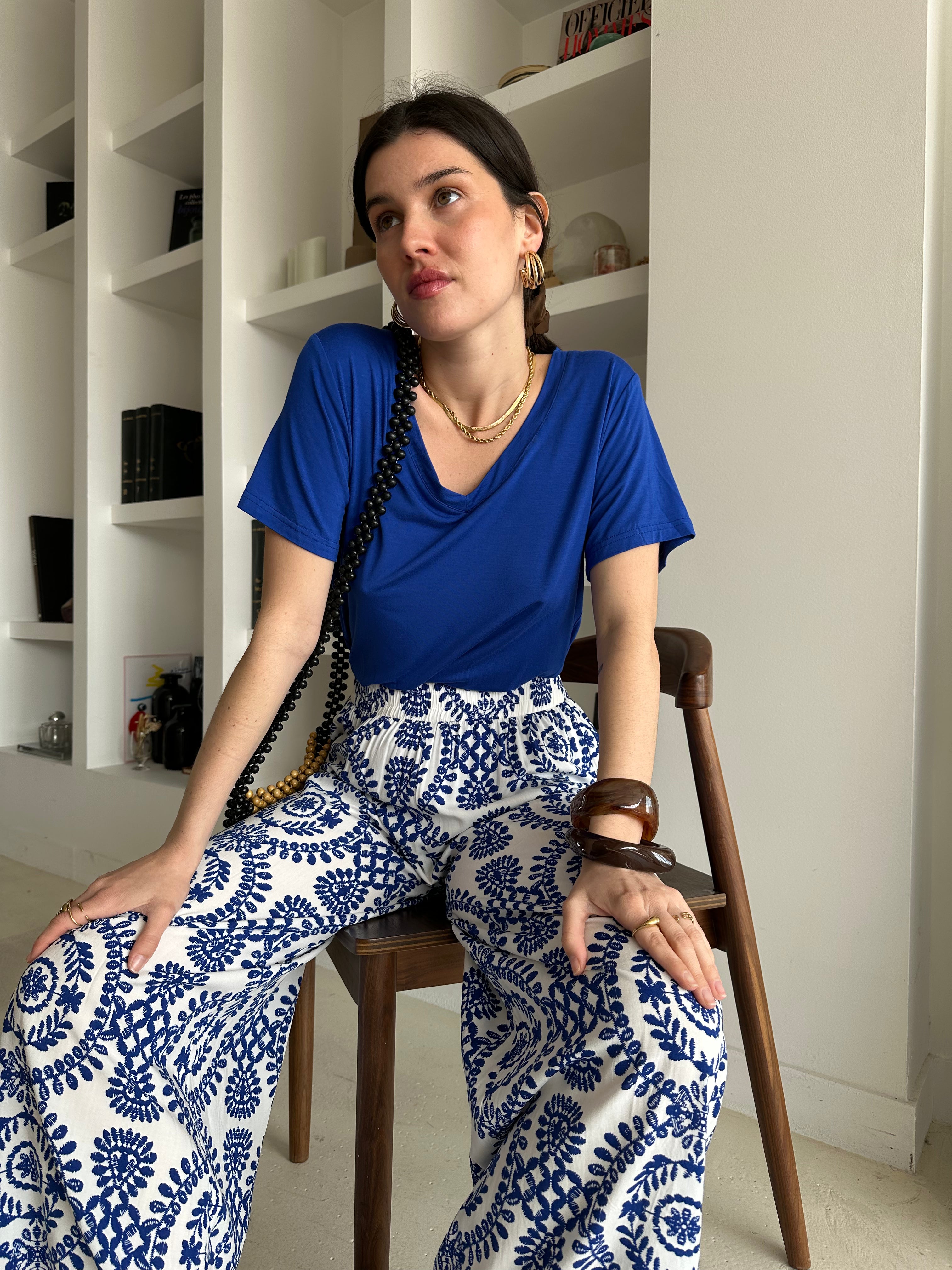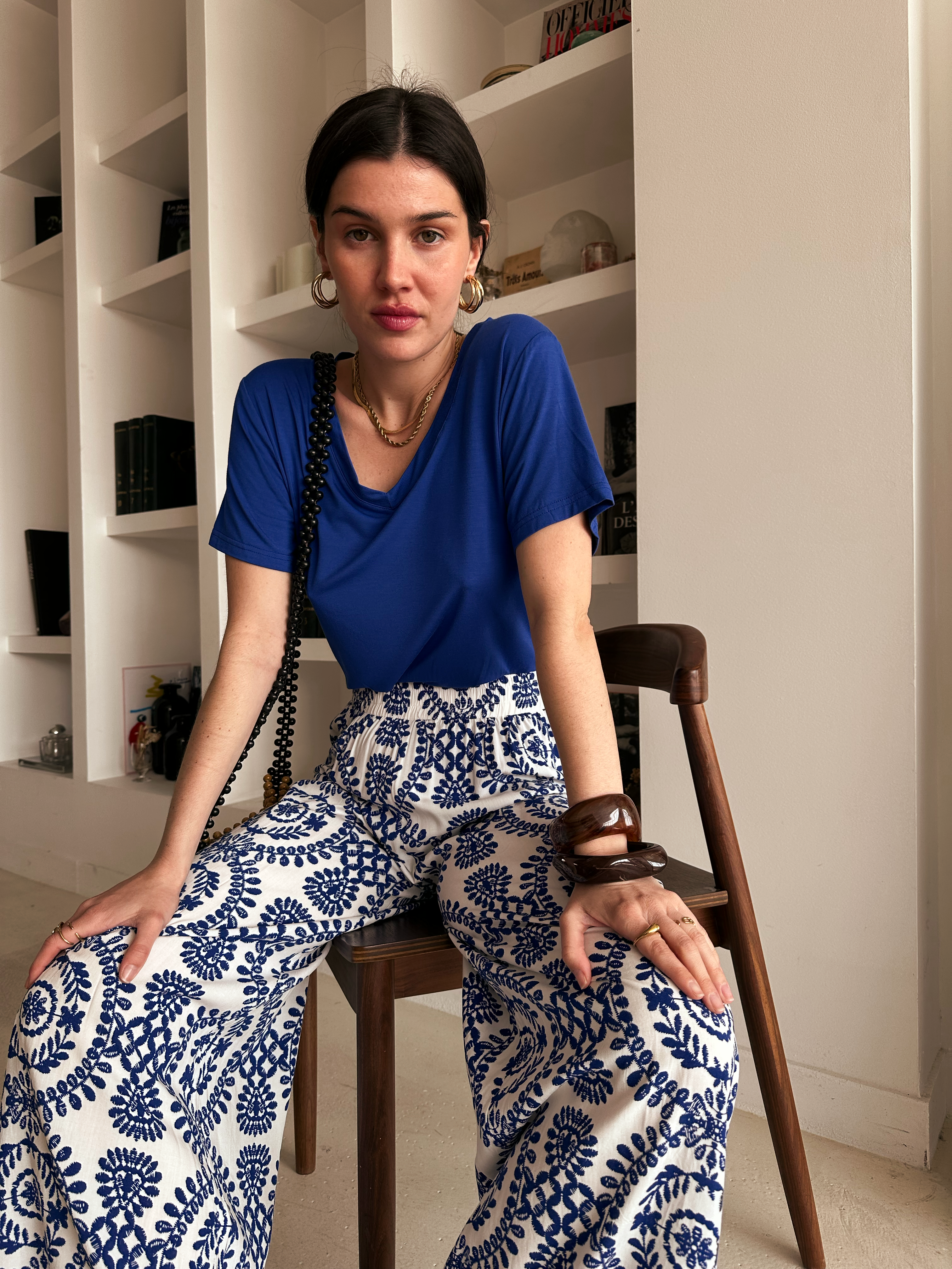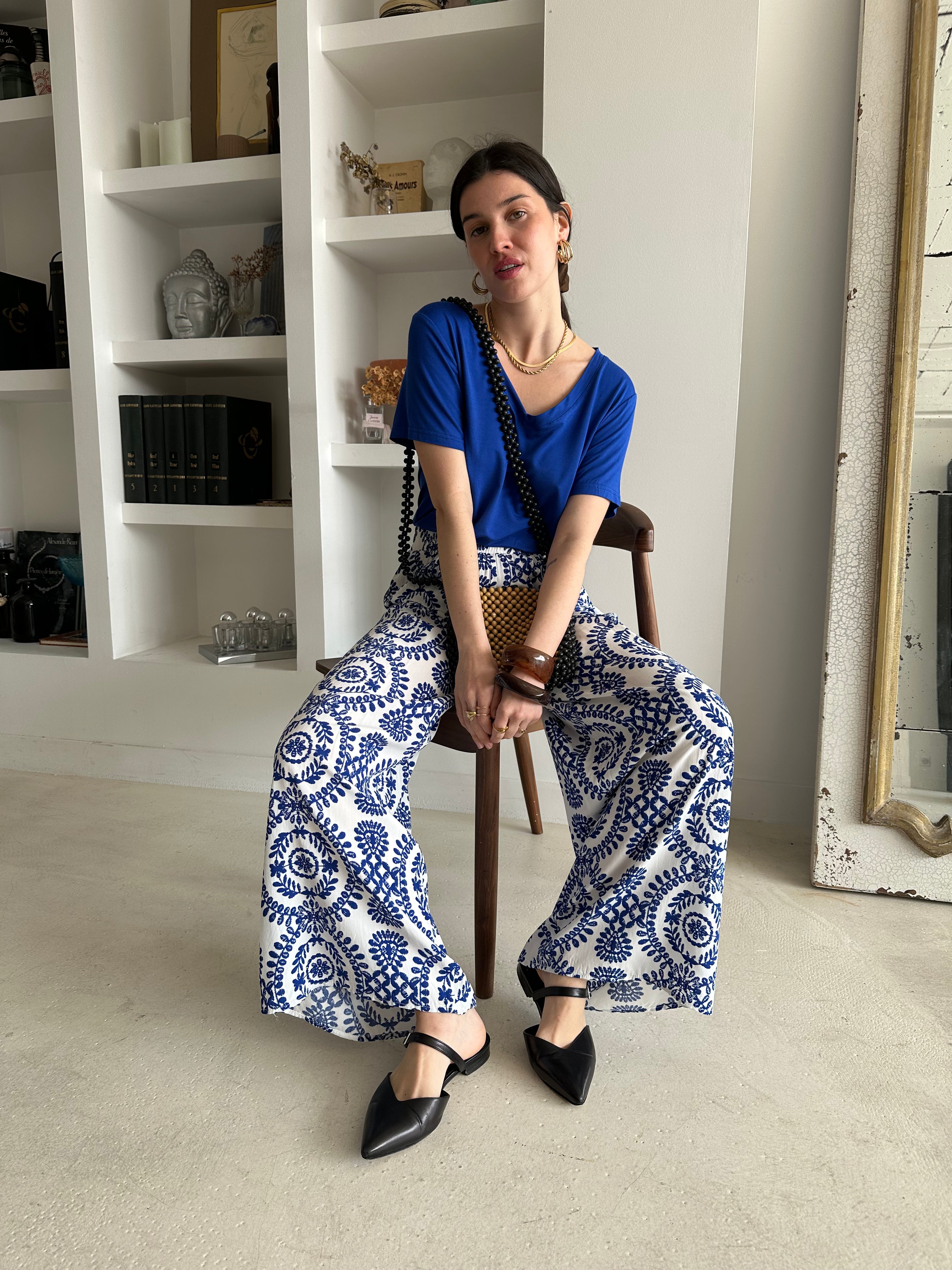 Avec son imprimé floral bleu sur fond blanc éclatant, le pantalon Noam invite à la douceur estivale.