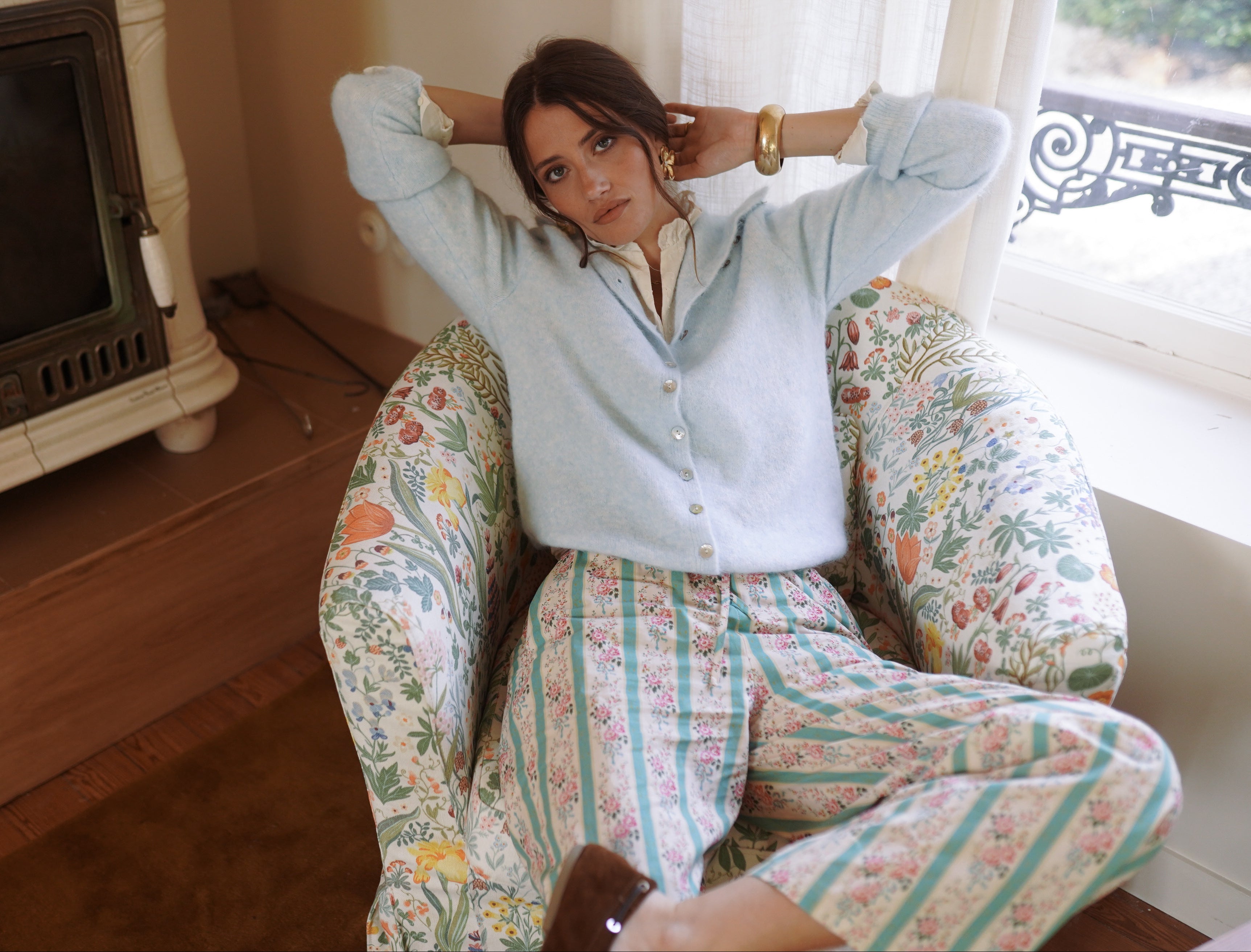 Paolo est un pantalon fluide à l’imprimé floral vertical, rythmé par de fines rayures vertes. Sa taille souple et sa coupe droite dessinent une silhouette légère.