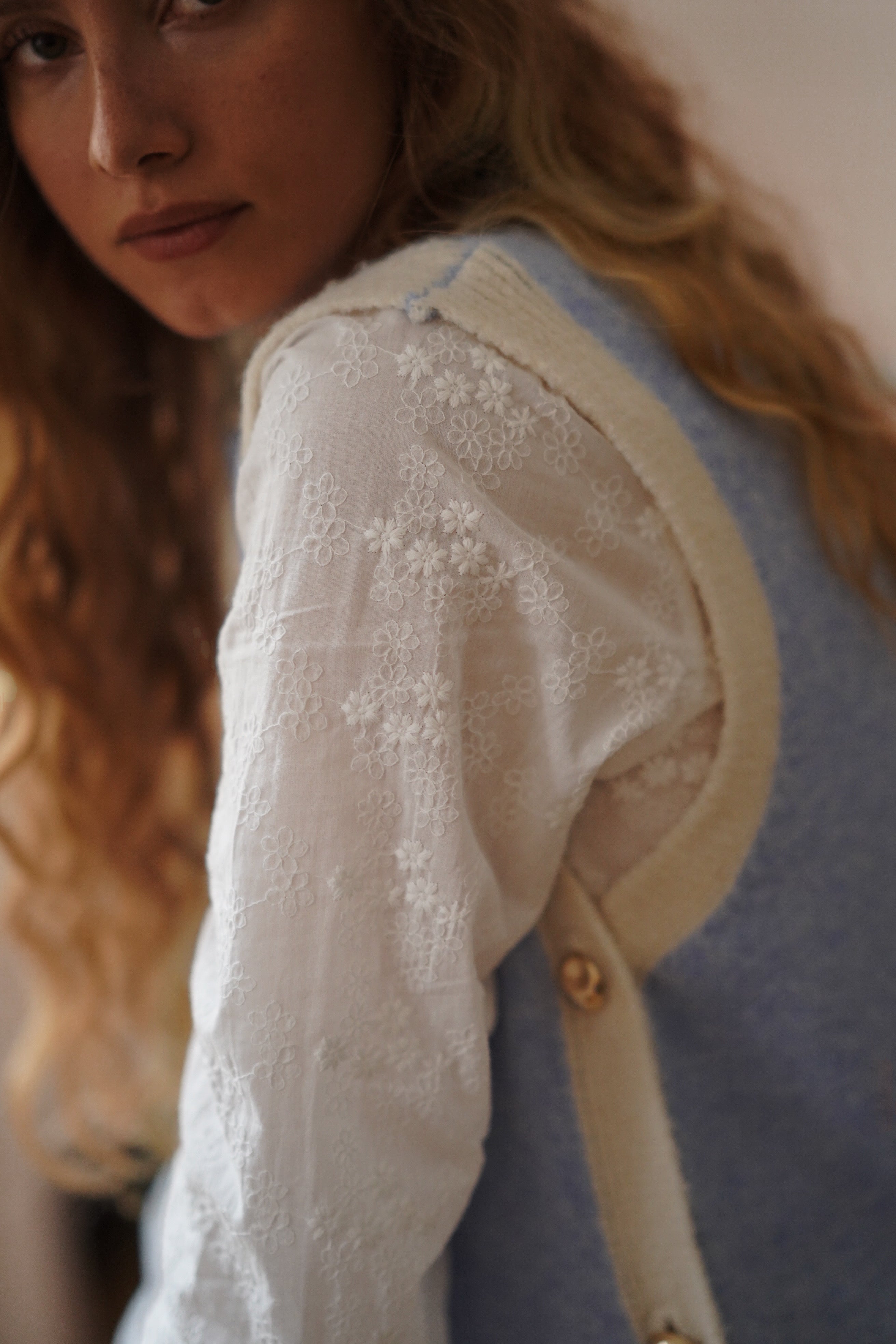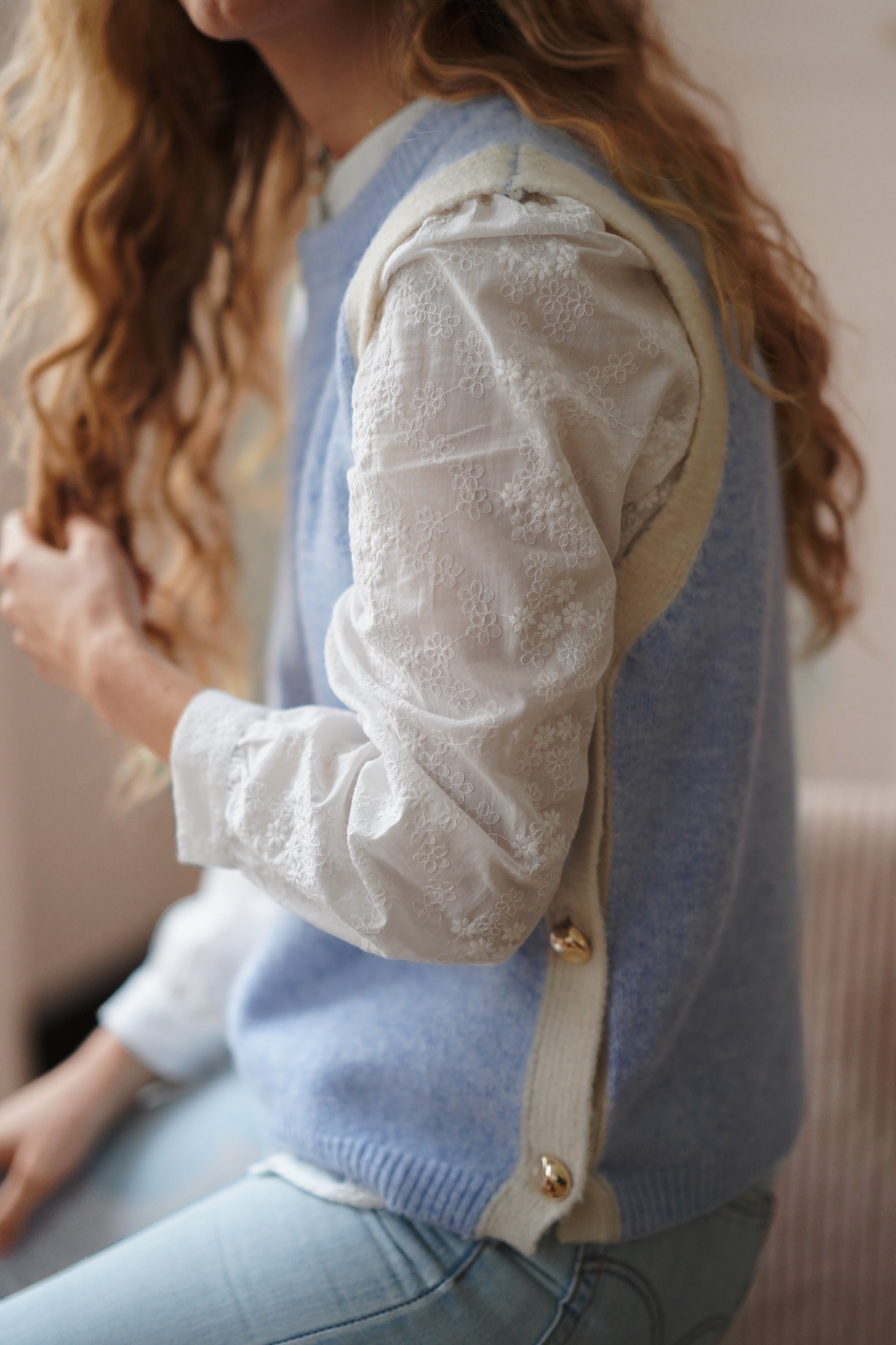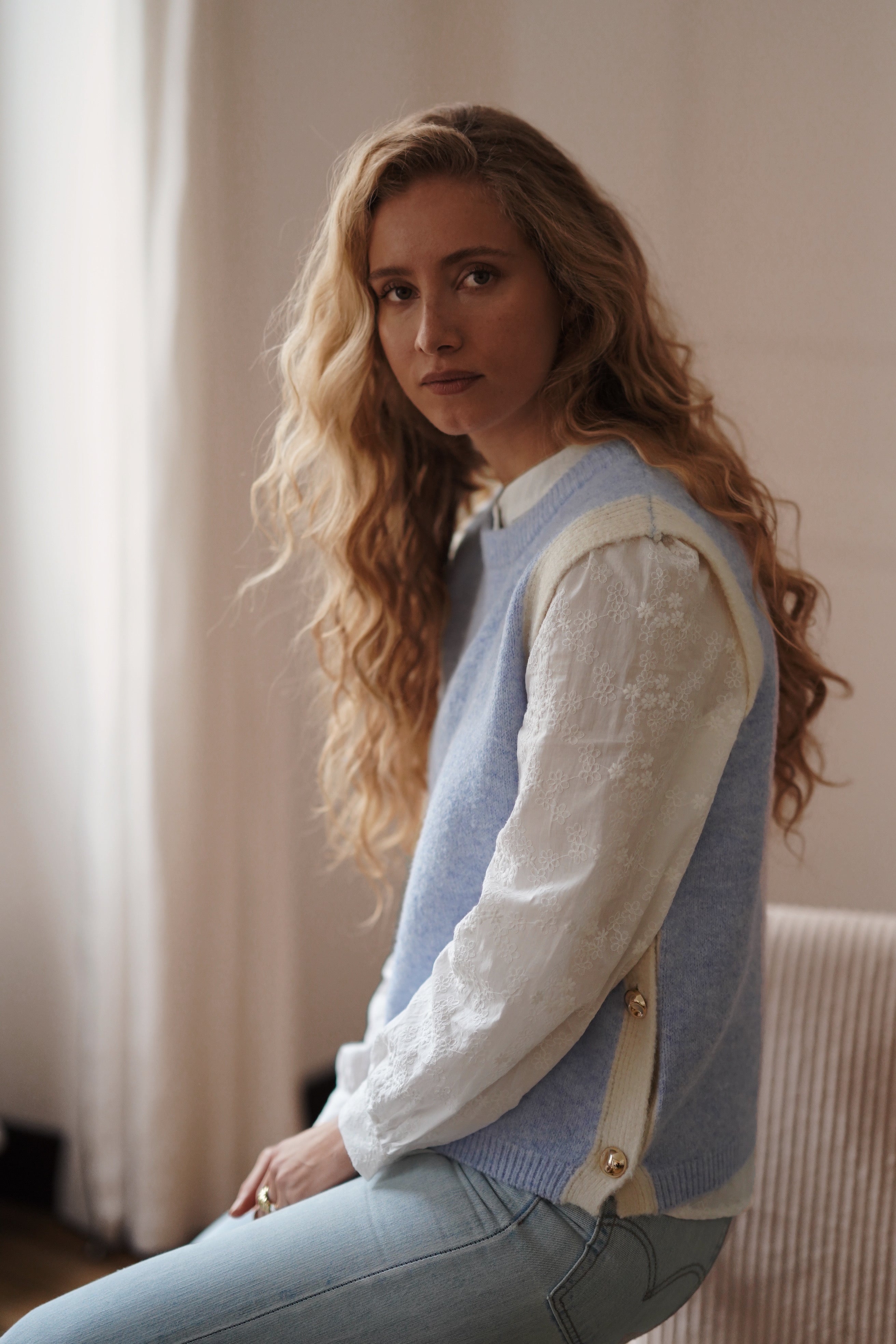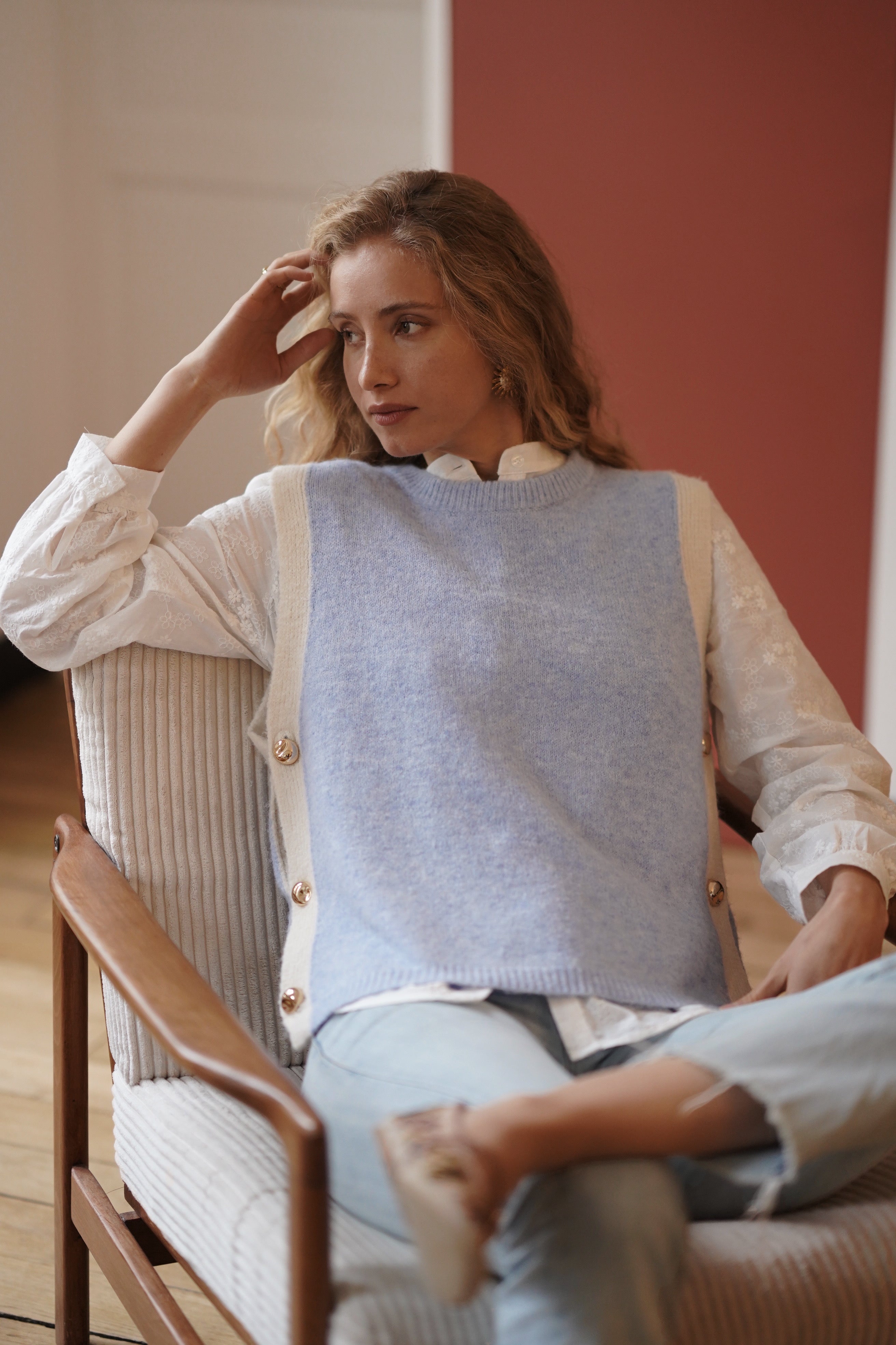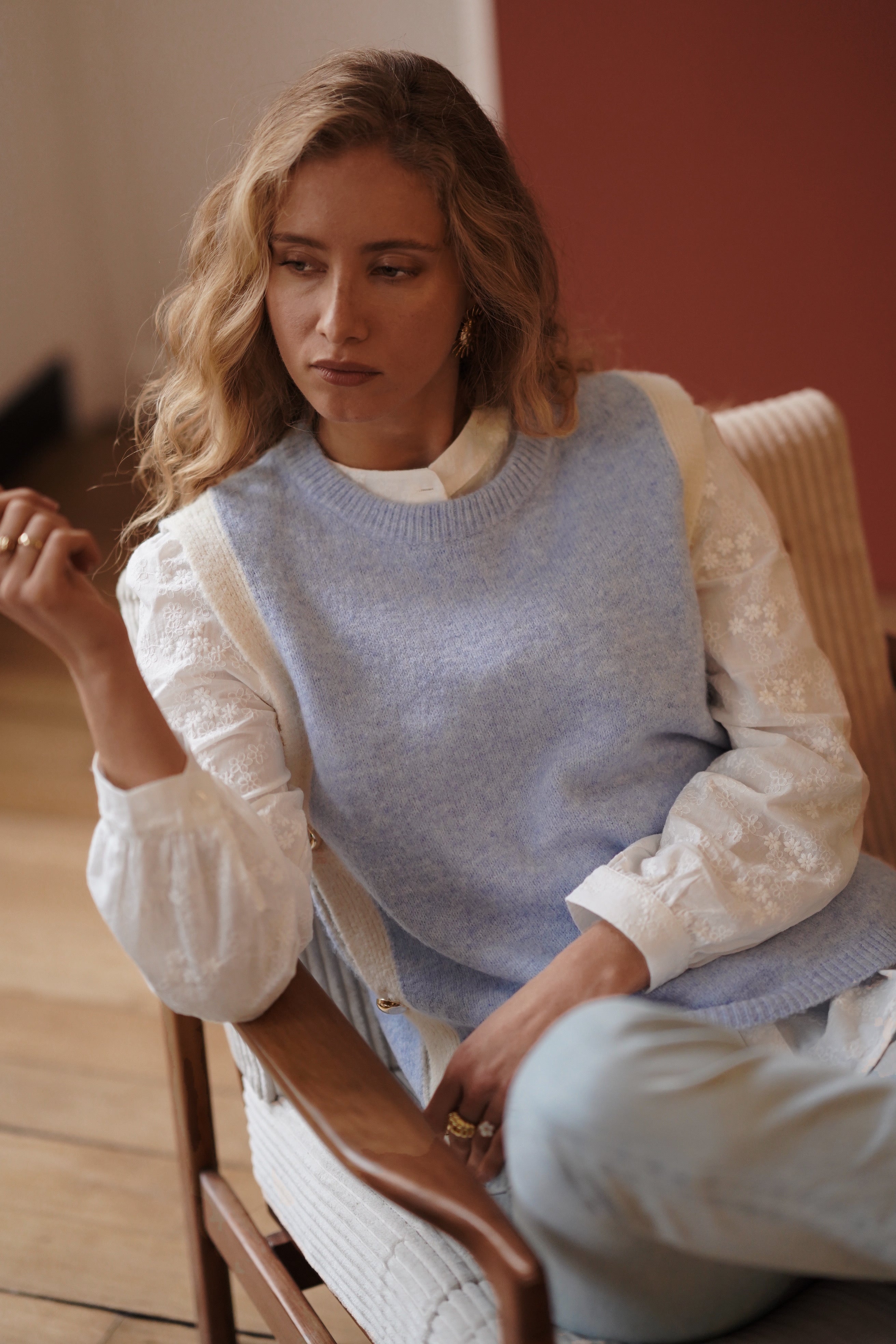 Ce pull Nila sans manches en maille est la pièce cosy et tendance parfaite pour la mi-saison. Avec son joli mélange de bleu pastel et de détails crème, il apporte une touche douce et lumineuse à n'importe quelle tenue.