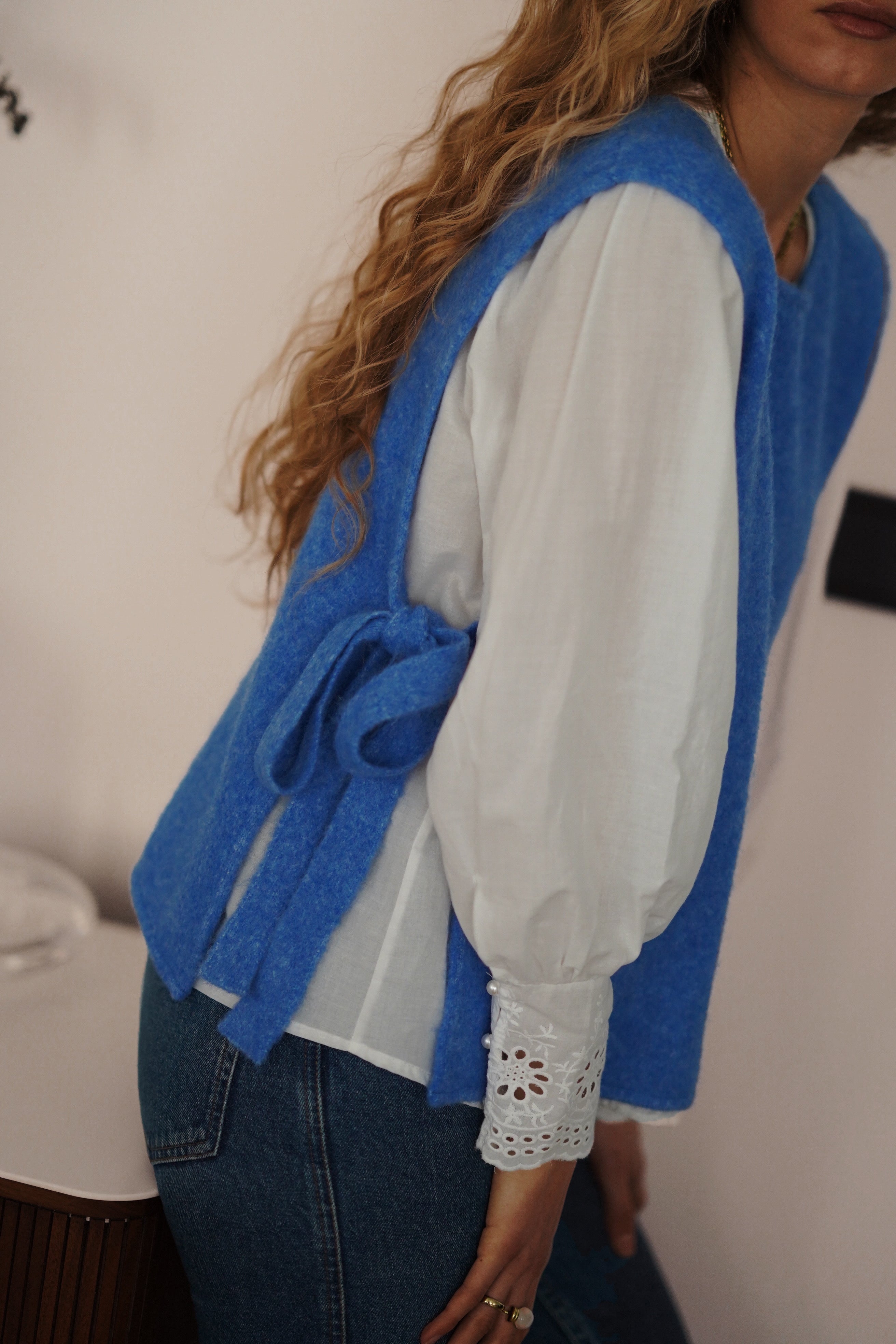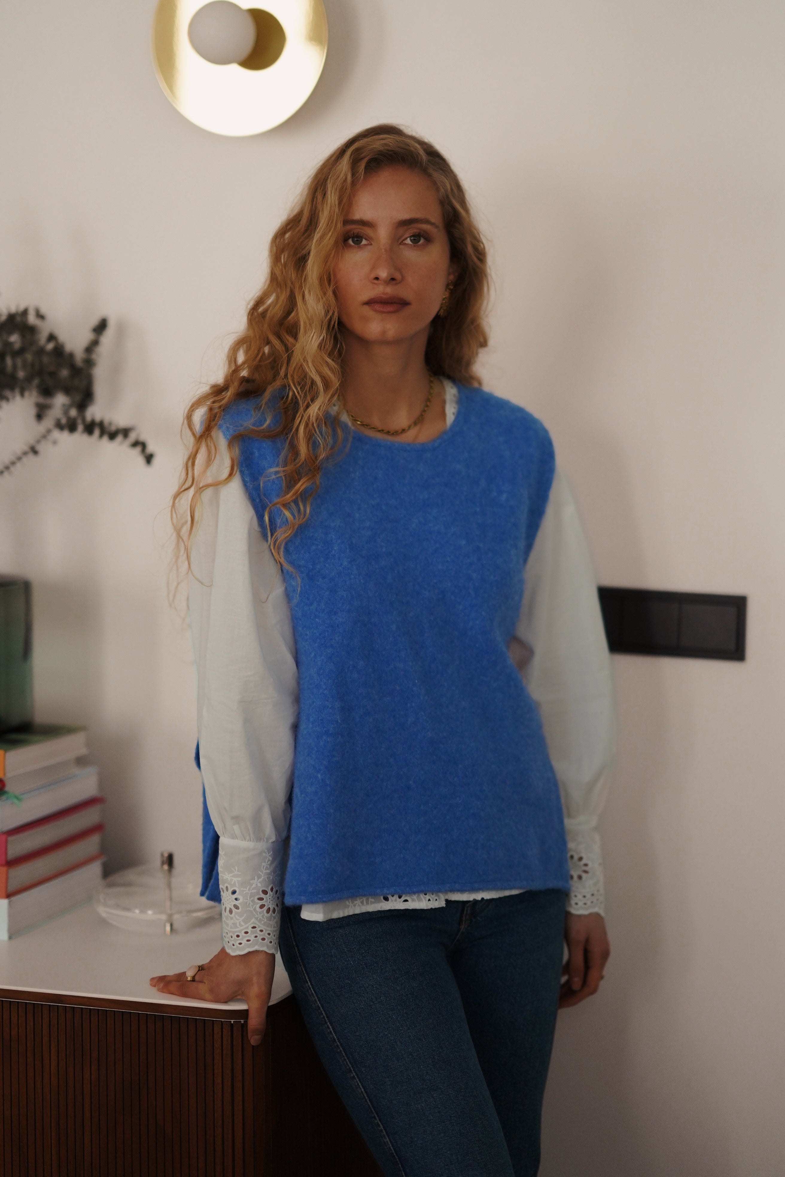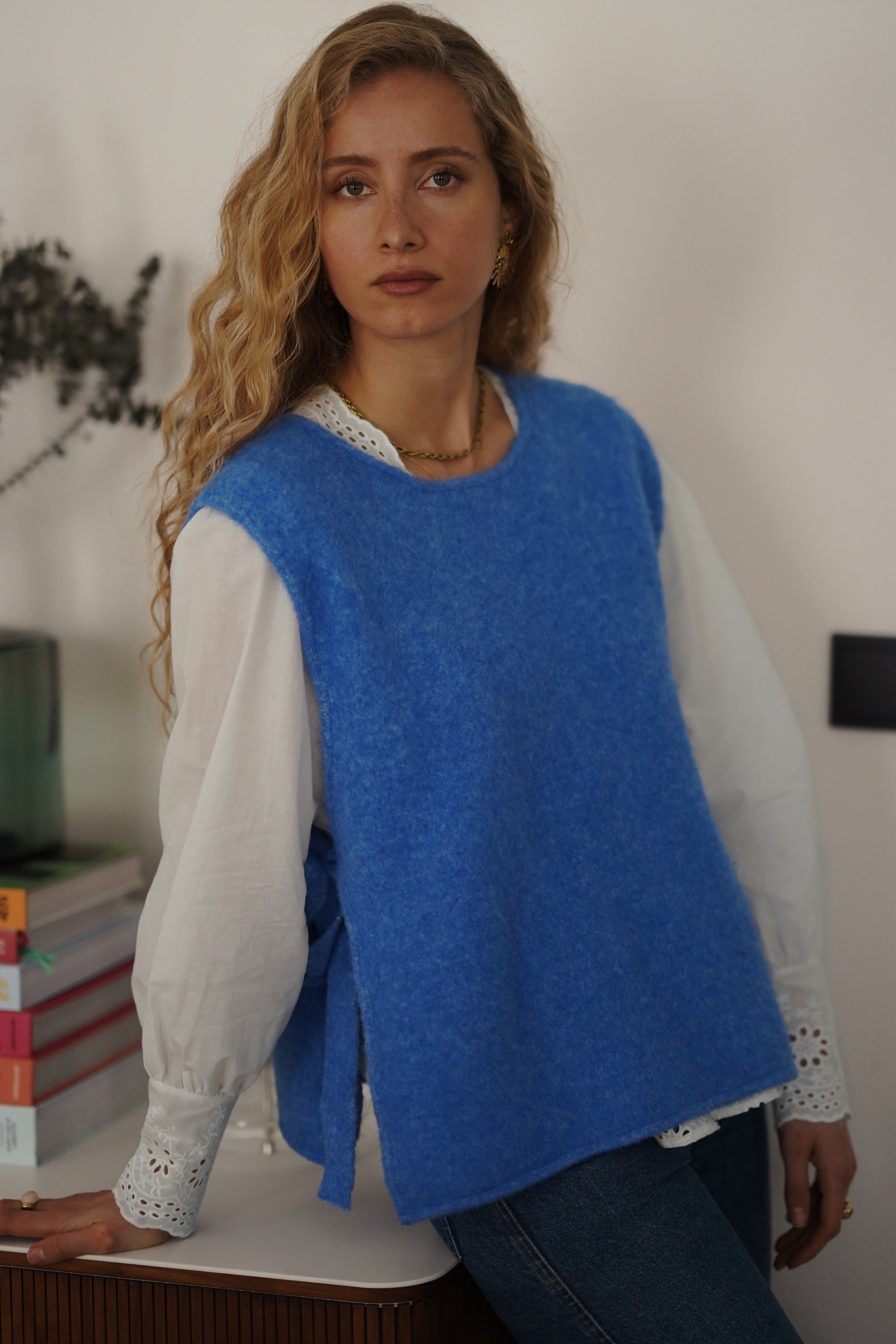 Ce pull sans manches en laine texturée mise sur une silhouette épurée et moderne avec une touche de douceur. Son bleu éclatant en fait une pièce forte qui dynamise instantanément une tenue.