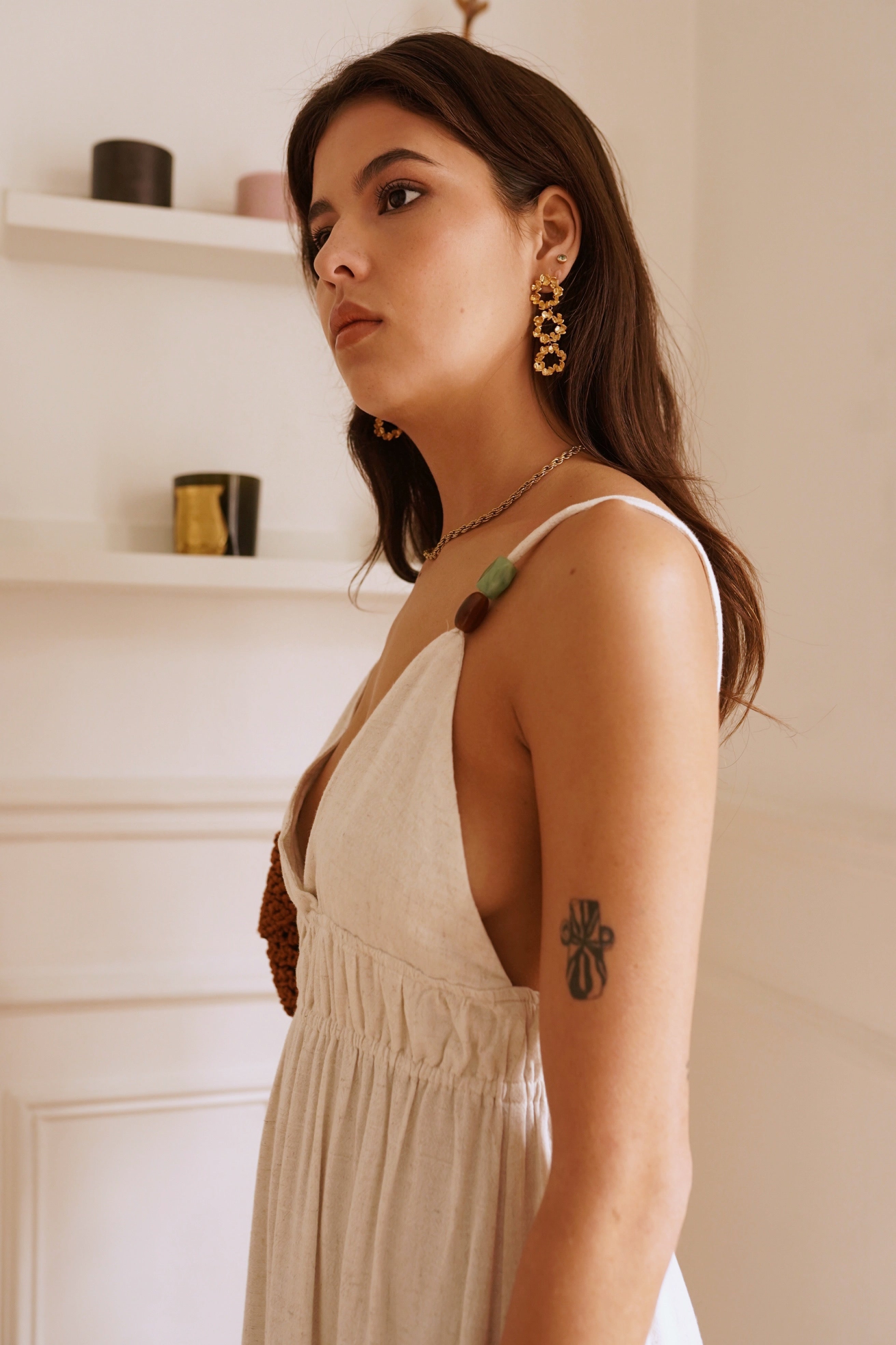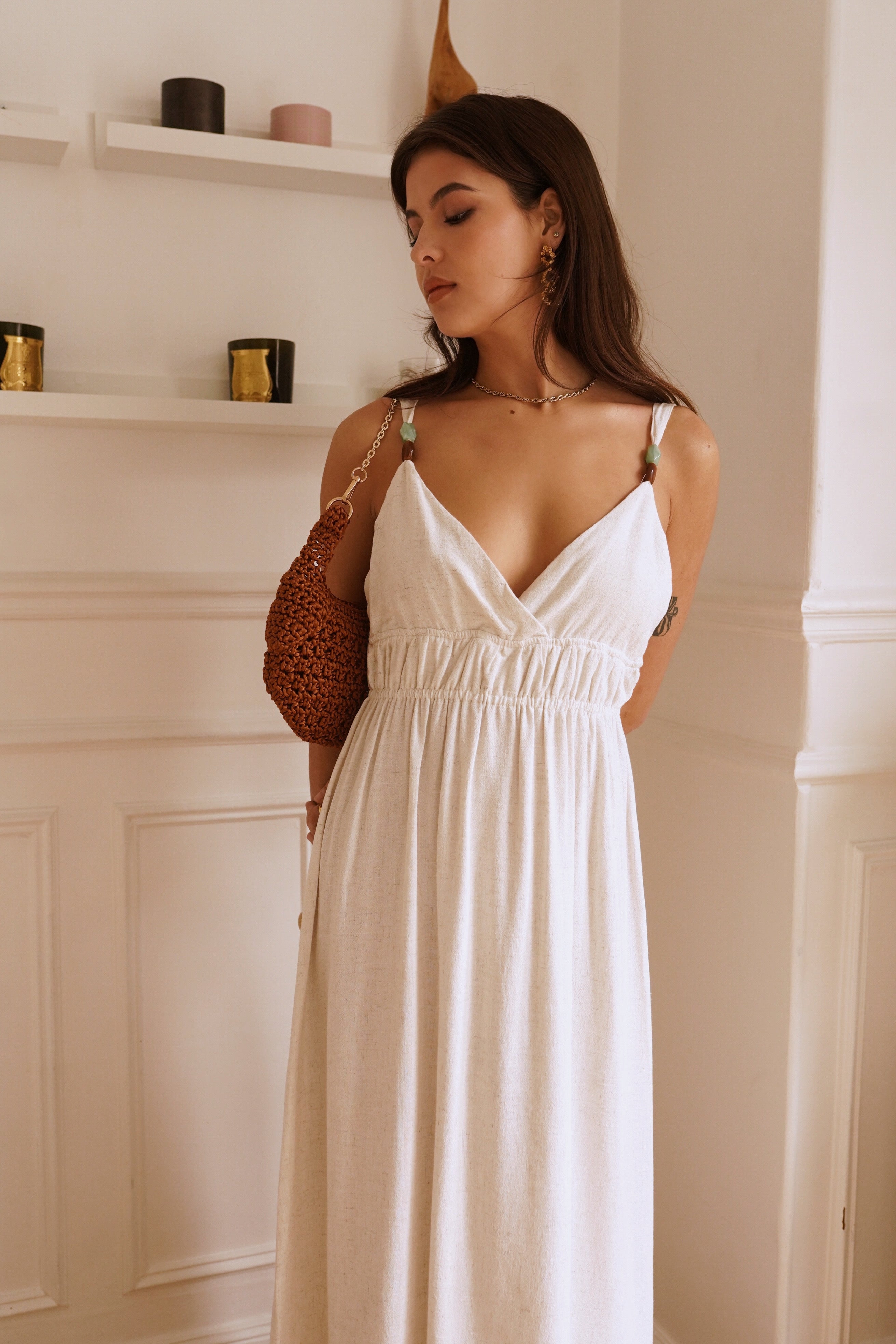 Cette robe blanche longue et cintrée allie sophistication et féminité. Sa coupe flatteuse épouse parfaitement la silhouette, mettant en valeur la taille pour une allure gracieuse et élégante. Les bretelles délicatement ornées de perles ajoutent une touche de raffinement soulignant le côté chic de la robe. Confectionnée dans un tissu fluide et léger, elle est idéale pour des occasions spéciales telles.Une pièce intemporelle qui combine élégance classique et détails modernes.