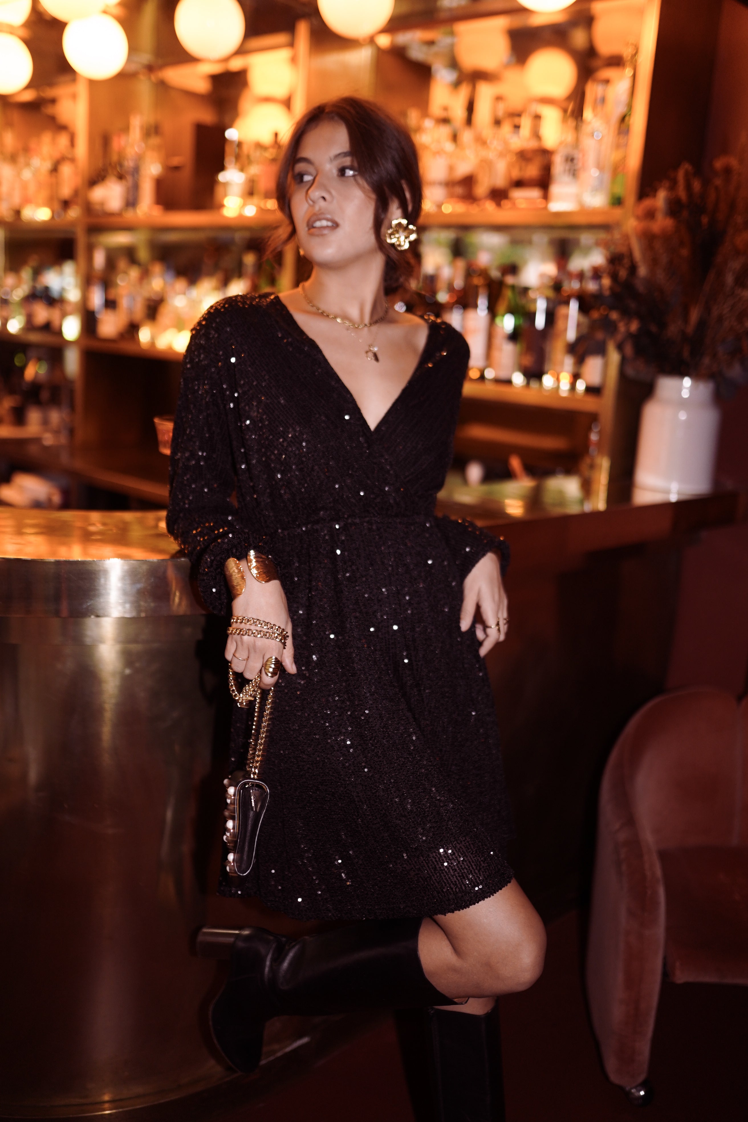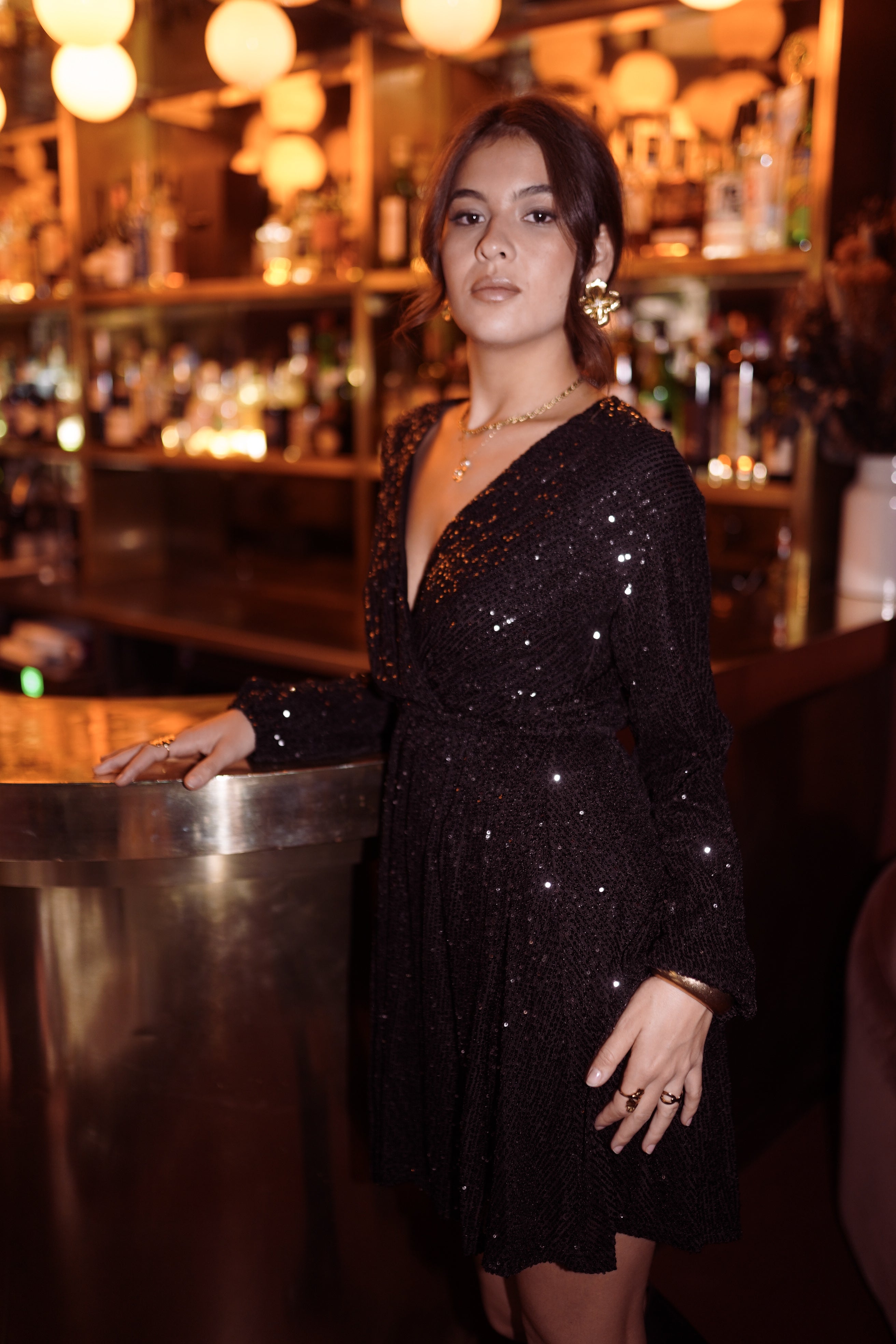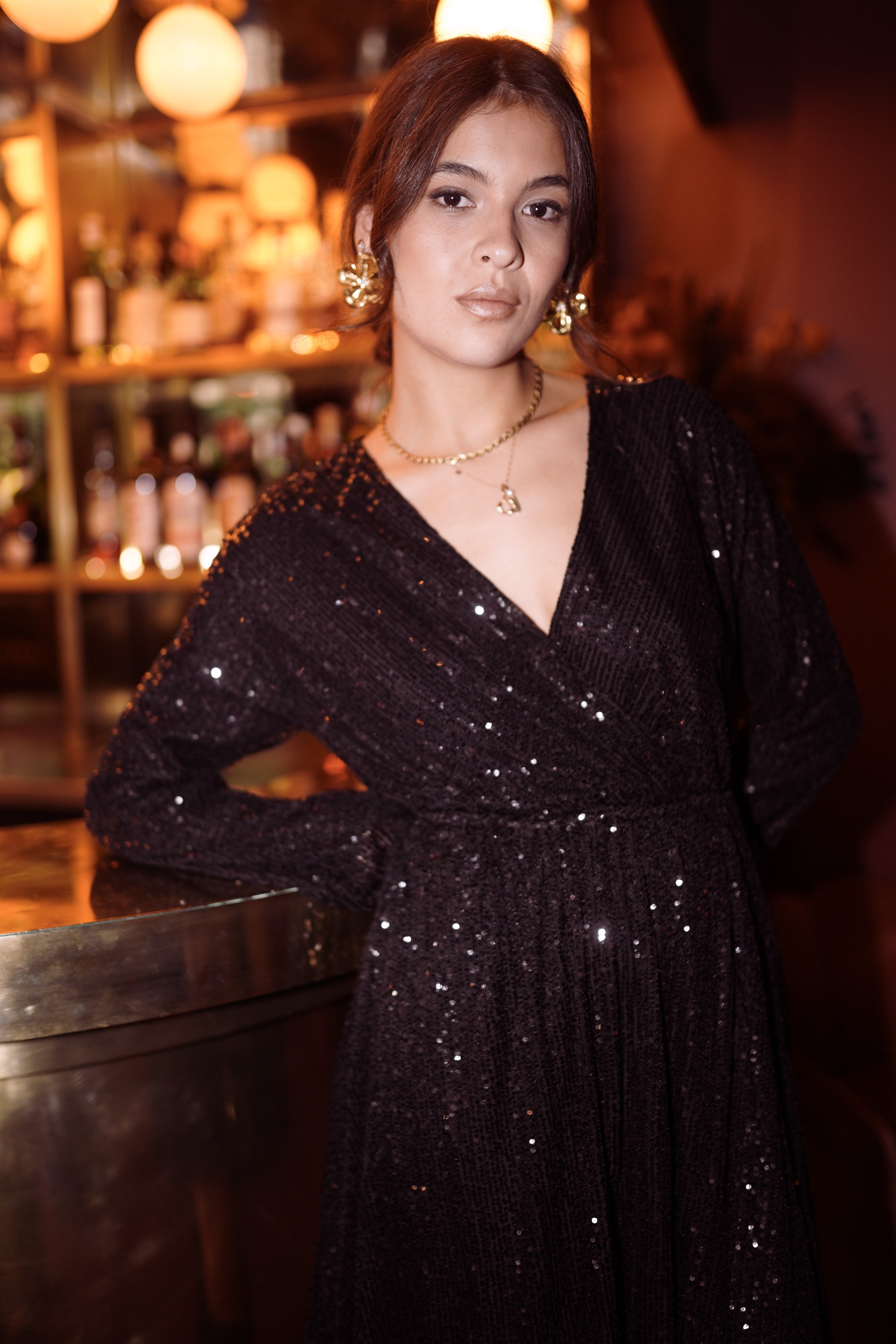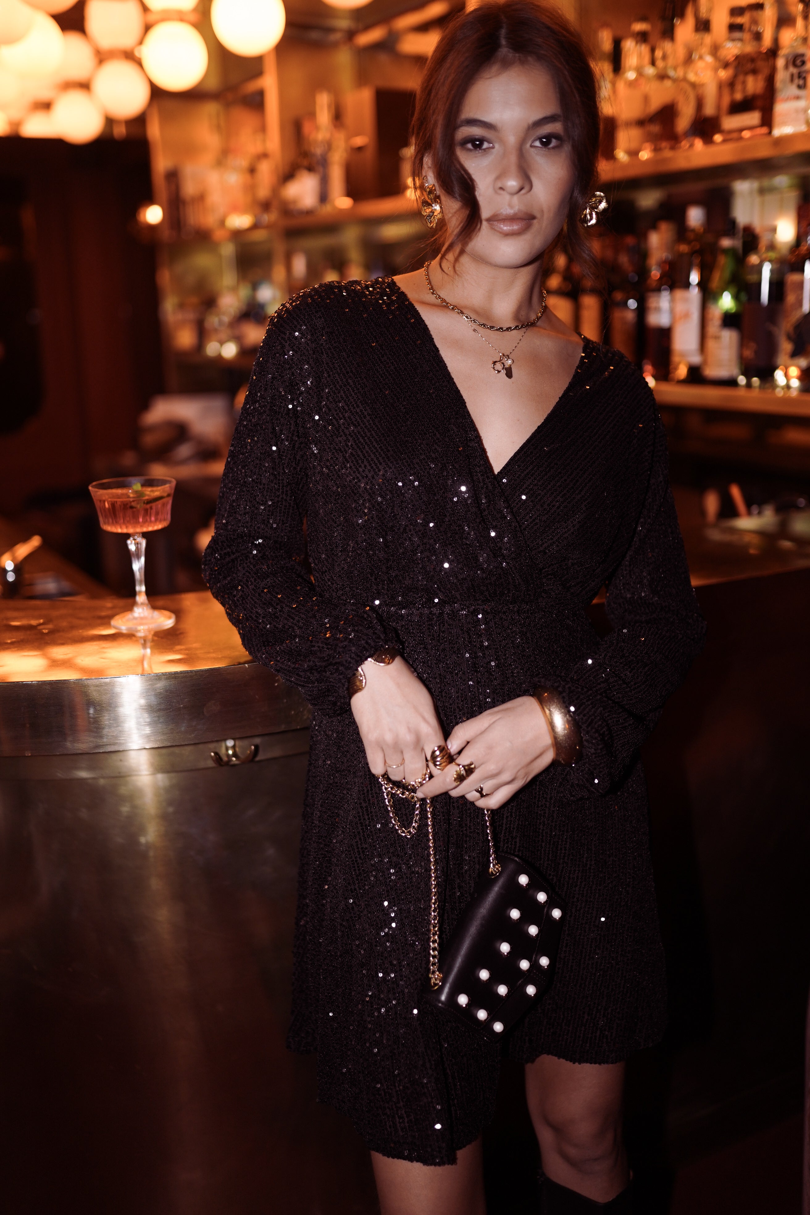 Blackie dévoile un jeu de sequins noirs qui illumine la silhouette tout en restant subtile. Sa coupe souple, marquée à la taille, accompagne les mouvements et crée une allure à la fois féminine, moderne et pleine de caractère. Un essentiel pour briller jusqu’au bout de la nuit.