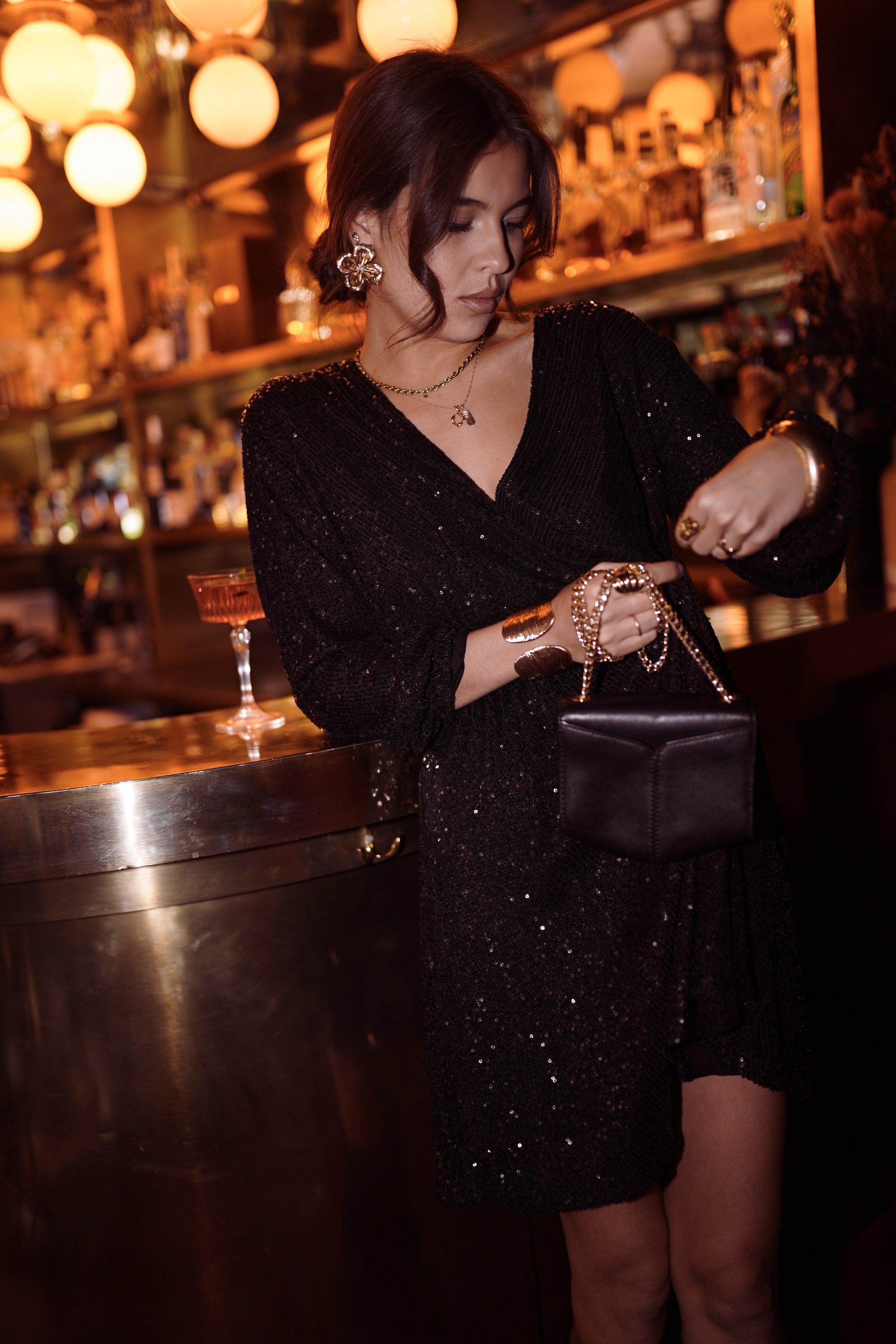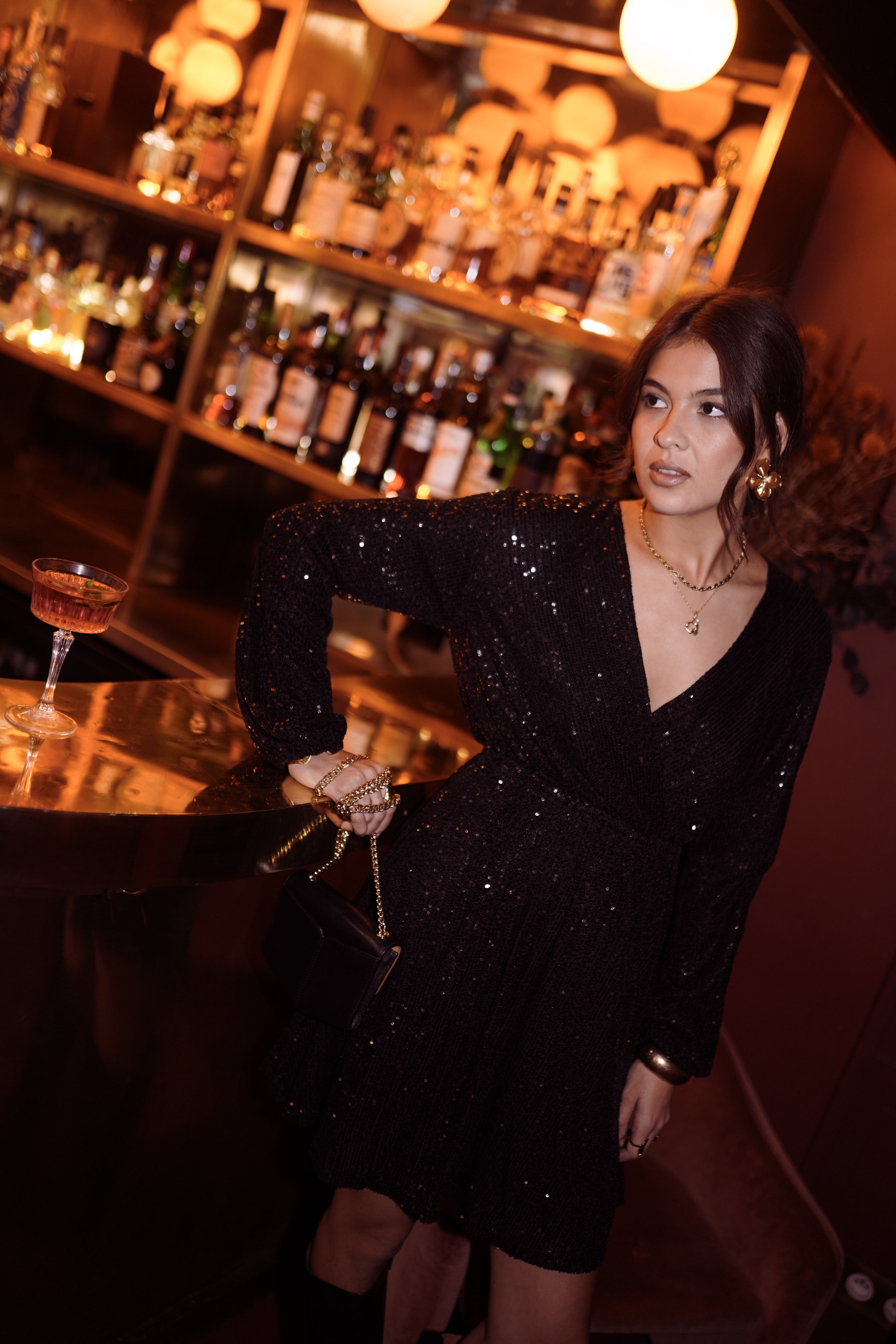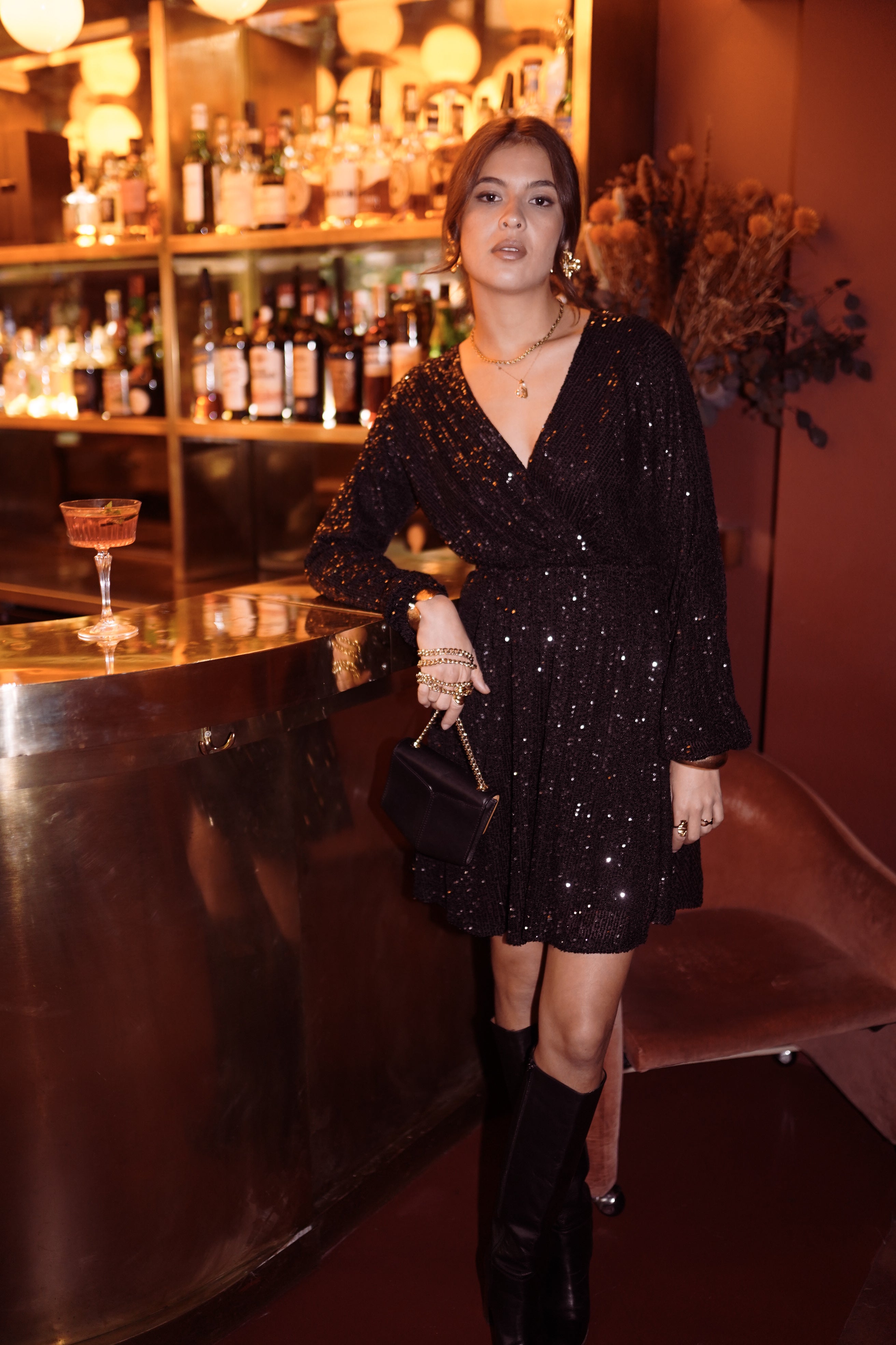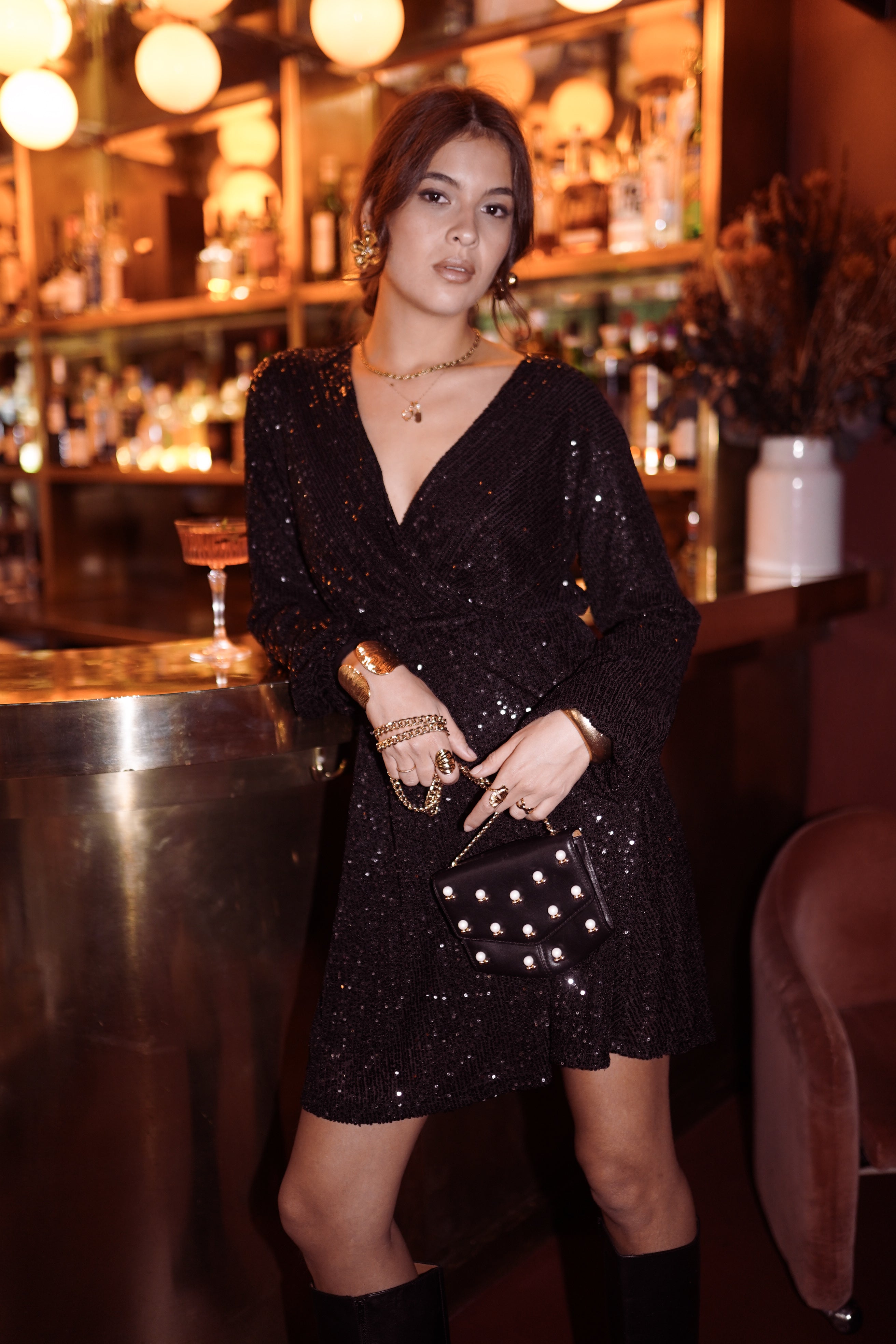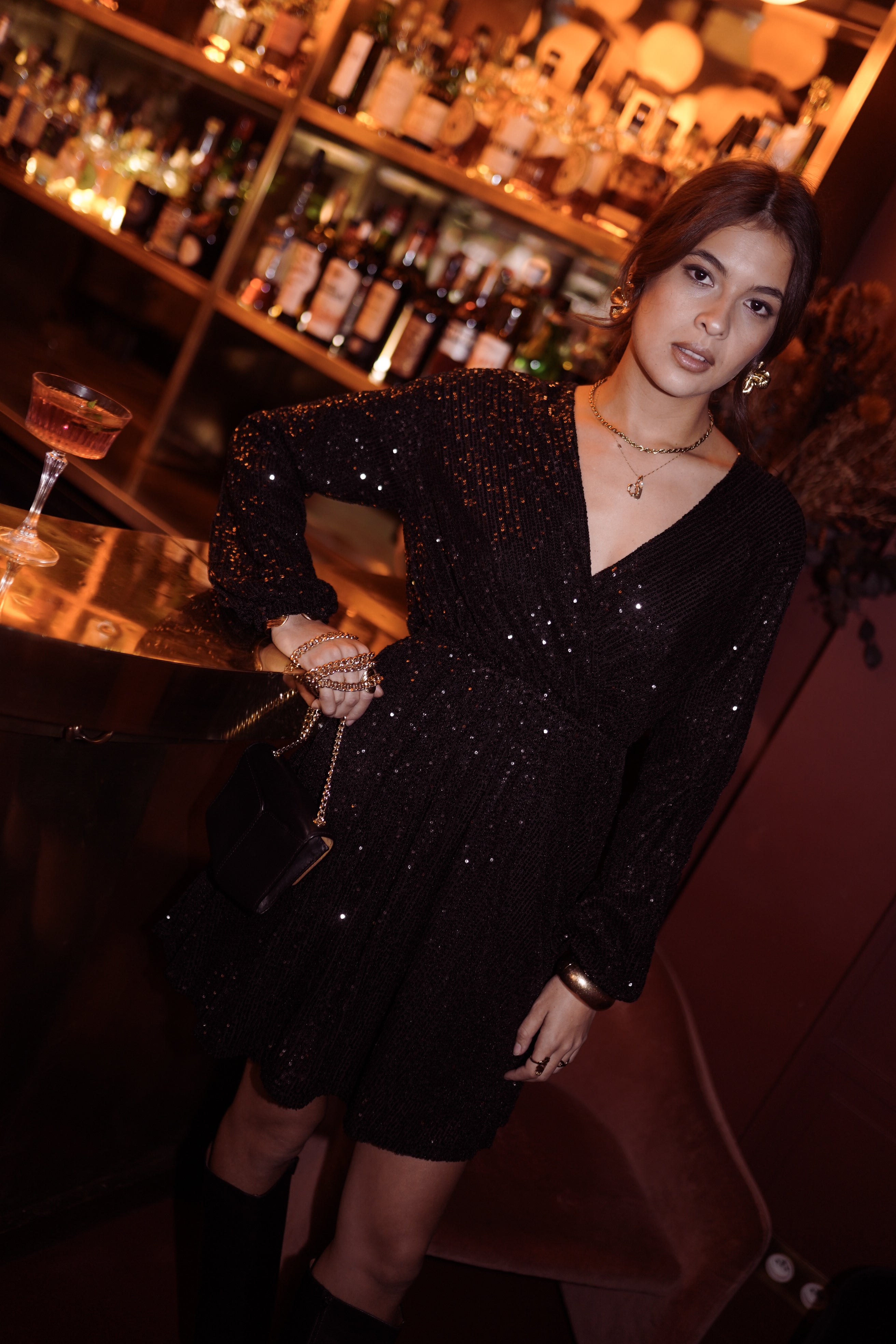 Blackie dévoile un jeu de sequins noirs qui illumine la silhouette tout en restant subtile. Sa coupe souple, marquée à la taille, accompagne les mouvements et crée une allure à la fois féminine, moderne et pleine de caractère. Un essentiel pour briller jusqu’au bout de la nuit.