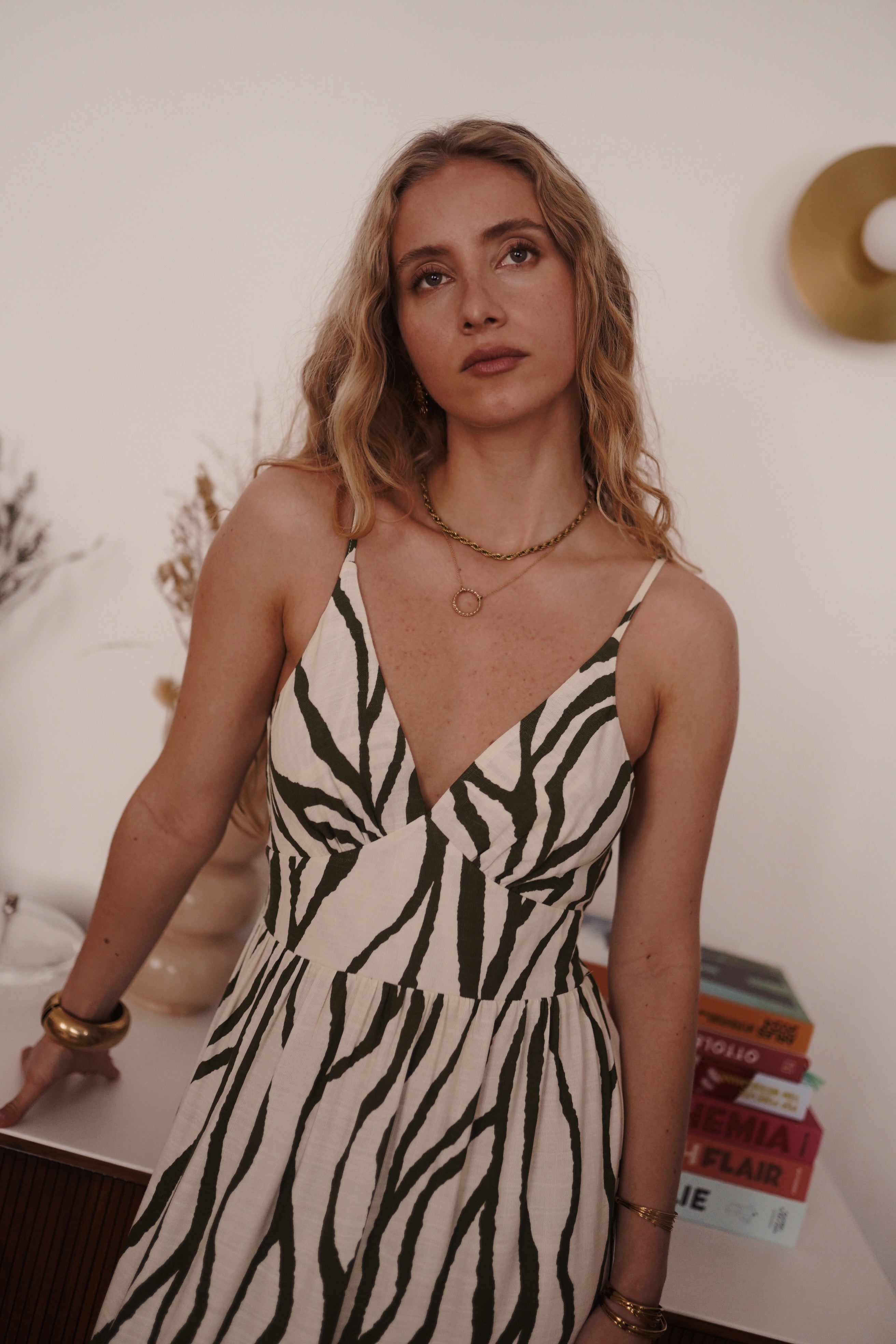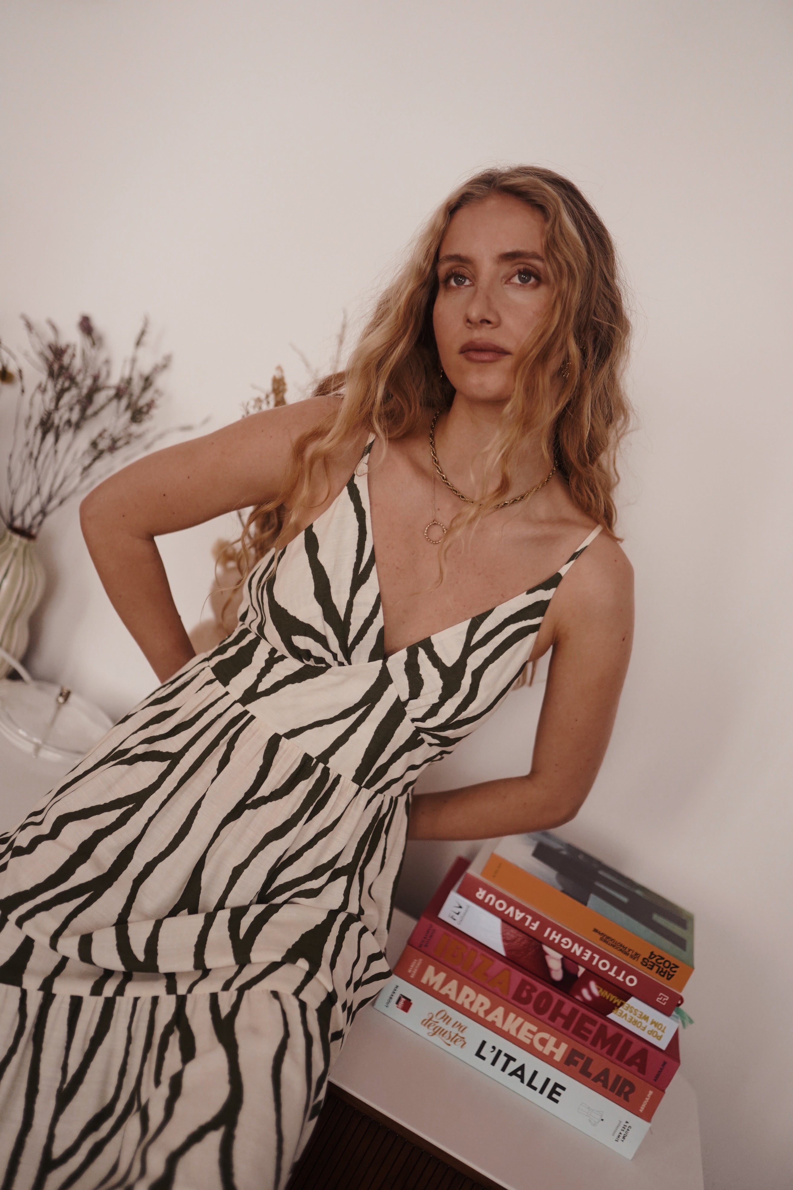 Décolleté fin à bretelles réglables, taille élastiquée dans le dos et 3 volants sur la jupe lui donne de l'ampleur.