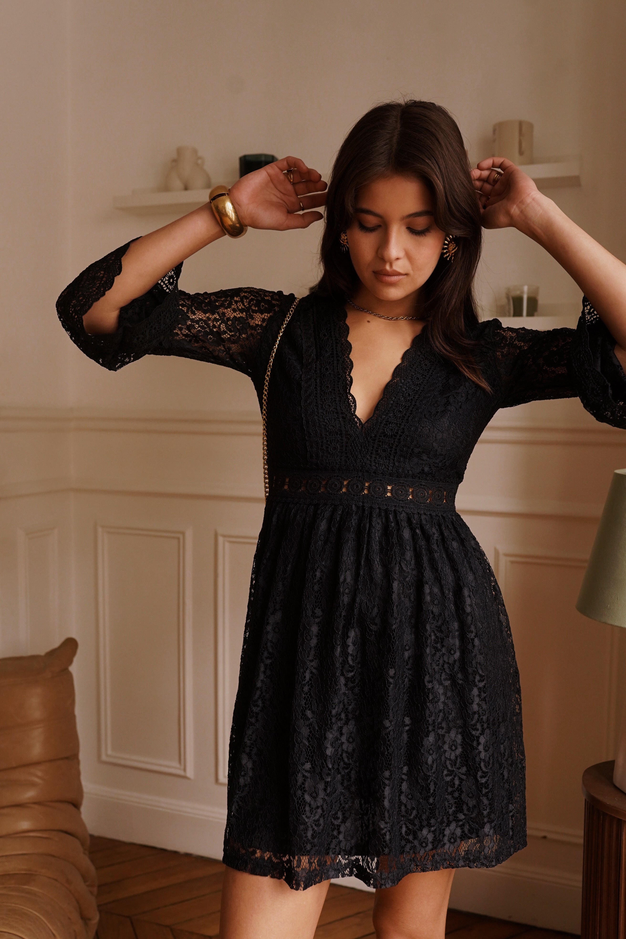 Dotée de manches longues en dentelle et d’une coupe courte, elle équilibre sensualité et élégance. Son tissu léger et travaillé assure un confort optimal tout en mettant en valeur chaque mouvement avec grâce.
