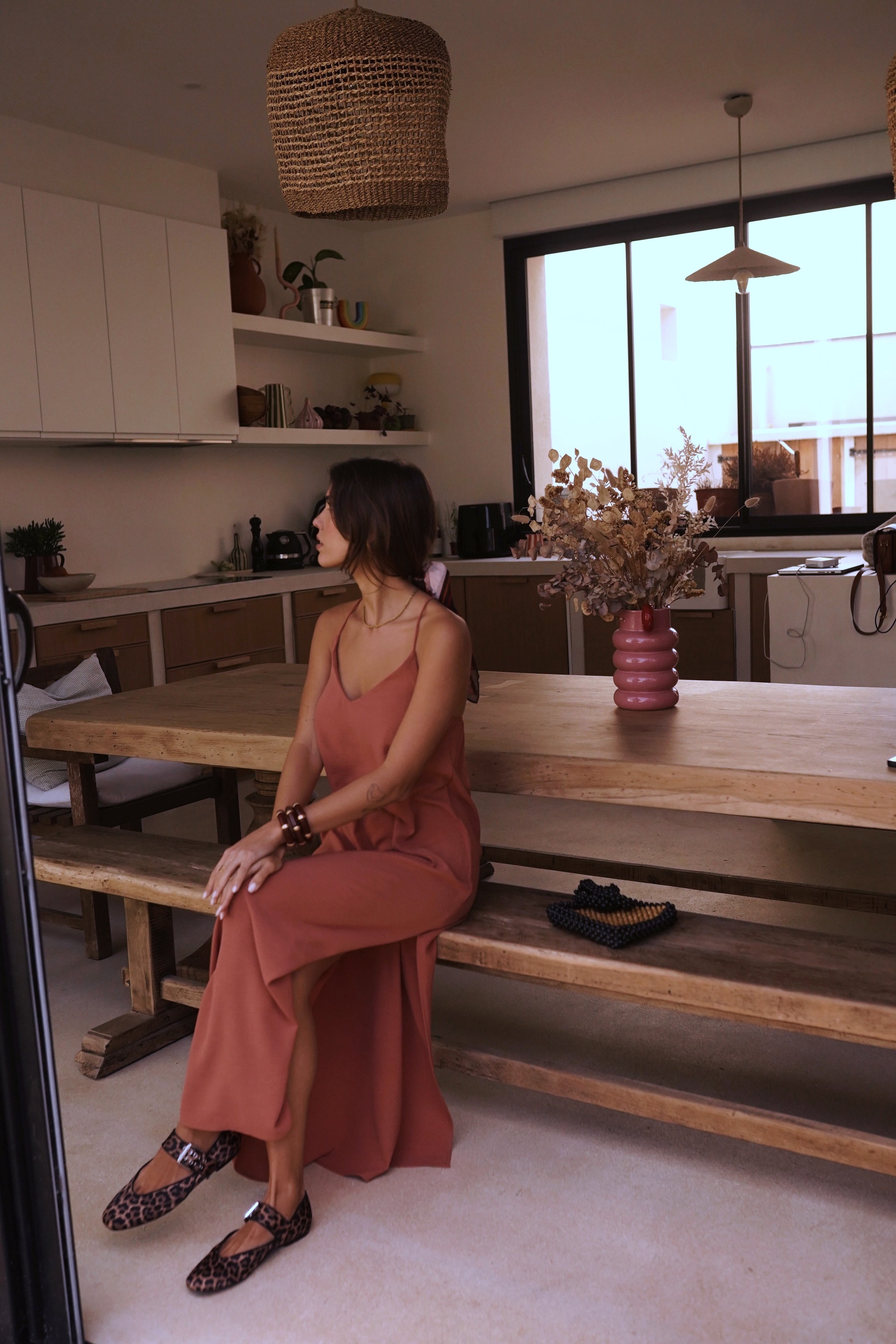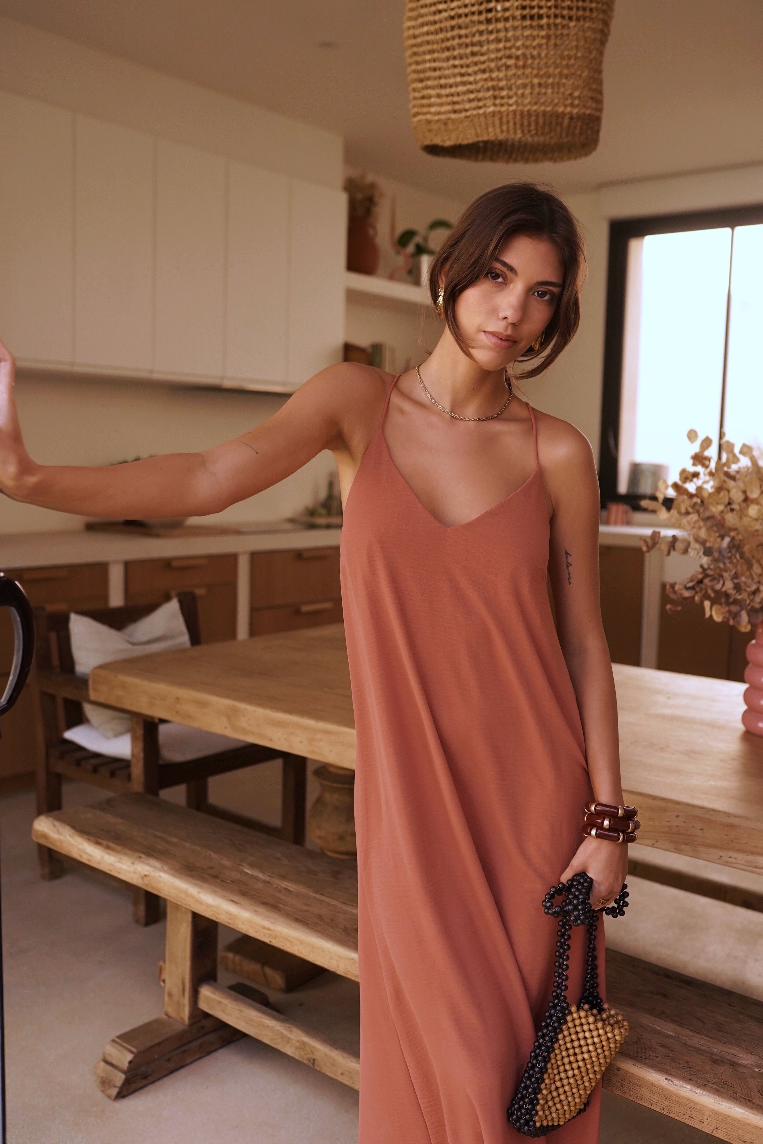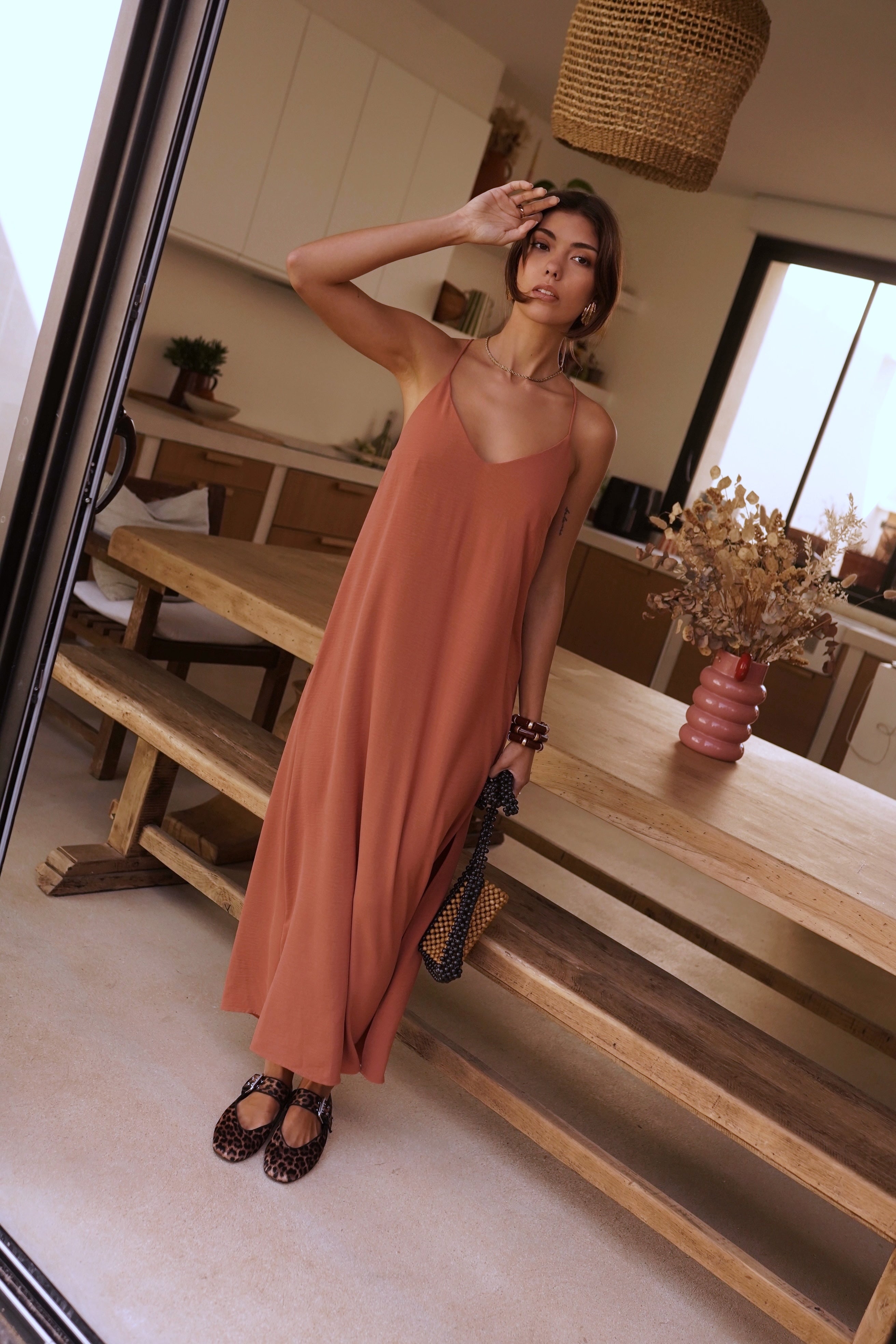 Minimaliste et sophistiquée, cette robe longue en teinte terracotta séduit par sa coupe fluide et légère. Son col en V et ses fines bretelles croisées dans le dos soulignent une silhouette élégante et aérienne. Fendue sur le côté, elle apporte une liberté de mouvement idéale pour un look décontracté et raffiné. Idéale pour les journées d’été ou les soirées en bord de mer.