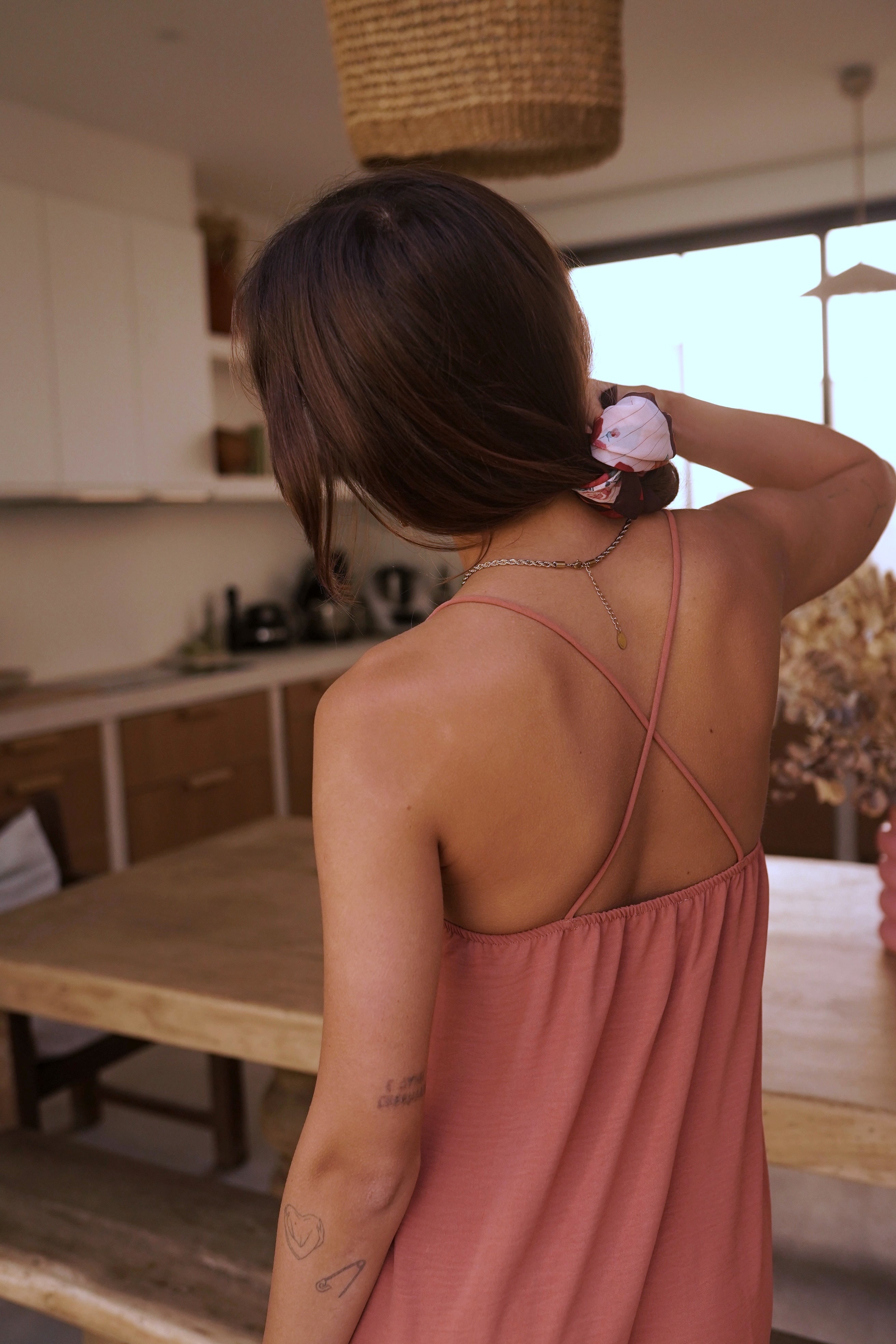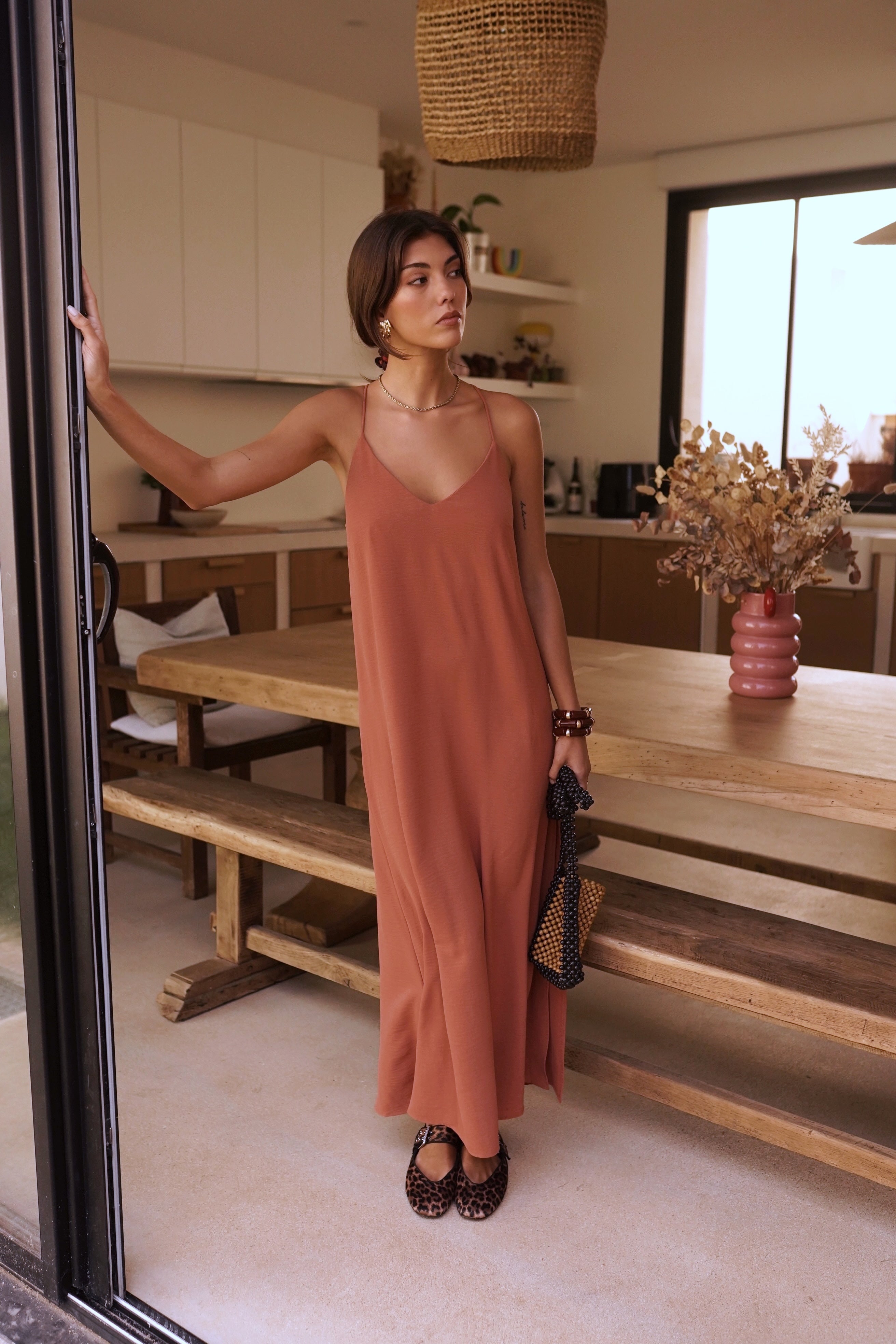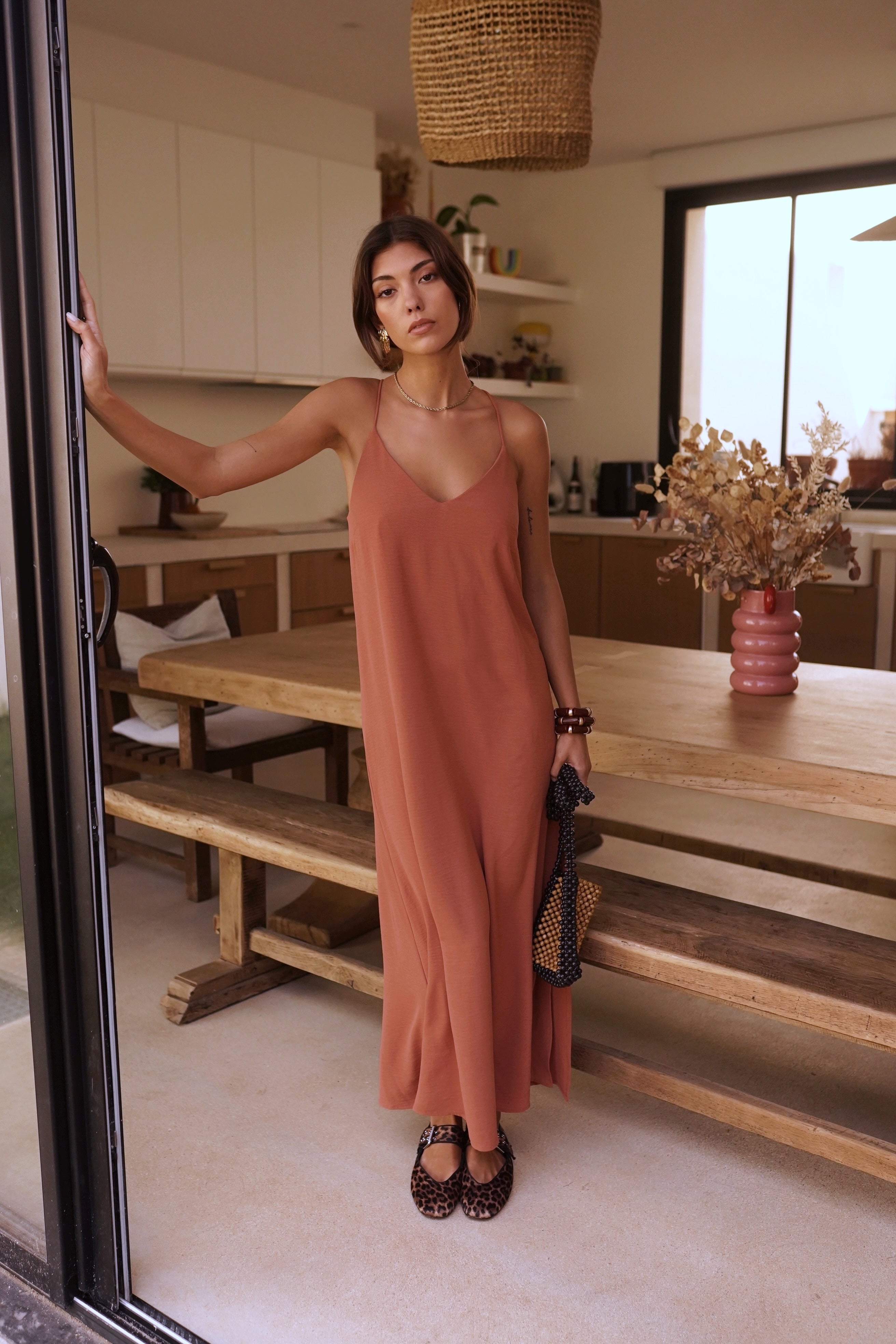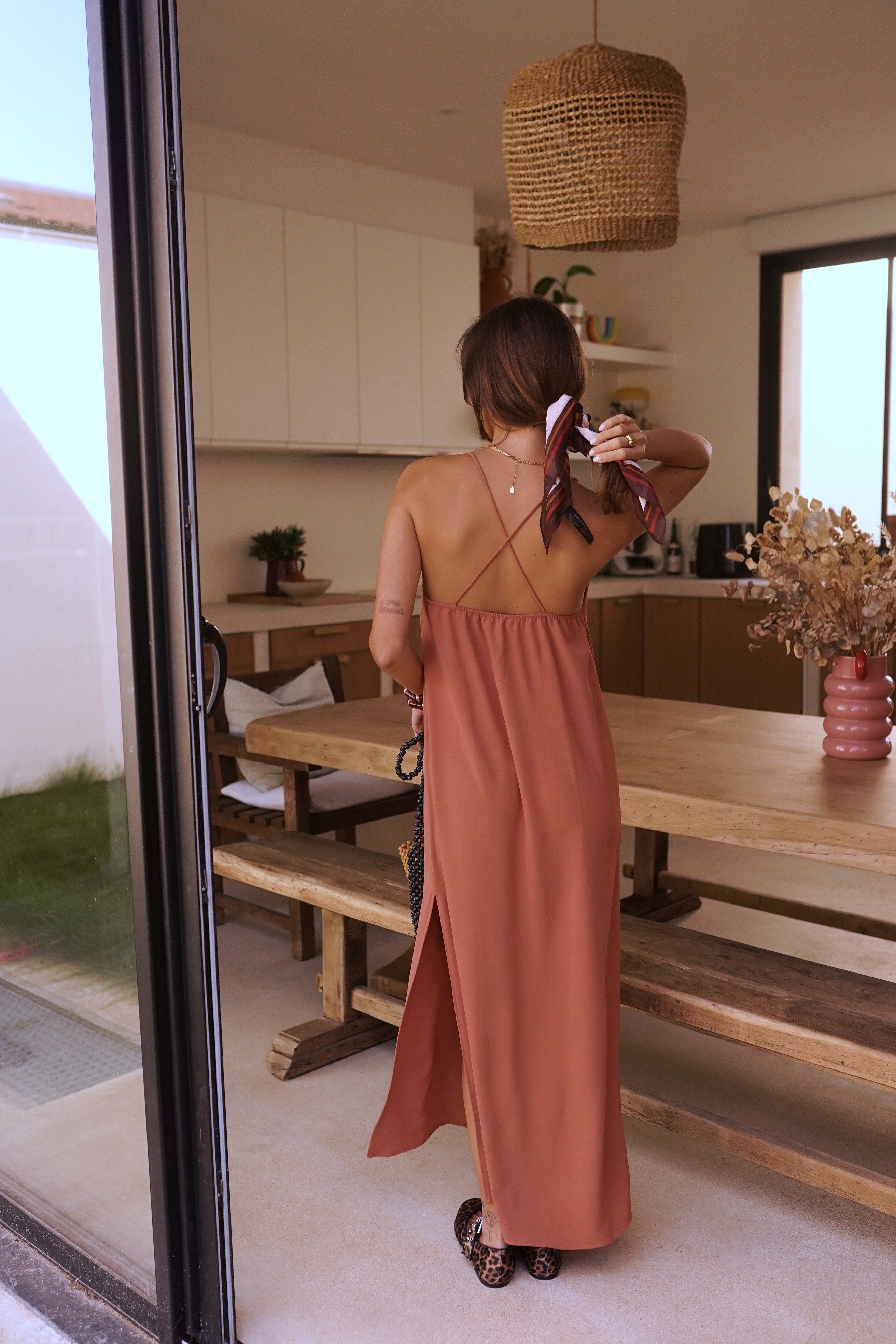 Minimaliste et sophistiquée, cette robe longue en teinte terracotta séduit par sa coupe fluide et légère. Son col en V et ses fines bretelles croisées dans le dos soulignent une silhouette élégante et aérienne. Fendue sur le côté, elle apporte une liberté de mouvement idéale pour un look décontracté et raffiné. Idéale pour les journées d’été ou les soirées en bord de mer.