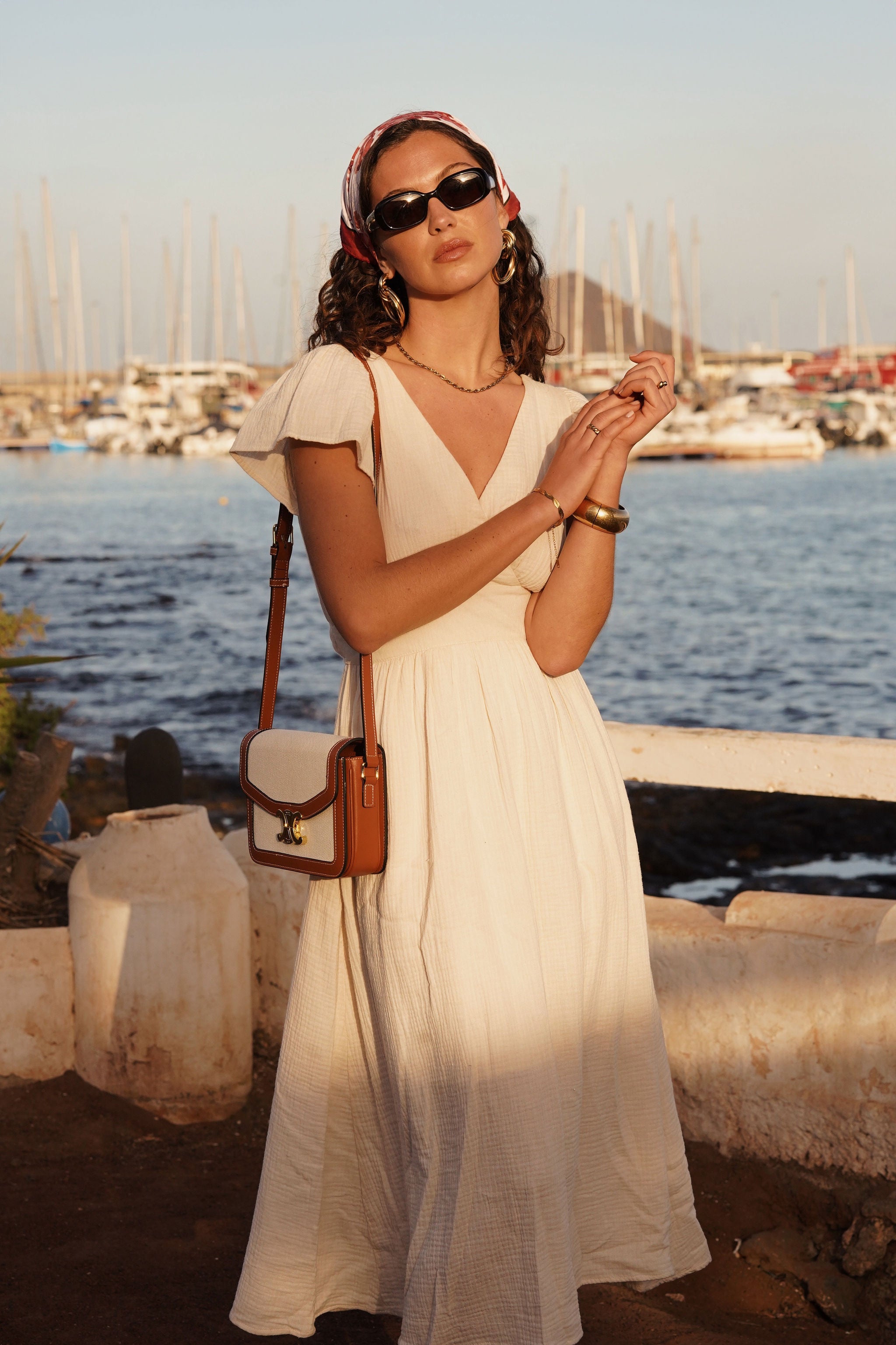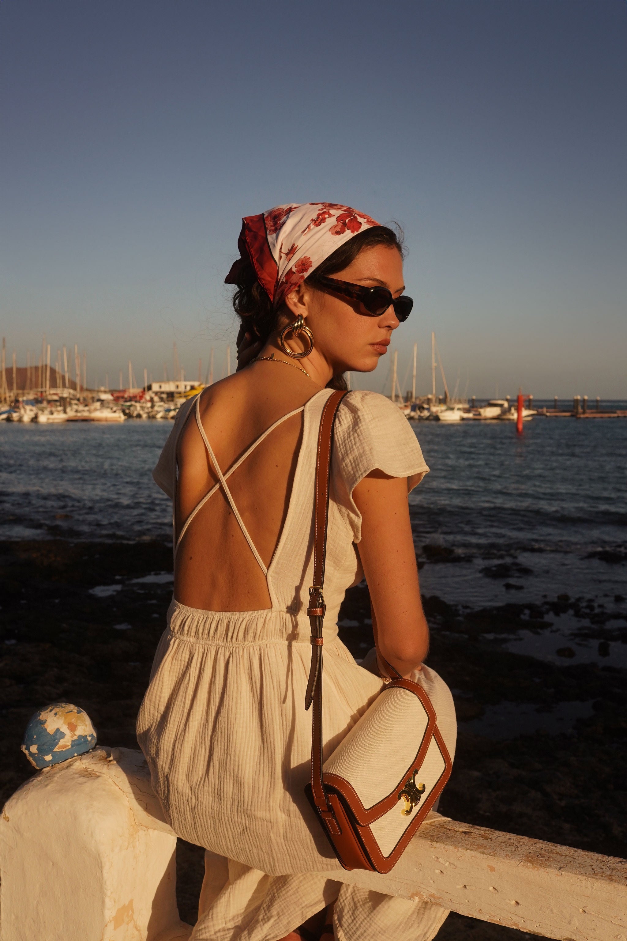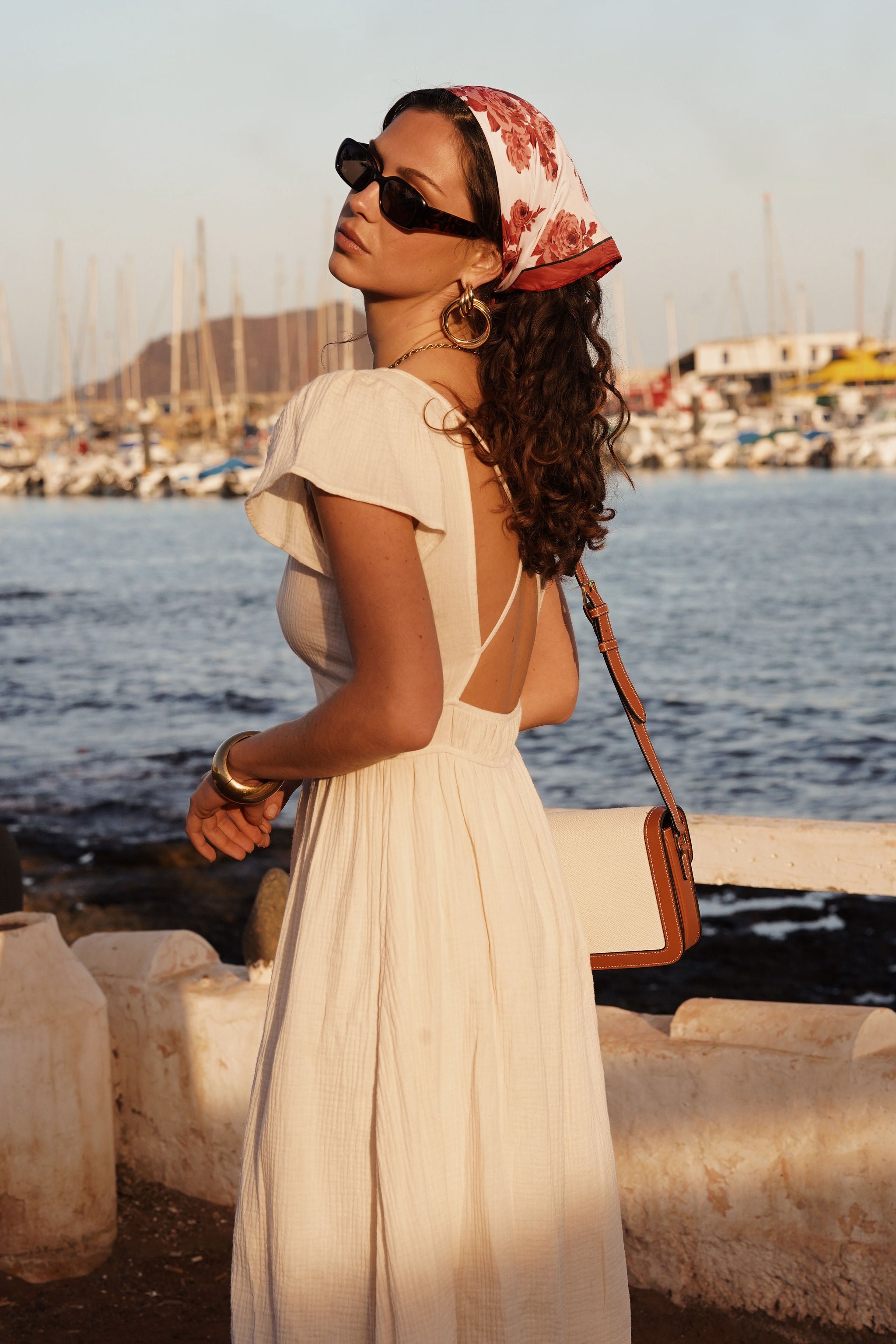 Dos nu avec bretelles croisées, taille smockée, bas évasé et manches volantées papillon.