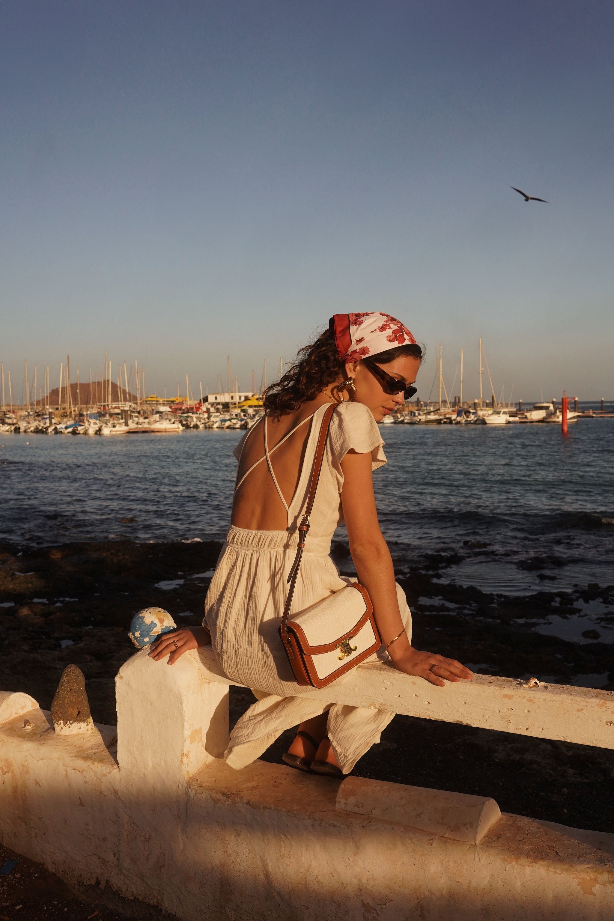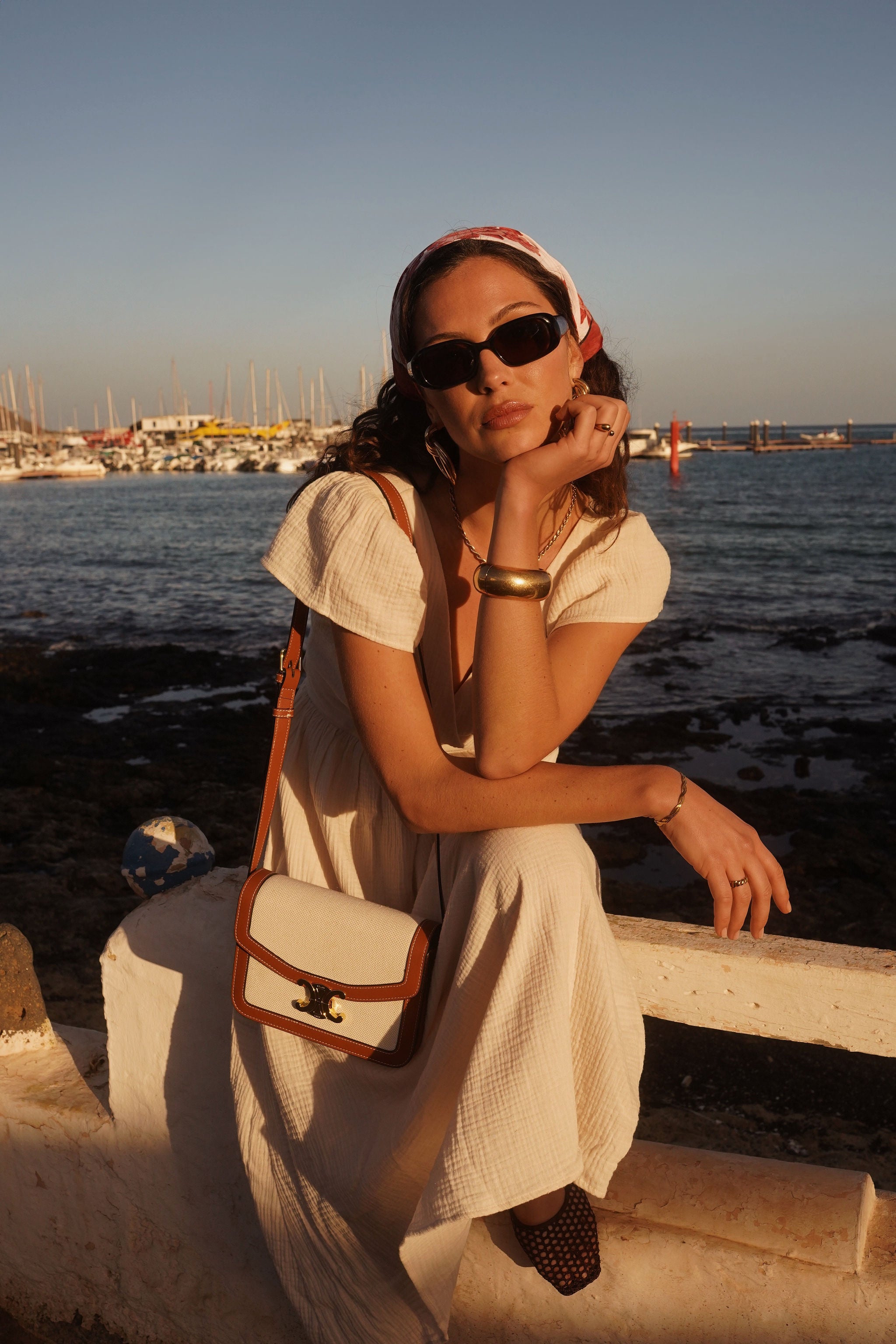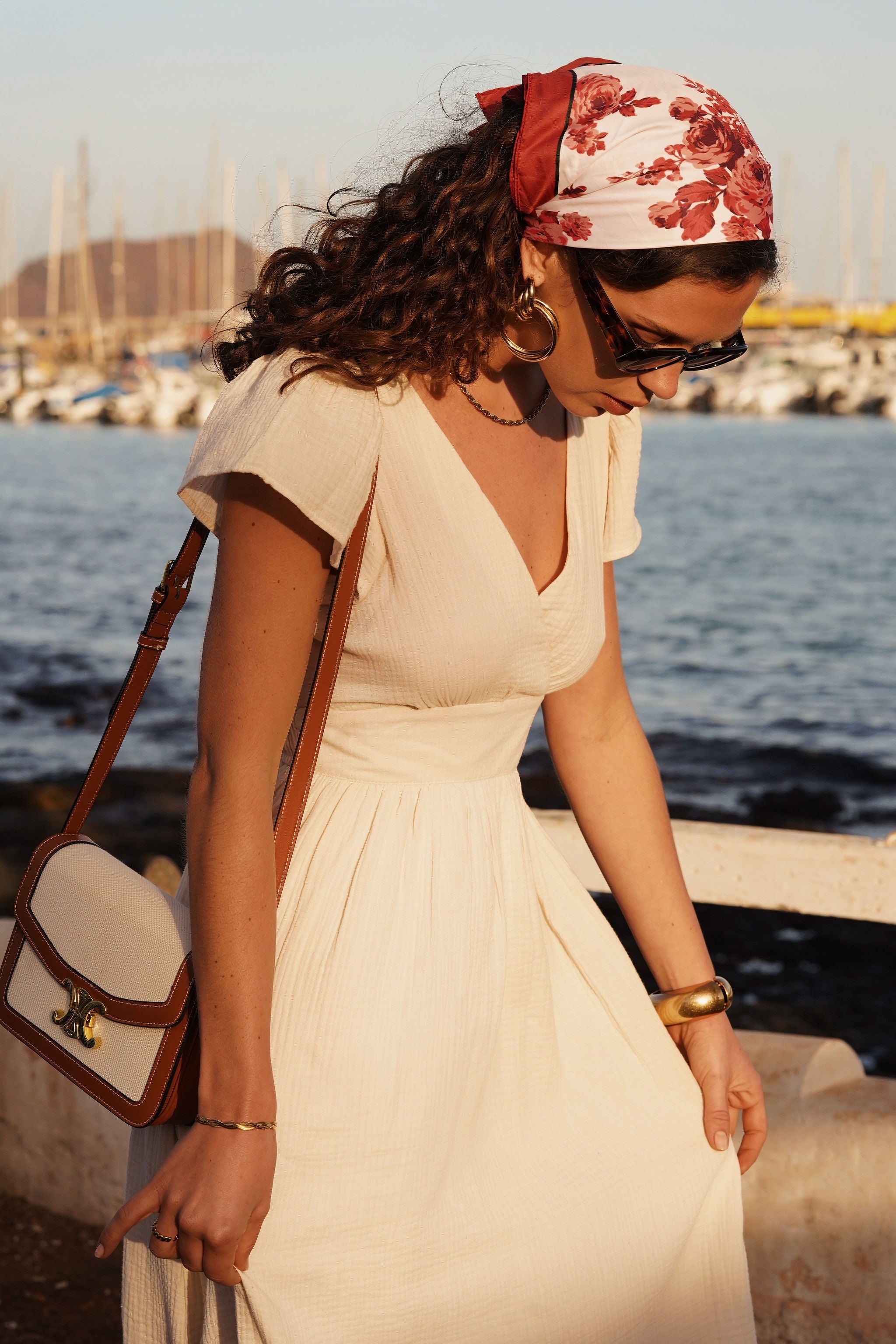 Dos nu avec bretelles croisées, taille smockée, bas évasé et manches volantées papillon.