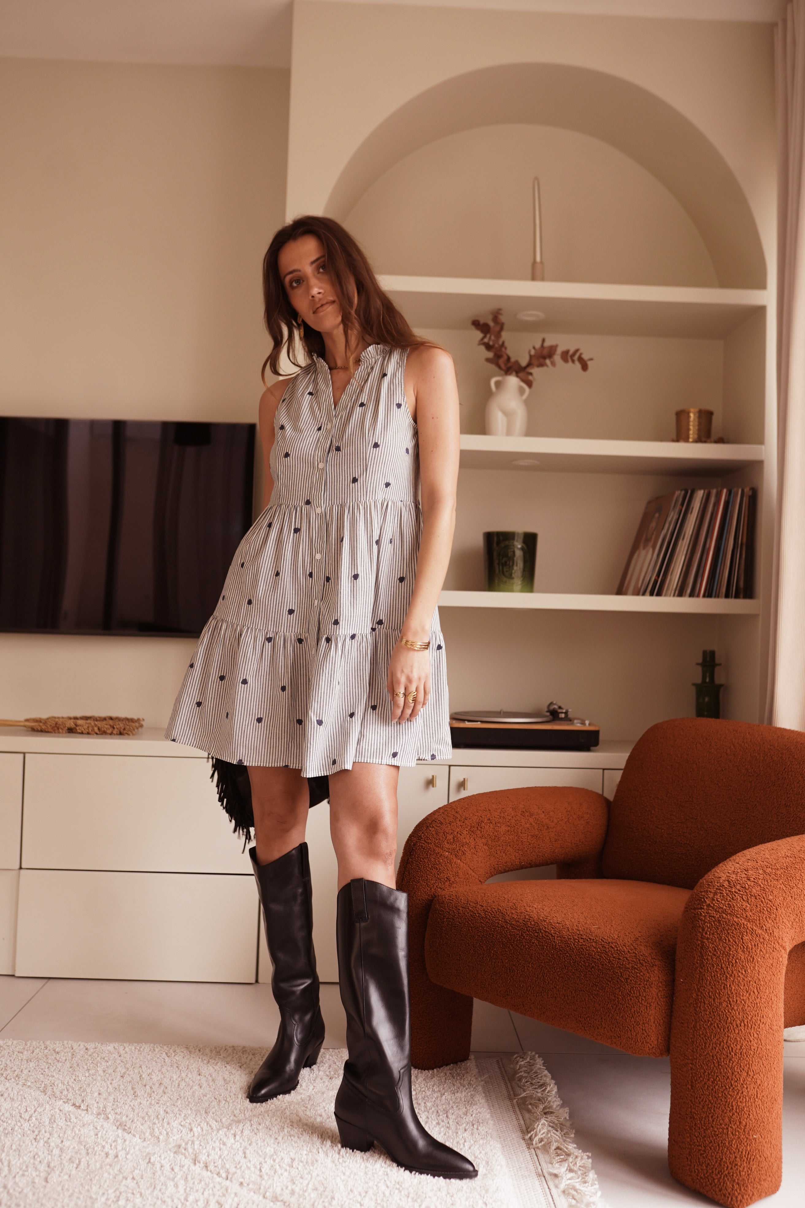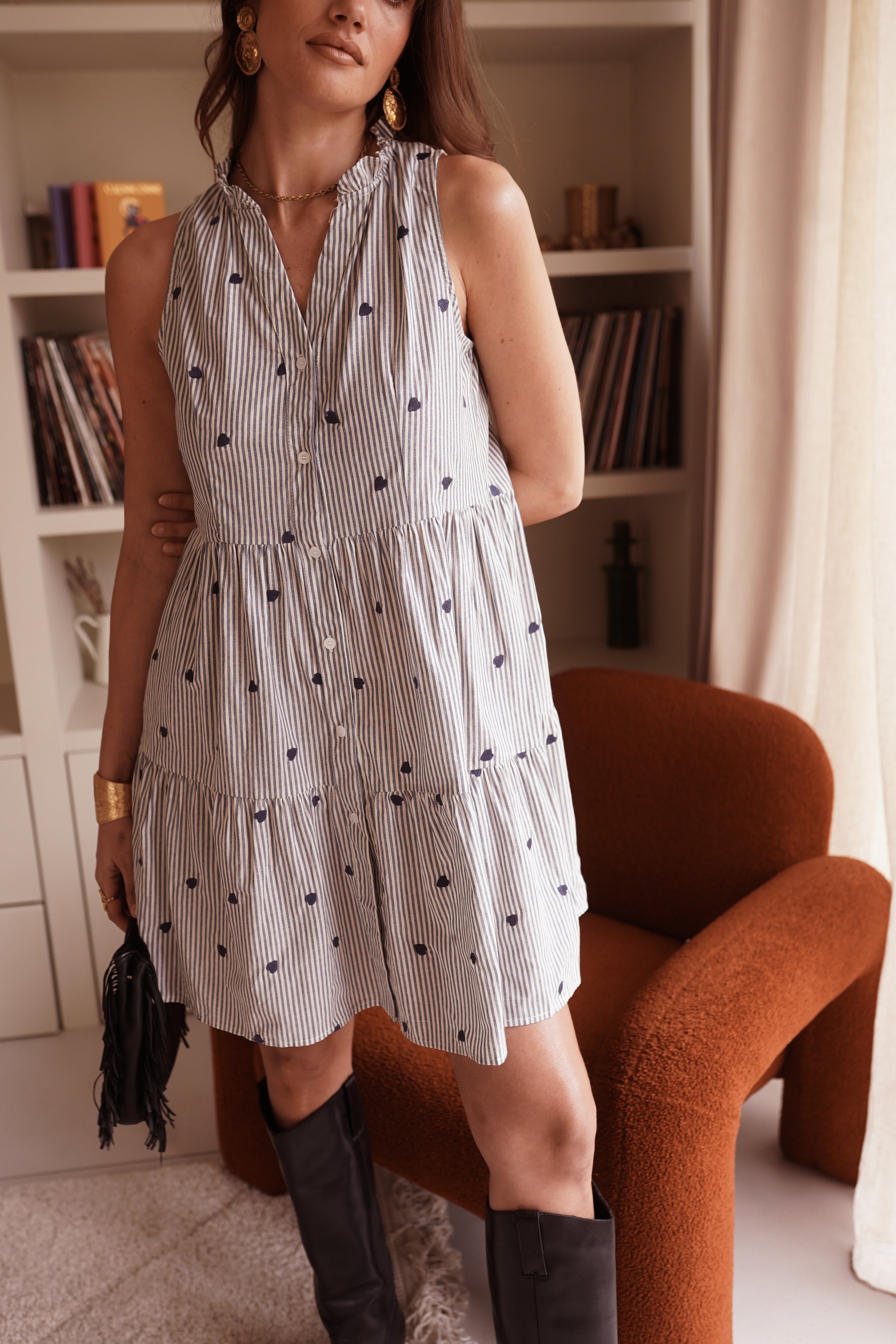 - Coupe courte et évasée, sans manches et col délicatement ouvert