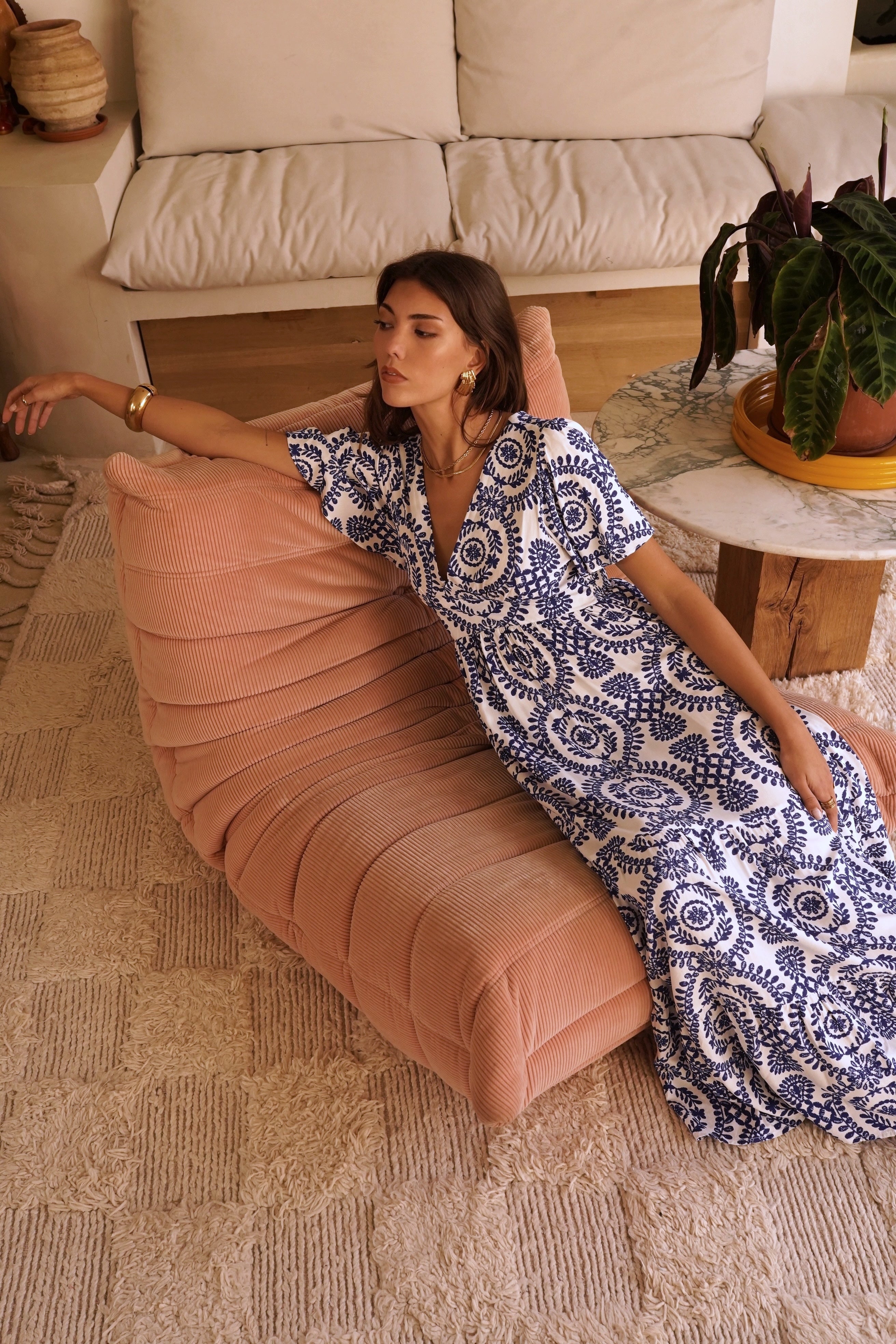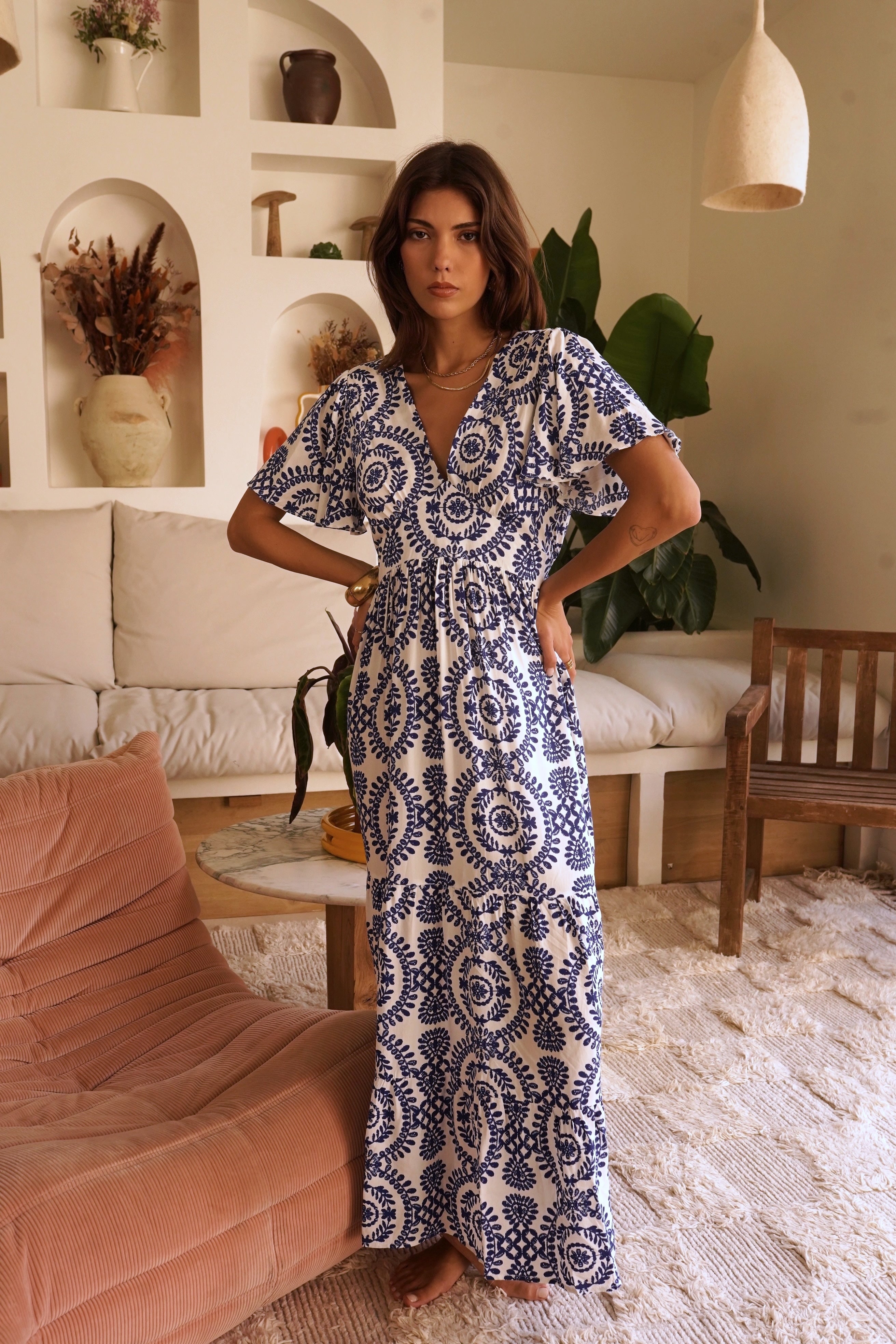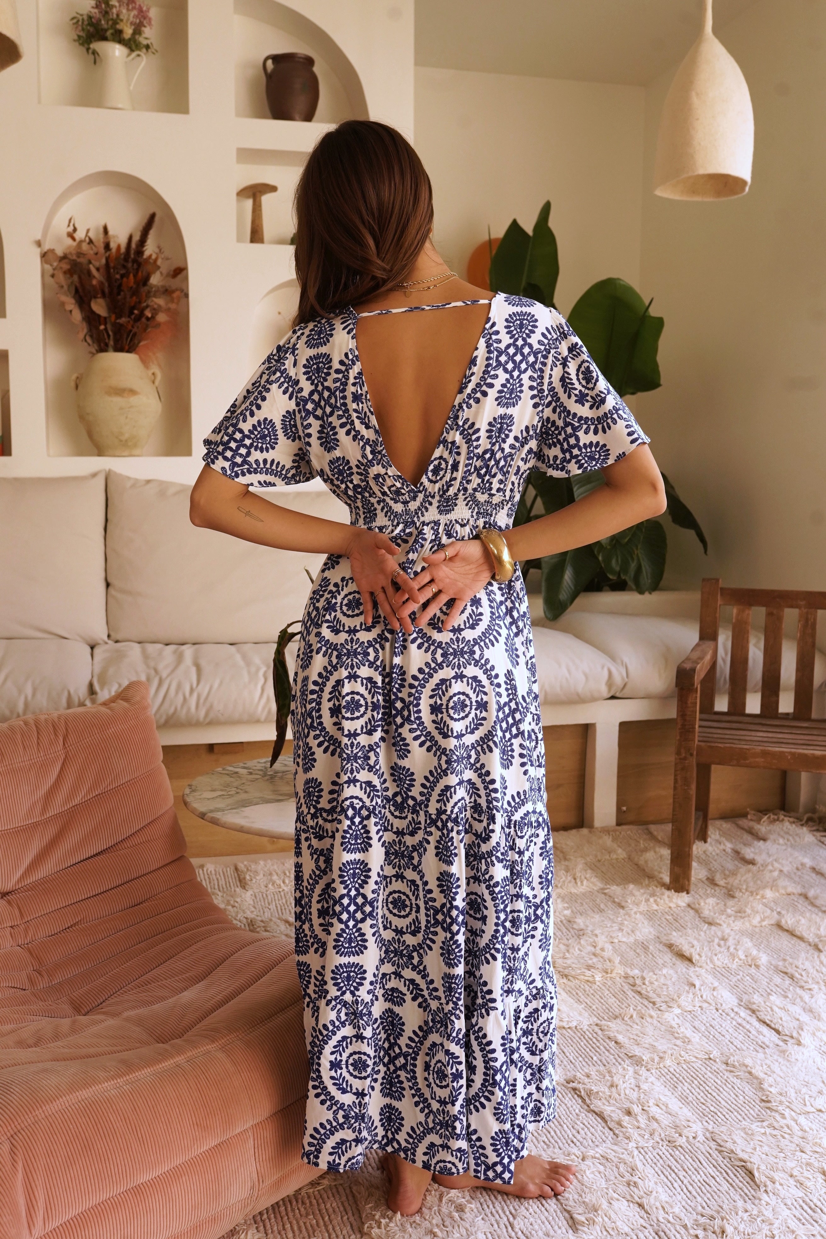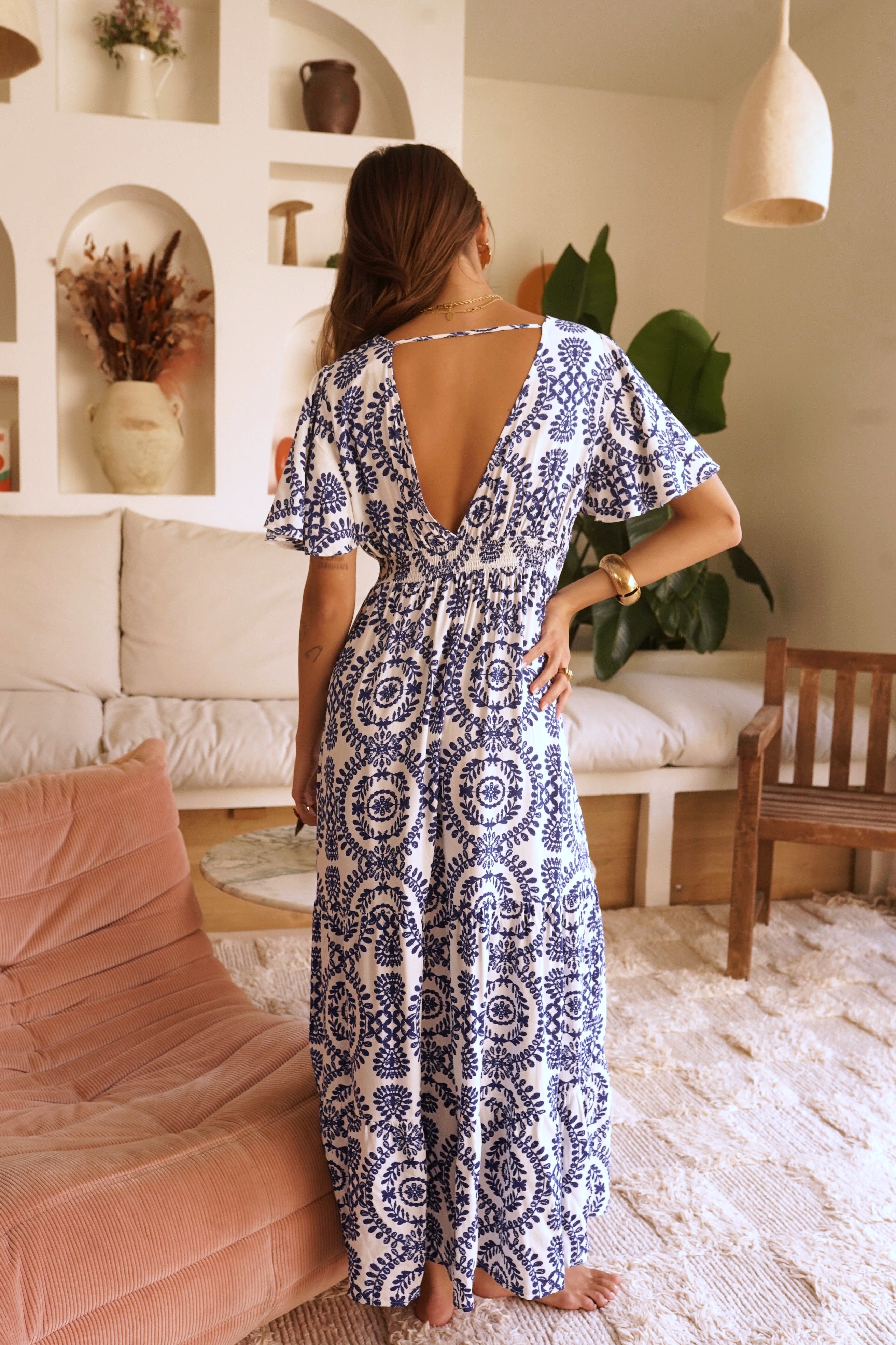 Cette robe longue et fluide arbore un élégant motif bleu sur fond blanc. Avec son décolleté en V, ses manches courtes et son dos joliment ouvert, elle offre une allure bohème et sophistiquée. Parfaite pour une journée ensoleillée ou une soirée estivale.
