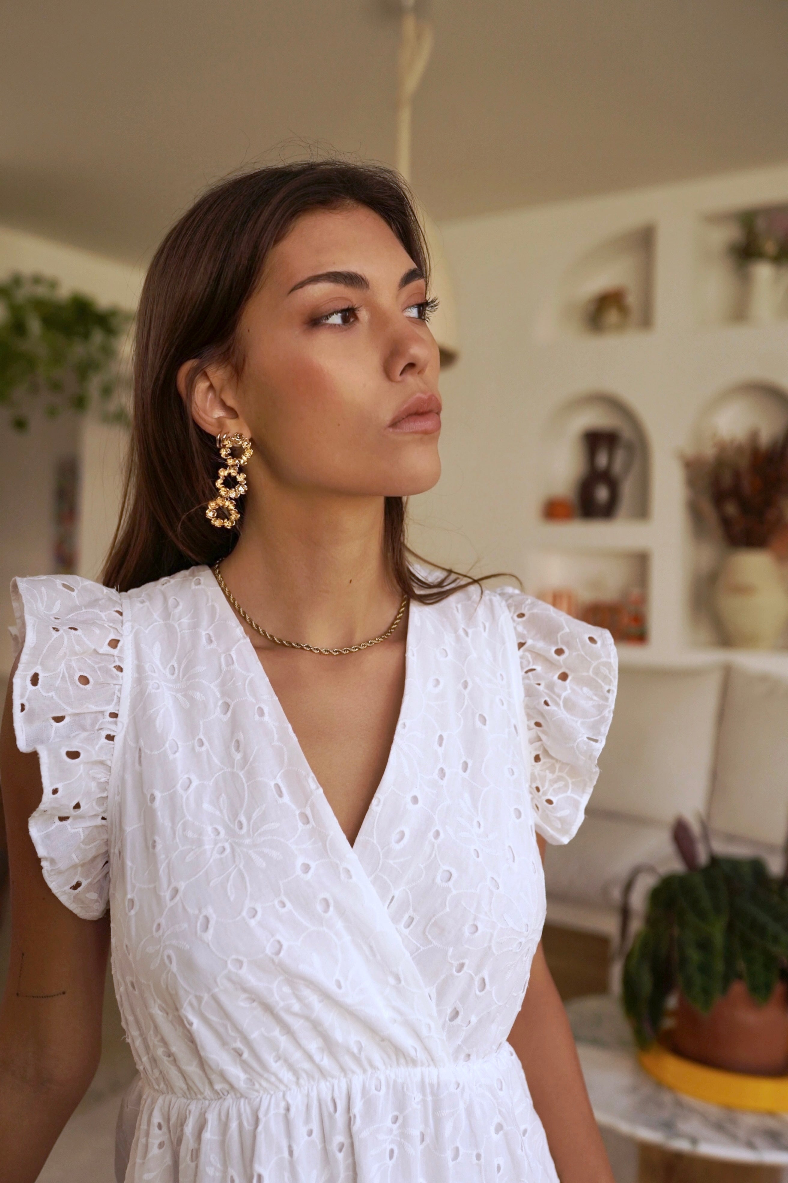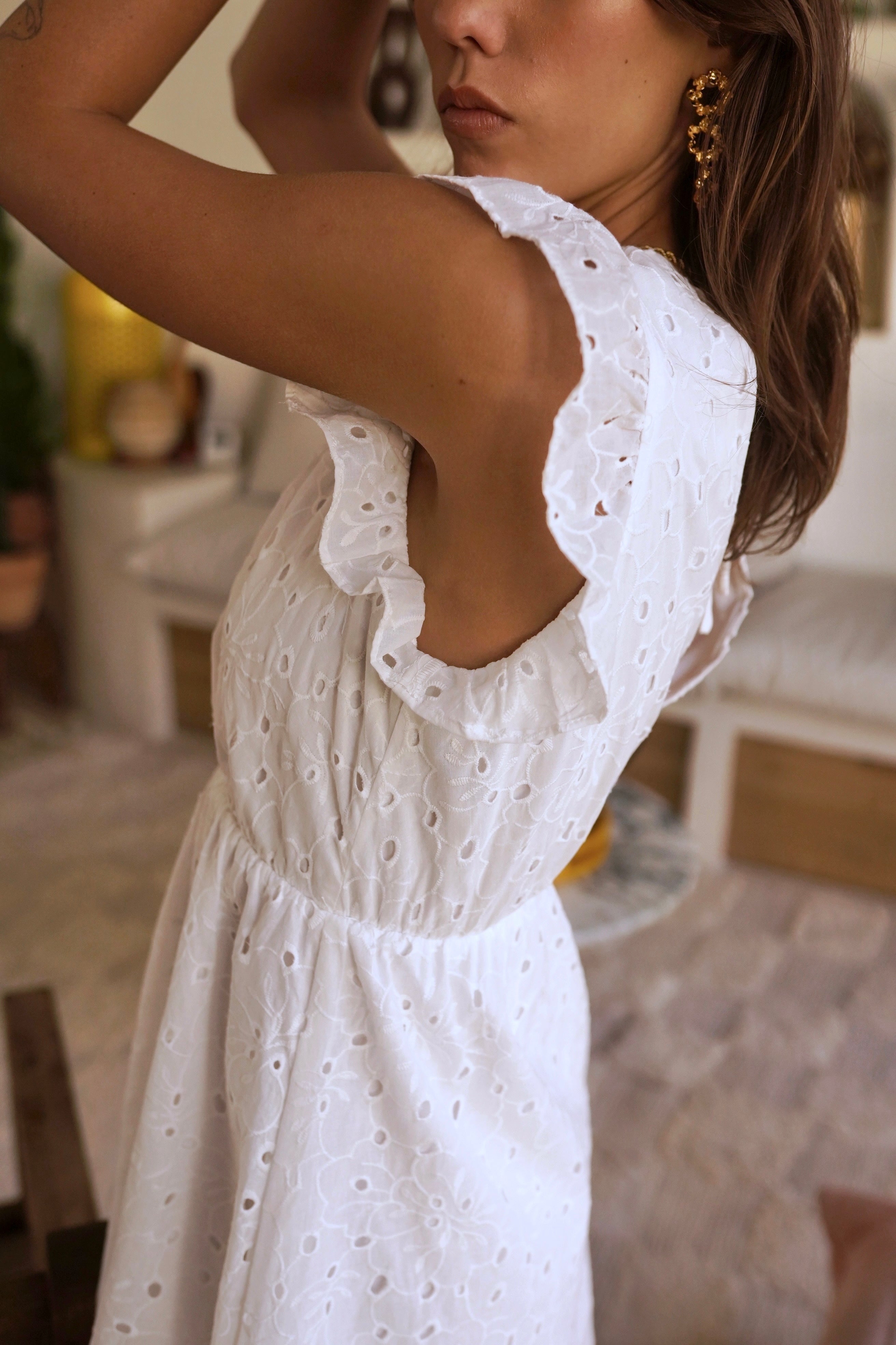 Robe blanche en broderie anglaise, élégante et aérienne. Coupe portefeuille avec décolleté en V et manches volantées. Taille marquée pour une silhouette féminine. Dos ouvert avec lien à nouer, ajoutant une touche raffinée. Idéale pour une allure bohème et estivale.