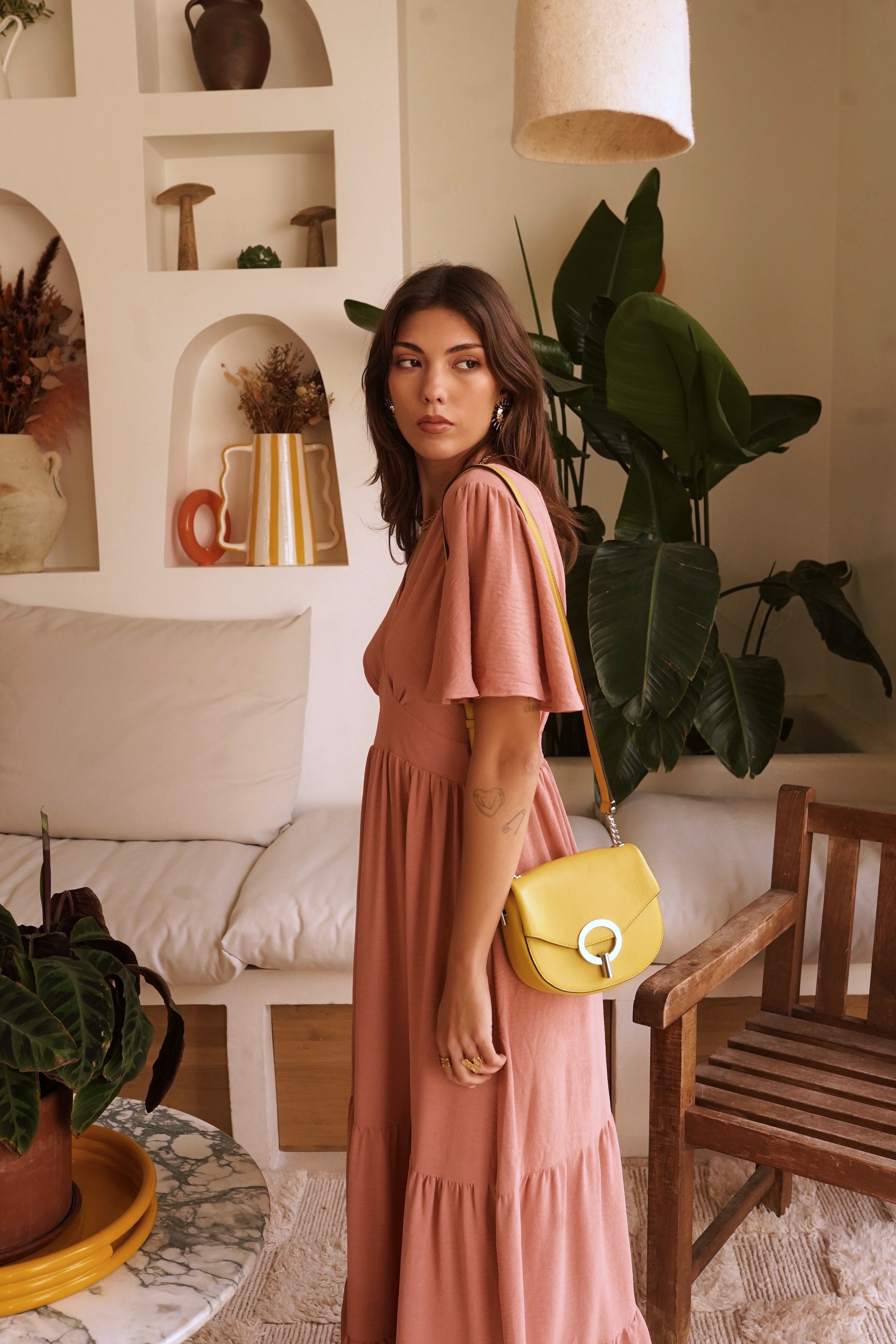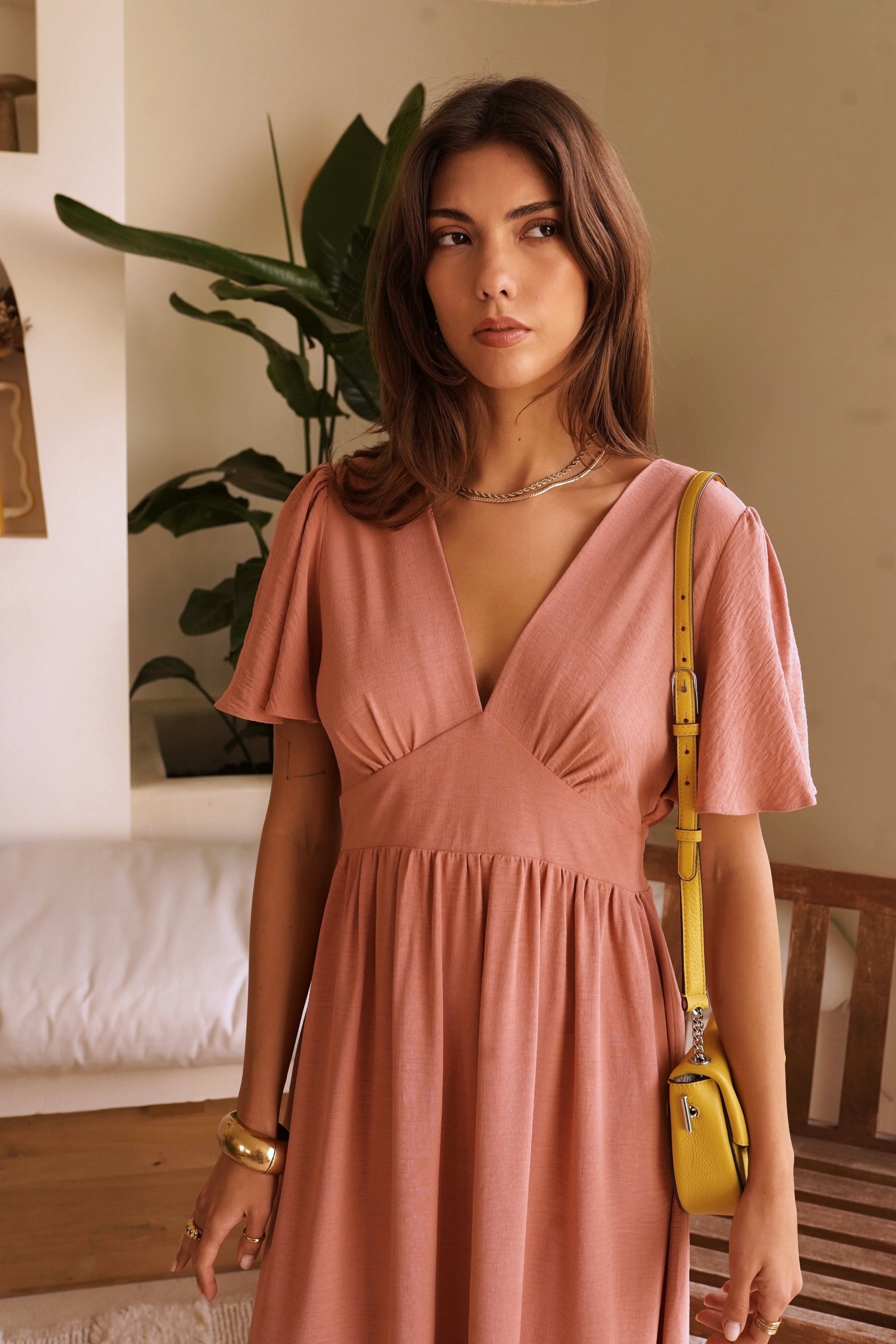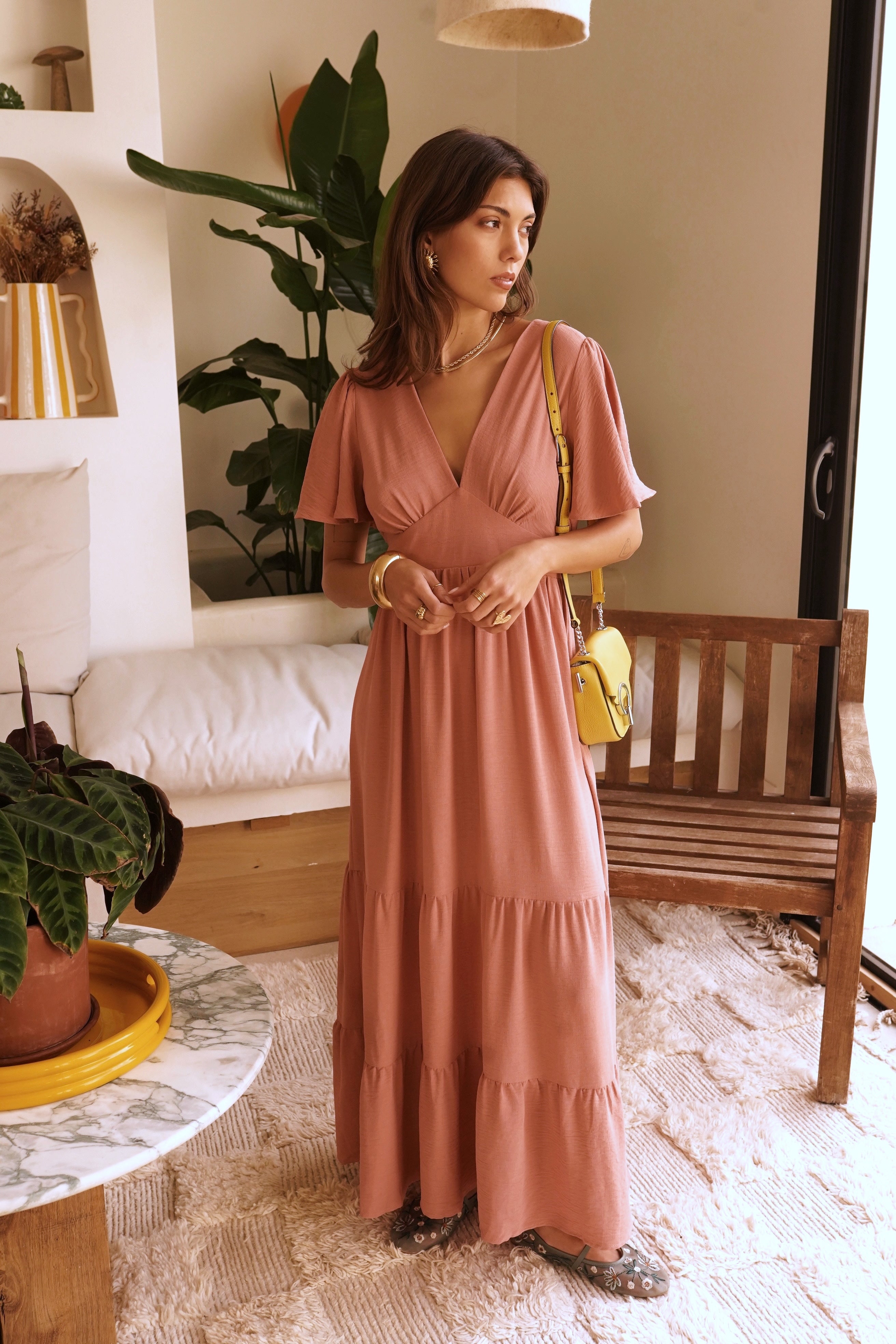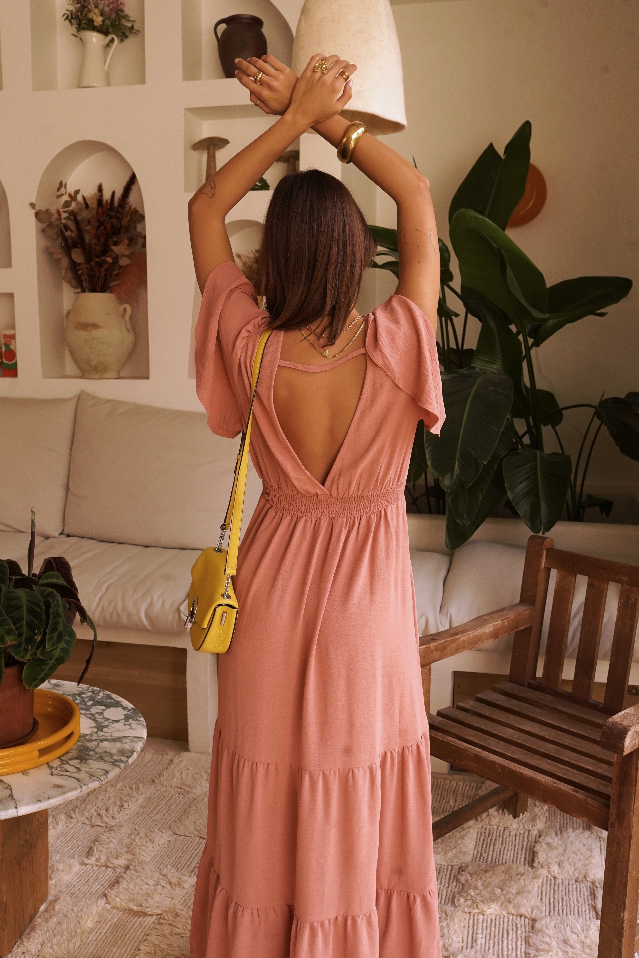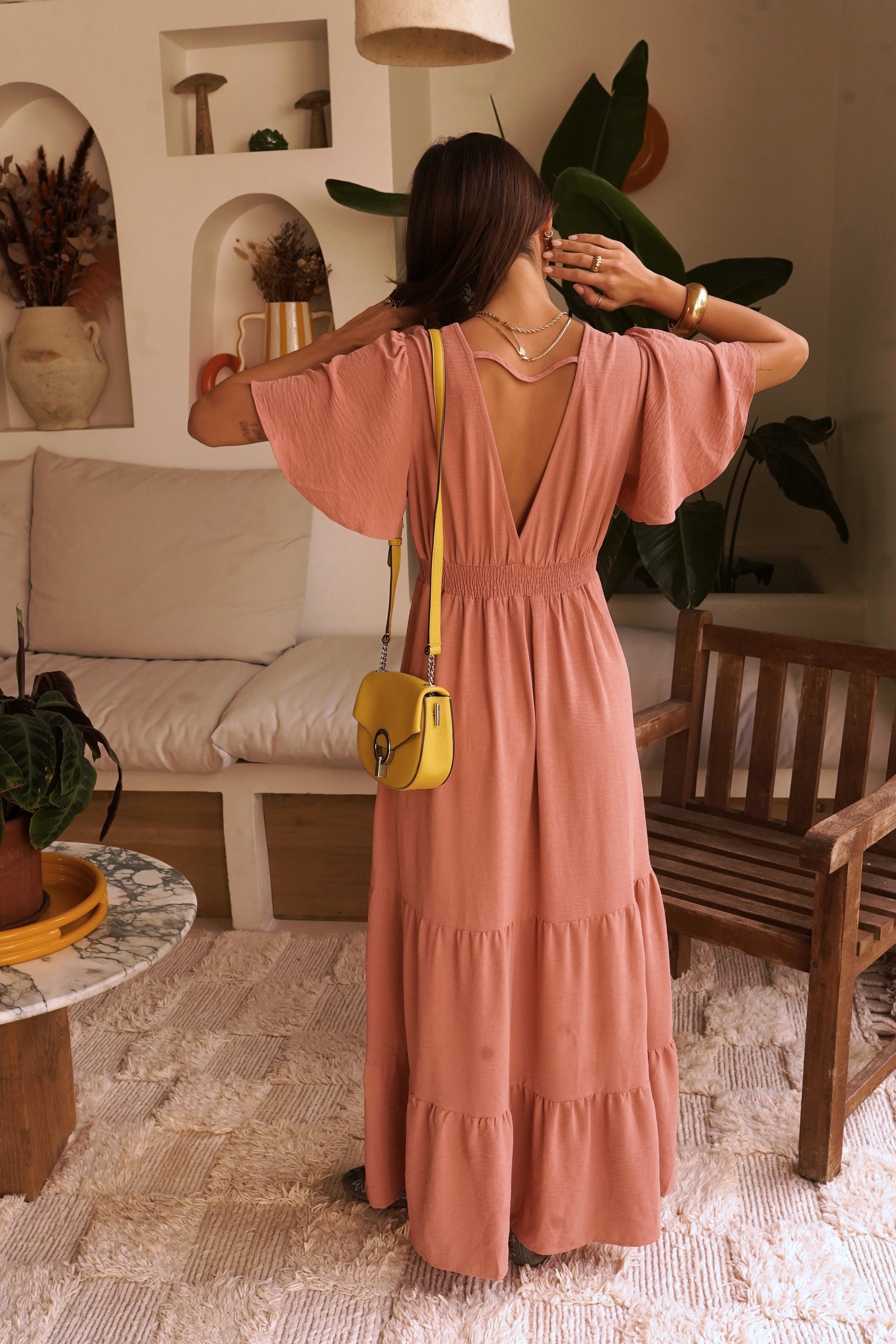 Cette robe longue présente un décolleté en V plongeant et des manches courtes flottantes qui ajoutent une touche féminine. La taille est marquée par un élastique smocké, soulignant la silhouette avant de s'évaser en une jupe longue à volants. Le dos révèle une découpe en forme de cœur qui donne une touche d'originalité. La robe est idéale pour une occasion spéciale ou une journée d'été décontractée.