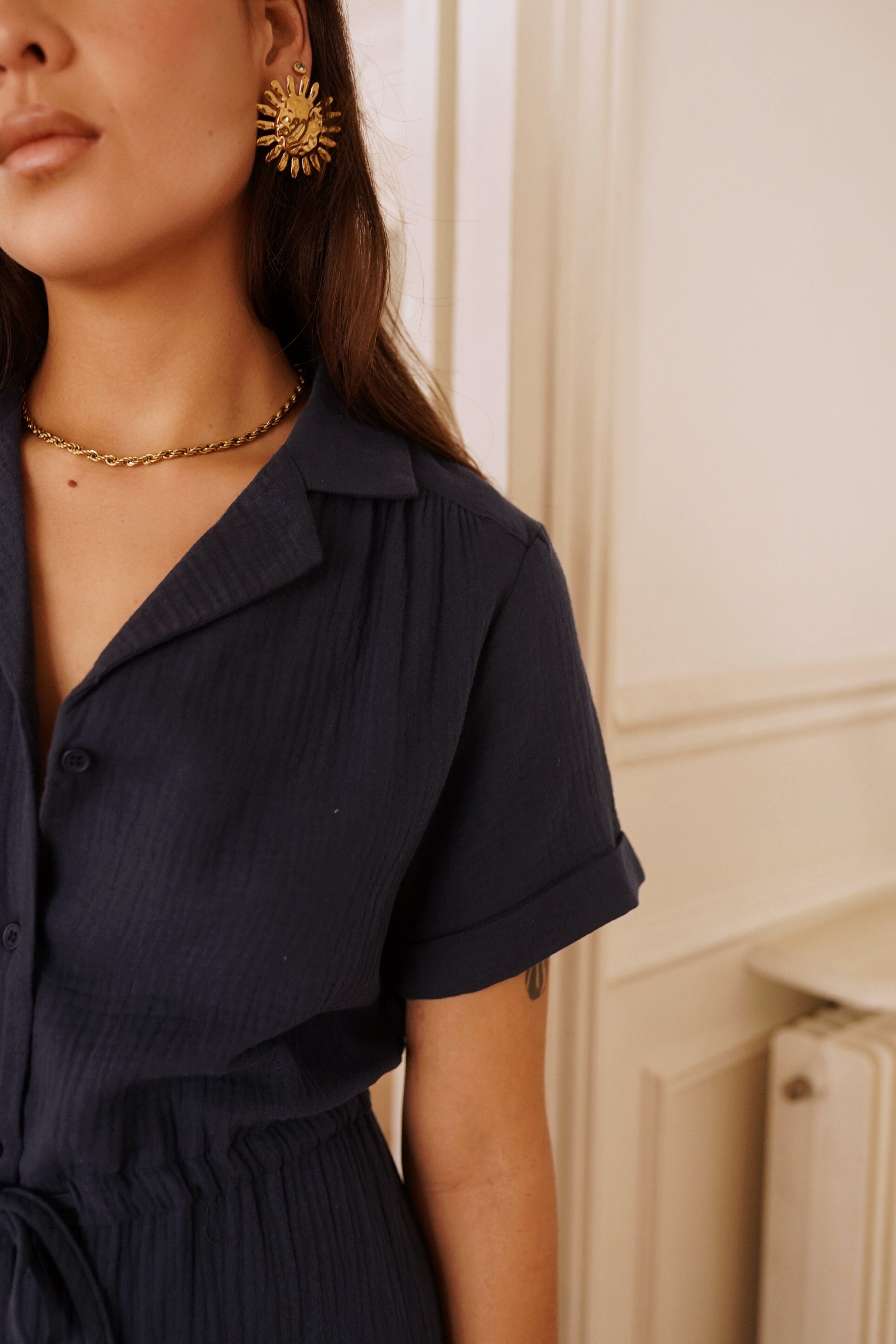 Adoptez un look chic et minimaliste avec cette robe chemise noire, une pièce essentielle du dressing. À la fois élégante et décontractée, elle s’adapte à toutes les occasions grâce à sa coupe fluide et structurée.
