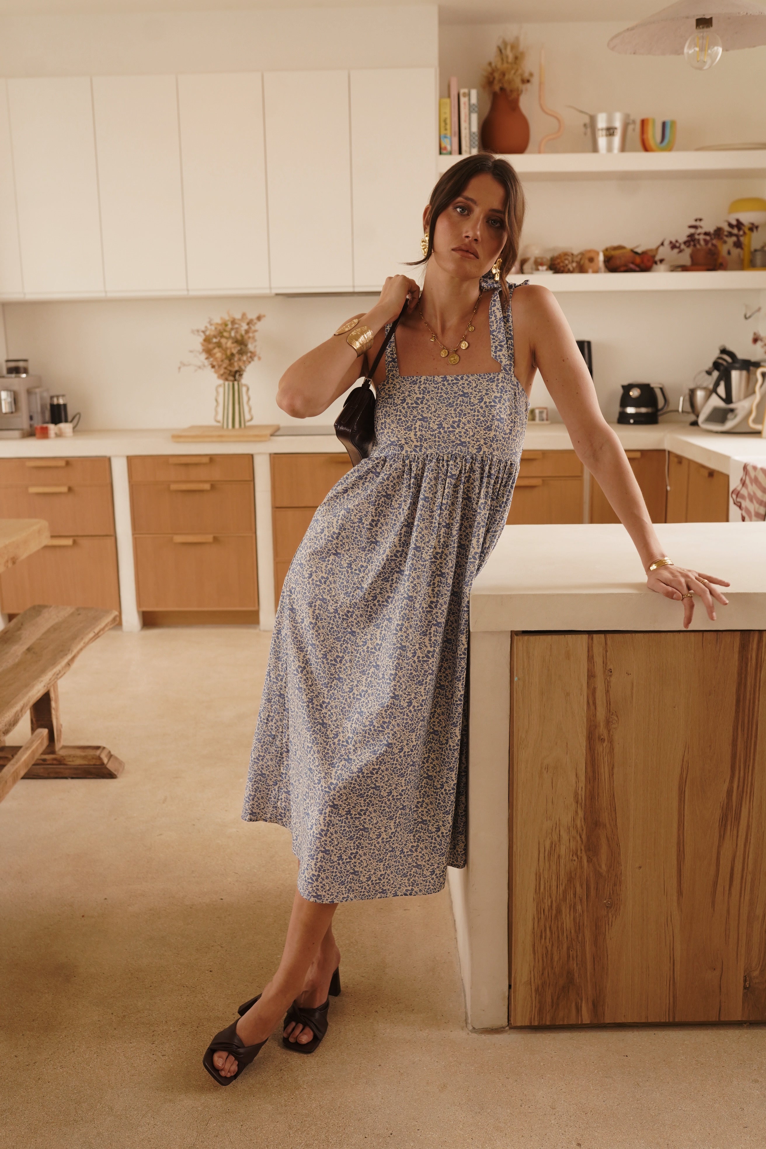 - Coupe midi et évasée, fines bretelles à nouer, buste smocké et jupe froncée