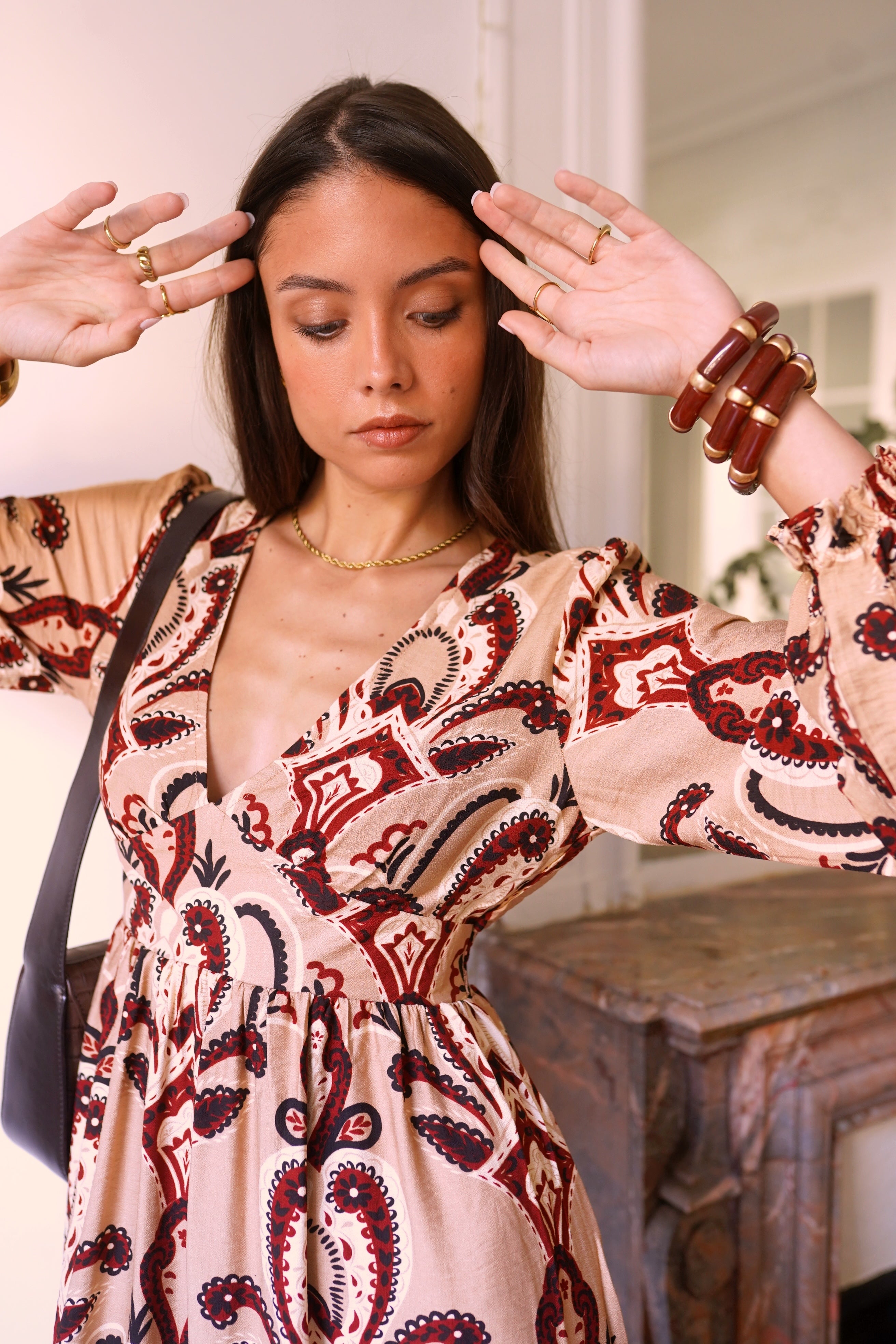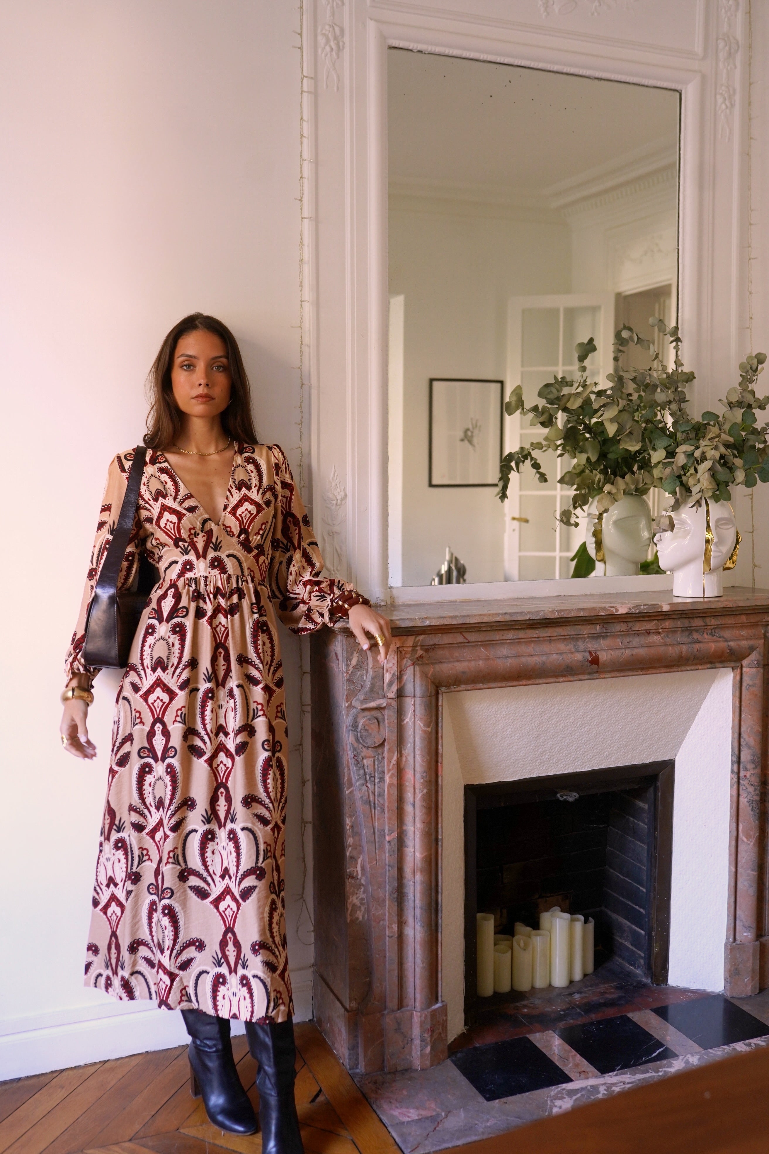 Avec son imprimé bordeaux et noir sur fond beige, la robe Sybile dévoile une allure bohème et raffinée. Son décolleté en V flatteur et sa taille froncée mettent en valeur la silhouette, tandis que ses manches longues légèrement bouffantes apportent du volume avec subtilité. Sa coupe fluide accompagne le mouvement et en fait une pièce facile à porter au quotidien comme en soirée.