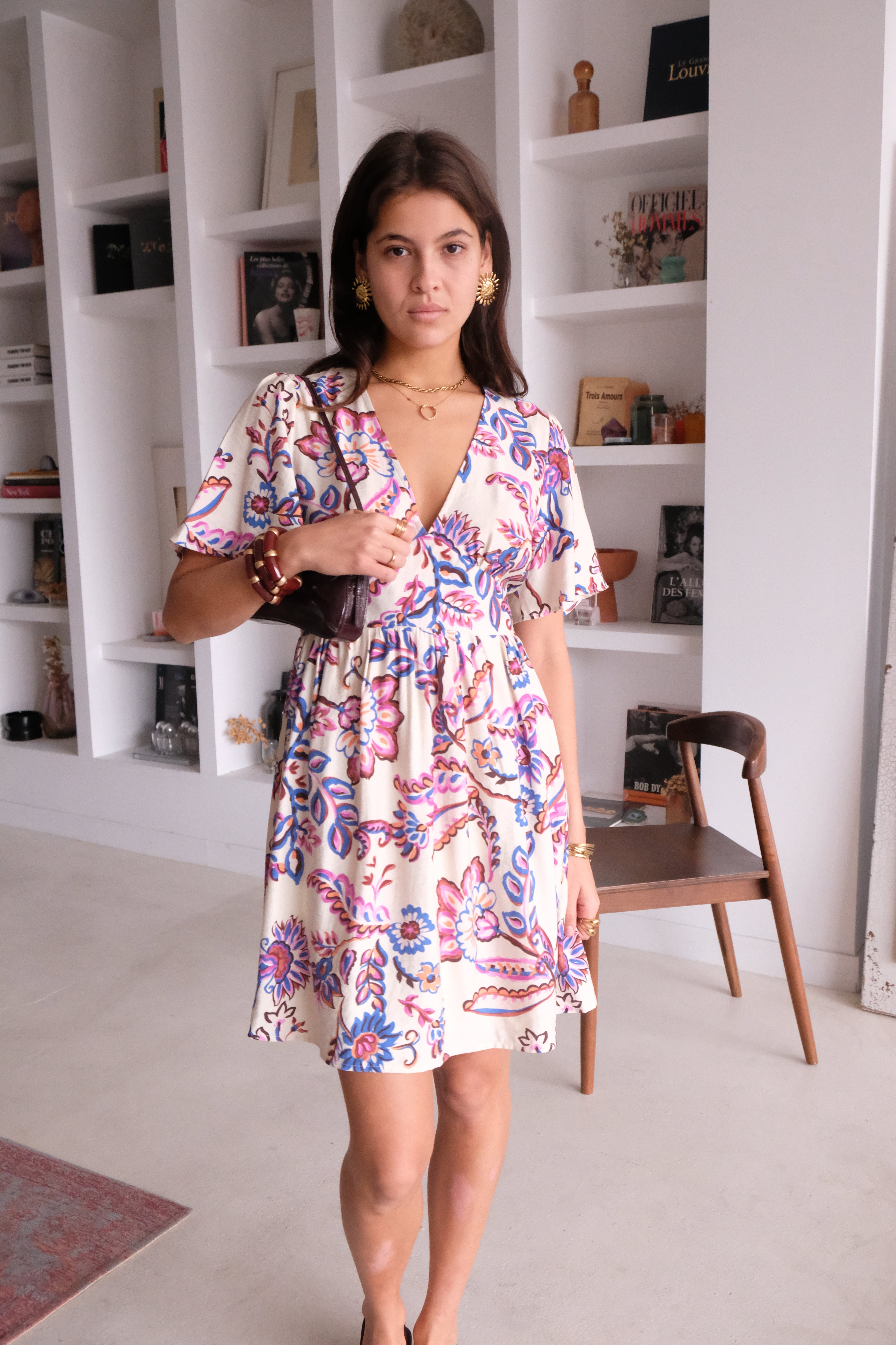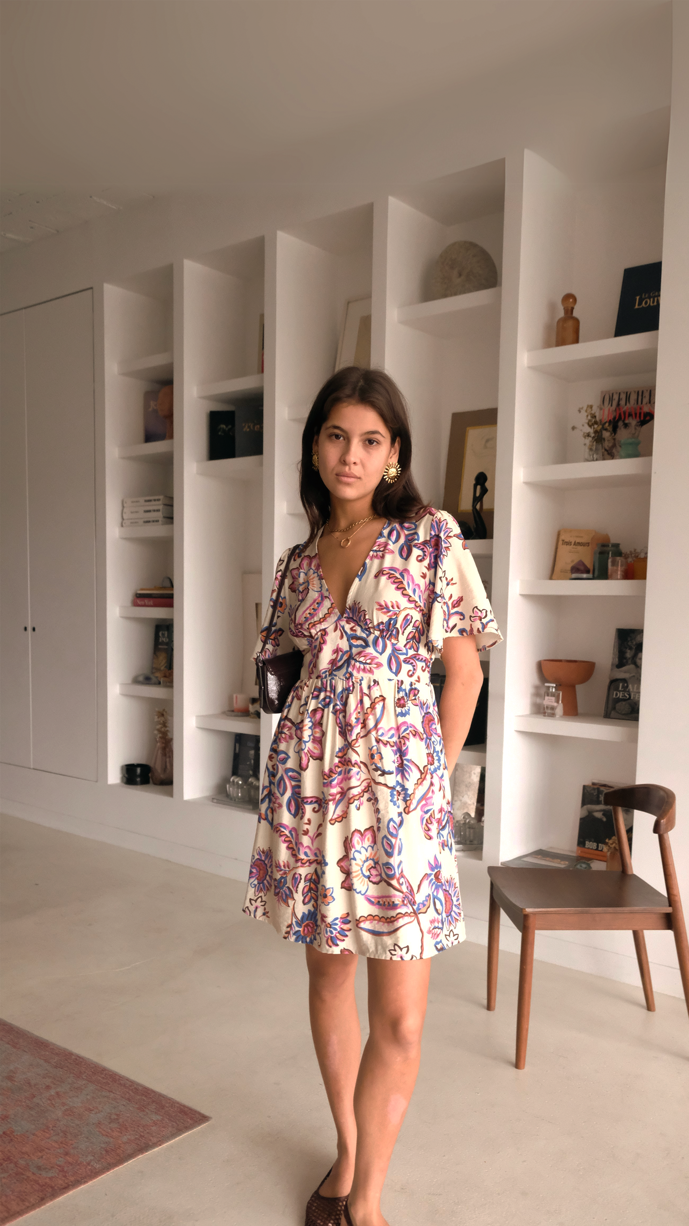 Taille élastiquée pour un maximum de confort, bas évasé et manches volantées papillon.
