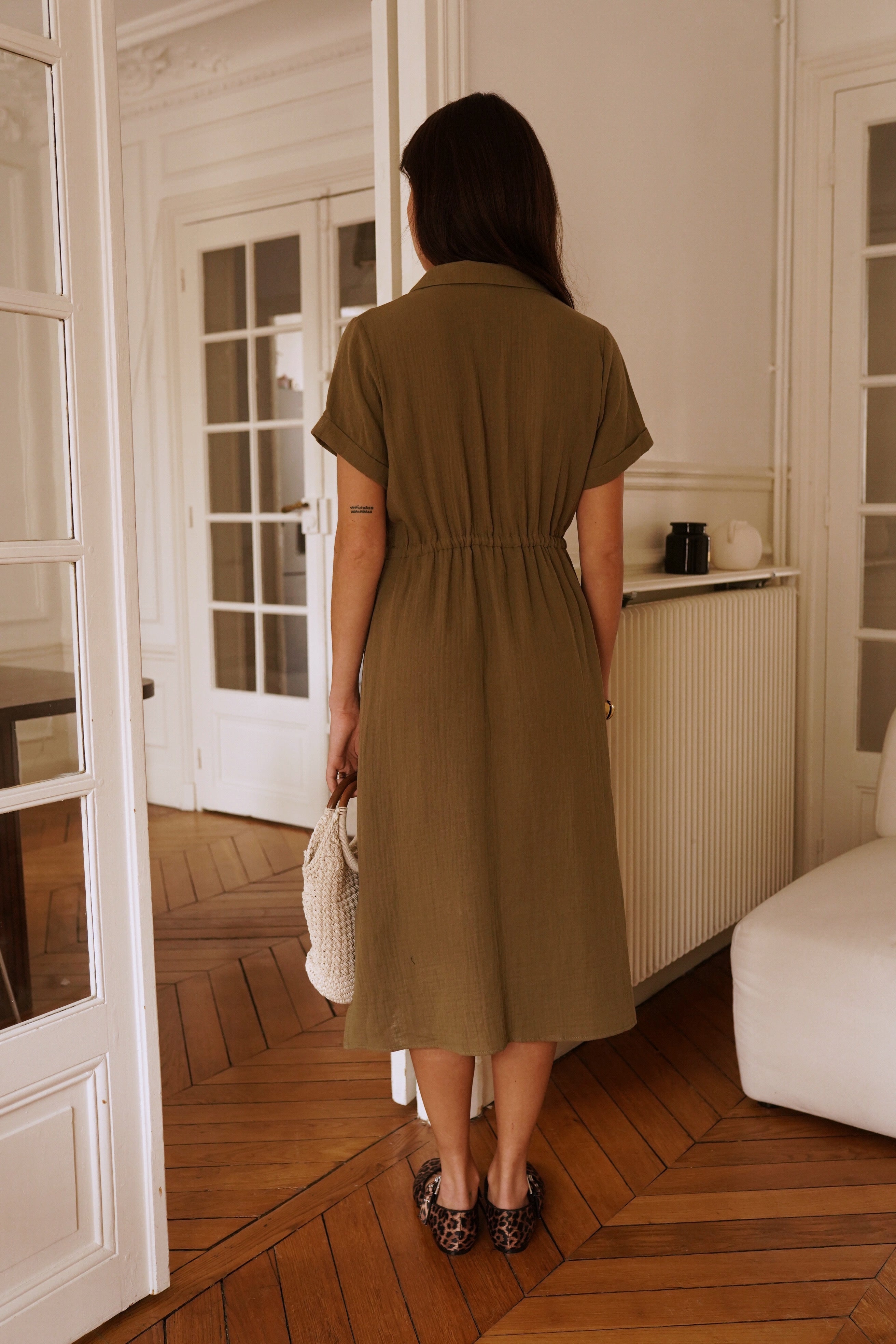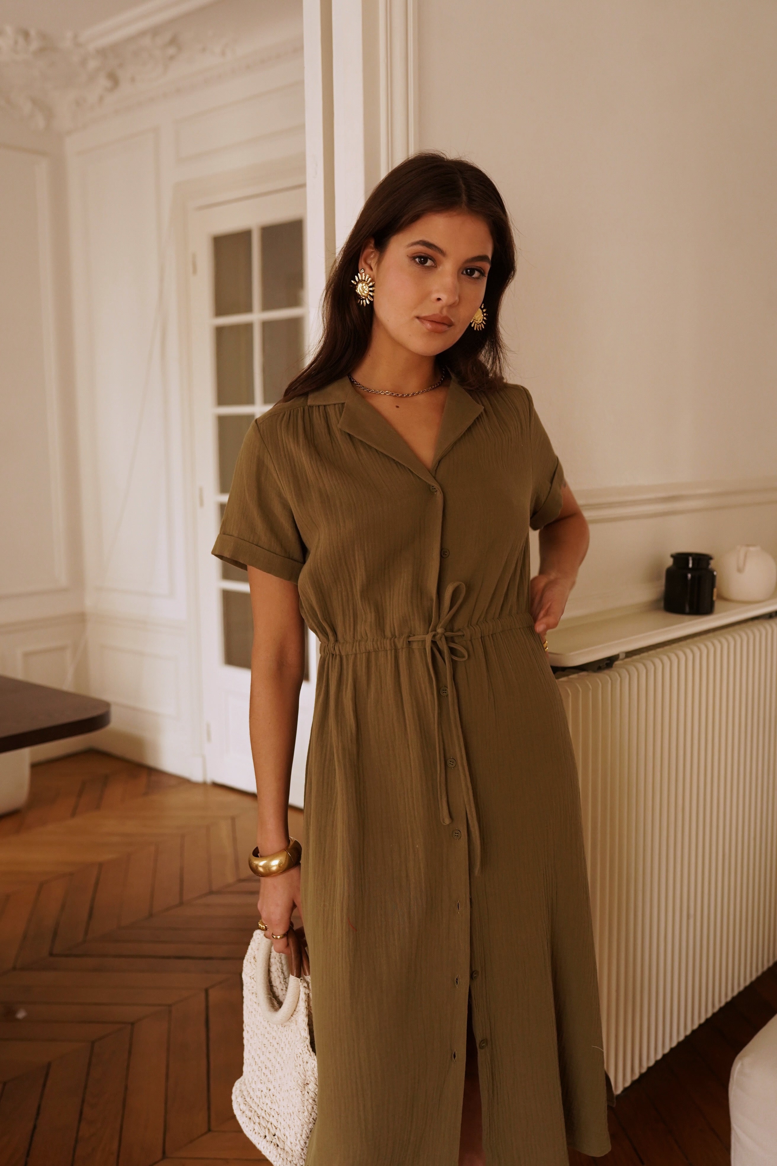 Un incontournable du dressing moderne cette robe chemise kaki, sa coupe fluide et sa teinte naturelle en font une pièce polyvalente, idéale pour un look casual chic en toute saison.
