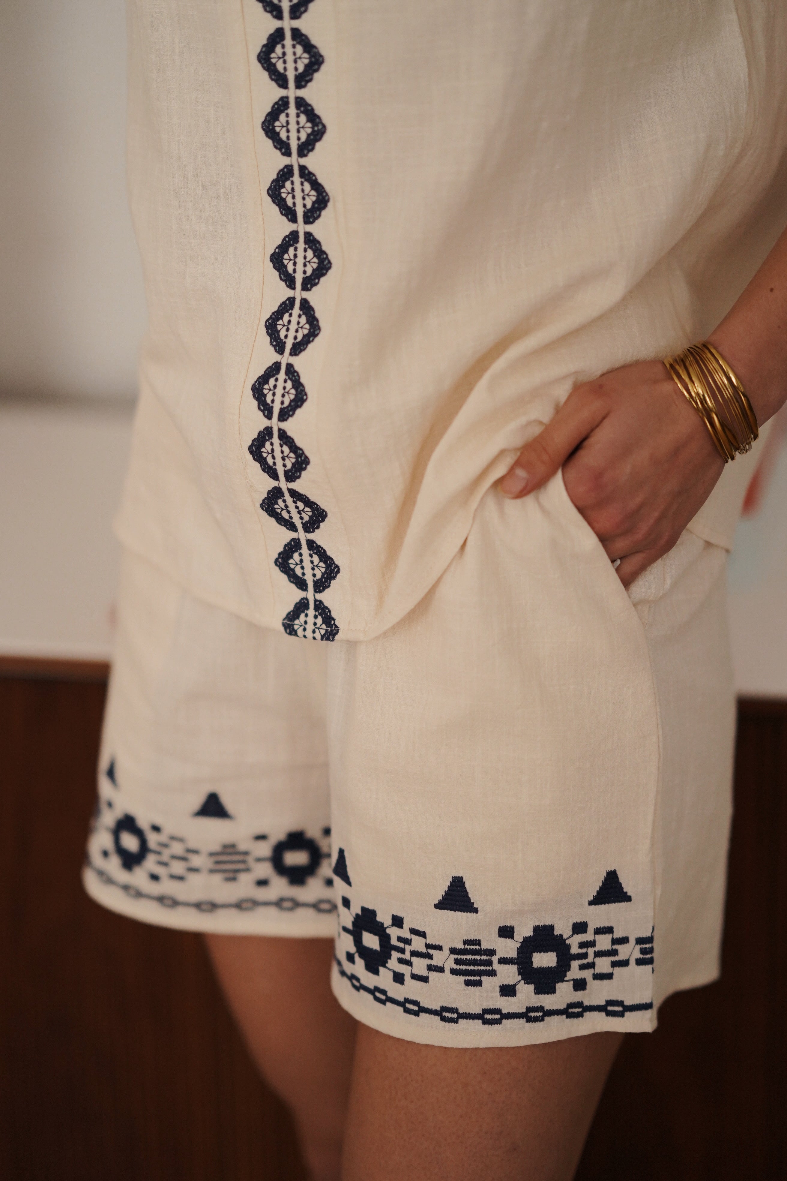 Taille élastiquée pour un maximum de confort, broderies sur les jambes et poches sur les cotés.