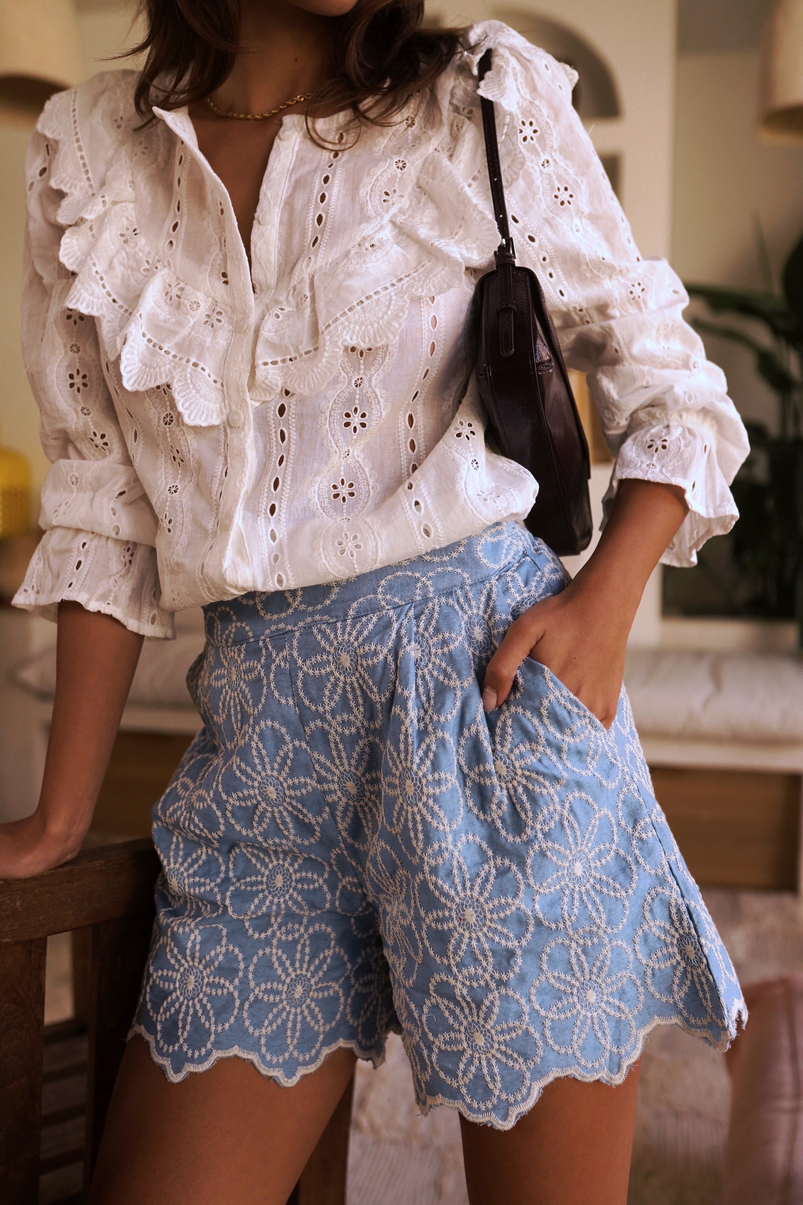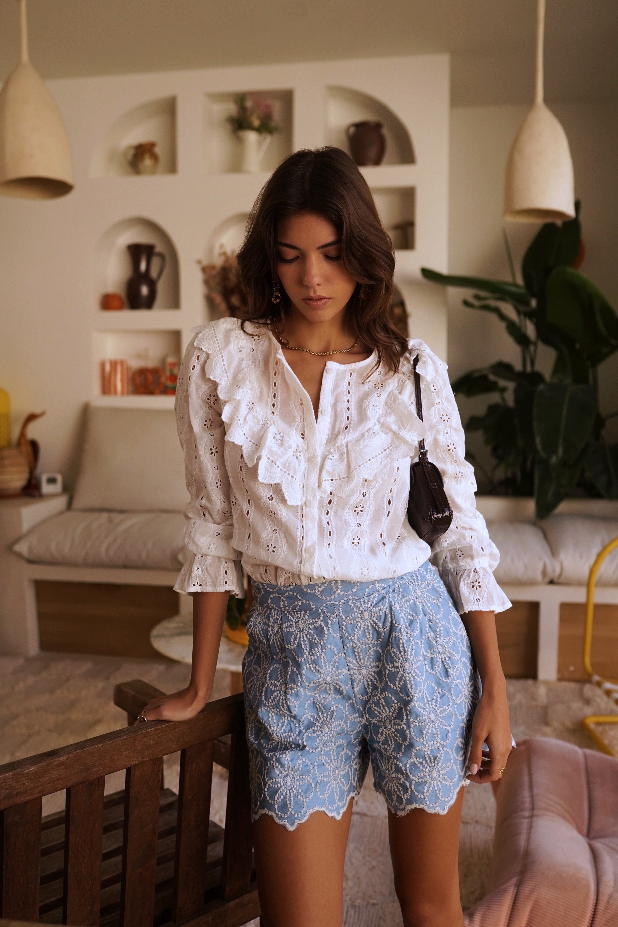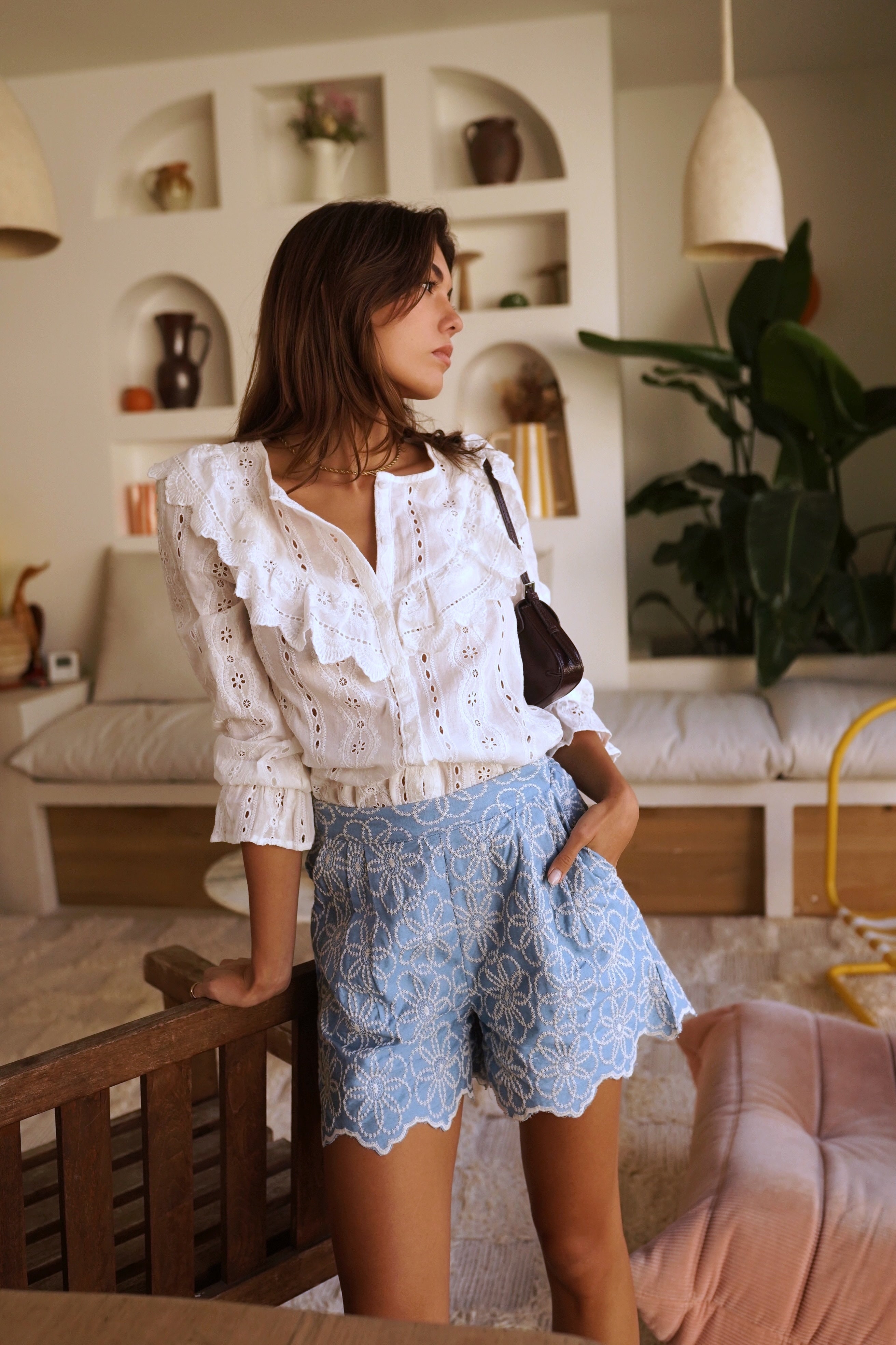 Short en broderie anglaise bleu ciel, sublimé par des motifs floraux délicats et une finition festonnée. Sa coupe fluide et ses poches pratiques en font une pièce à la fois élégante et confortable, parfaite pour une allure bohème chic.