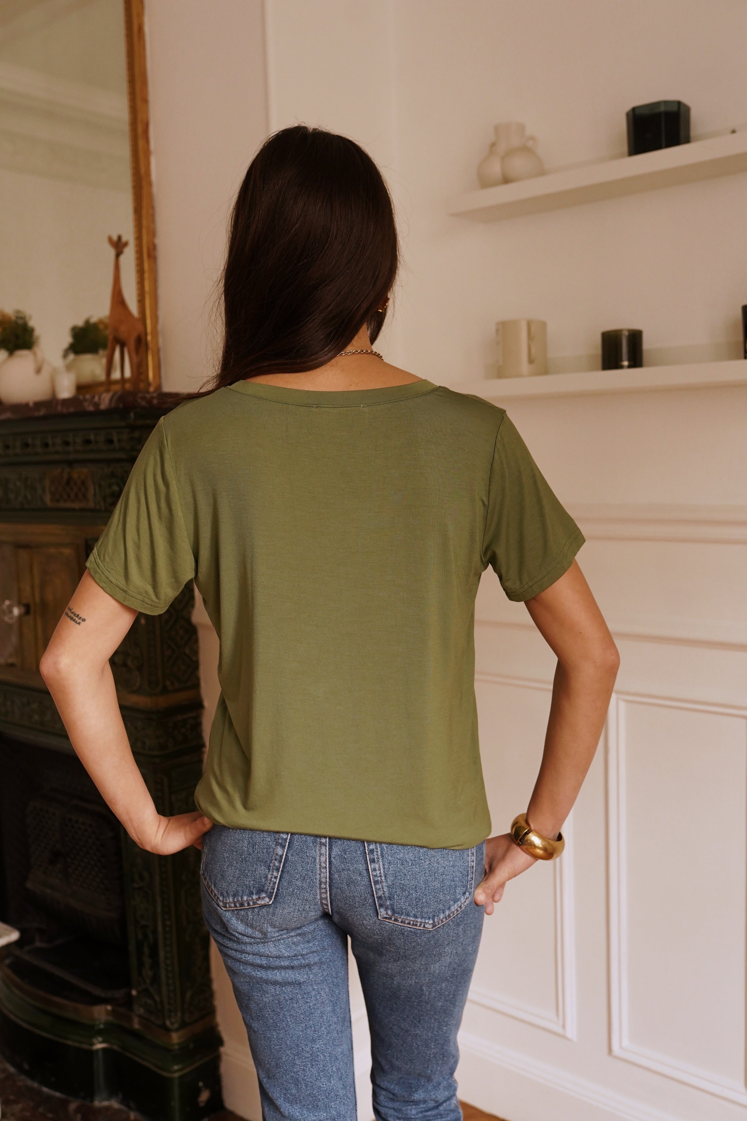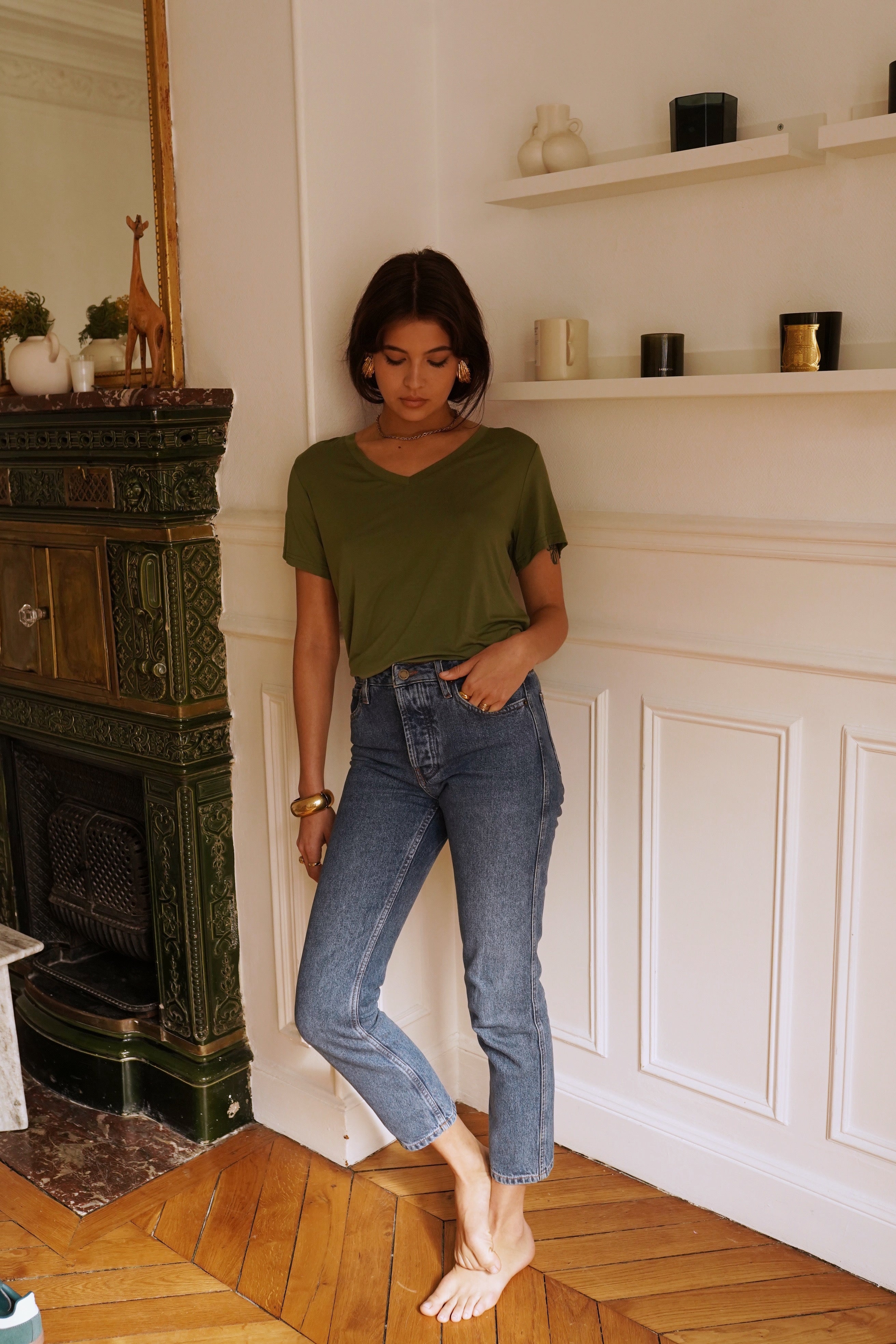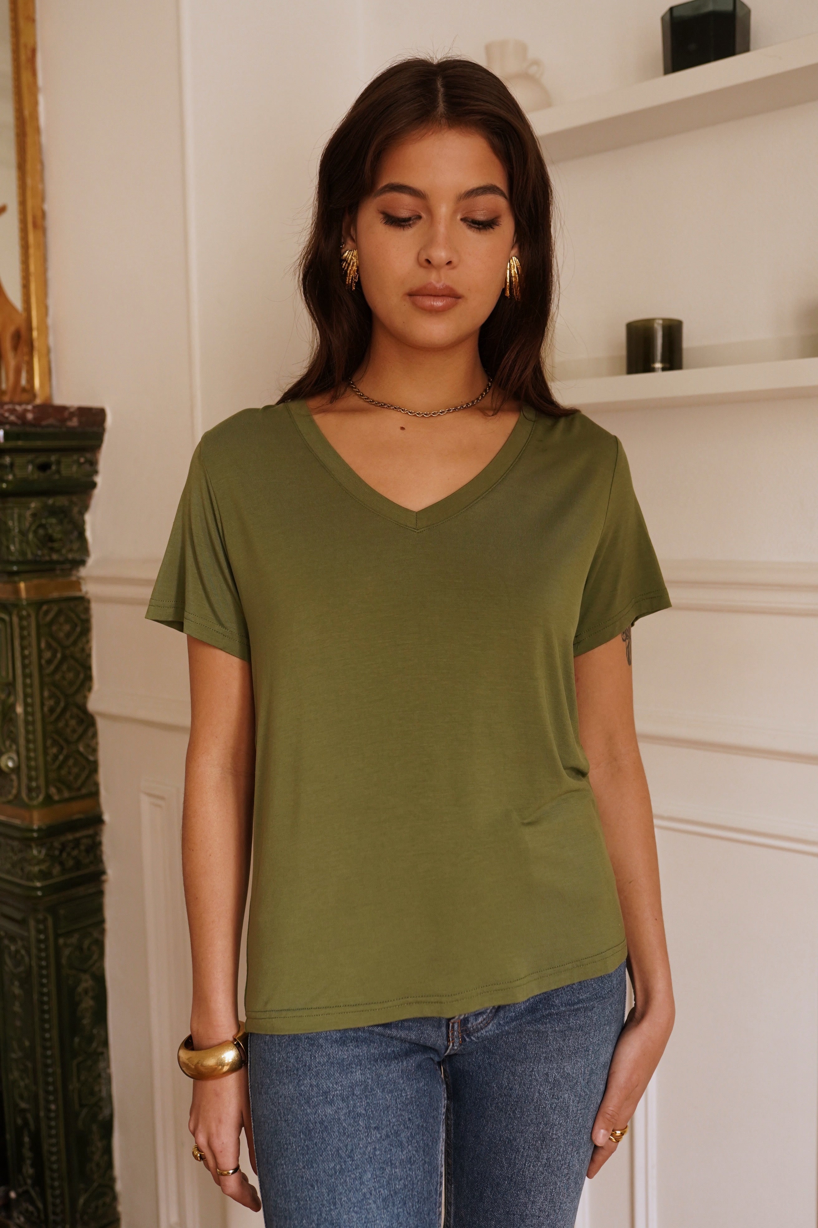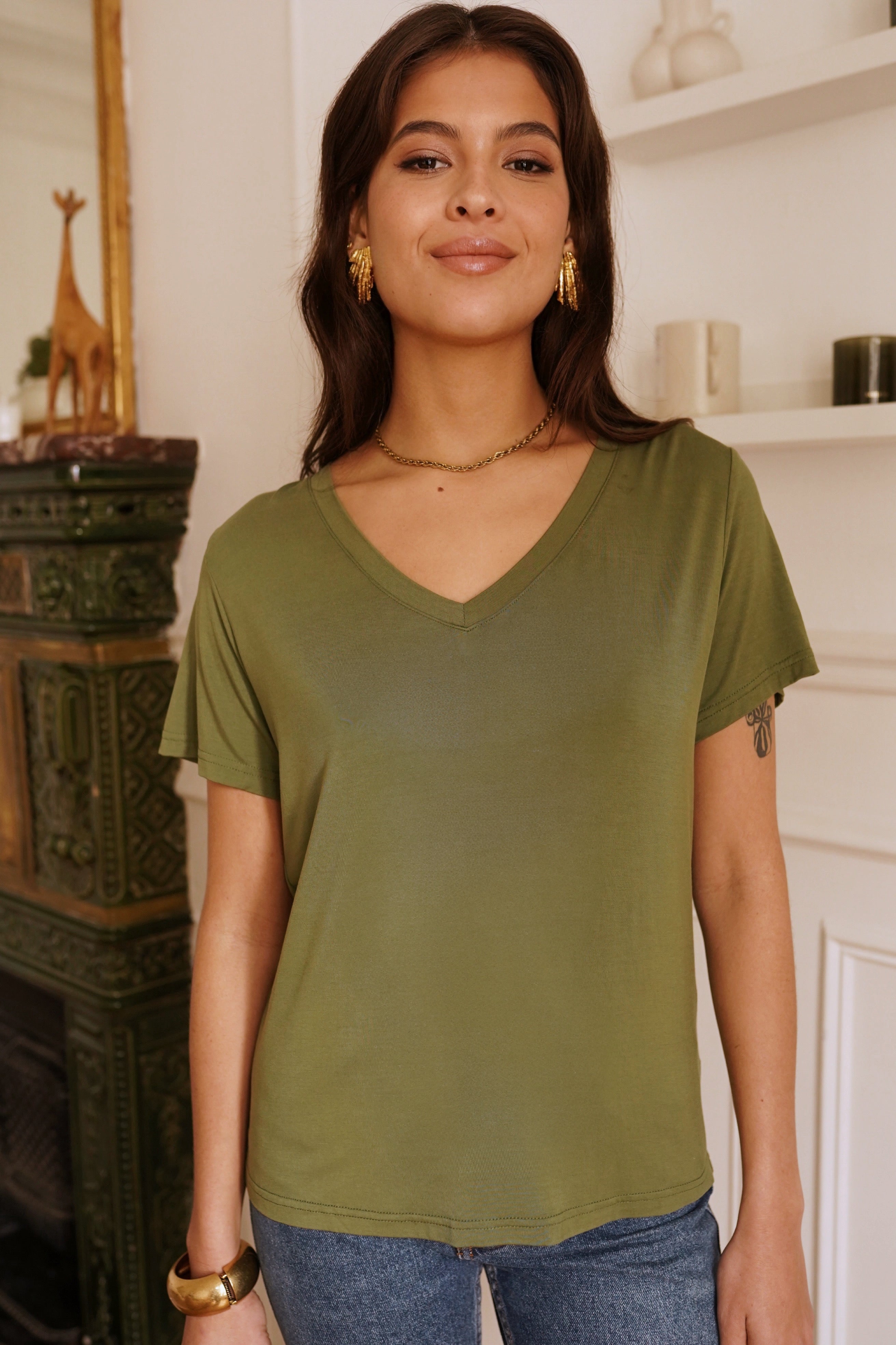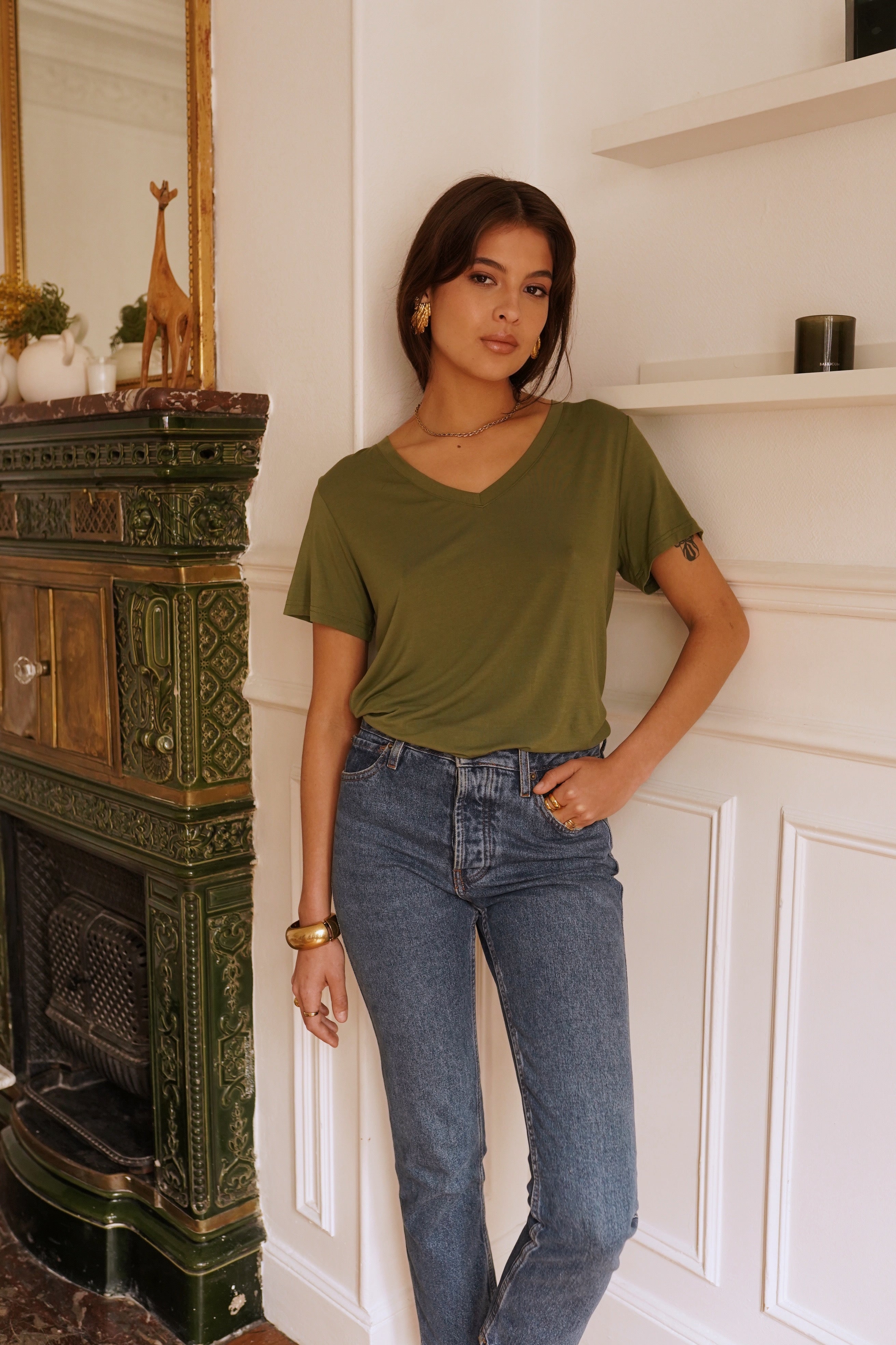 Avec sa coupe épurée et sa teinte kaki intemporelle, ce t-shirt col V est un incontournable du vestiaire. Confortable et facile à porter, il s’adapte à tous les styles, du décontracté au plus sophistiqué, selon les associations. Idéal pour un look naturel et moderne.