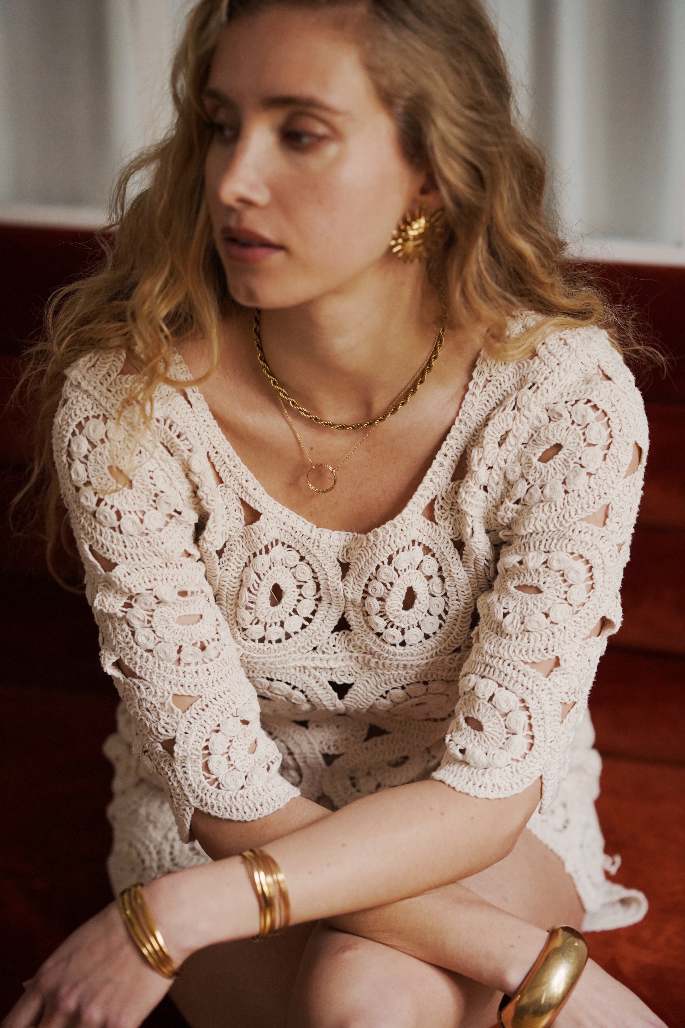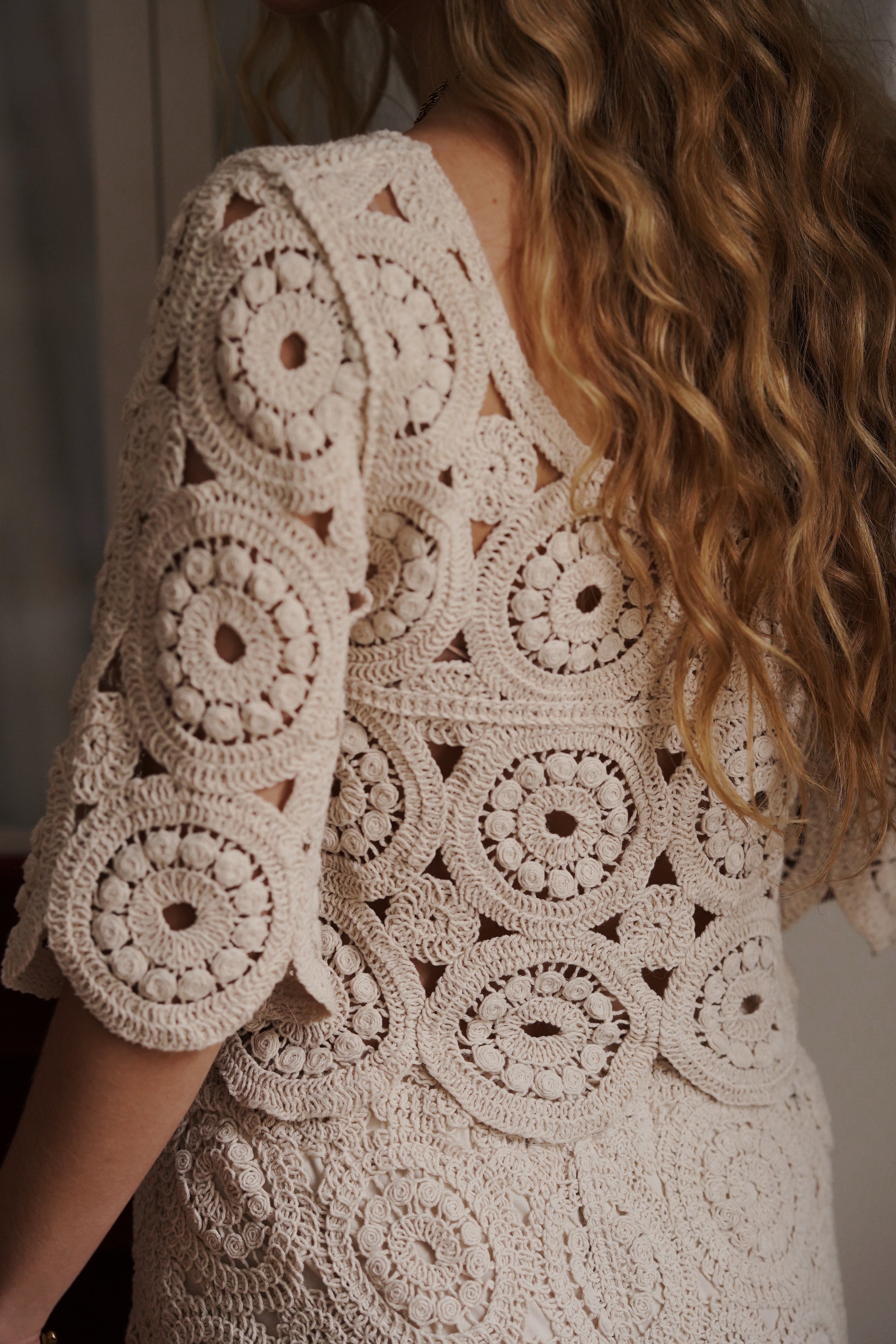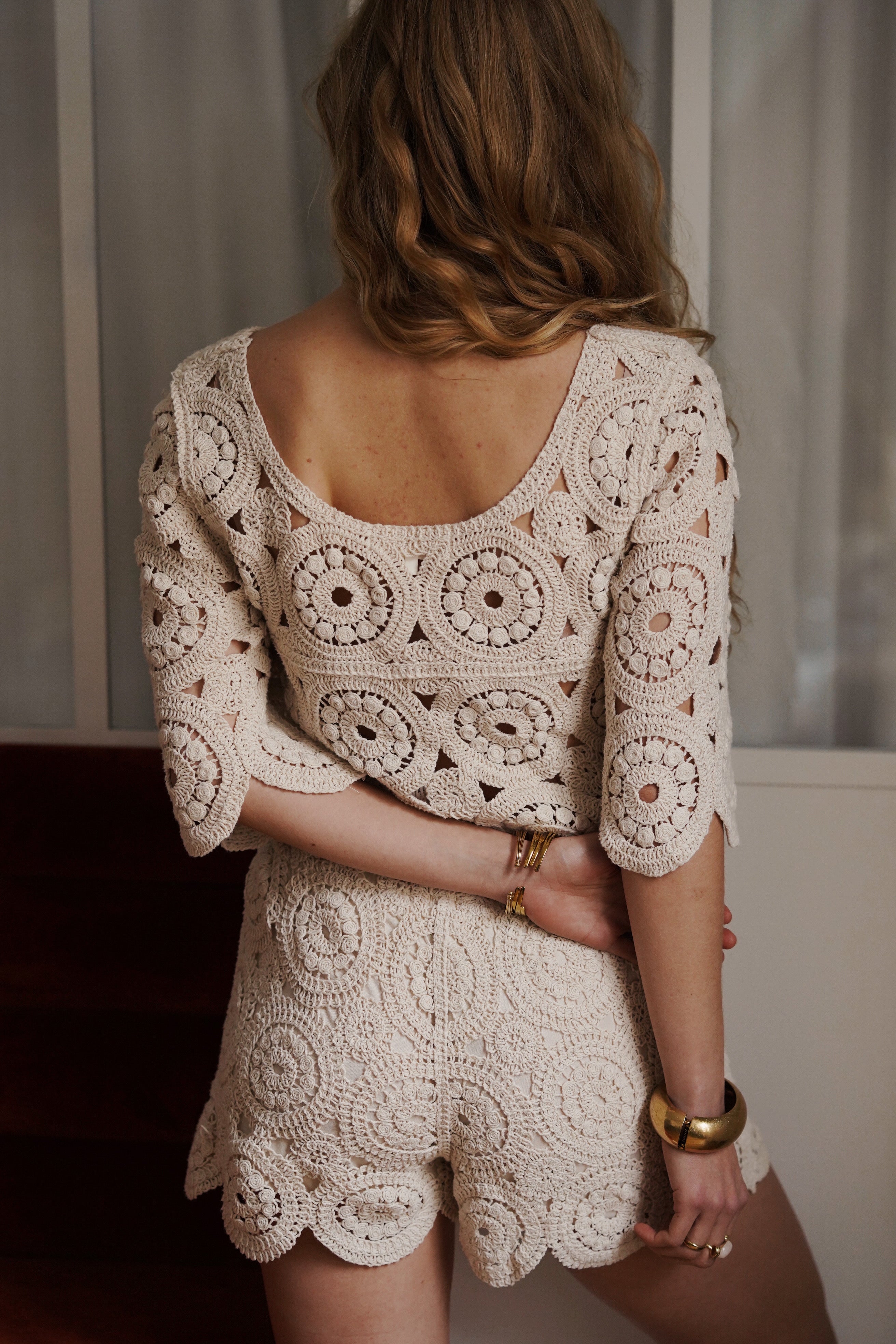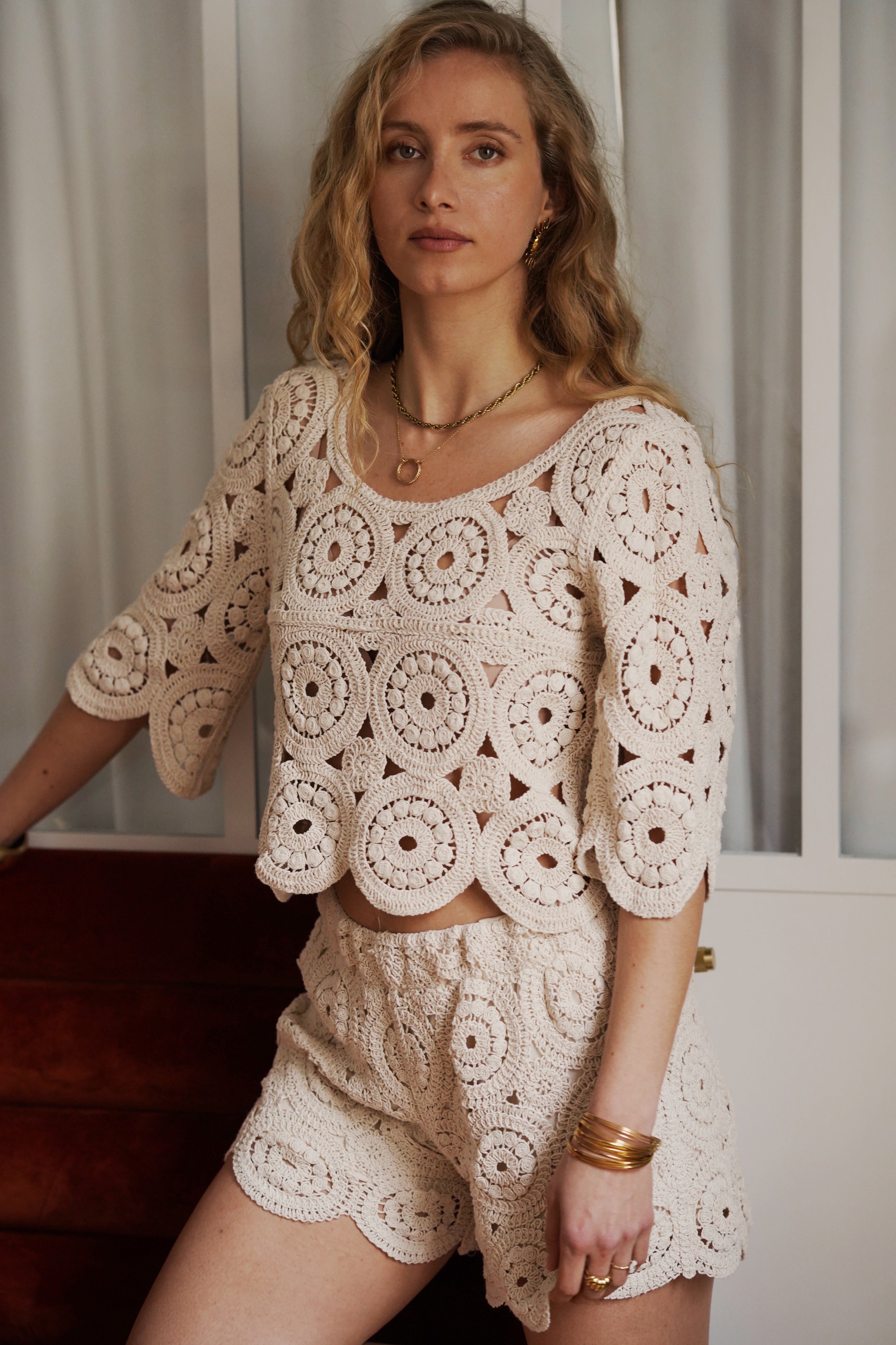 Ce haut en crochet écru capture parfaitement l'esprit bohème avec son travail de maille ajourée et ses motifs circulaires délicatement assemblés. Son allure artisanale et sa coupe fluide en font une pièce idéale pour un look estival et raffiné.