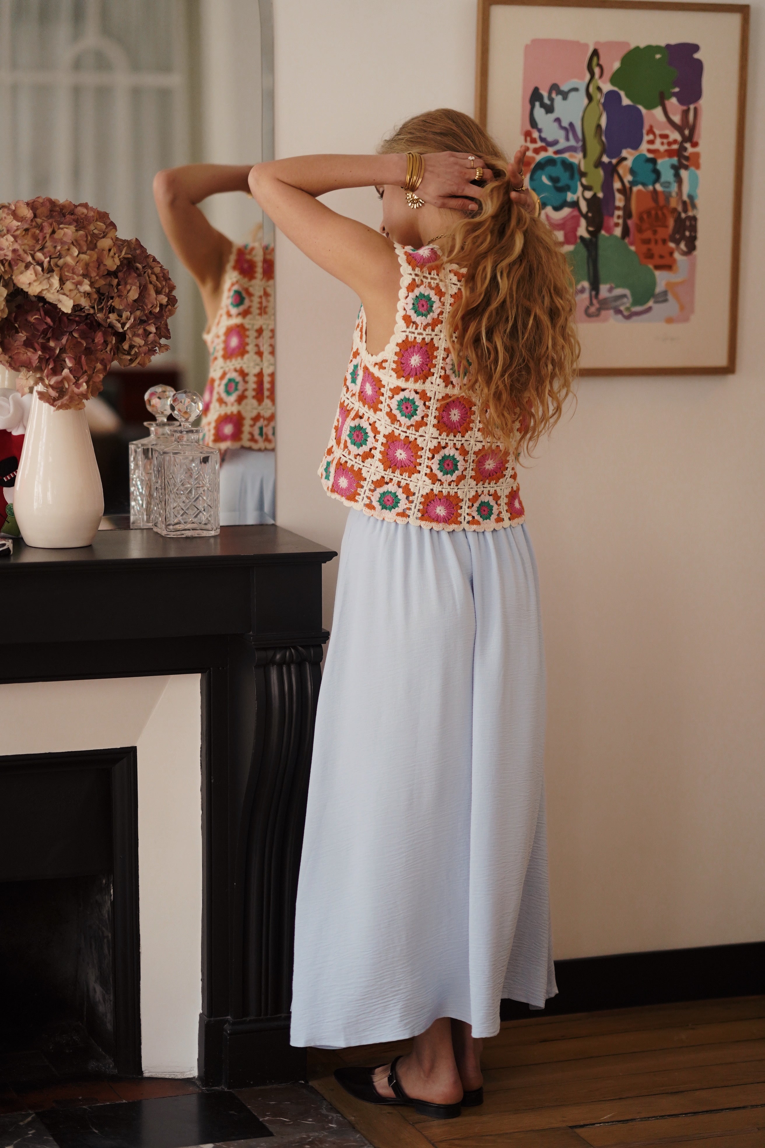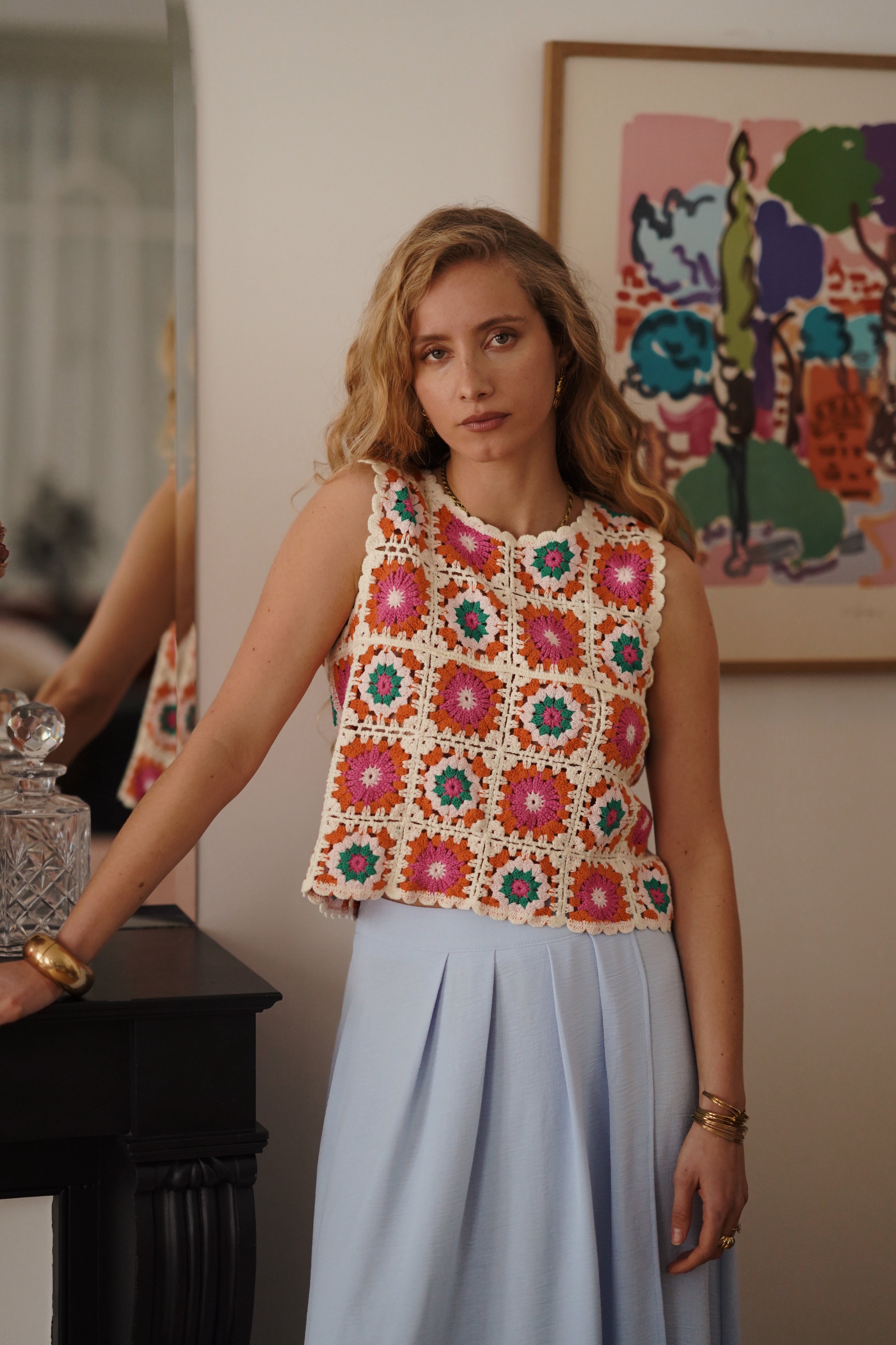 Ce top en crochet multicolore est une véritable pièce artisanale qui allie charme rétro et modernité.