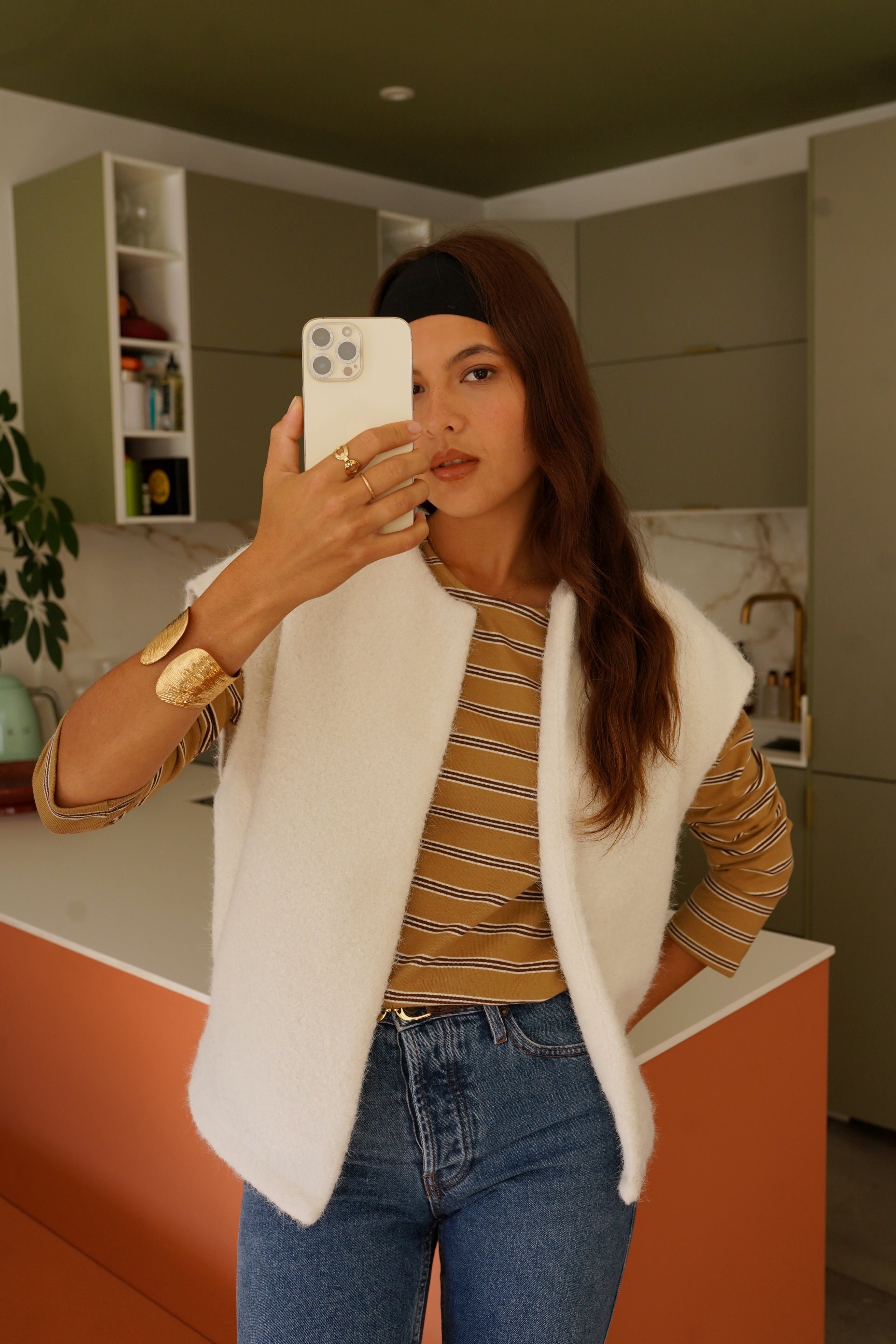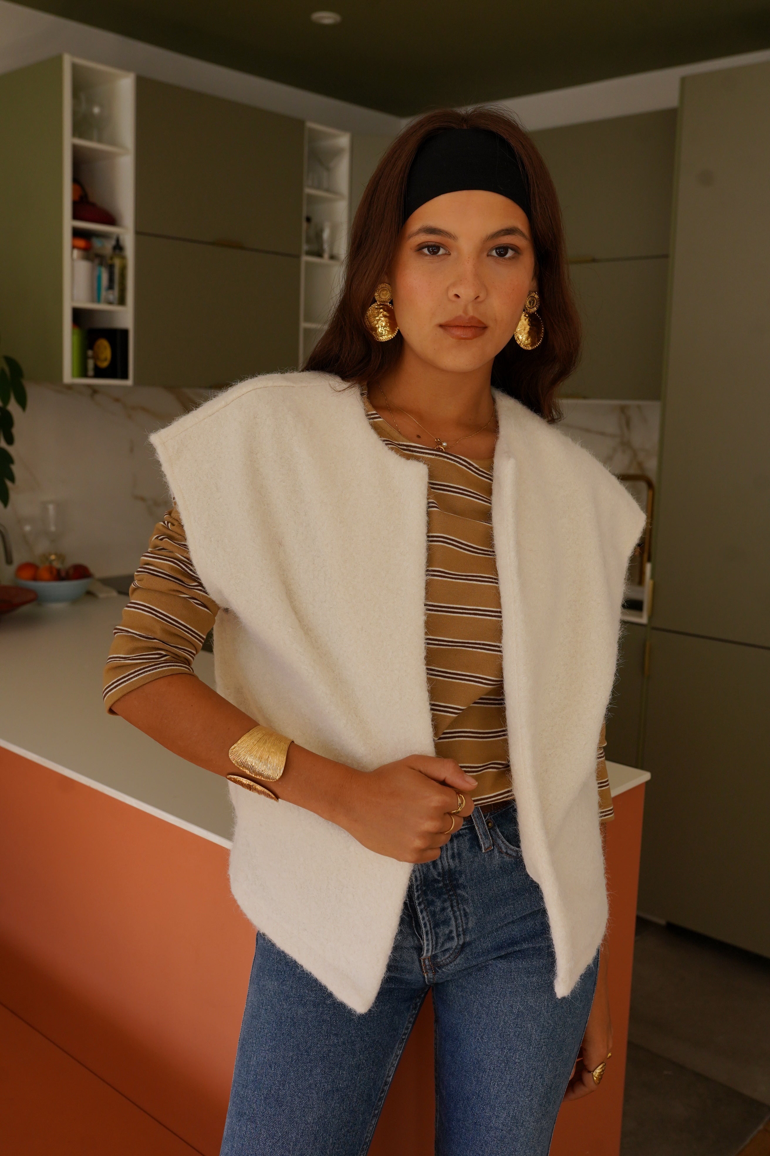 Sa coupe sans manches, moderne et facile à superposer, en fait l’alliée idéale de la mi-saison : à glisser sur une chemise brodée, un haut rayé ou un pull fin pour multiplier les looks. Une pièce incontournable qui réchauffe les tenues tout en leur donnant une touche sophistiquée.