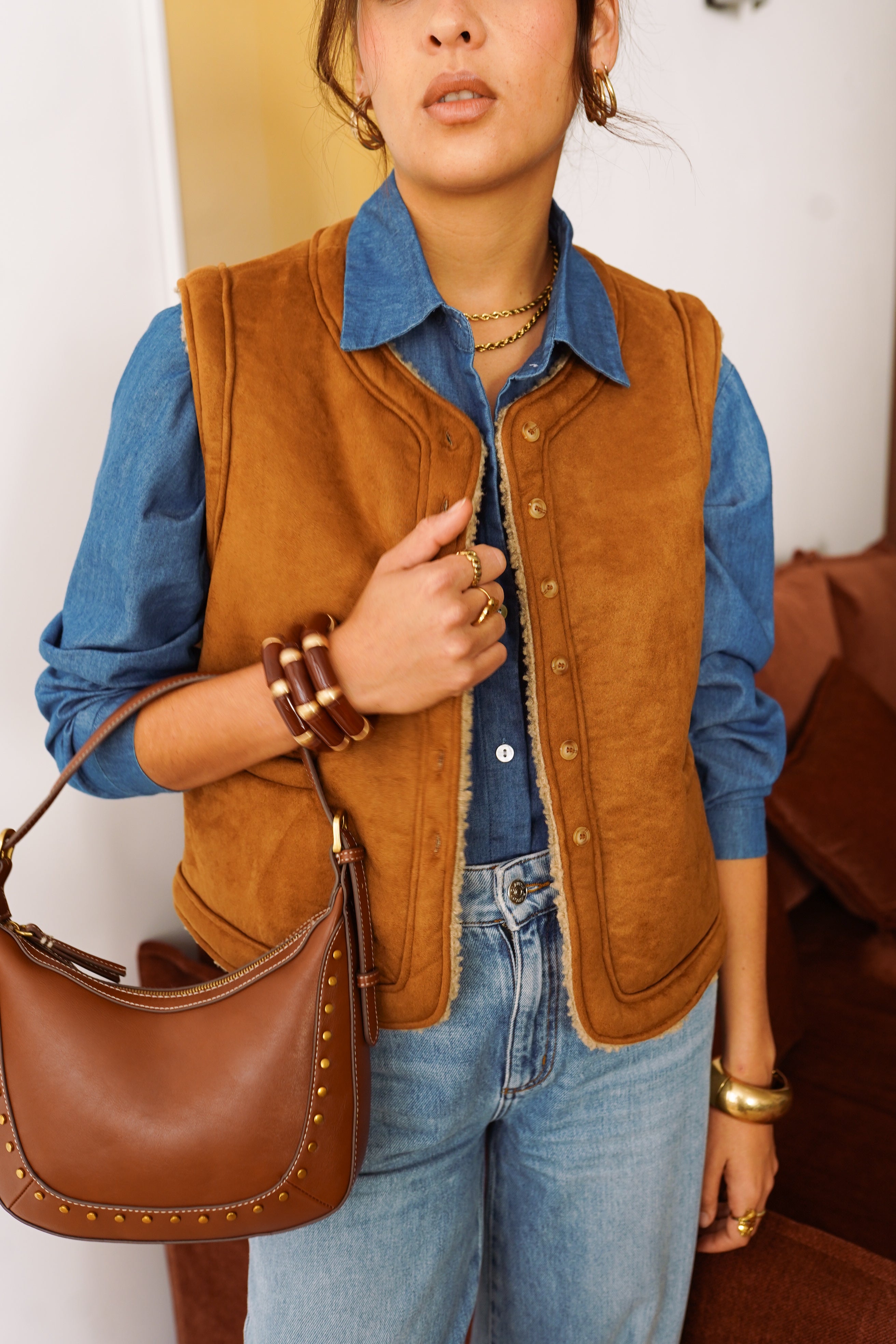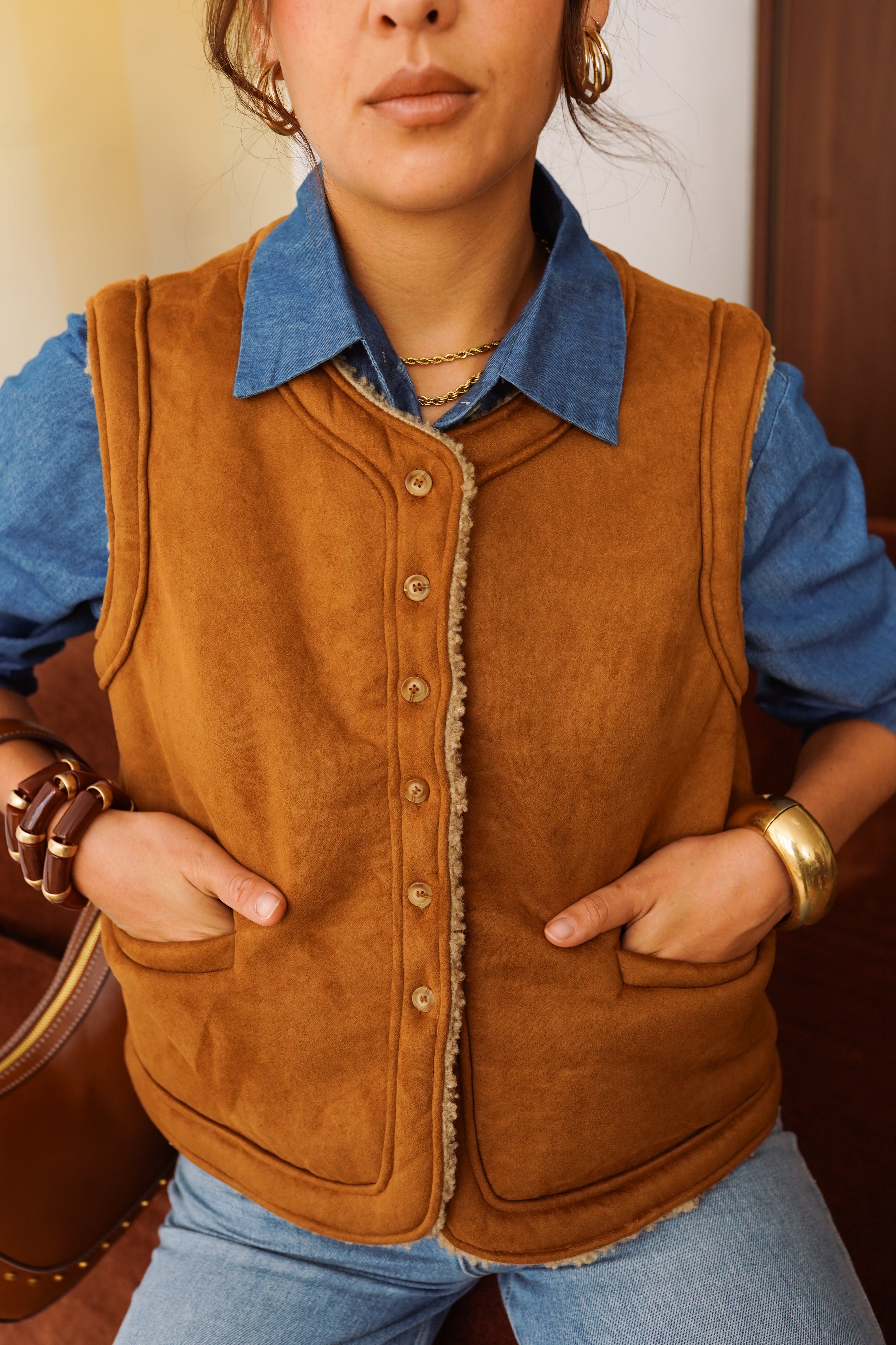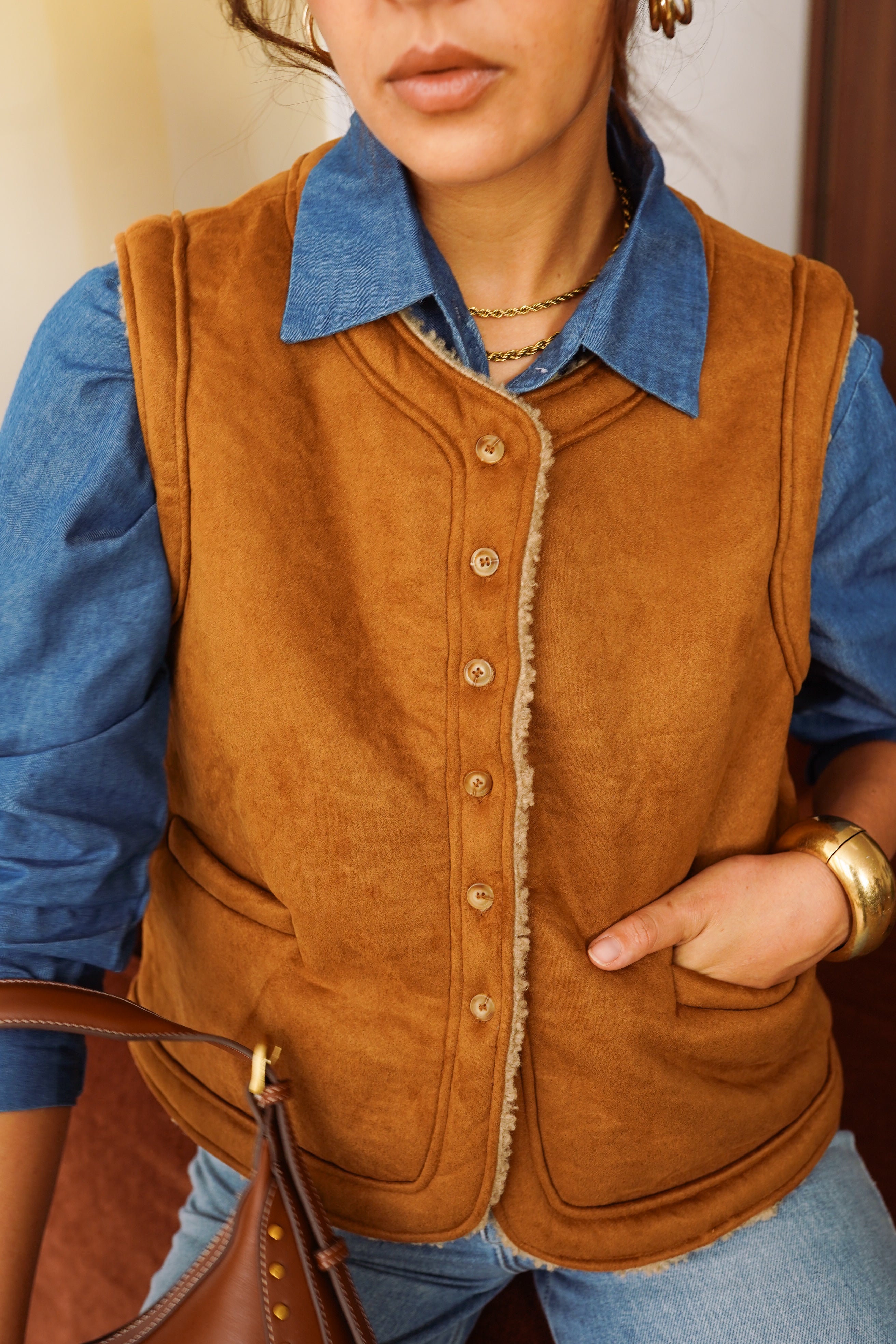 La veste sans manches Alizée s’impose comme une pièce forte avec sa suédine camel et son intérieur doublé. Sa texture douce et son volume sans manches apportent caractère et confort.