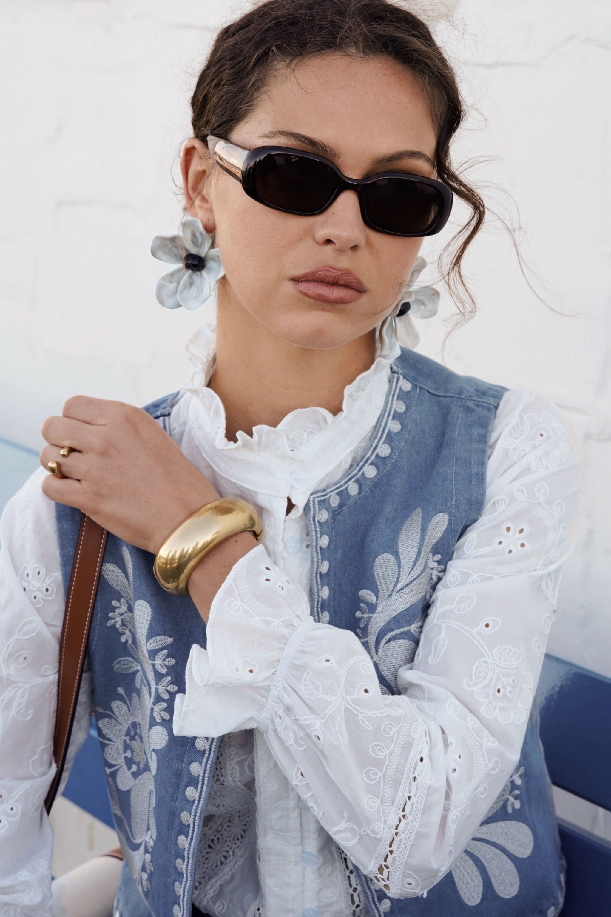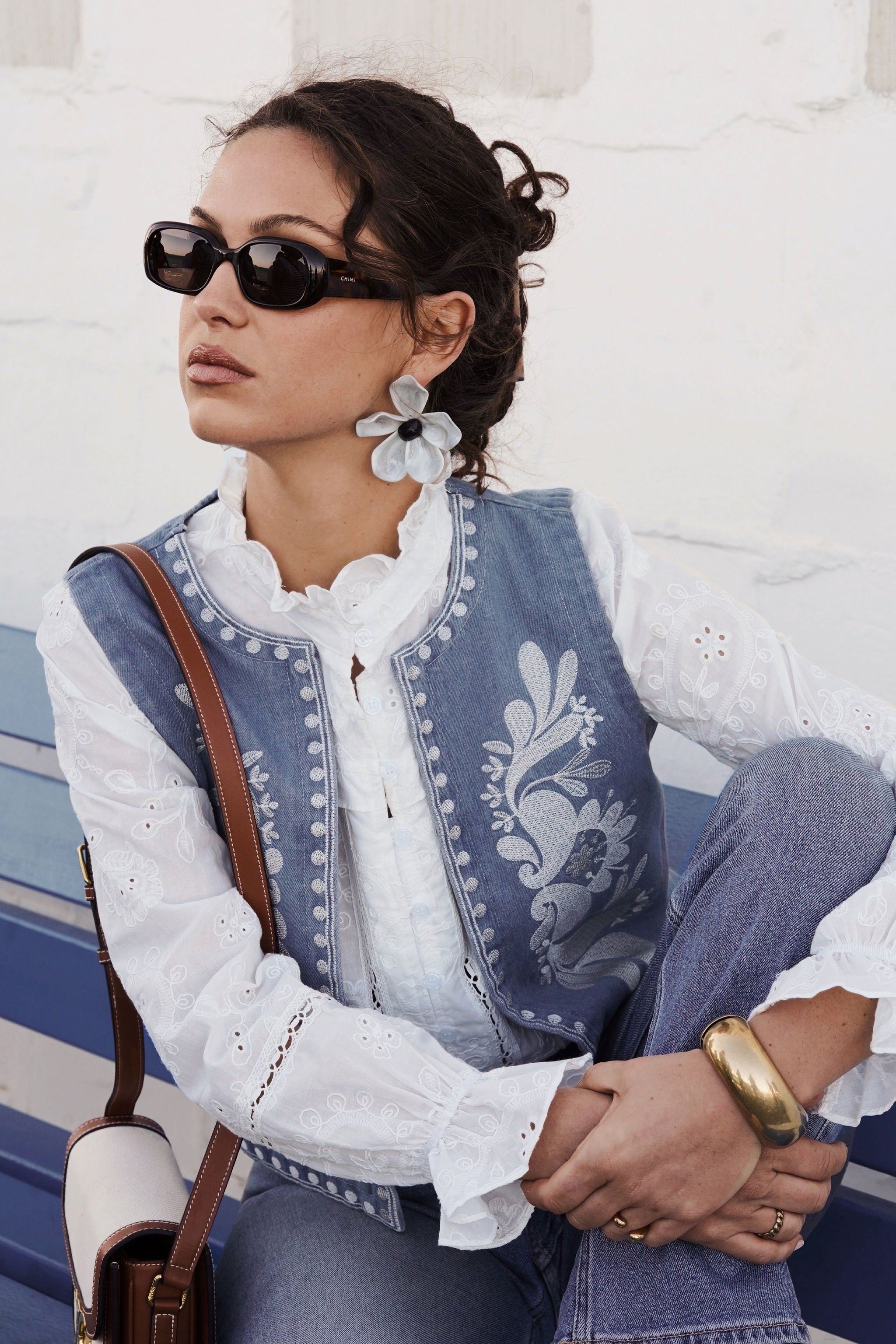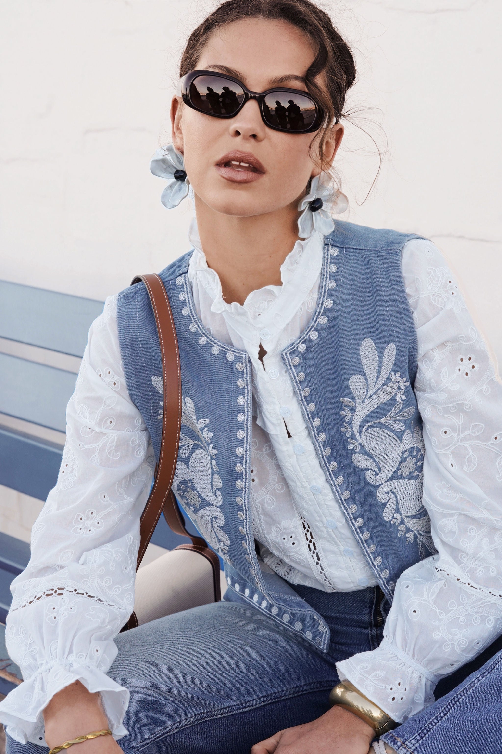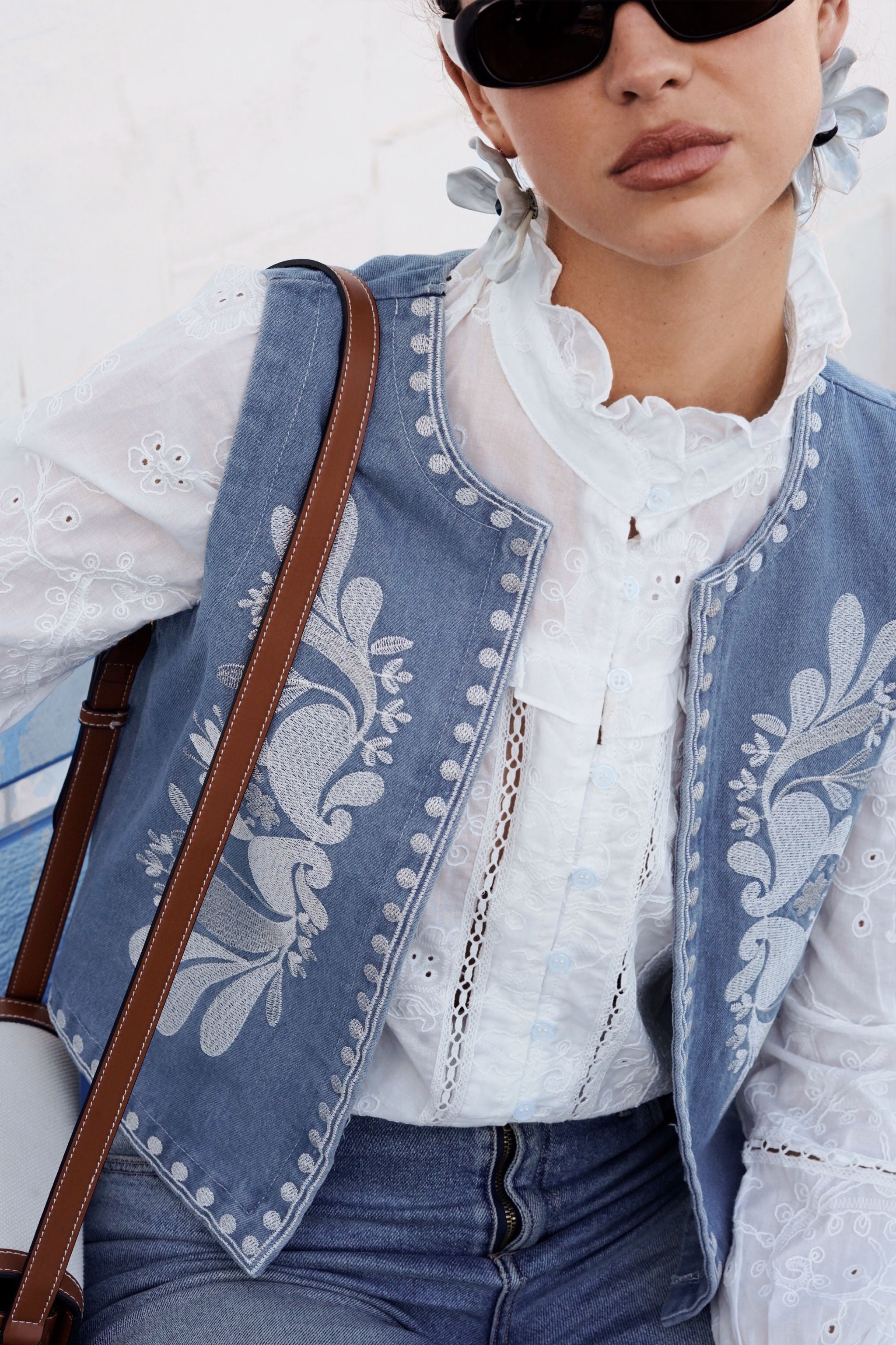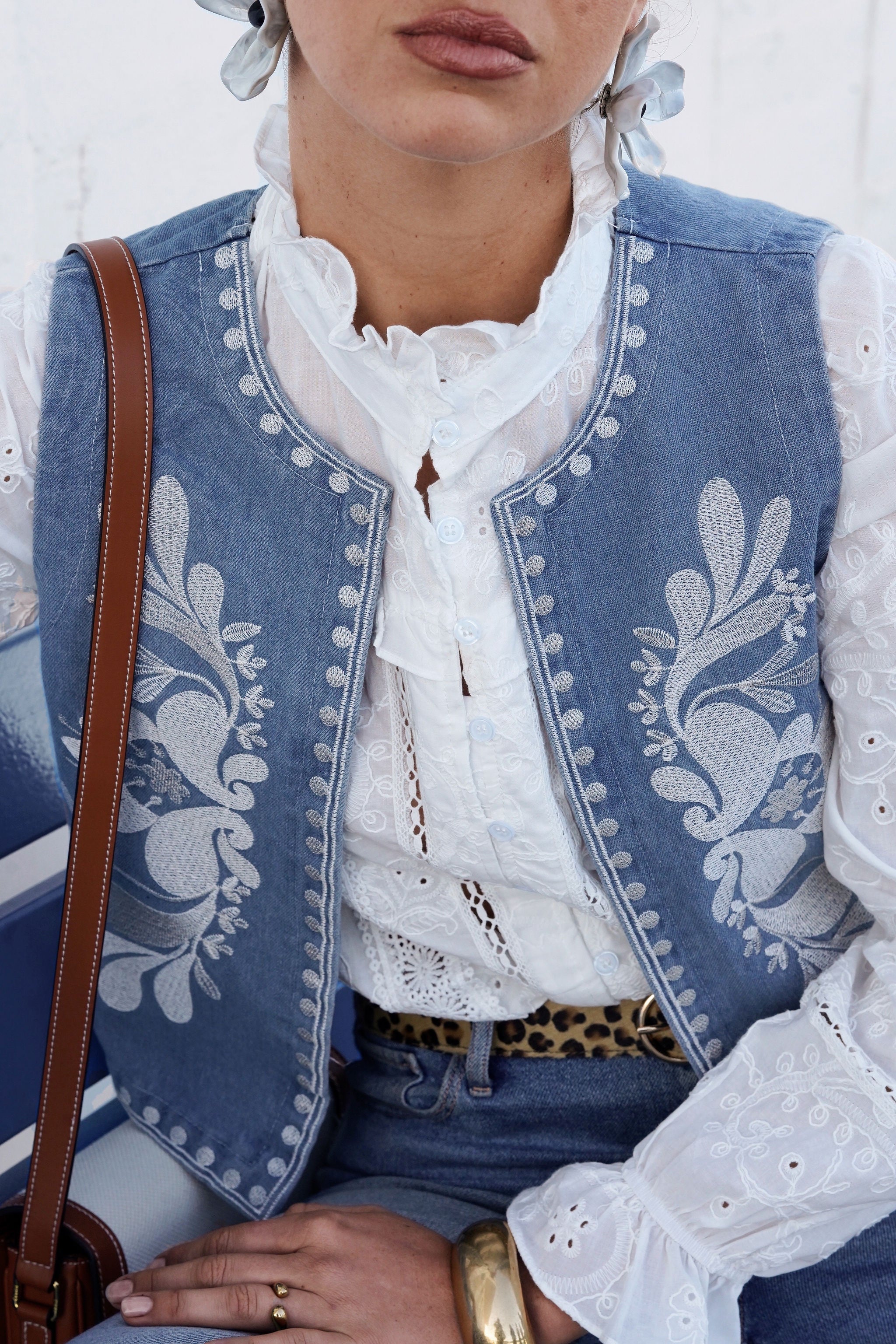Cette veste sans manches en denim brodé revisite l’esprit folk avec une touche moderne et raffinée. Son tissu en jean texturé est sublimé par des broderies florales délicates, apportant un contraste élégant et artisanal.