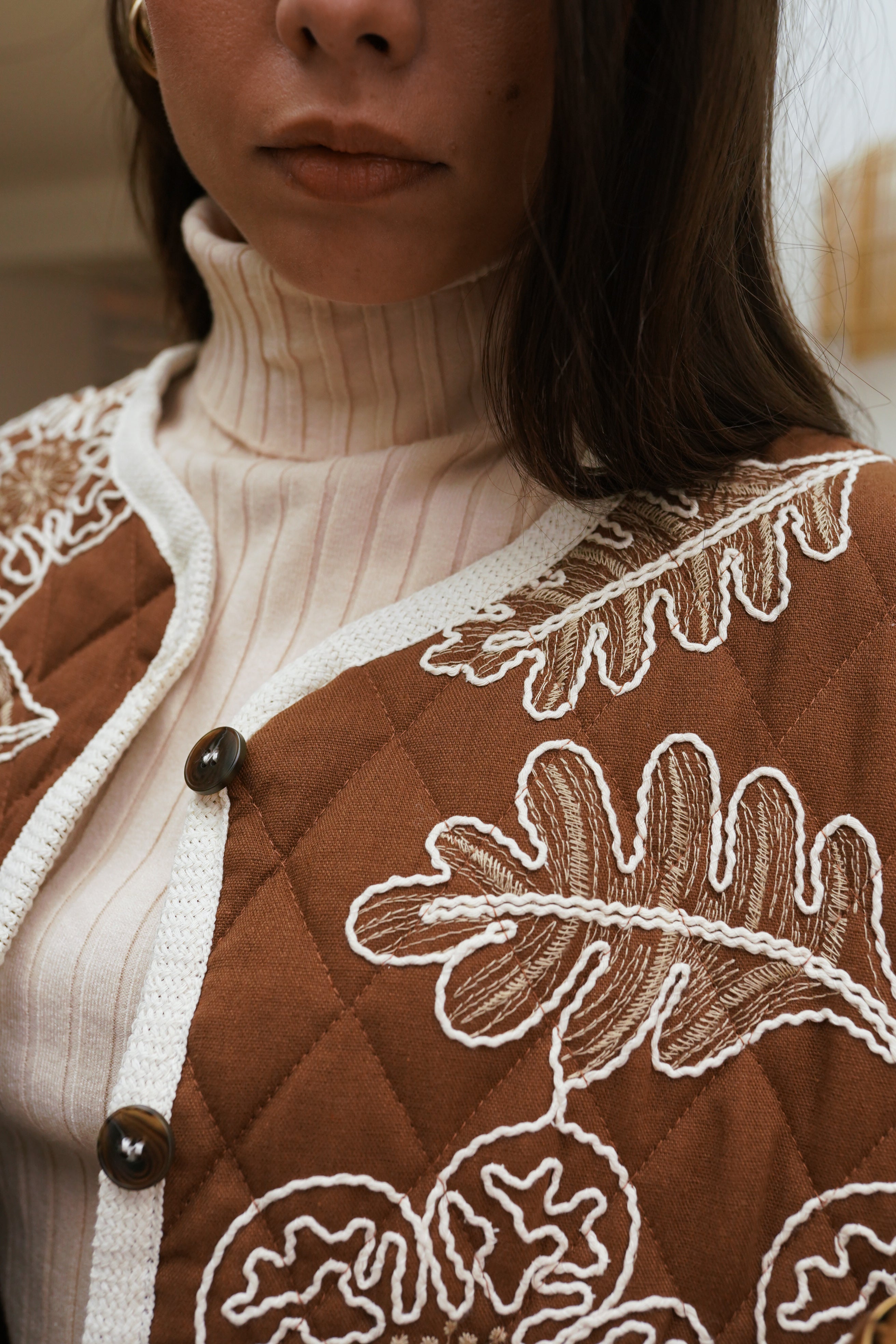 Jeu de textures et de volumes pour cette veste matelassée au charme bohème. Son coton brun se pare de broderies florales contrastées, dessinant un motif fort mais doux à la fois. Les finitions écrues et les boutons apparents apportent une touche d’élégance artisanale, parfaite pour la mi-saison.