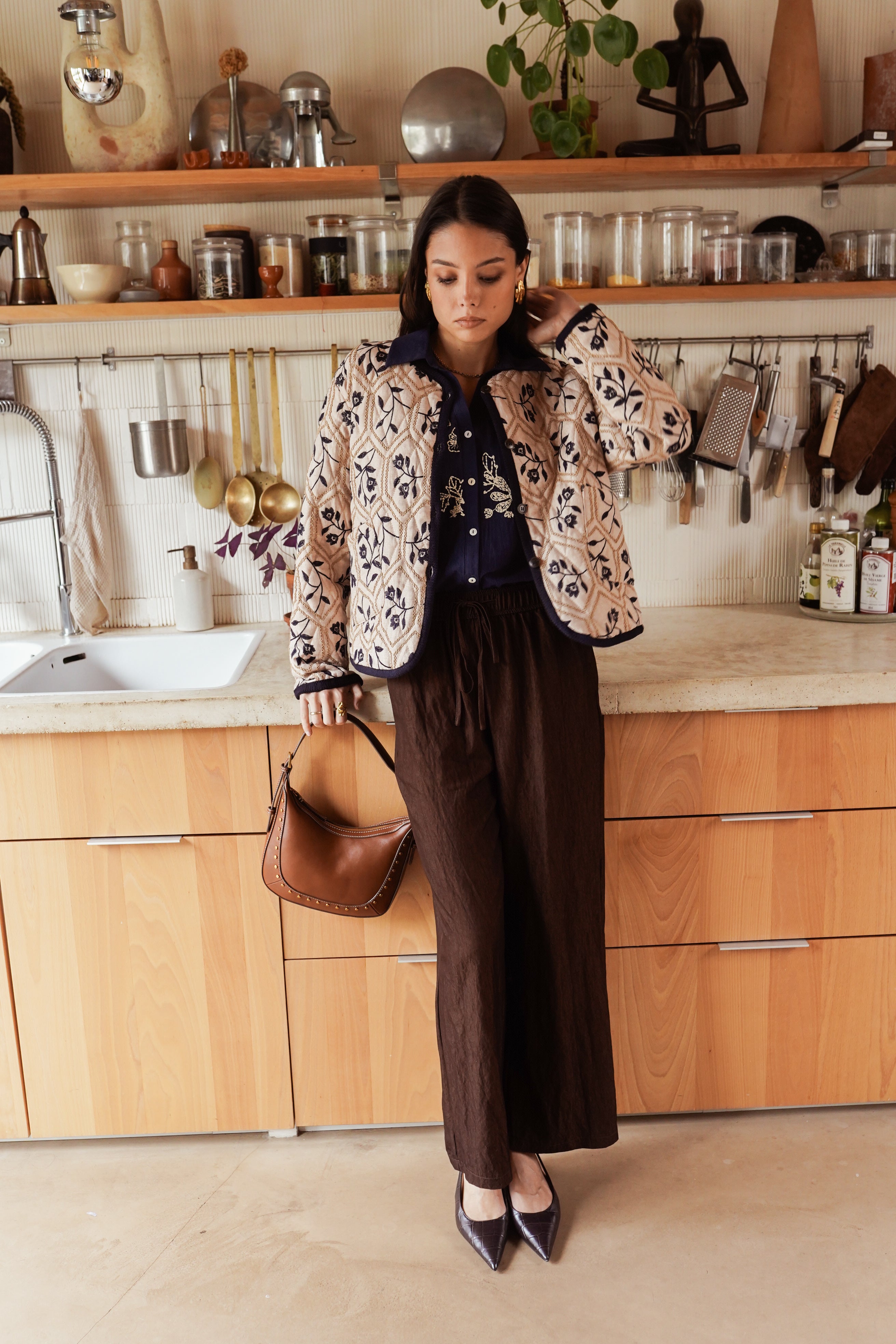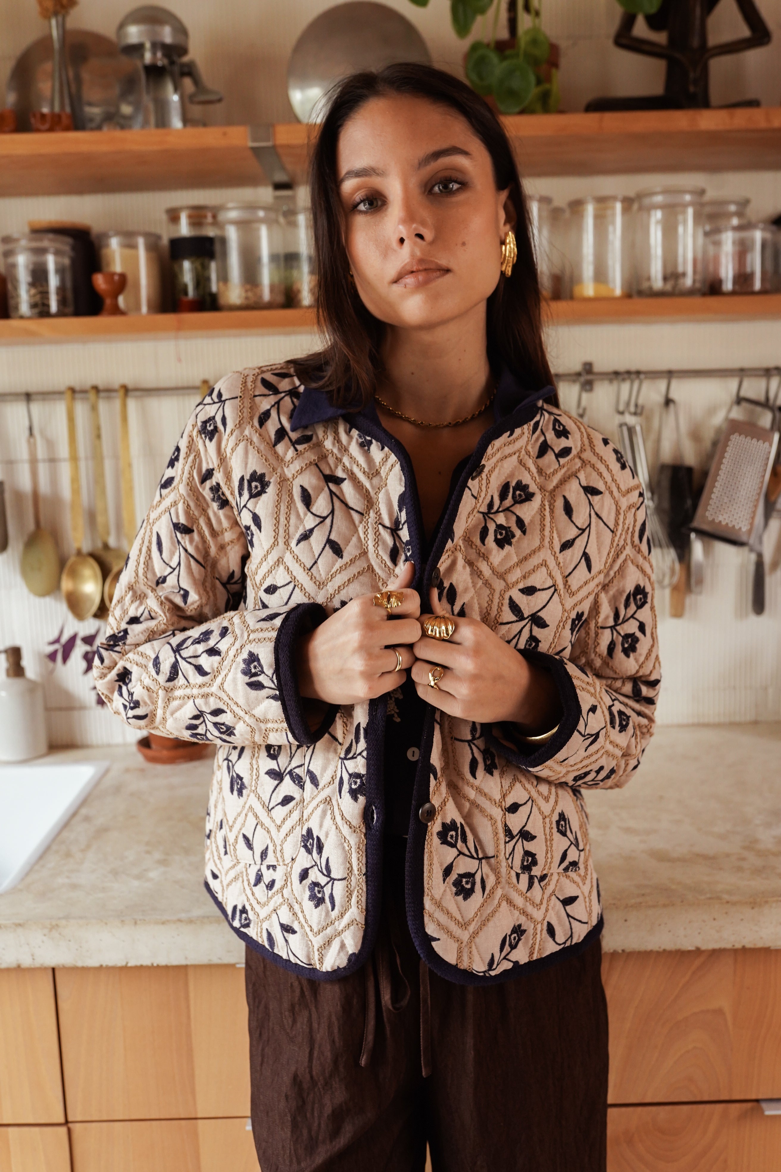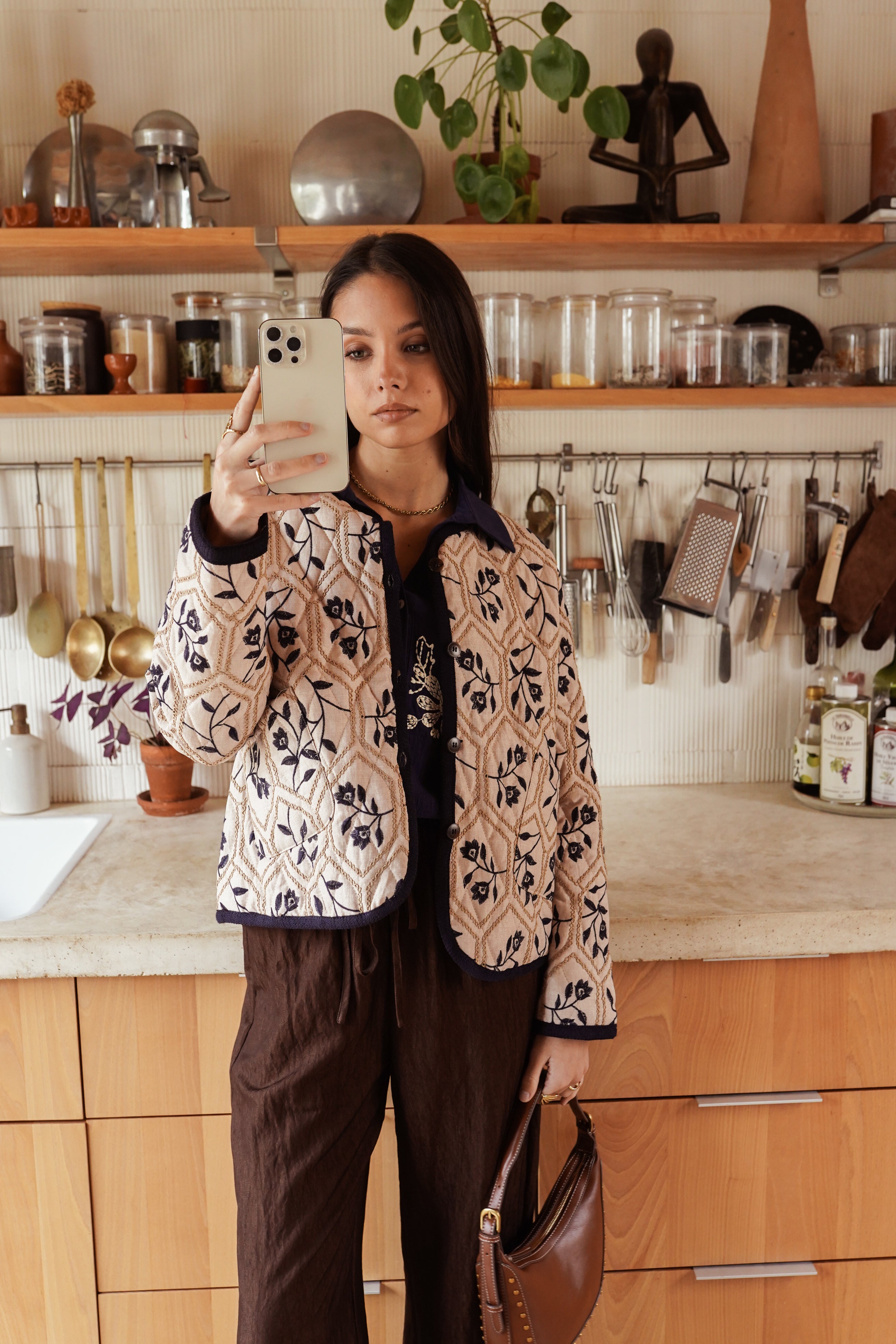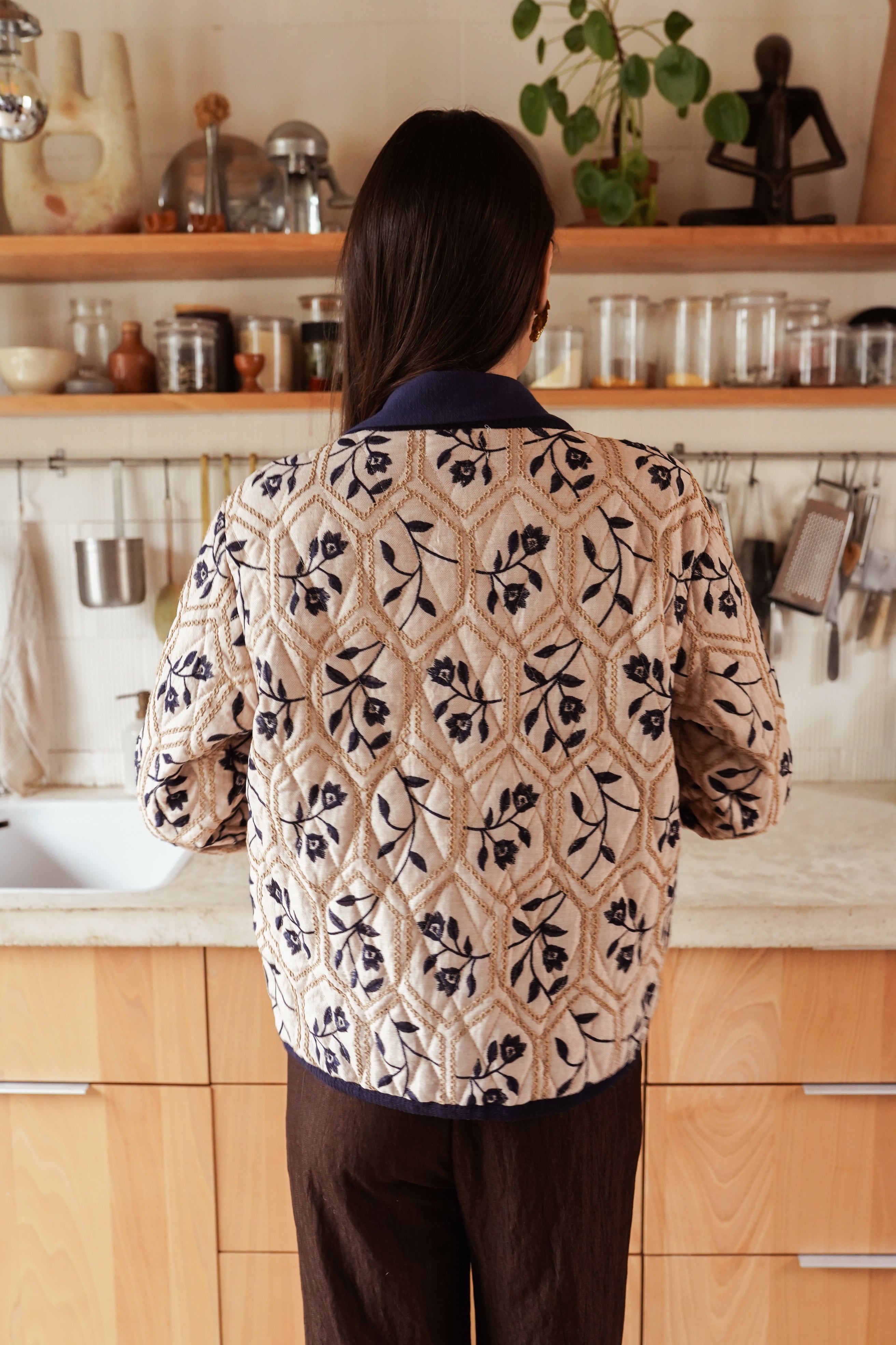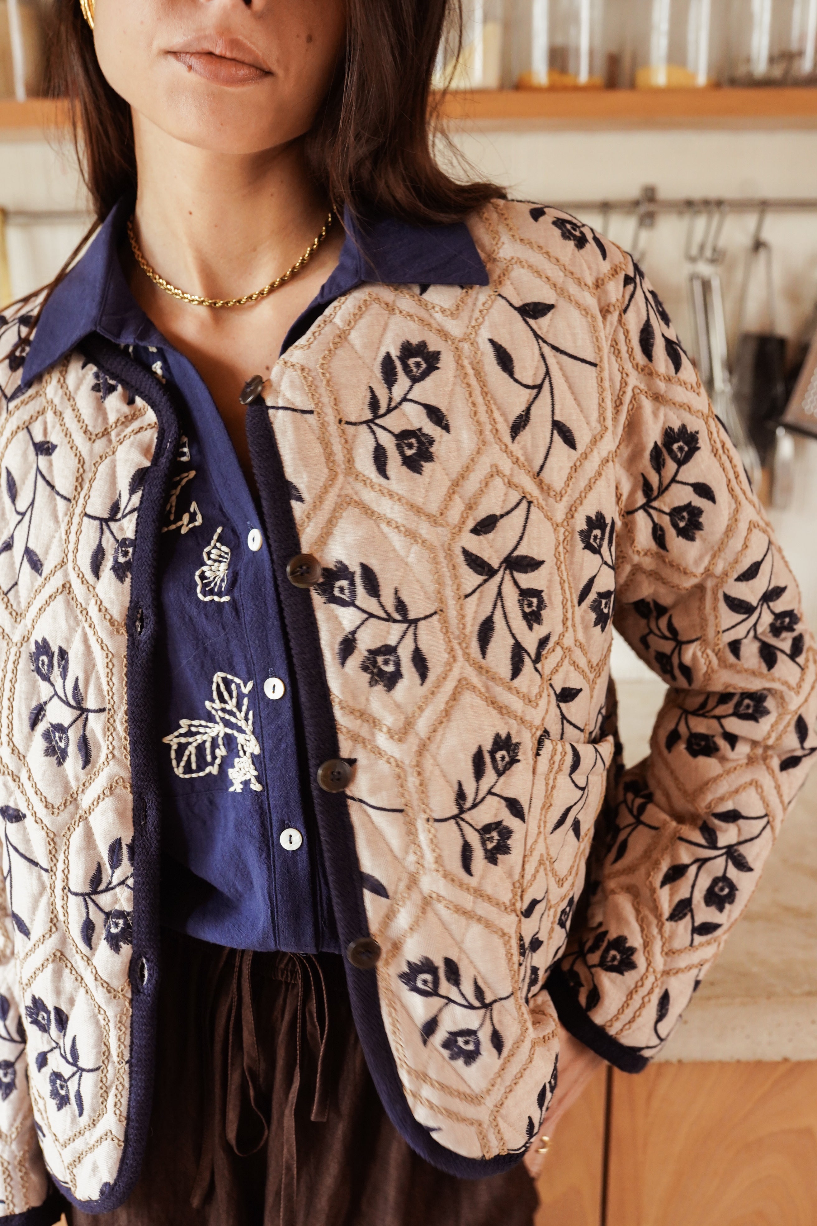 La veste Lancelin séduit par son travail de broderie délicat et son jeu de textures raffiné. Entièrement matelassée, elle mêle confort et élégance avec un motif floral sur fond beige relevé de détails contrastés.