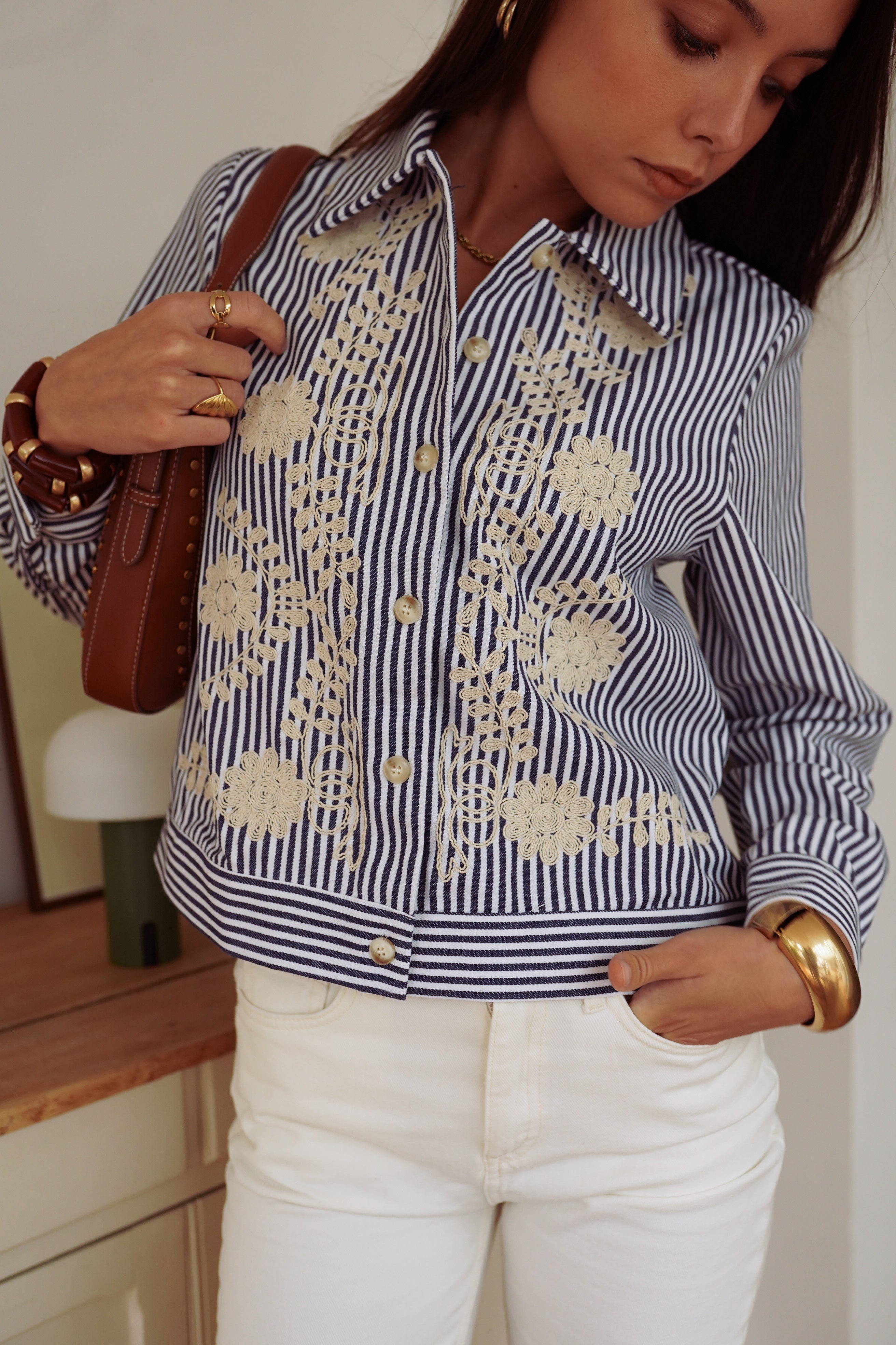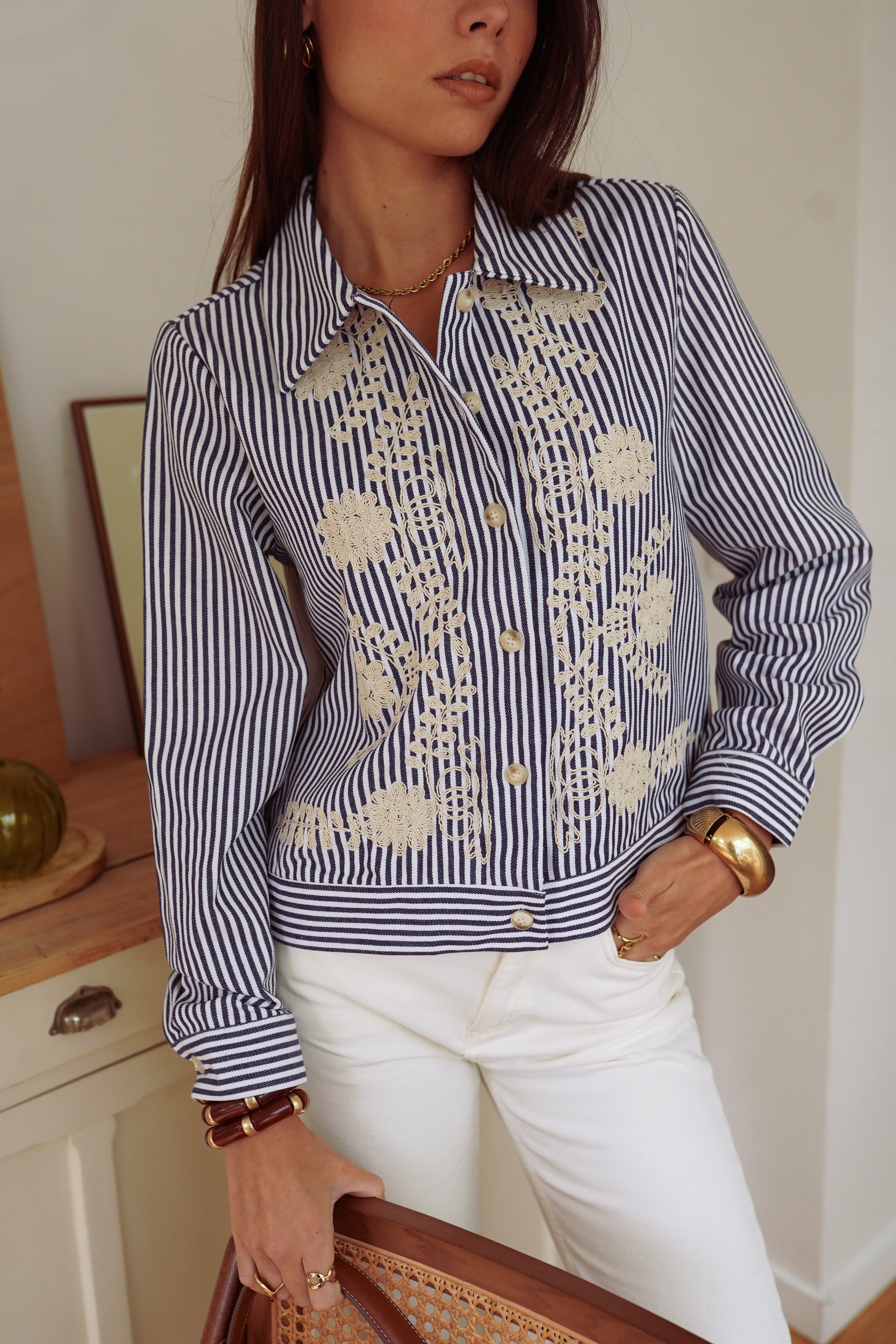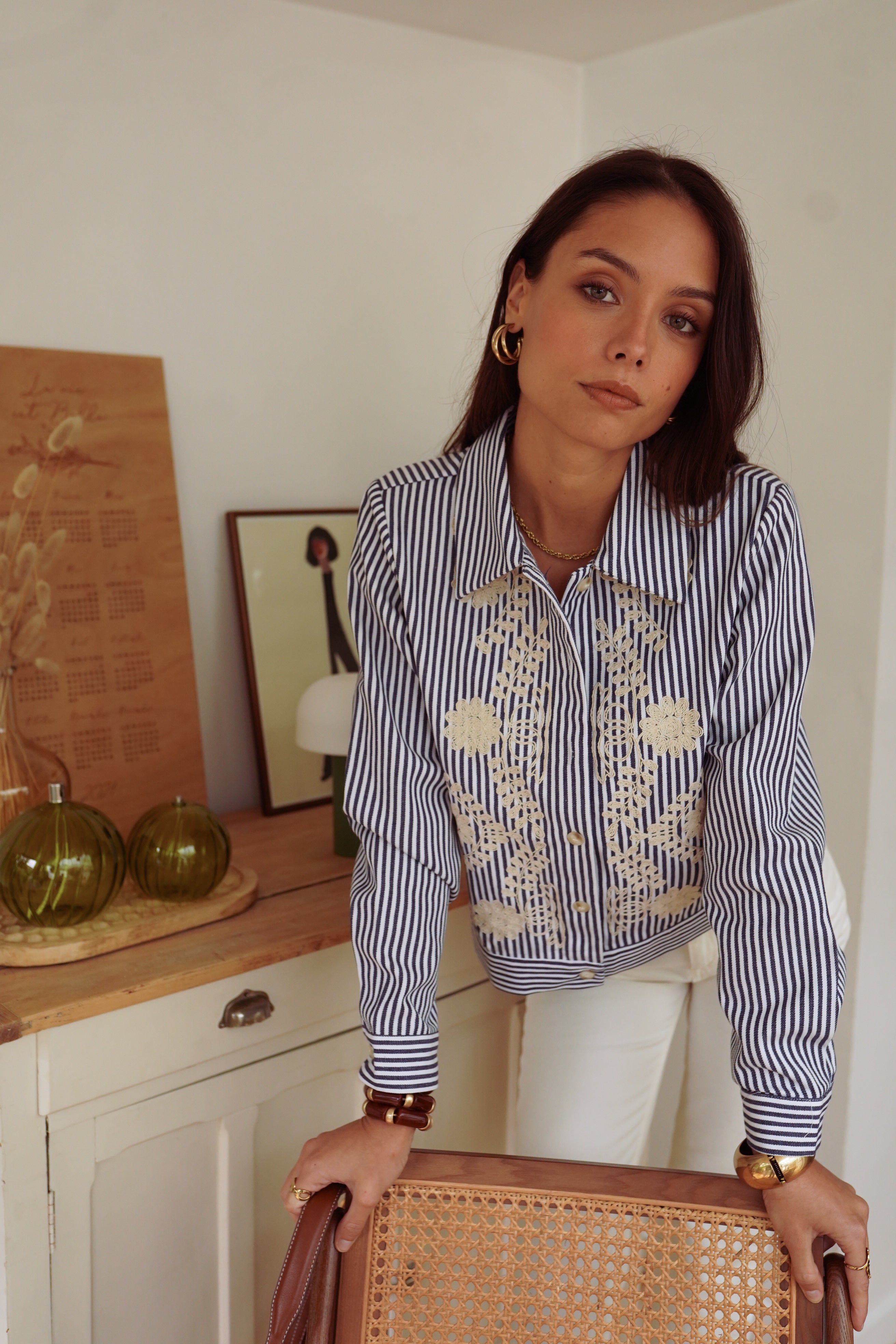 La veste Naëlla revisite la rayure. Son coton bleu marine et blanc se distingue par des broderies écrues qui apportent une touche originale et féminine. Une pièce à l’esprit rétro, facile à porter et parfaite pour donner du caractère à un look de saison.