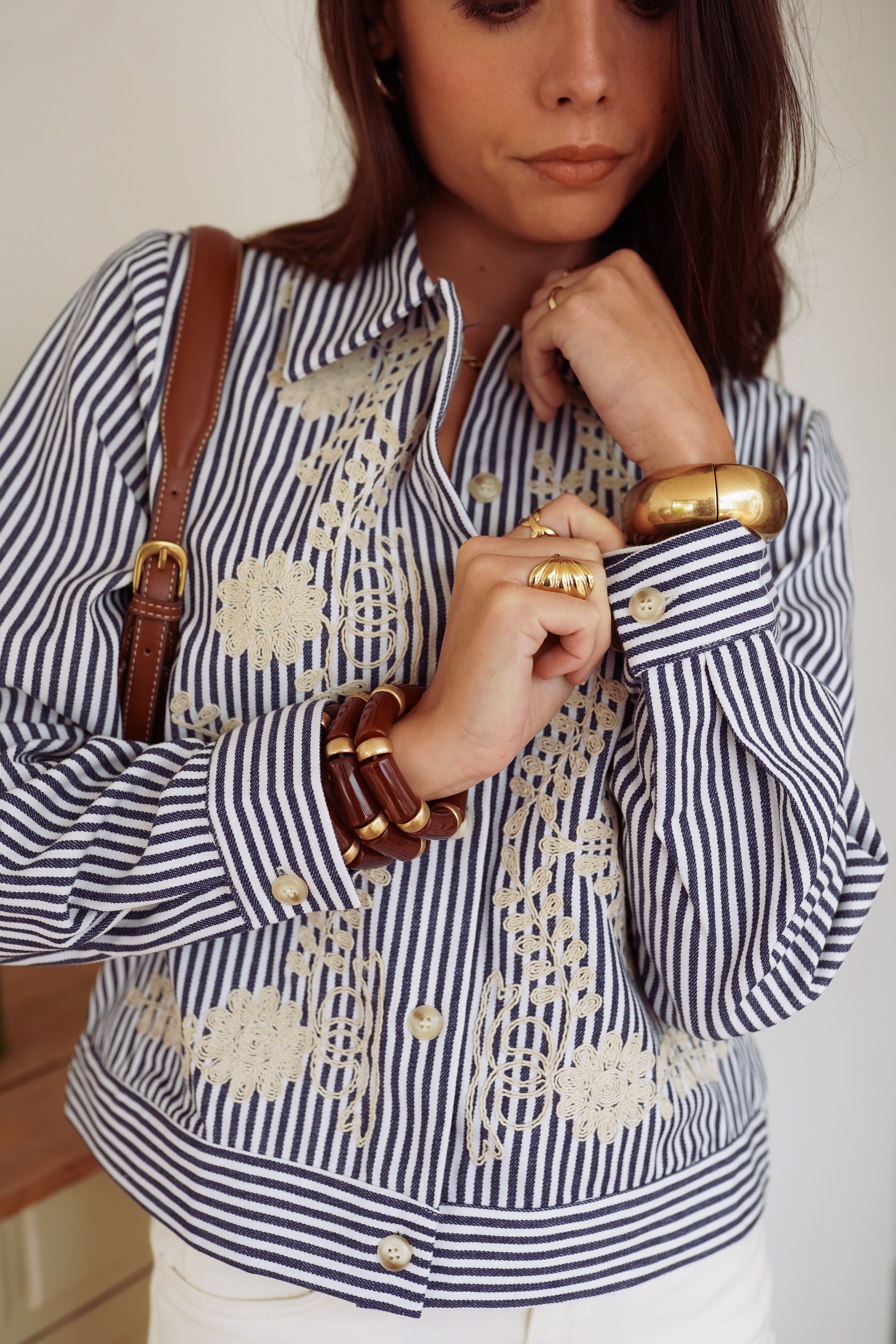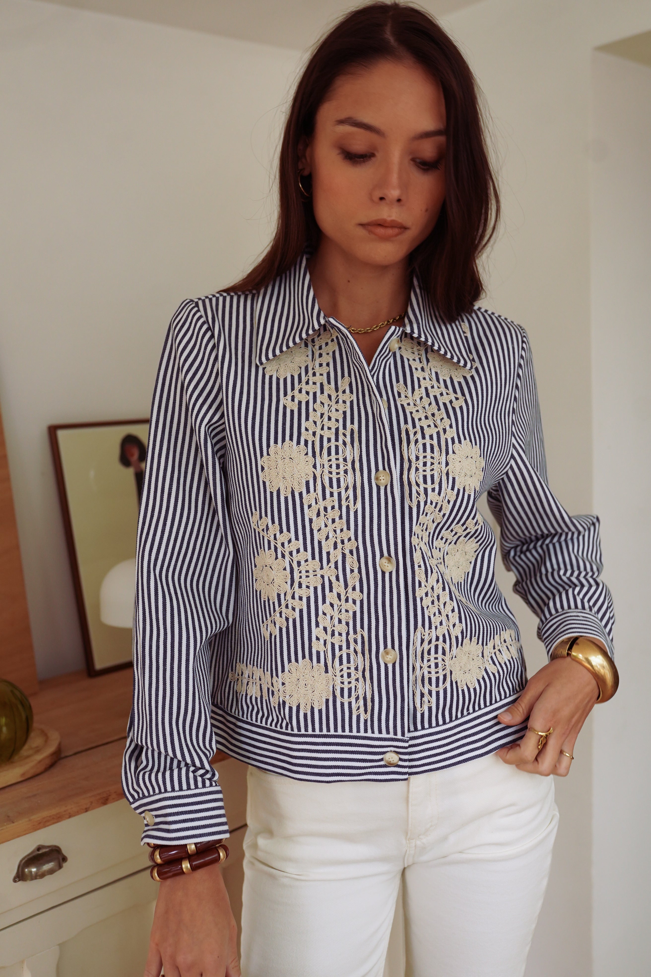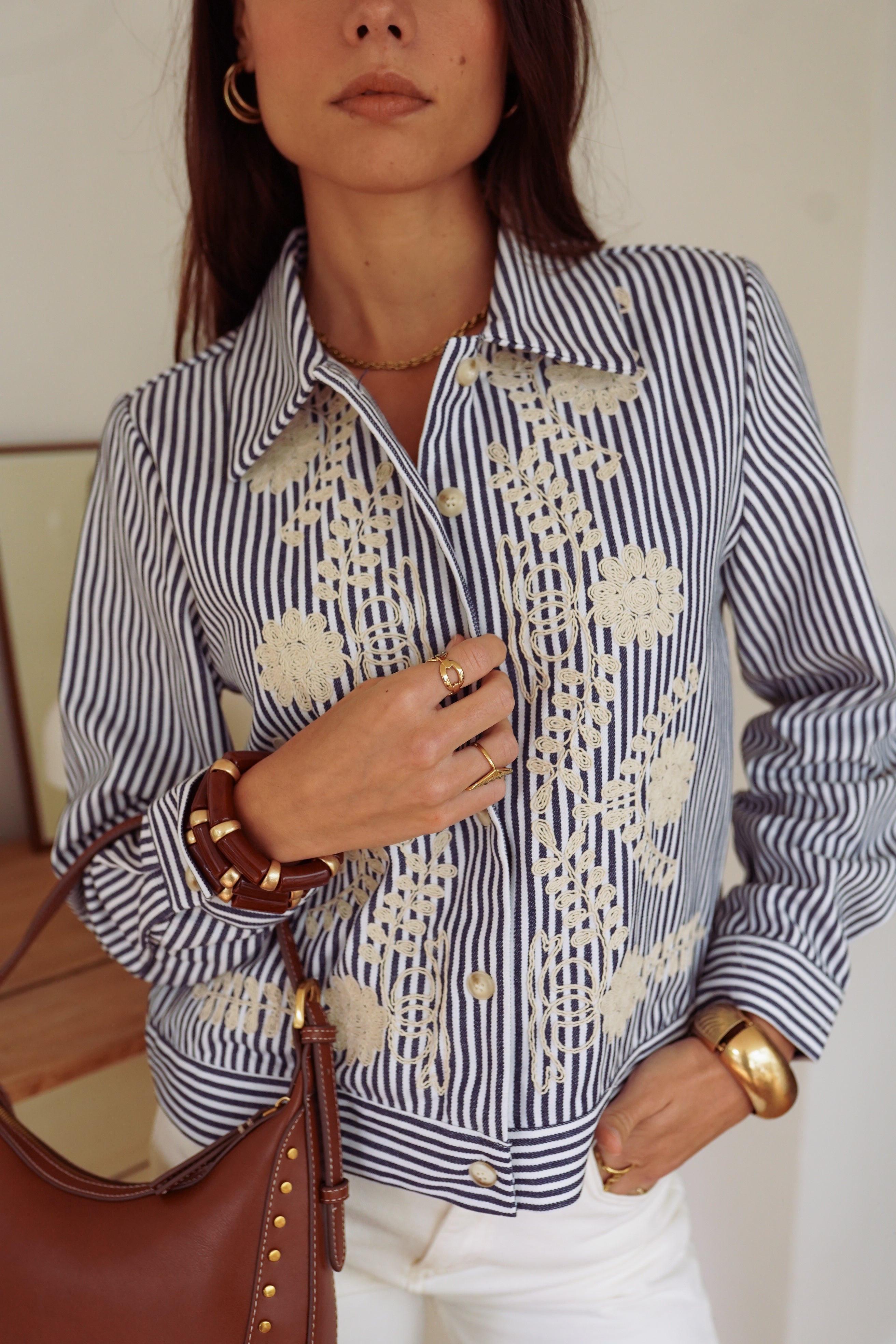 La veste Naëlla revisite la rayure. Son coton bleu marine et blanc se distingue par des broderies écrues qui apportent une touche originale et féminine. Une pièce à l’esprit rétro, facile à porter et parfaite pour donner du caractère à un look de saison.