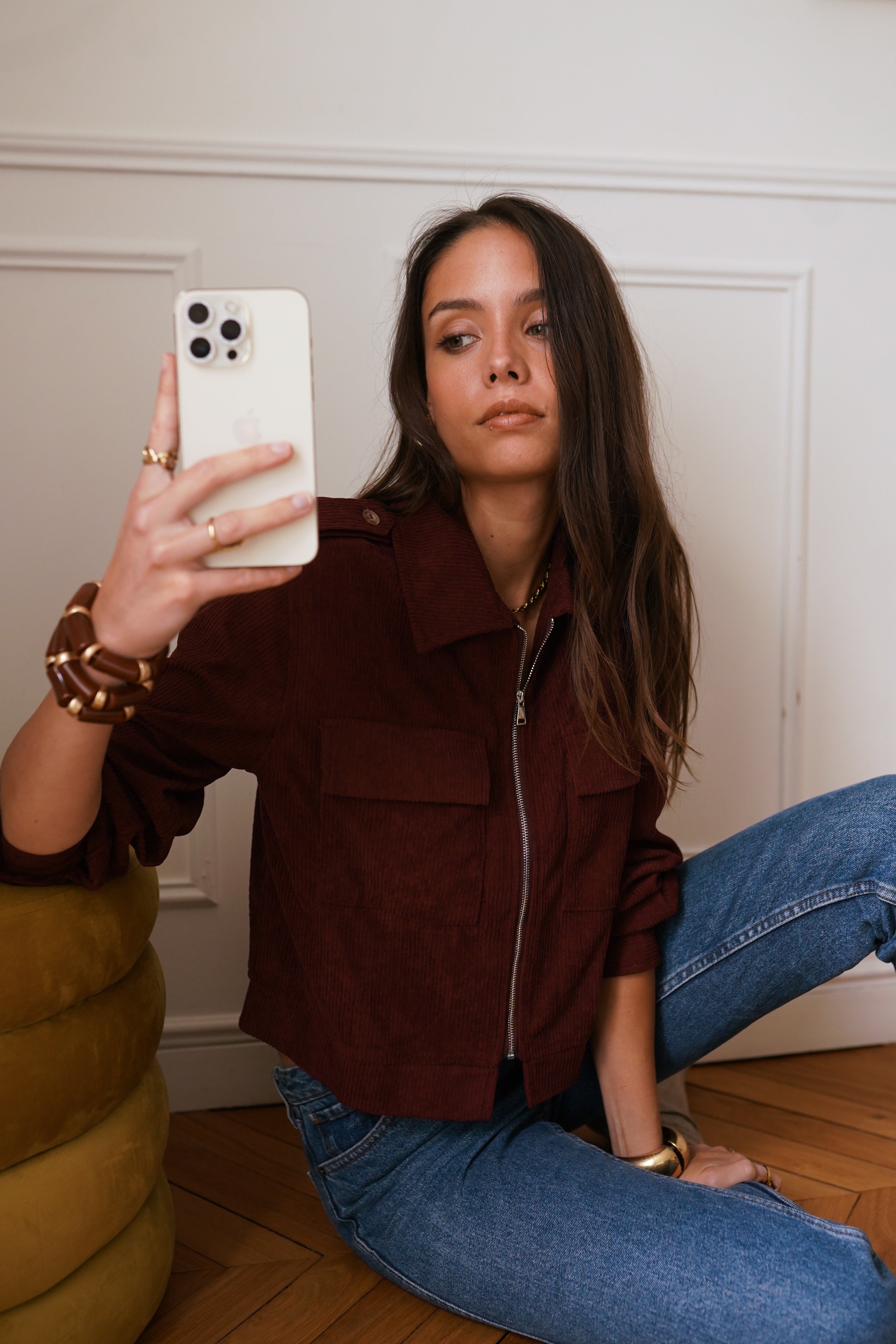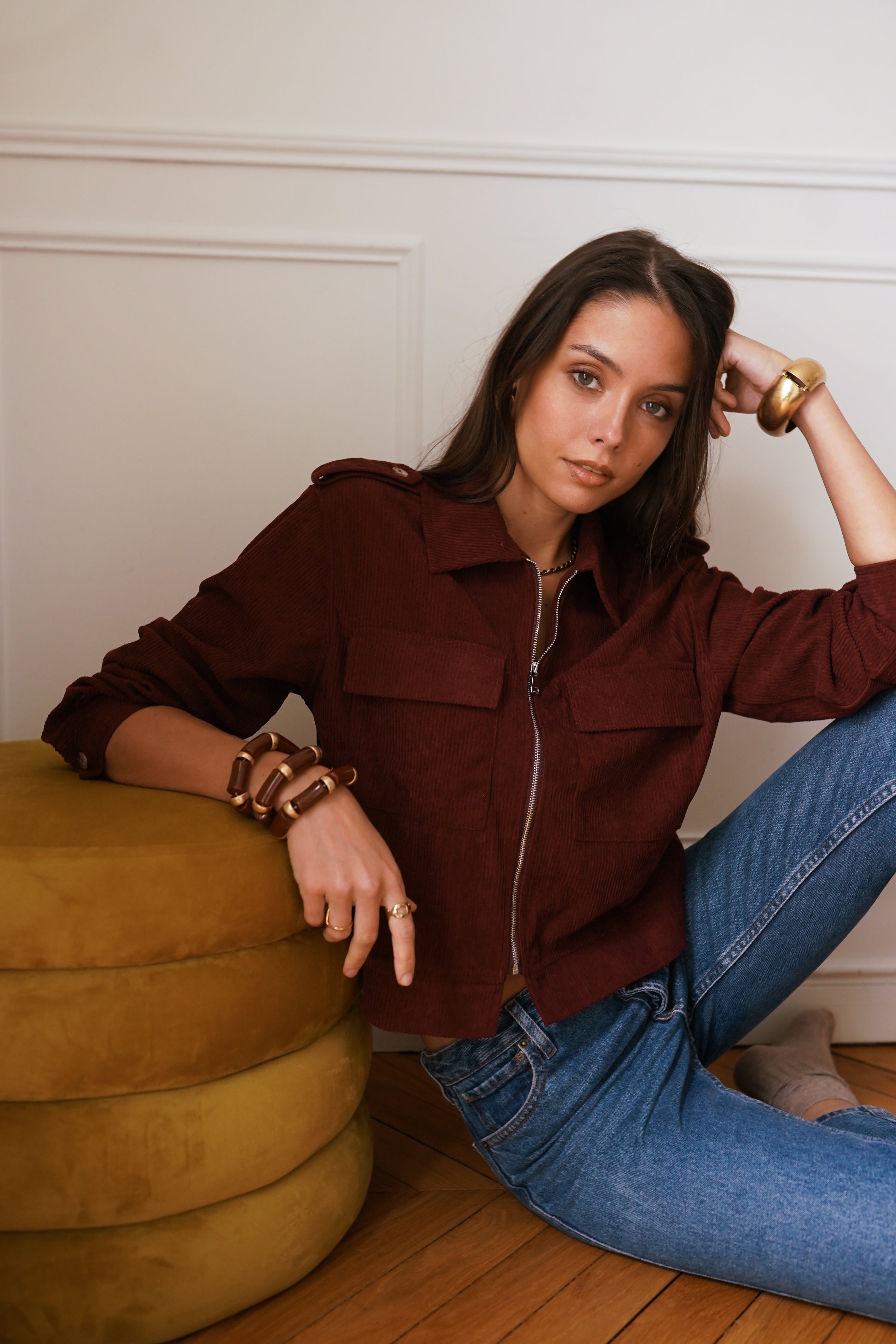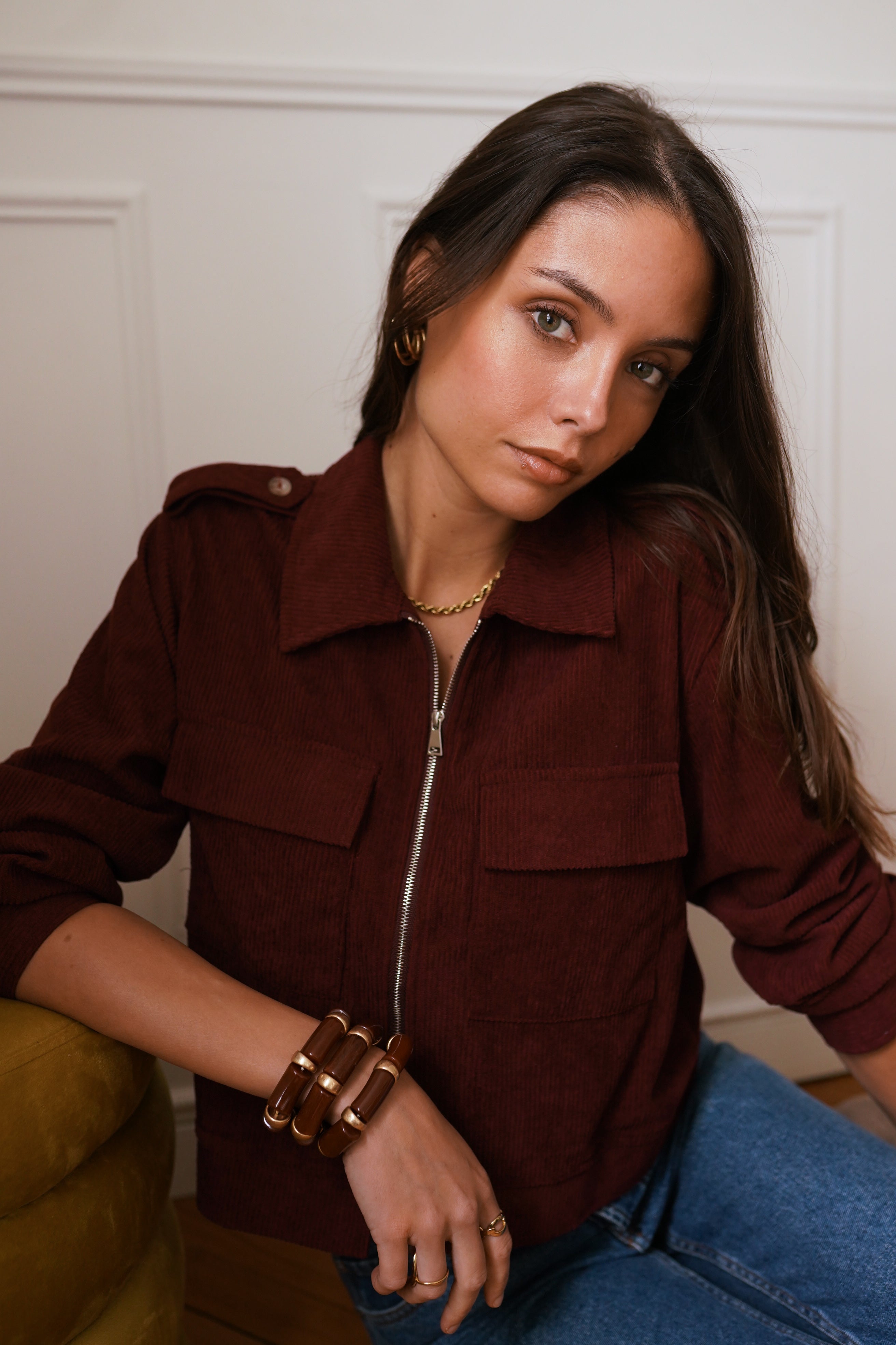 La veste Nolwenn affirme un style à la fois structuré et décontracté. En velours côtelé couleur bordeaux profond, elle mêle texture et modernité. Son col large, ses poches plaquées et sa fermeture zippée lui donnent un twist utilitaire chic, idéal pour dynamiser un look du quotidien.