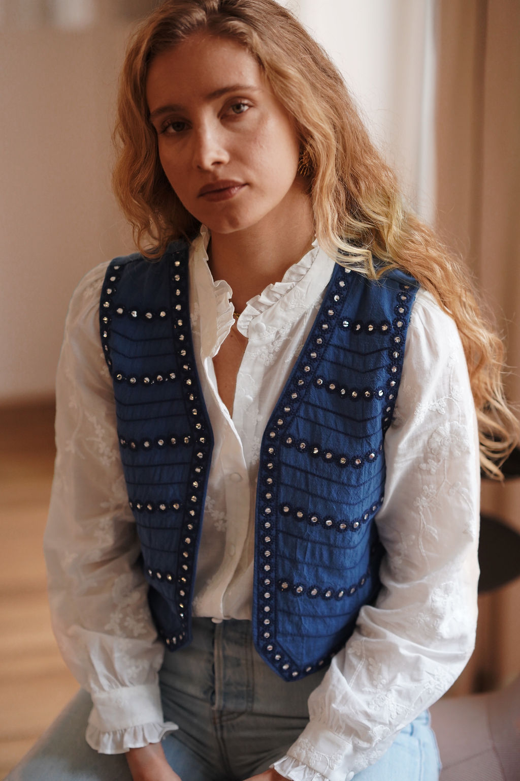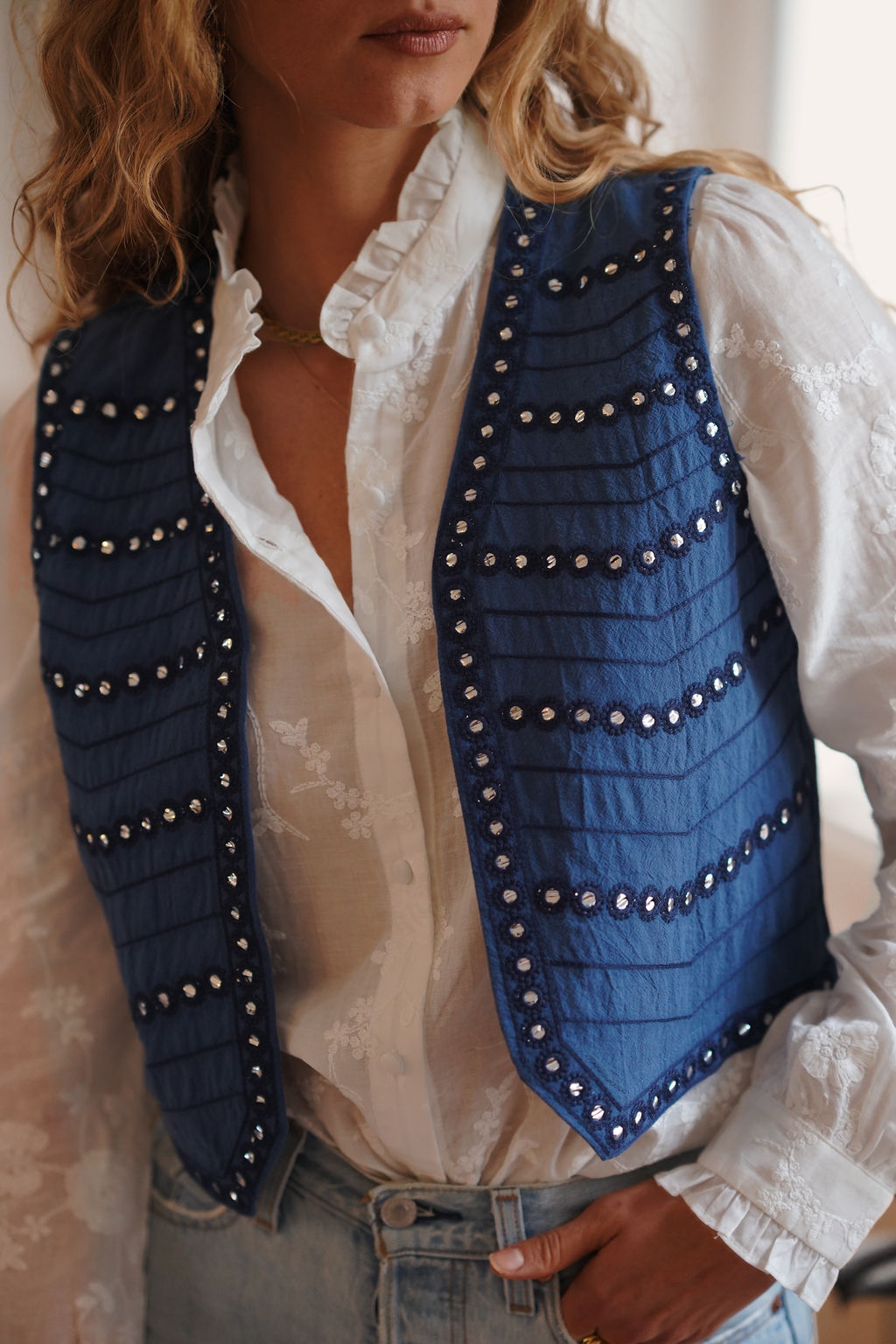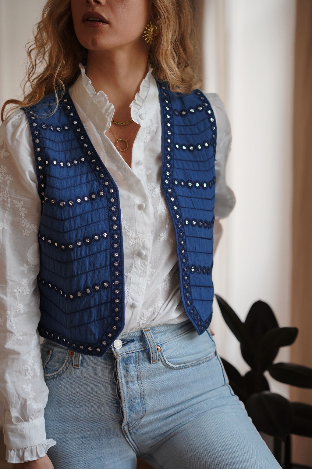 Cette veste sans manches en tissu matelassé joue sur les contrastes entre un bleu intense et des ornements scintillants pour une allure à la fois bohème et sophistiquée. Une pièce forte qui twiste instantanément une tenue avec caractère.