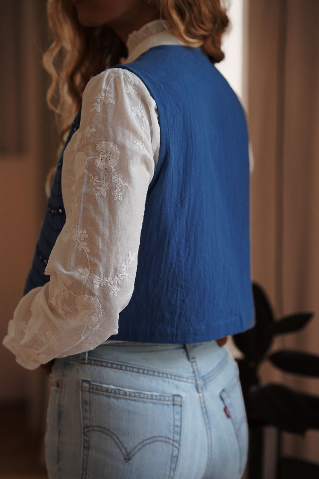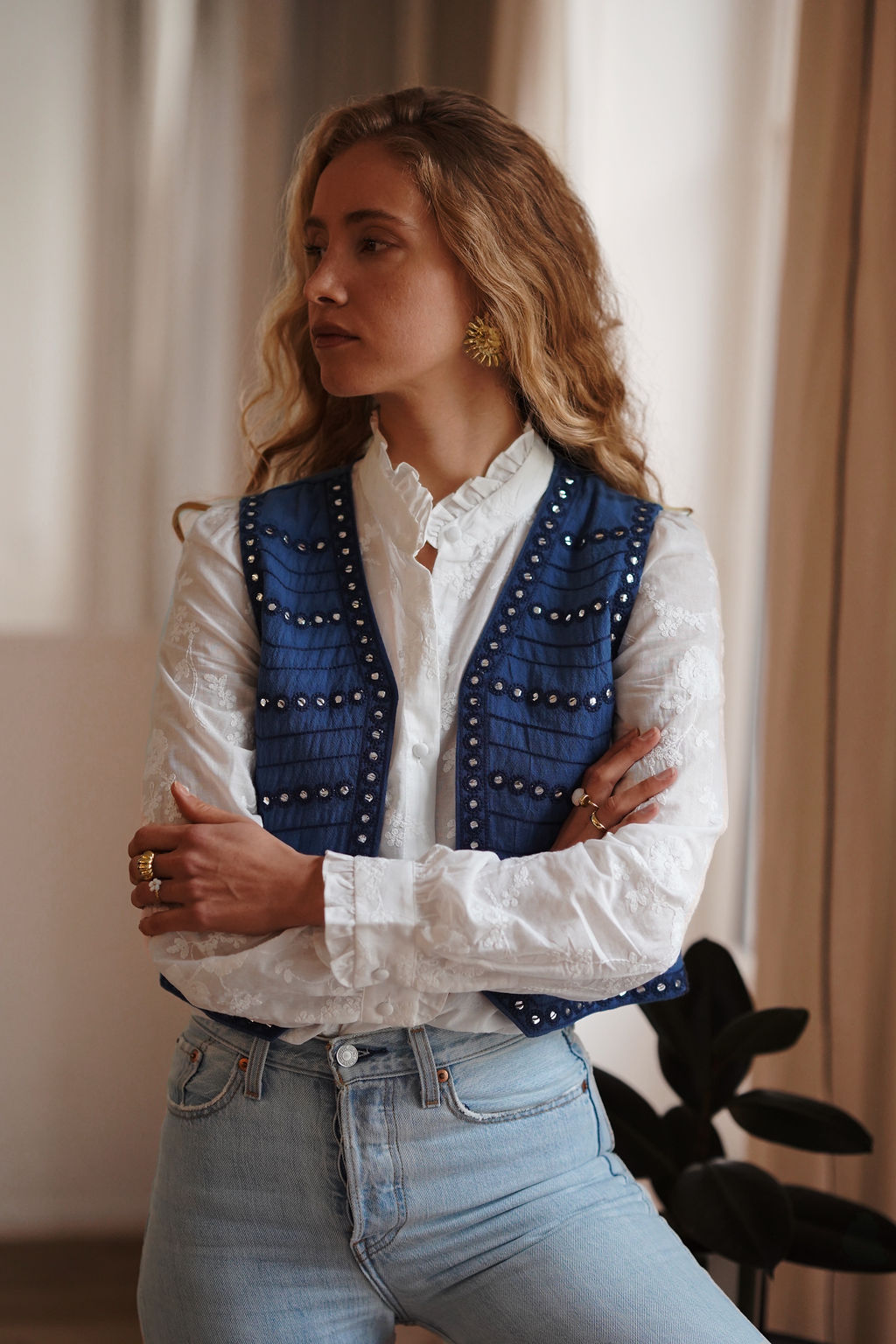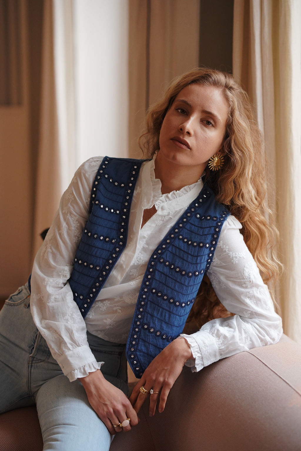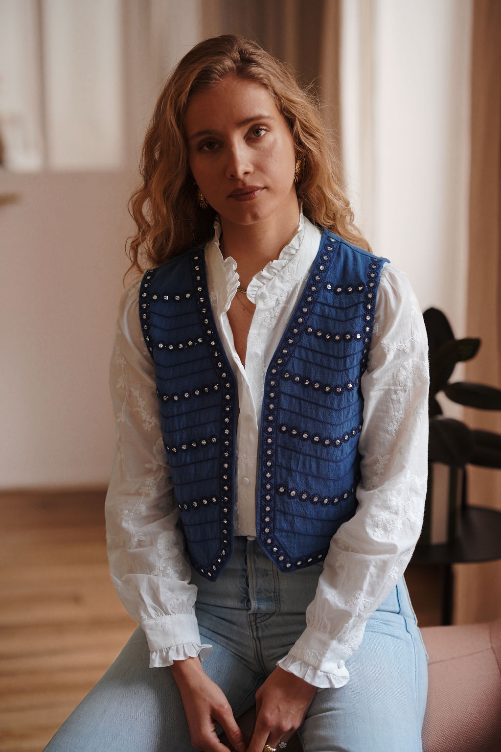 Cette veste sans manches en tissu matelassé joue sur les contrastes entre un bleu intense et des ornements scintillants pour une allure à la fois bohème et sophistiquée. Une pièce forte qui twiste instantanément une tenue avec caractère.