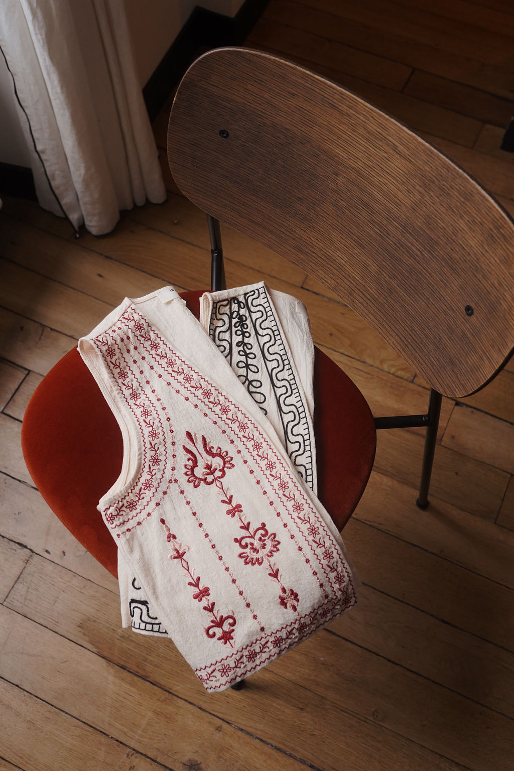 Cette veste sans manches revisite l’élégance bohème avec des broderies délicates et un tissu texturé qui évoque un savoir-faire authentique. Sa coupe épurée et son allure artisanale en font une pièce forte et intemporelle.